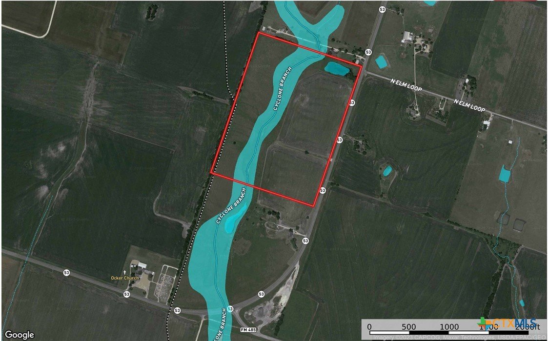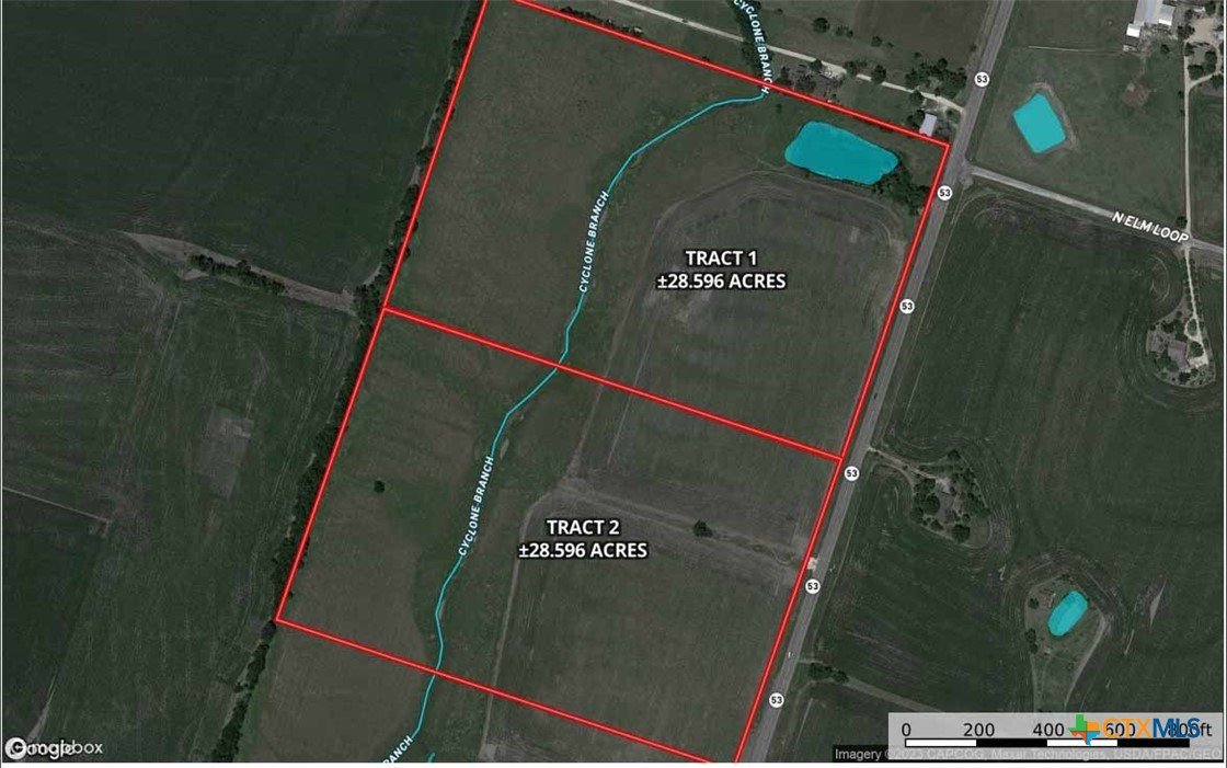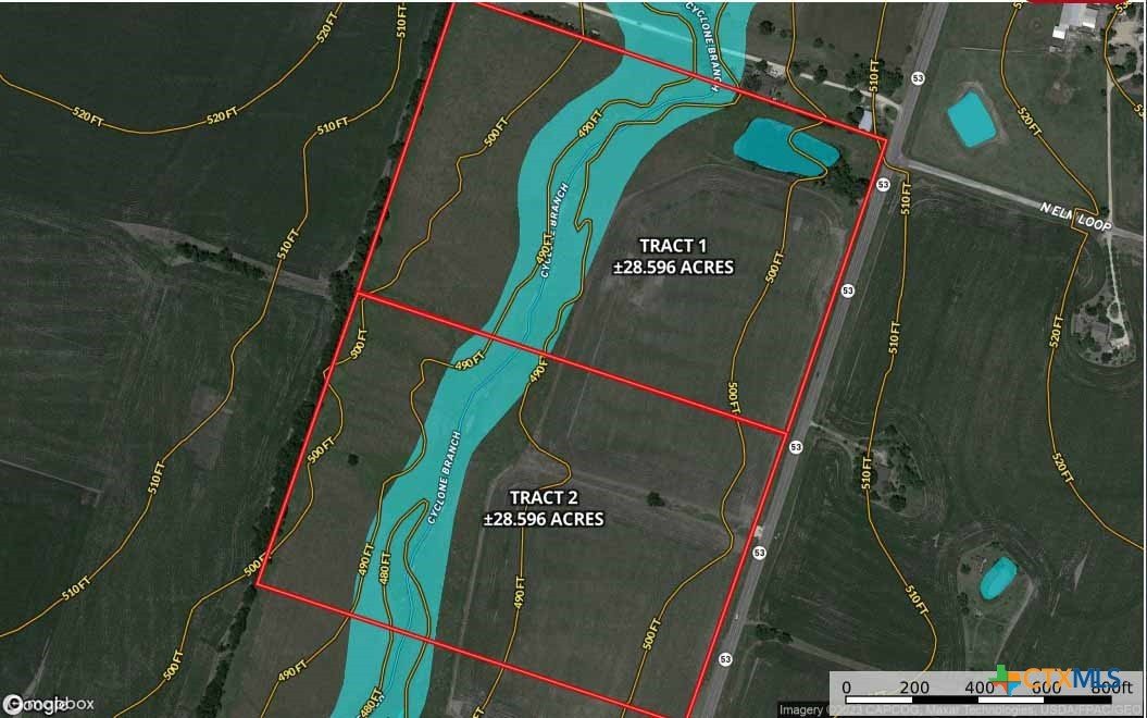 ±57.192 Acre Farm. Will Divide into Two ±28.596 acre tracts. Mostly open with a few trees around a pond on tract 1. A small seasonal creek (Cyclone Branch) bisects the property. Currently leased and in row crop production. Just North of the intersection of Hwy 53 and FM 485. Just West of the intersection of Hwy 53 & N Elm Loop. 10 Miles East of Loop 363 in Temple. East Bell WSC & O.H. Electric along road. Gently slopes into Cyclone Branch. Elevations range from 500’-480’ above sea level with 1 - 3% slopes. Mix of Heiden Clay & Tinn Clay soils. Cyclone Branch bisects the property. Land along Cyclone Branch is partially within the 100-year flood zone. There is a ±0.81 acre pond located at the North of tract 1. Outside City Limits. Restrictions include No junk yards or hog farms. Rogers ISD. Ag Exempt.