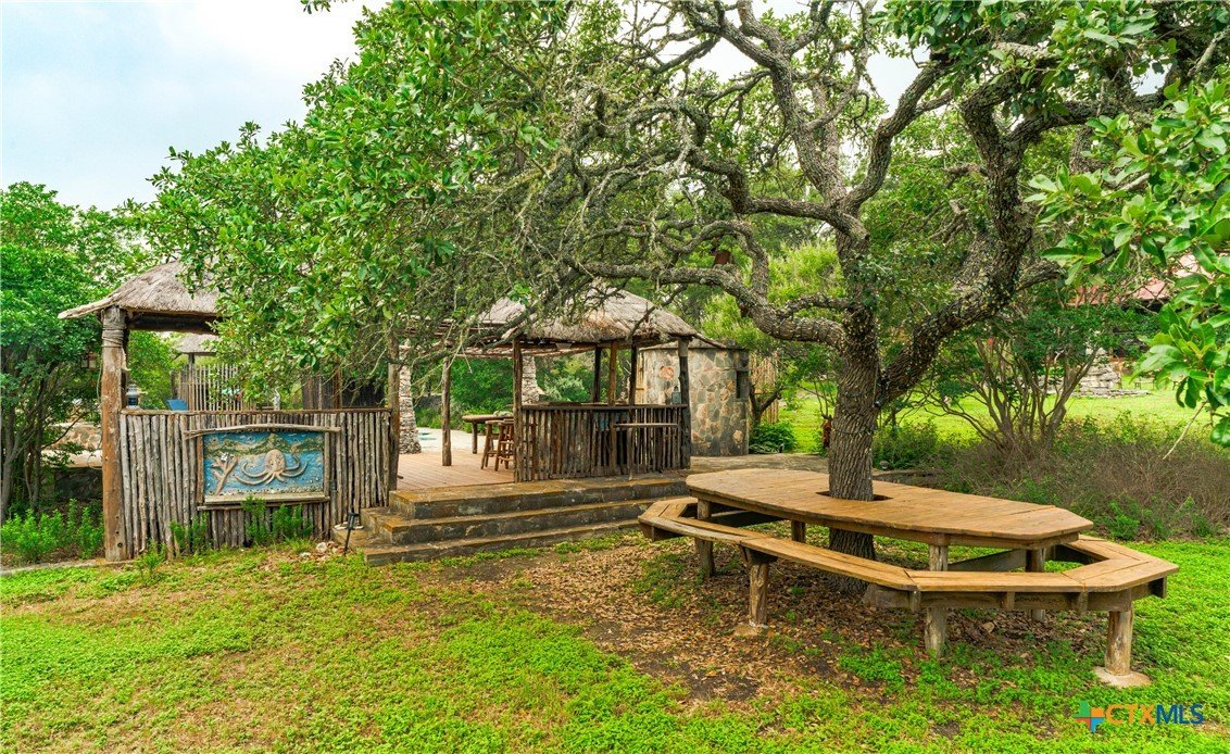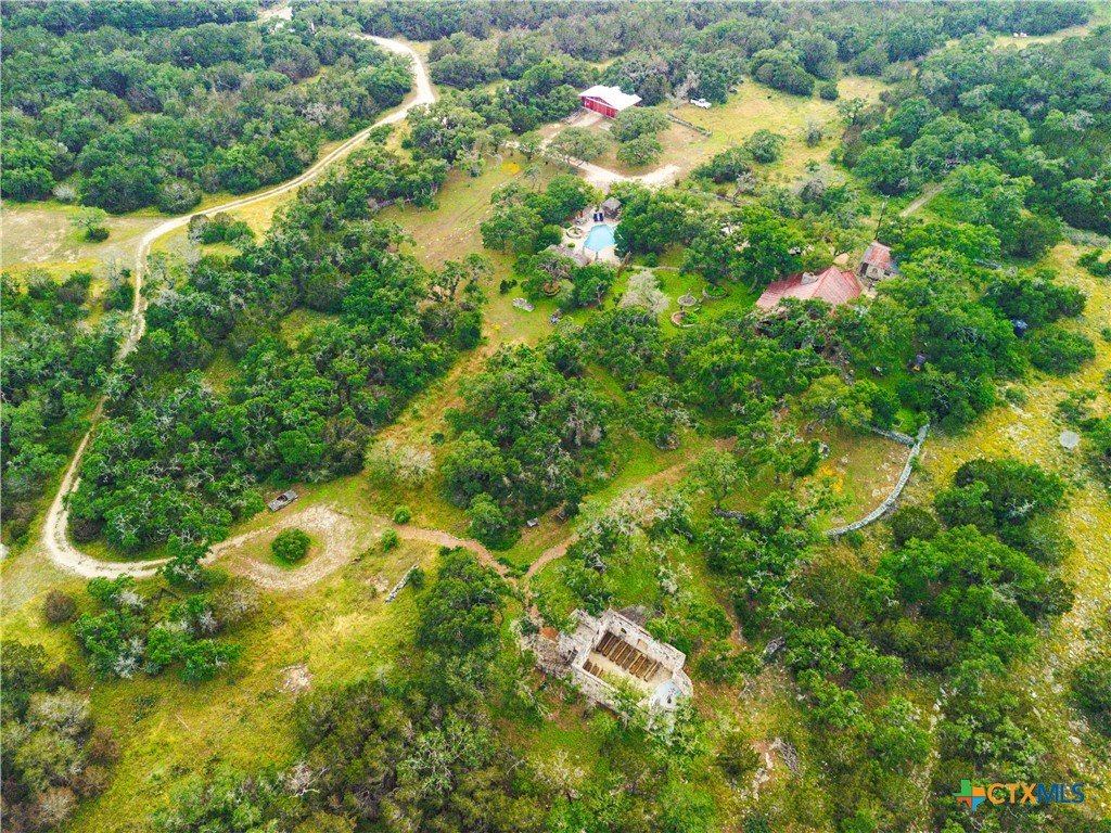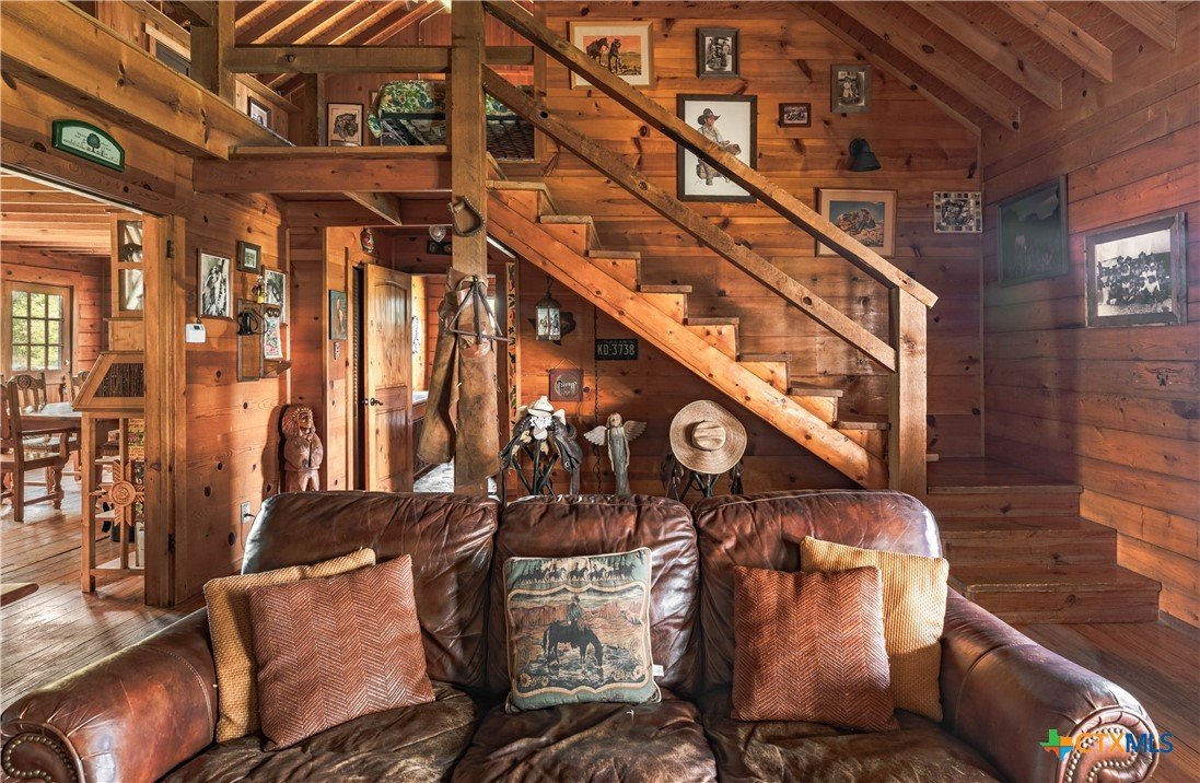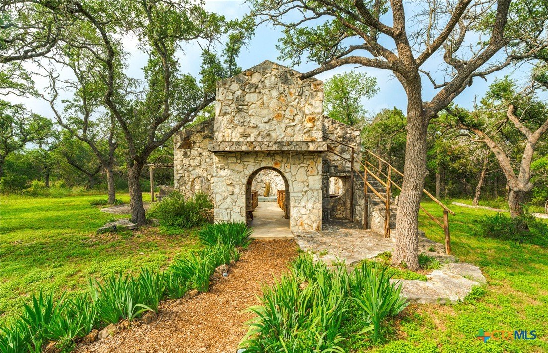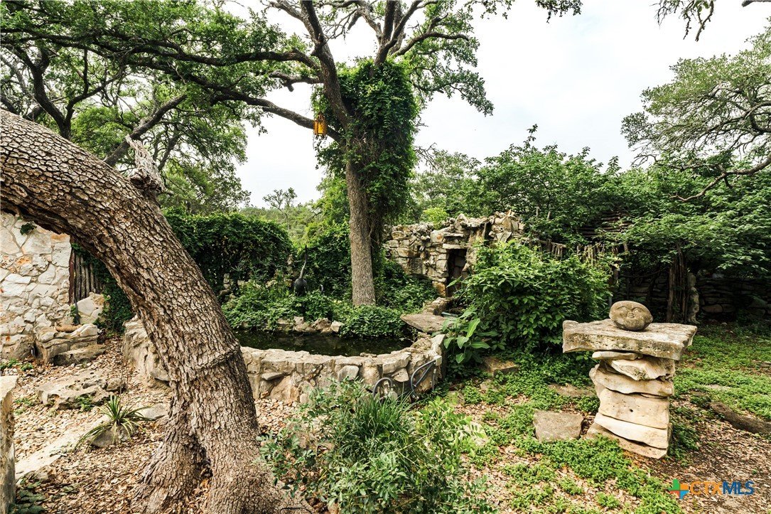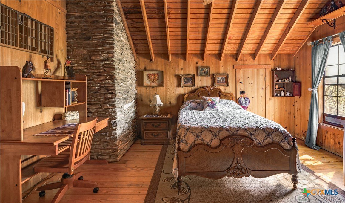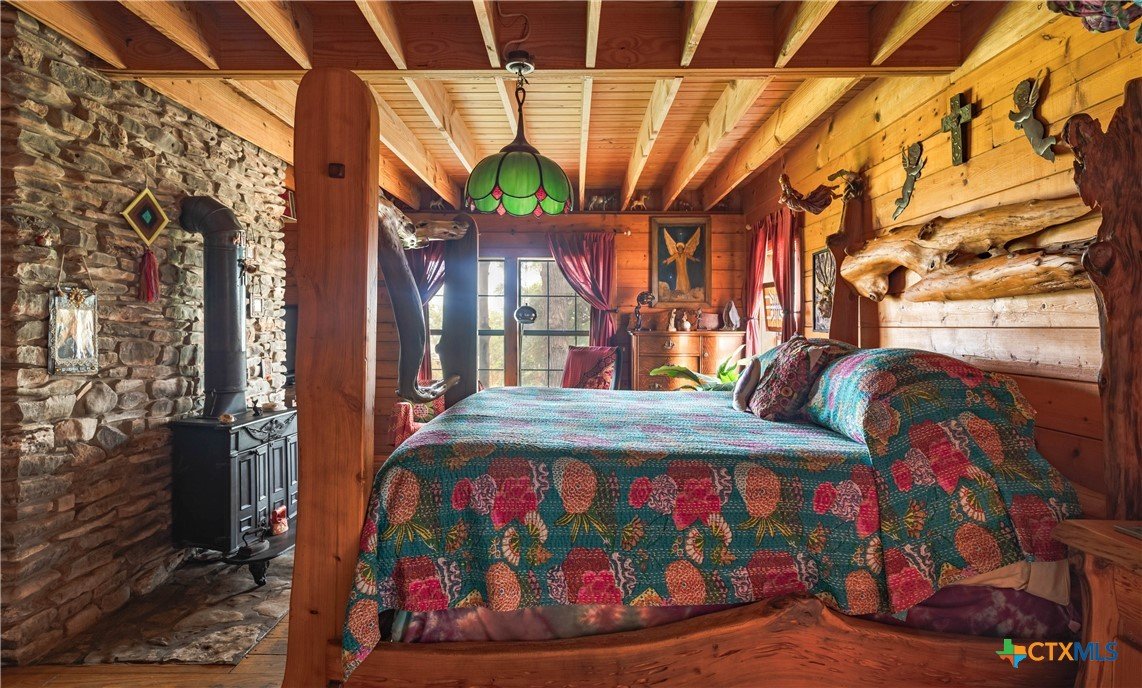 This stunning 20-acre Hill Country retreat is just 5 minutes from Wimberley and 10 minutes from San Marcos, offering the perfect balance of seclusion and accessibility with Austin and San Antonio nearby. The hand-built, 2,300 sqft log cabin offers total privacy and features vaulted ceilings, rustic cowboy and Native American-inspired decor, and a gourmet kitchen with mosaic tile backsplash, light granite countertops, custom cabinets, gas range, and stainless steel sink. Enjoy three fireplaces—two stone fireplaces in the dining and living rooms, and a wood-burning stove in the primary bedroom. The primary bath has a sculptural walk-in shower, while the second bath features a soaking tub with mesmerizing mosaic tiles. The expansive veranda leads to a koi pond, stone patio, and an elysian cabana. The property also boasts a hand-built stone chapel, ideal for weddings, concerts, and other events, seating up to 80 guests. Its rustic charm and timeless beauty transport you to another era, reminiscent of the spirit of Austin's past. Outdoor living includes a stand-alone pool, an outdoor kitchen with stone grill and fire pit, and a raised outdoor stage for performances, evoking the spirit of cosmic cowboys like Willie Nelson and Waylon Jennings. Horse amenities include a barn with stables and corral, and a grand stone rabbit house. The property offers easy access to Ranch Road 12 and is close to downtown Wimberley, Hill Country Studios, Jacobs Well, and other attractions. It has served as both a short-term rental and a cherished homestead. This unique Hill Country gem combines luxury, rustic charm, and artistic beauty, offering endless possibilities—whether for a private retreat, income-generating rental, or event venue. Don't miss out on this rare opportunity!