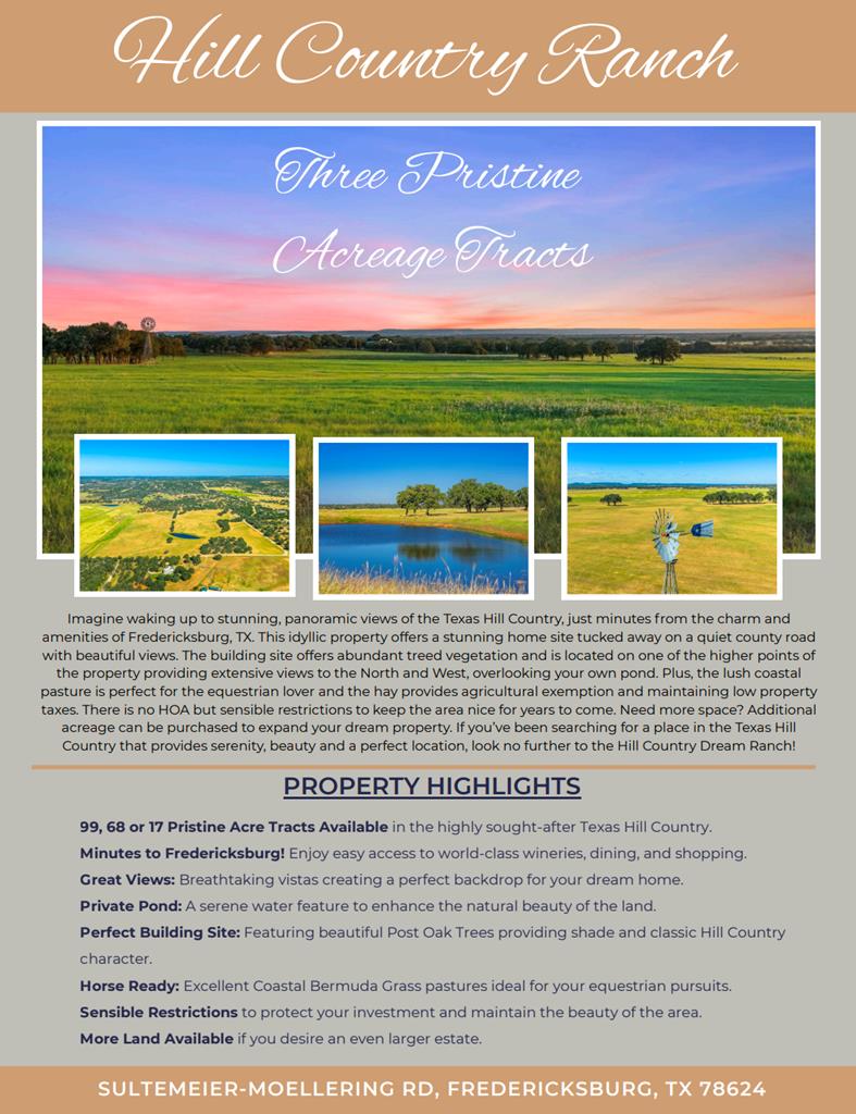 HILL COUNTRY DREAM RANCH: Imagine waking up to stunning, panoramic views of the Texas Hill Country, just minutes from the charm and amenities of Fredericksburg, TX. This idyllic property offers a stunning home site tucked away on a quiet county road with beautiful views. The building site offers abundant treed vegetation and is located on one of the higher points of the property providing extensive views to the North and West, overlooking your own pond. Plus, the lush coastal pasture is perfect for the equestrian lover and the hay provides agricultural exemption and maintaining low property taxes. There is no HOA but sensible restrictions to keep the area nice for years to come. Need more space? Additional acreage can be purchased to expand your dream property. If you've been searching for a place in the Texas Hill Country that provides serenity, beauty and a perfect location, look no further to the Hill Country Dream Ranch! Property Highlights: 1. 99 Pristine Acres in the highly sought-after Texas Hill Country. 2. Minutes to Fredericksburg! Enjoy easy access to world-class wineries, dining, and shopping. 3. Great Views: Breathtaking vistas creating a perfect backdrop for your dream home. 4. Private Pond: A serene water feature to enhance the natural beauty of the land. 5. Perfect Building Site: Featuring beautiful Post Oak Trees providing shade and classic Hill Country character. 6. Horse Ready: Excellent Coastal BermudaGrass pastures ideal for your equestrian pursuits. 7. Sensible Restrictionsto protect your investment and maintain the beauty of the area. 8. More Land Available if you desire an even larger estate. Don't Settle for Less Start living your Hill Country Dream