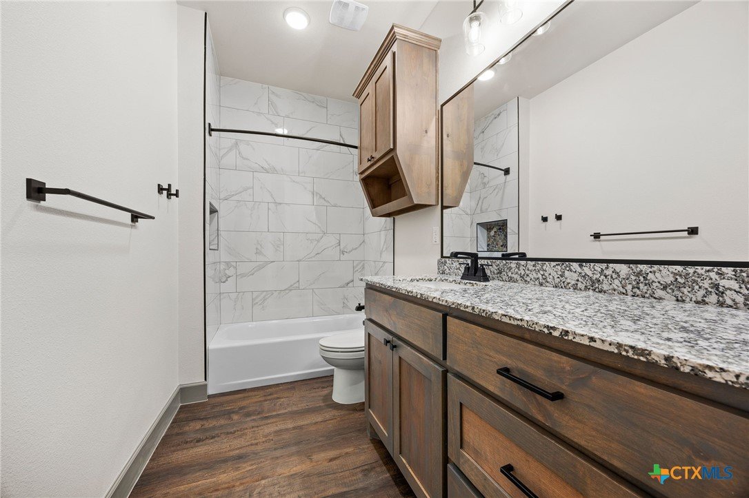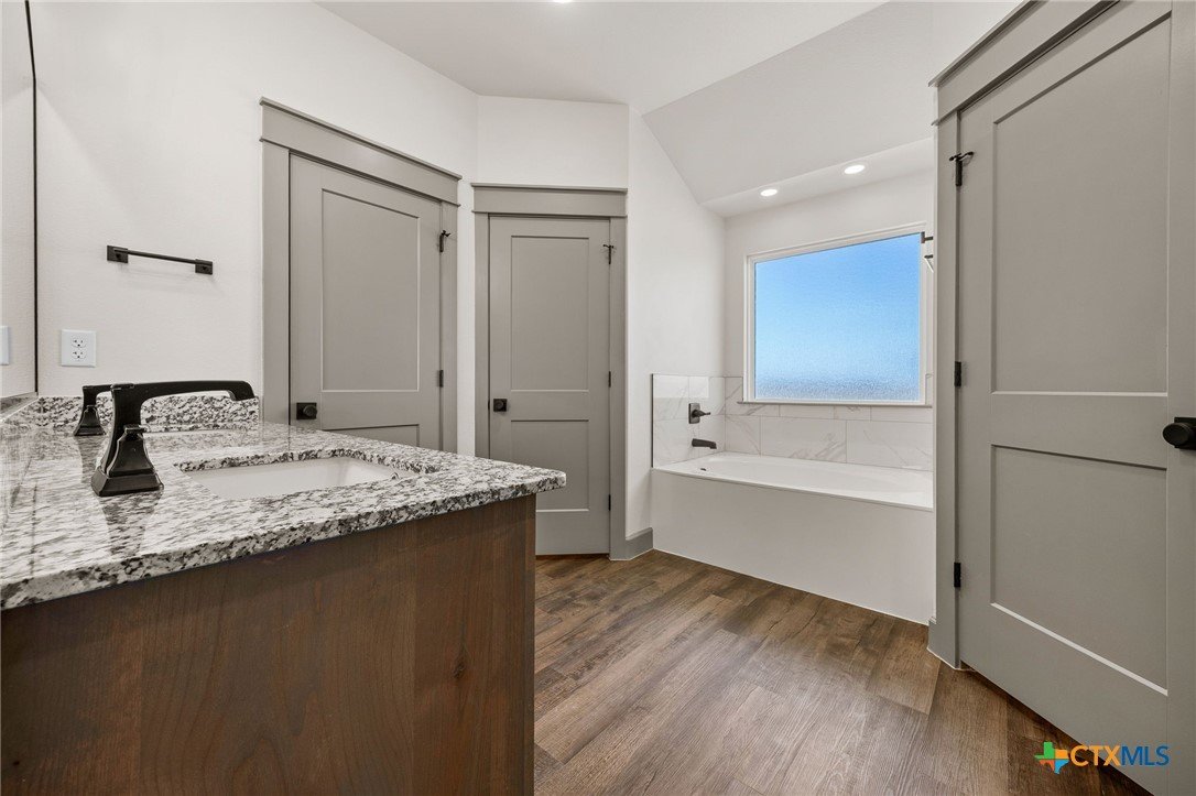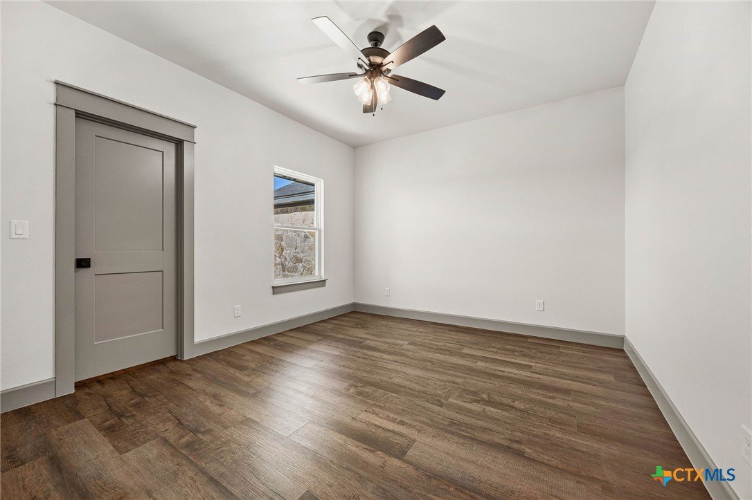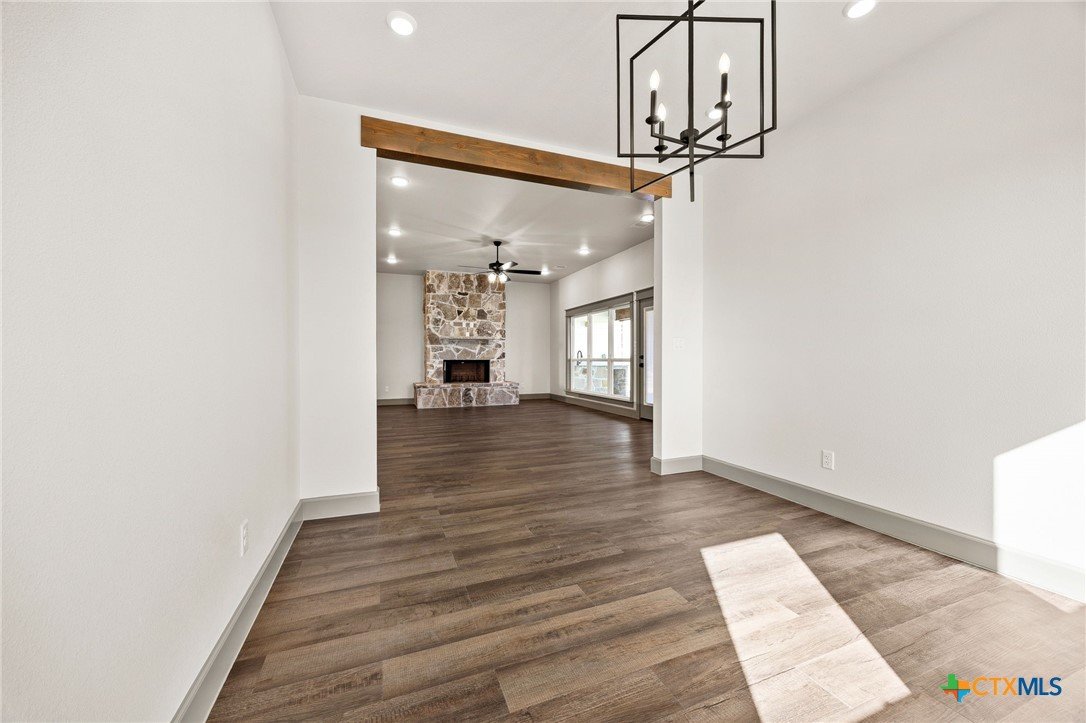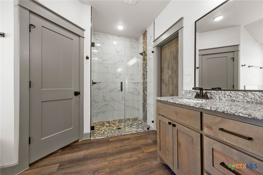 Welcome to this beautiful 4-bedroom, 2-bath Hill Country–style home set on 1.73 private acres. As you enter, you’re greeted by a stunning wood and glass front door, along with both a storage closet and coat closet for convenient organization. Inside, the home offers high ceilings, Douglas fir headers, luxury vinyl plank flooring, walk-in closets and ceiling fans in every room. The layout includes a formal dining room plus a breakfast area for everyday meals. The kitchen features granite countertops, custom Knotty Alder cabinetry, buffet, a Wi-Fi–enabled range, dishwasher and a Café microwave. The living room is anchored by a grand stone wood-burning fireplace, creating a warm and inviting space. The primary suite includes double sinks, a separate shower, a garden tub, and spacious walk-in closets. The laundry room provides a raised platform for the washer and dryer as well as an additional laundry closet. Additional features include a water-heater tank booster, booster pump to maintain water pressure while sprinklers run, kitchenette on the back patio, and a conventional septic system. Located on 1.73 acres, this property offers privacy, space, and classic Hill Country charm—ideal for anyone looking for acreage and room to spread out.
