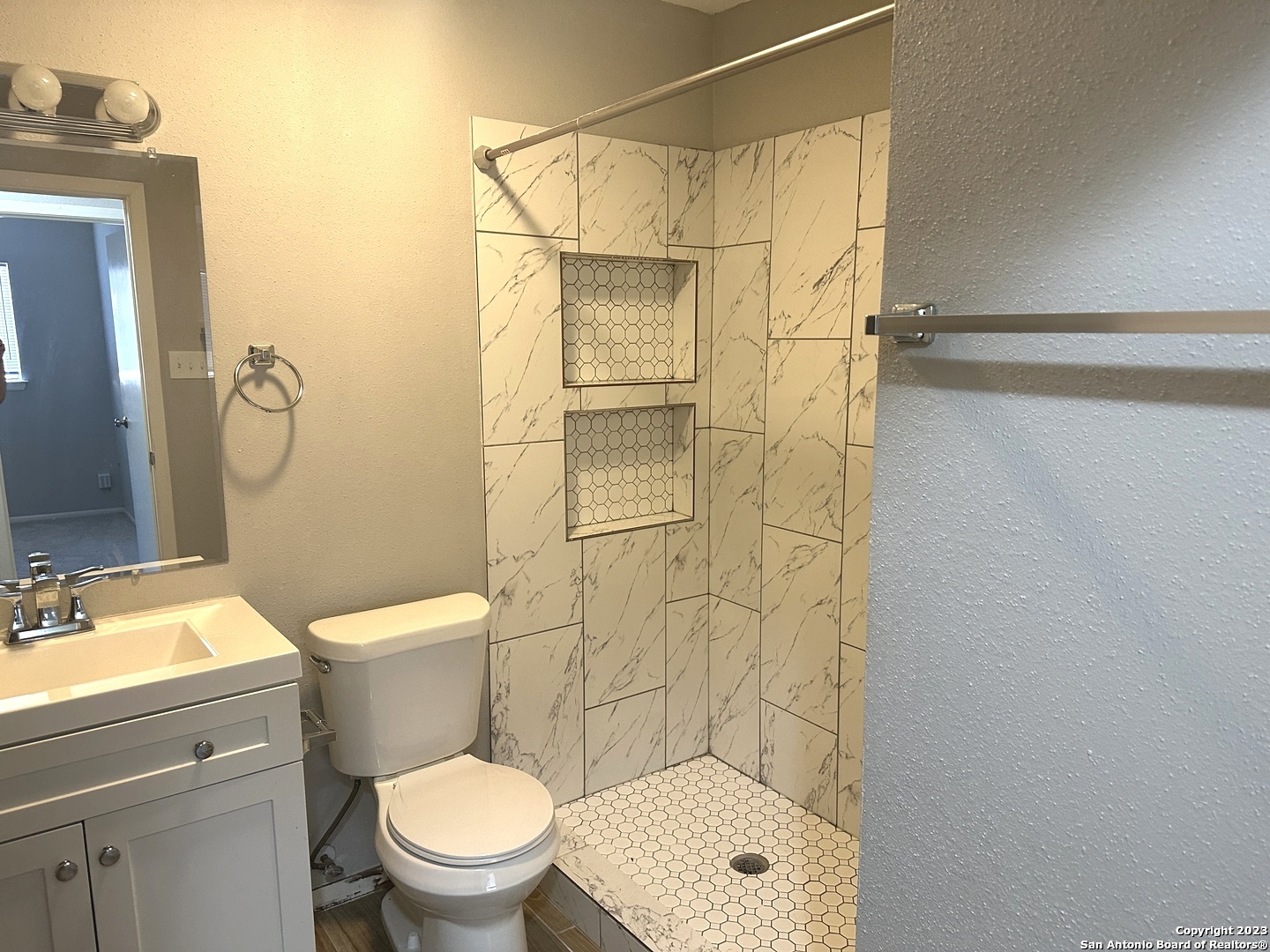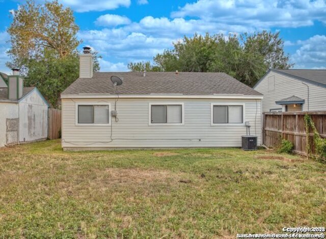 No Pets allowed per owner. One Story 3/2 home in the Northside Independent School District (NISD).This home features an open floor plan with a vaulted ceiling, creating a seamless flow from the kitchen to the dining area and living area. The kitchen has granite countertops, a 9" sink with a gooseneck faucet, and stainless steel appliances. The guest bath offers a beautiful walk-in tile shower. The master bathroom features a double vanity and a linen closet for added storage.