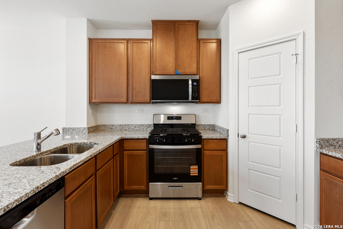 This thoughtfully designed home features 9-ft. first floor ceilings and a stylish, open layout. The kitchen offers Whirlpool stainless steel appliances, Woodmont Cody 42-in. upper cabinets, an extended breakfast bar, and granite countertops in Arctic Pearl. In the primary bath, enjoy upgraded cabinets, a raised vanity, and a 42-in. garden tub/shower with a Daltile tile surround. Decorative finishes include a Carrara-style entry door, Kwikset Polo interior door hardware, and vinyl plank flooring in the bathrooms, kitchen, and great room. Additional highlights include a wireless security system, fully sodded yard, and automatic sprinkler system.