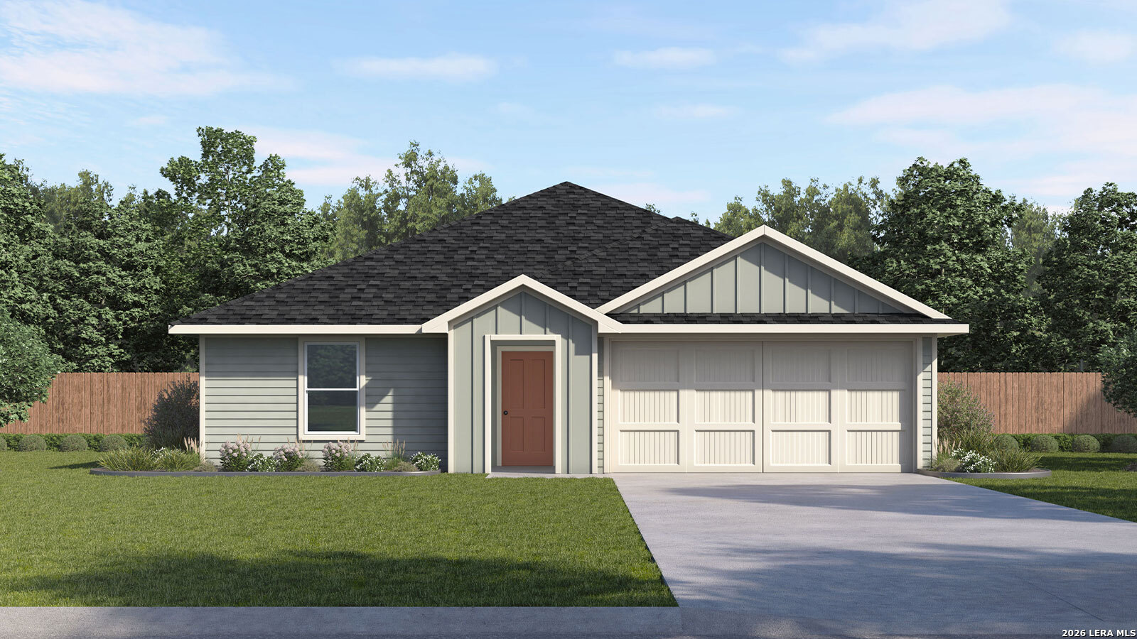 JUNE ESTIMATED COMPLETION. LOCATED IN NAVARRO ISD. The Austin is one of our one-story new homes available at Swenson Heights in Seguin, Texas. This 4 bedroom, 2 bathroom home includes a 2-car garage across 1,647 square feet of modern living space. Our homes in Swenson Heights feature our farmhouse exteriors. Entering the home from the covered front porch, cross the foyer and find two secondary bedrooms and a full bathroom. Moving further inside the home, you'll find the utility room and another secondary bedroom off a short hallway. Each bedroom features carpets, and closets with wood shelving. The secondary bathroom includes a shower/tub combination and a cultured marble vanity with trench sink. At the center of the home is the kitchen, dining and family room. Designed as an open concept space, this bright and cozy area features an L shaped kitchen with an island containing a stainless-steel sink, quartz countertops, 42" upper 'picture frame' cabinets, a walk-in pantry closet and stainless-steel appliances. Many memories are sure to be made in this room. The primary bedroom and adjourned bathroom are off the family room. Your morning routine will be a breeze in your private bathroom that includes a walk-in shower, cultured marble vanity with trench sink and a walk-in closet. This home features our America's Smart Home base package, which includes the Video Front Doorbell, Front Door Deadbolt Lock, Home Hub, Thermostat, and a Smart Switch.