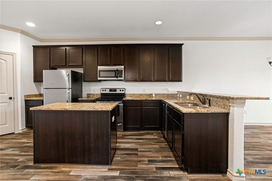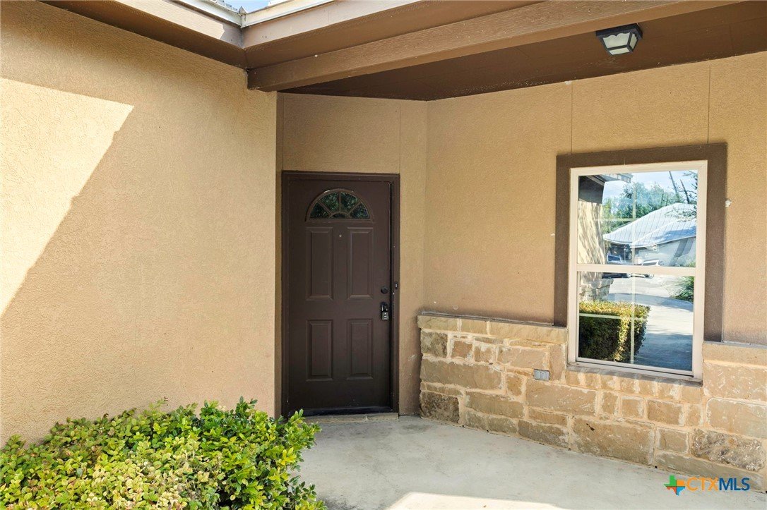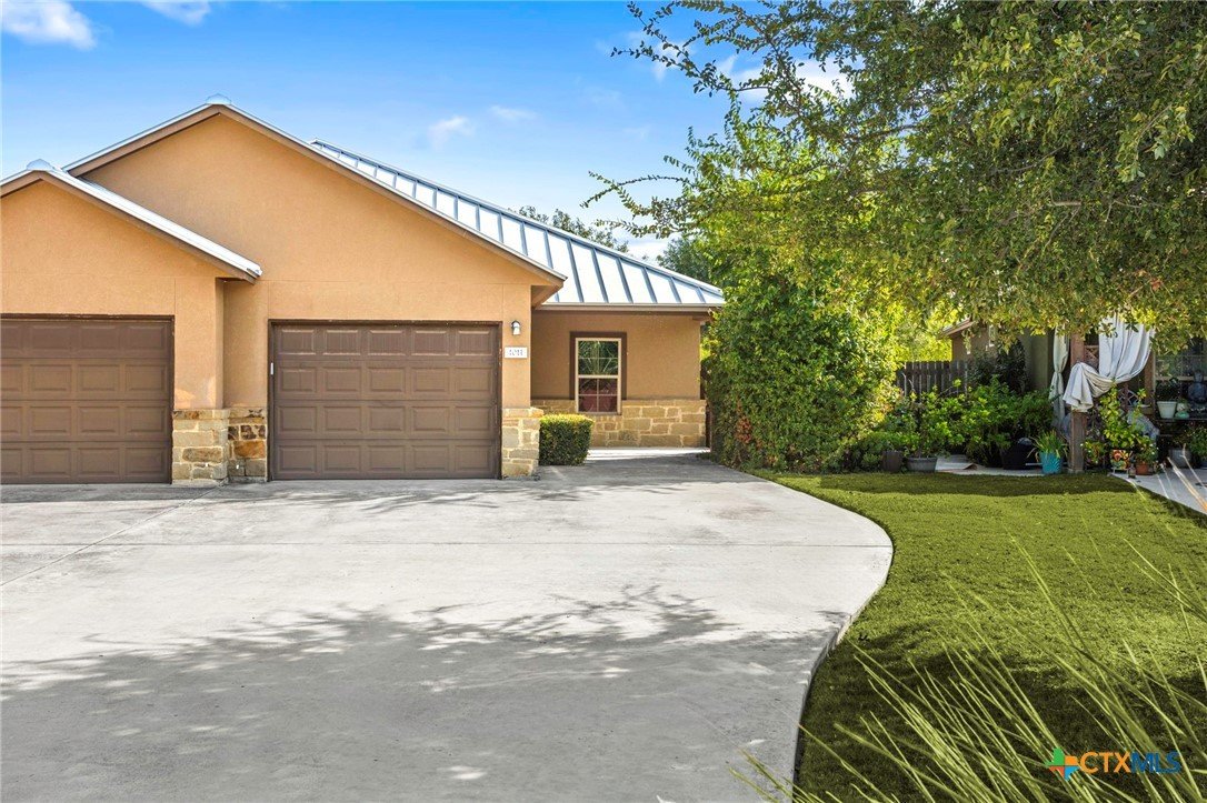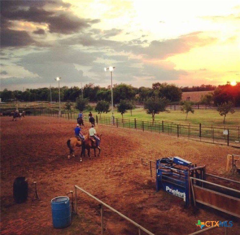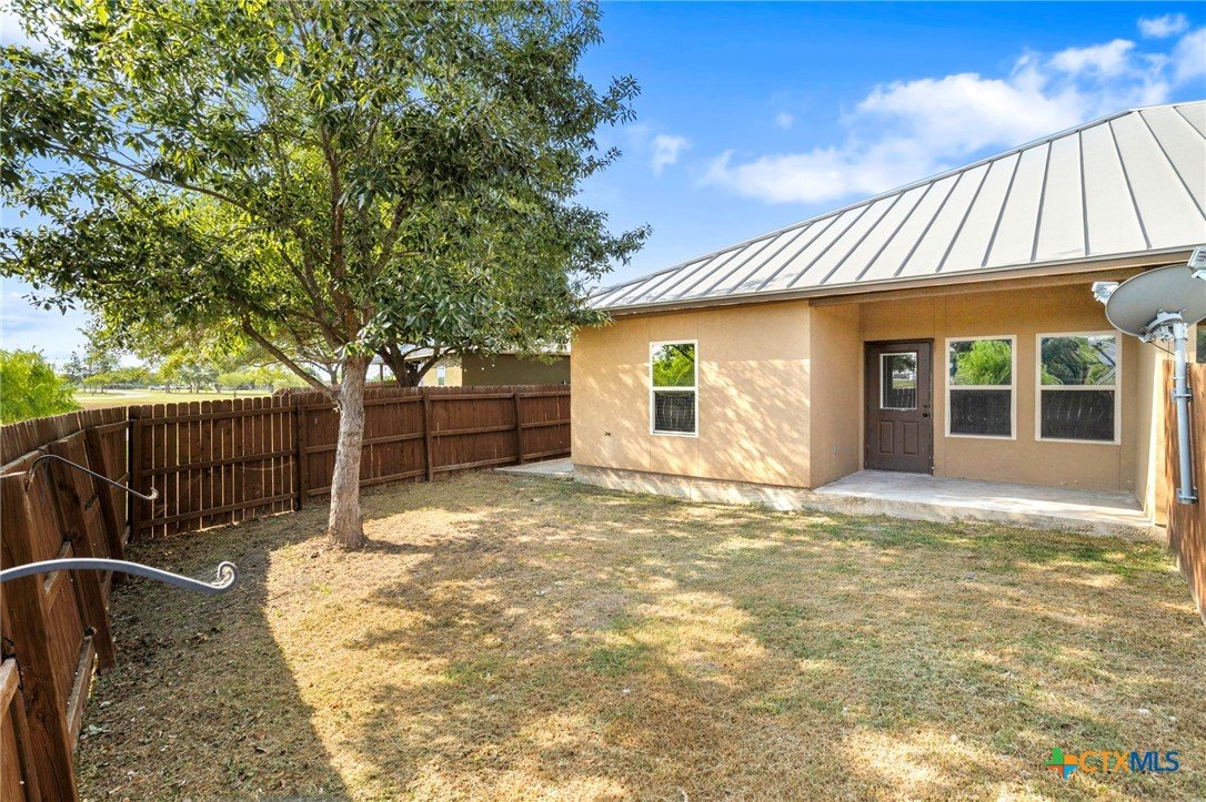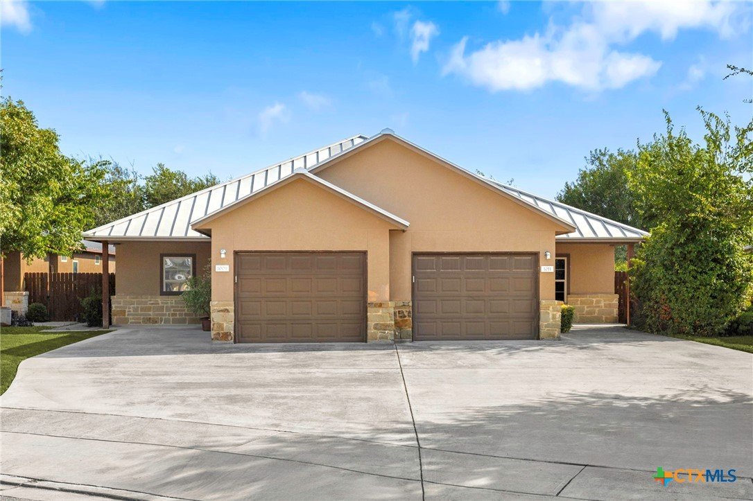 True Texas Nights! Just reduced and one-of-a-kind — this single-story duplex backs up to an active private rodeo arena and horse facility! Enjoy the view without losing your peace and quiet. Open floor plan with granite island kitchen, crown molding, and no carpet — only easy-care wood-look tile throughout. The primary suite features a spa-style dual-head shower, double vanities, and a spacious closet. Relax on the covered patio under the arena lights and Hill Country skies. Fully fenced backyard, stainless appliances (fridge included), sprinkler system, metal roof, and front yard care included. Pet friendly and move-in ready!