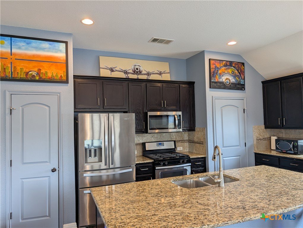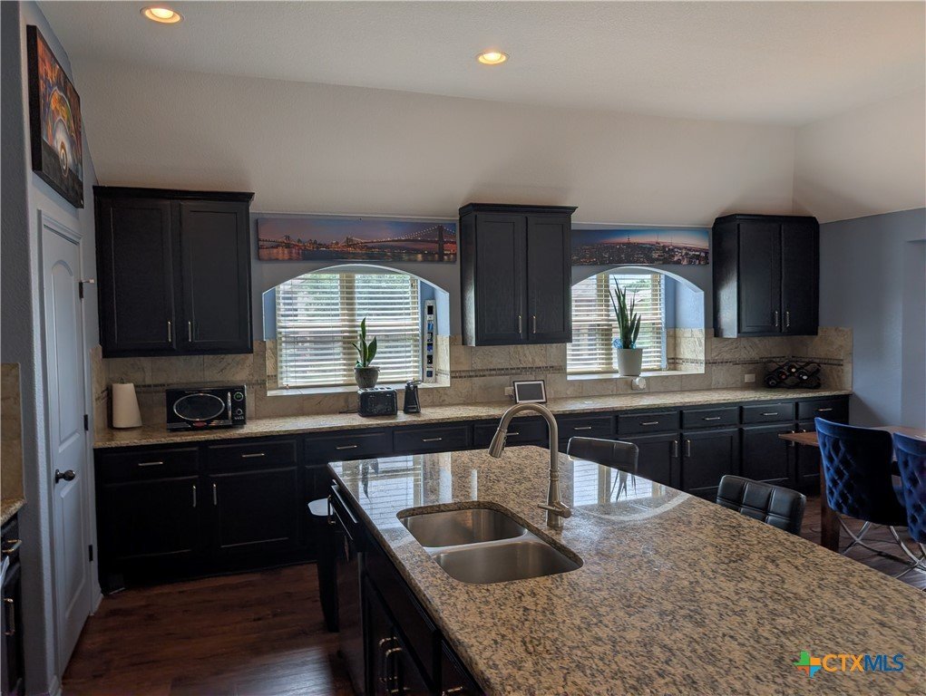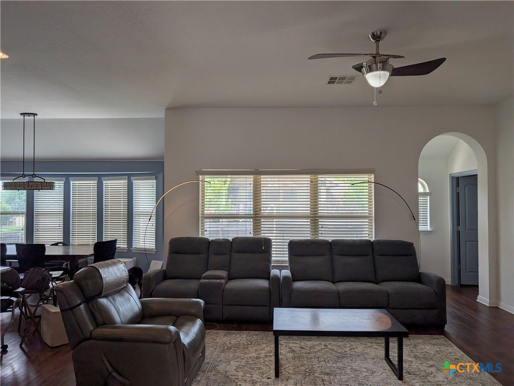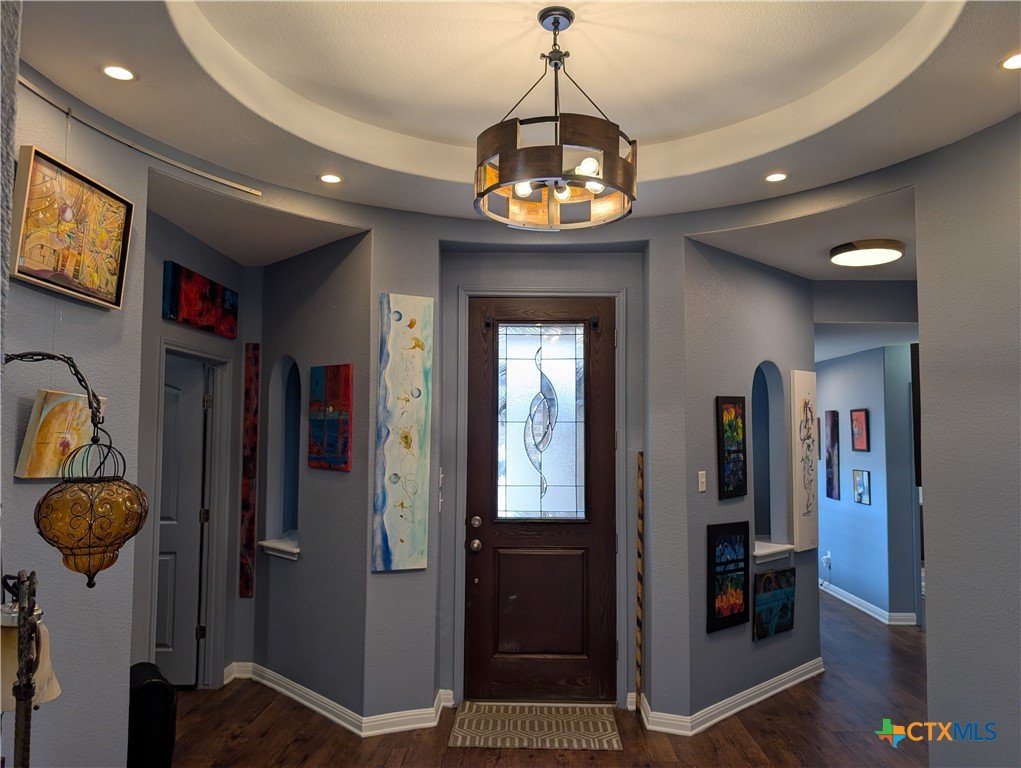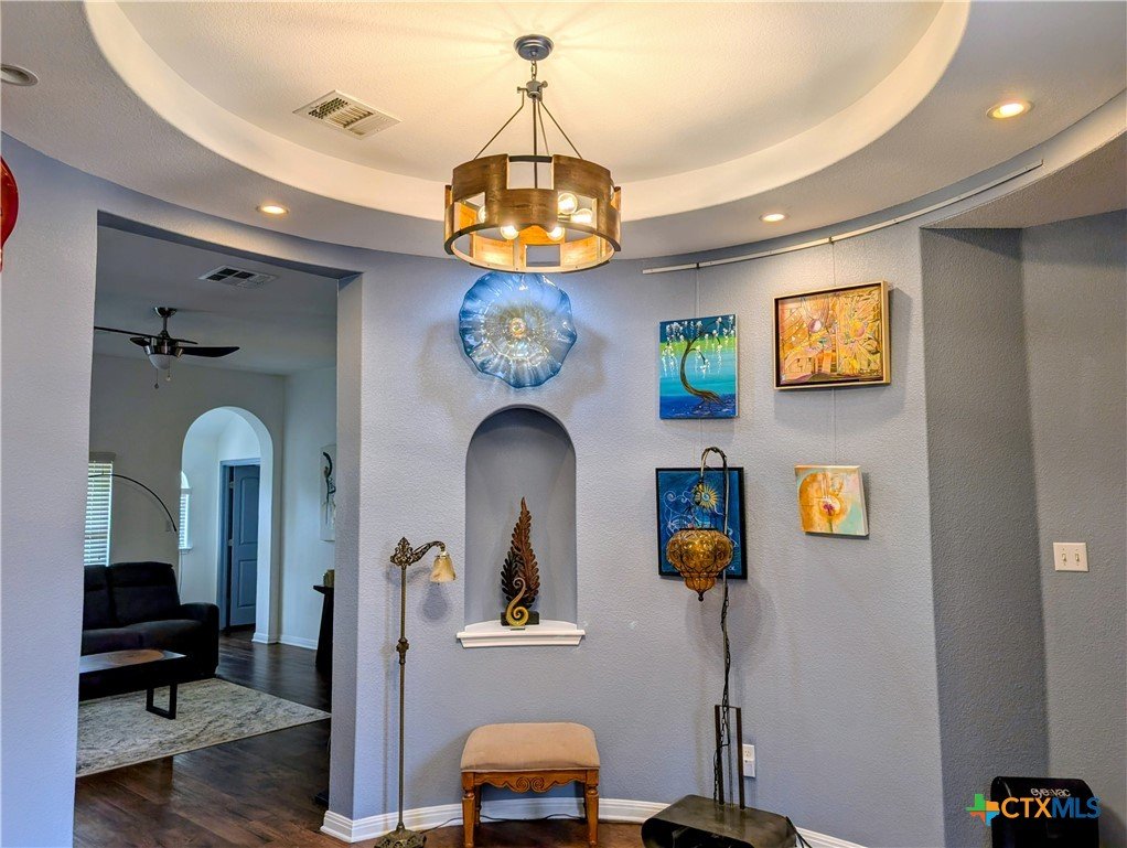 Corner lot within a sought-after golf course community, this single-story Clark Wilson residence is defined by its private courtyard entrance, attached casita with its own dedicated entry, and a 16-foot Michael Phelps swim spa that conveys—offering a rare blend of privacy, flexibility, and lifestyle. Thoughtfully designed with approximately 2,483 square feet, the home opens to a striking circular rotunda foyer, creating an immediate sense of architectural interest and refined flow. The private courtyard entry enhances the arrival experience, setting this home apart from more traditional layouts. The main living spaces are seamlessly connected, with an open-concept design that balances comfort with elevated everyday living. The kitchen is both functional and polished, featuring granite countertops, extensive cabinetry, pull-out shelving, upgraded hardware, and a spacious walk-in pantry—designed to support both entertaining and daily use. The primary suite is positioned as a true retreat, offering dual vanities, a soaking tub, and a separate shower in a layout that prioritizes both comfort and privacy. A defining feature of the home is the attached casita-style guest suite, situated in its own wing with a private entrance. This space offers exceptional flexibility—ideal for extended stays, multigenerational living, or a dedicated, private workspace. Outdoor living continues the home’s appeal, with a covered patio, extended driveway, and a 16-foot Michael Phelps swim spa with color-changing water features, creating a setting that feels both functional and elevated. The spa and storage shed convey, allowing for immediate enjoyment. Positioned on a premium corner lot within a golf course community, this home offers a combination of architectural detail, separation of space, and lifestyle-driven features that are increasingly difficult to find in a single-story layout.