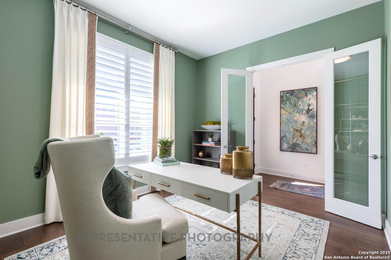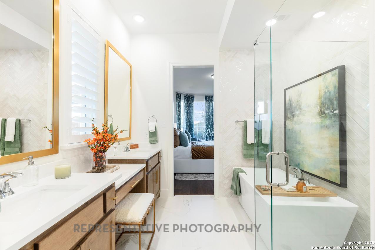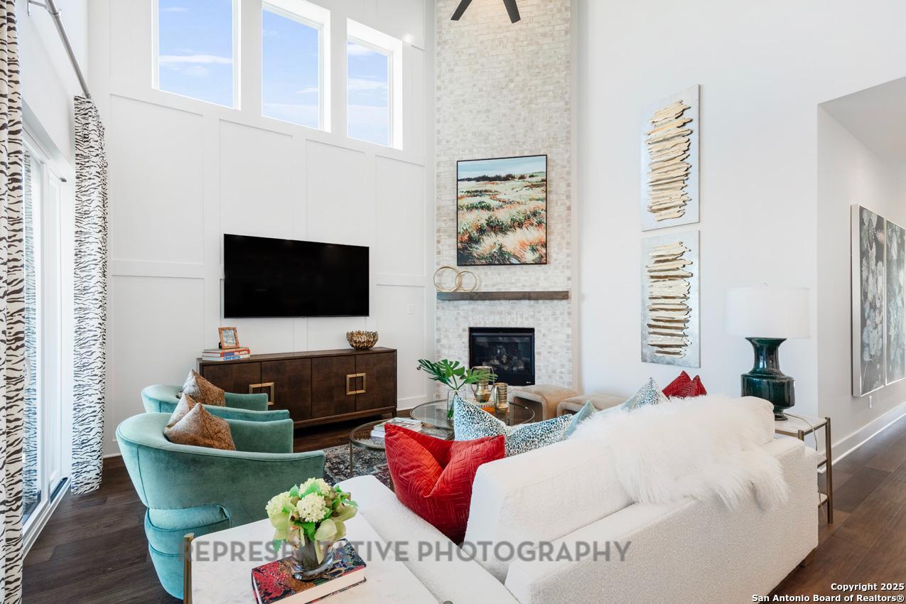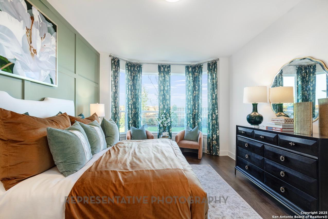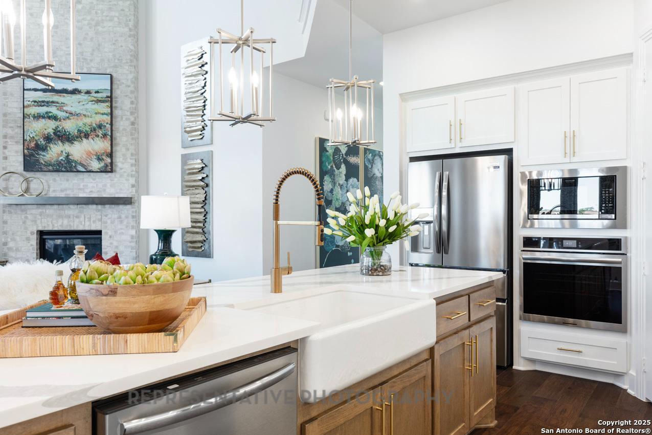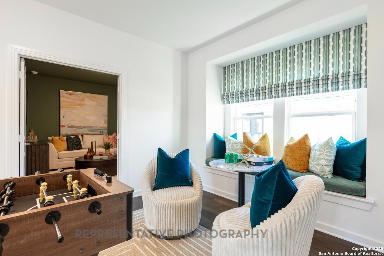 This painted white brick two story home sits on a larger corner lot with views from the rear patio of the Hill Country. The home features wood floors, free standing tub in primary bath, double ovens, white cabinets, bronze window frames and a Sliding glass door to rear patio, white painted brick fireplace, built in hutch in breakfast/dining area and home office. Home under construction with estimated December completion.