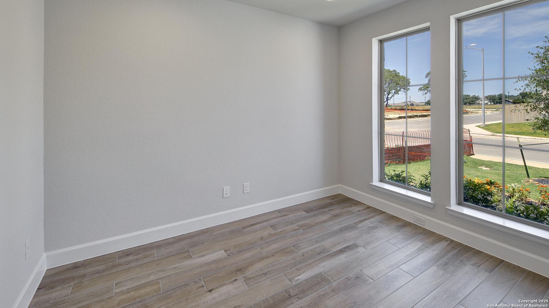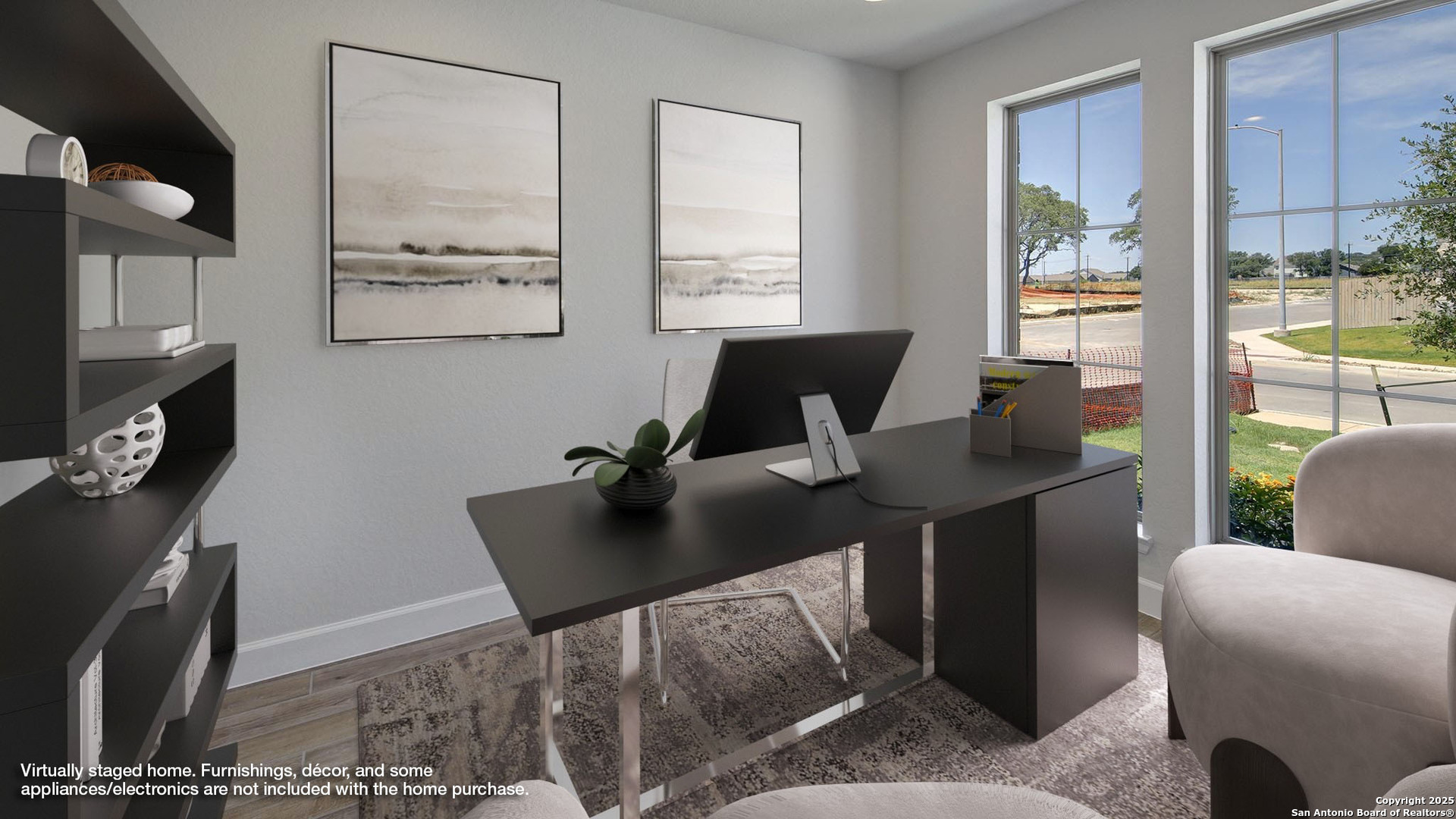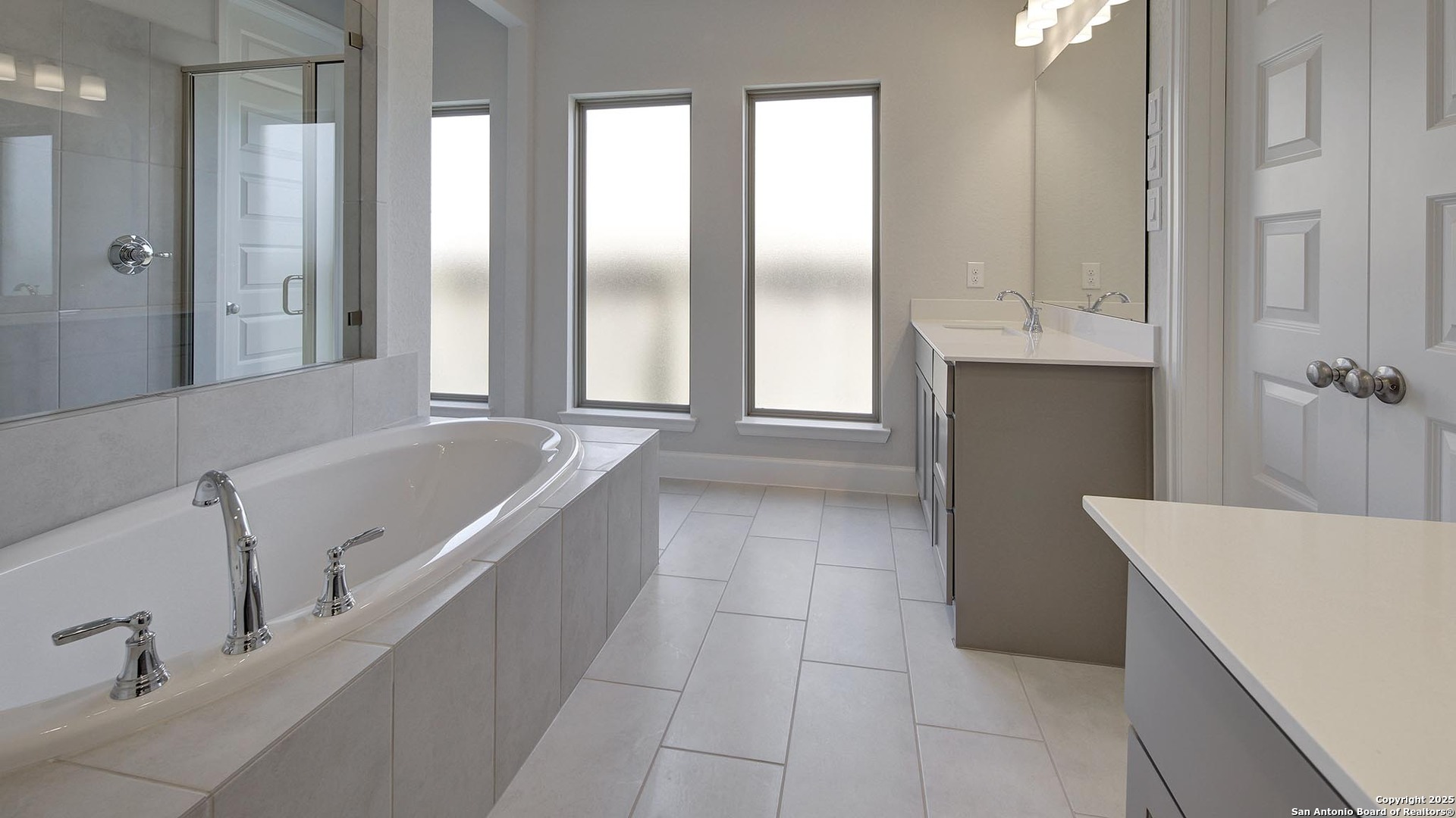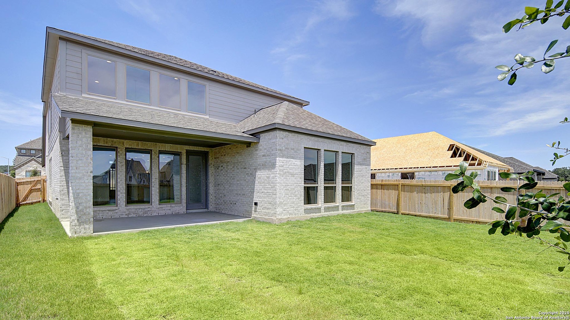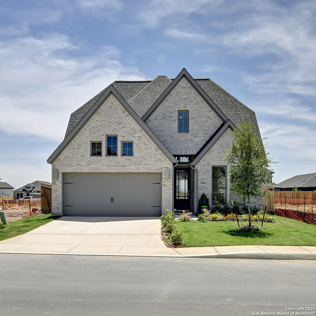 Home office with French doors set at two-story entry. Dining area opens to kitchen and adjacent two-story family room. Kitchen features walk-in pantry and generous island with built-in seating space and 5-burner gas cooktop. Family room features wall of windows. First-floor primary suite includes primary bath with dual vanity, garden tub, separate glass-enclosed shower and two walk-in closets. An additional bedroom is downstairs. A game room and two secondary bedrooms are upstairs. Covered backyard patio and 5-zone sprinkler system. Mud room off two-car garage.