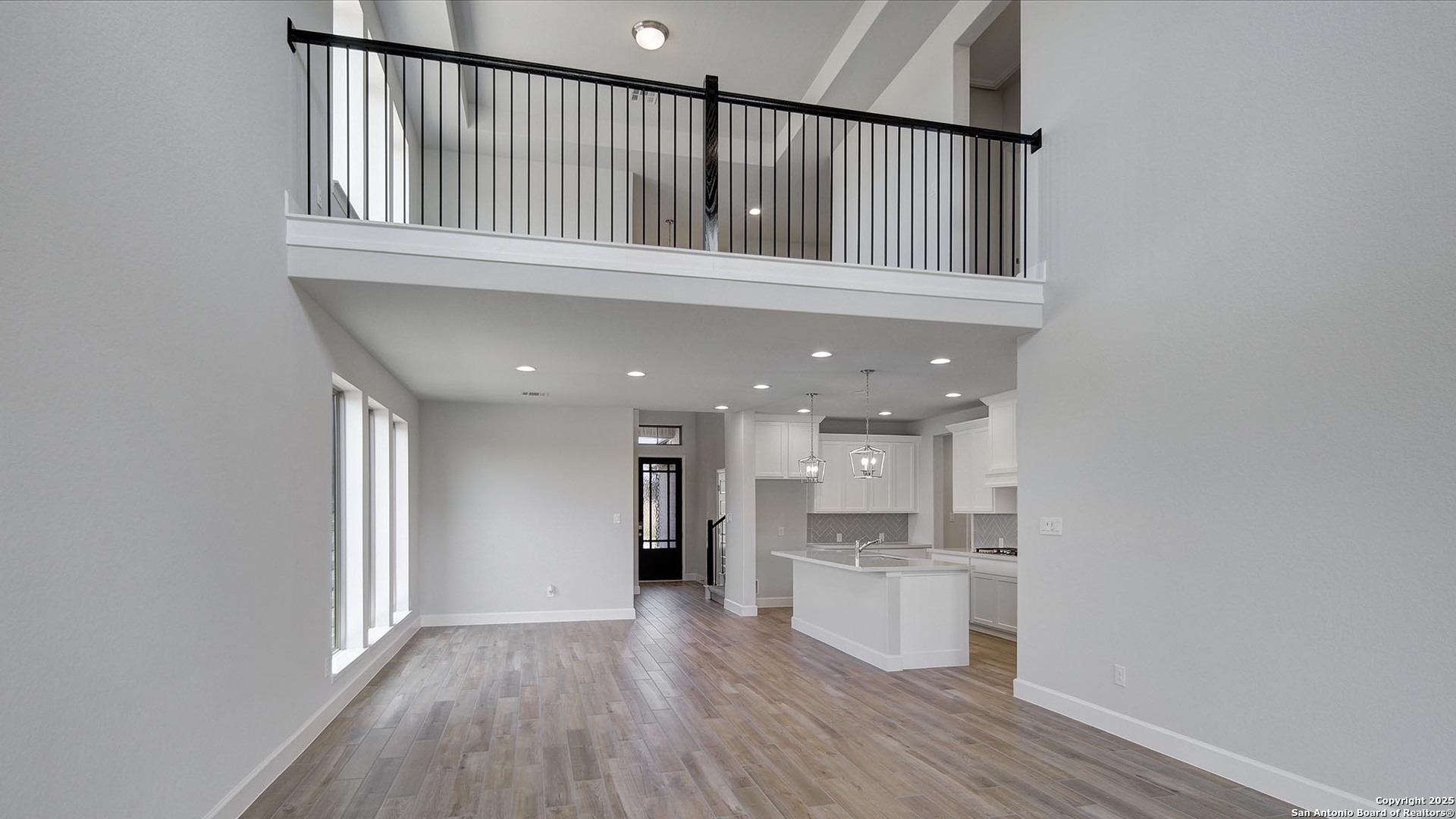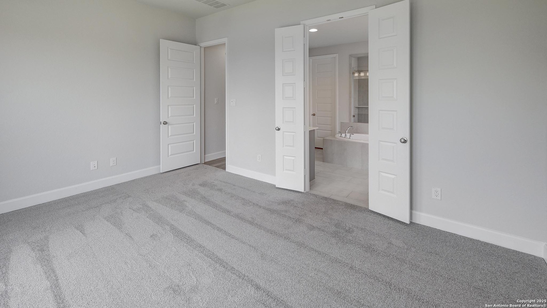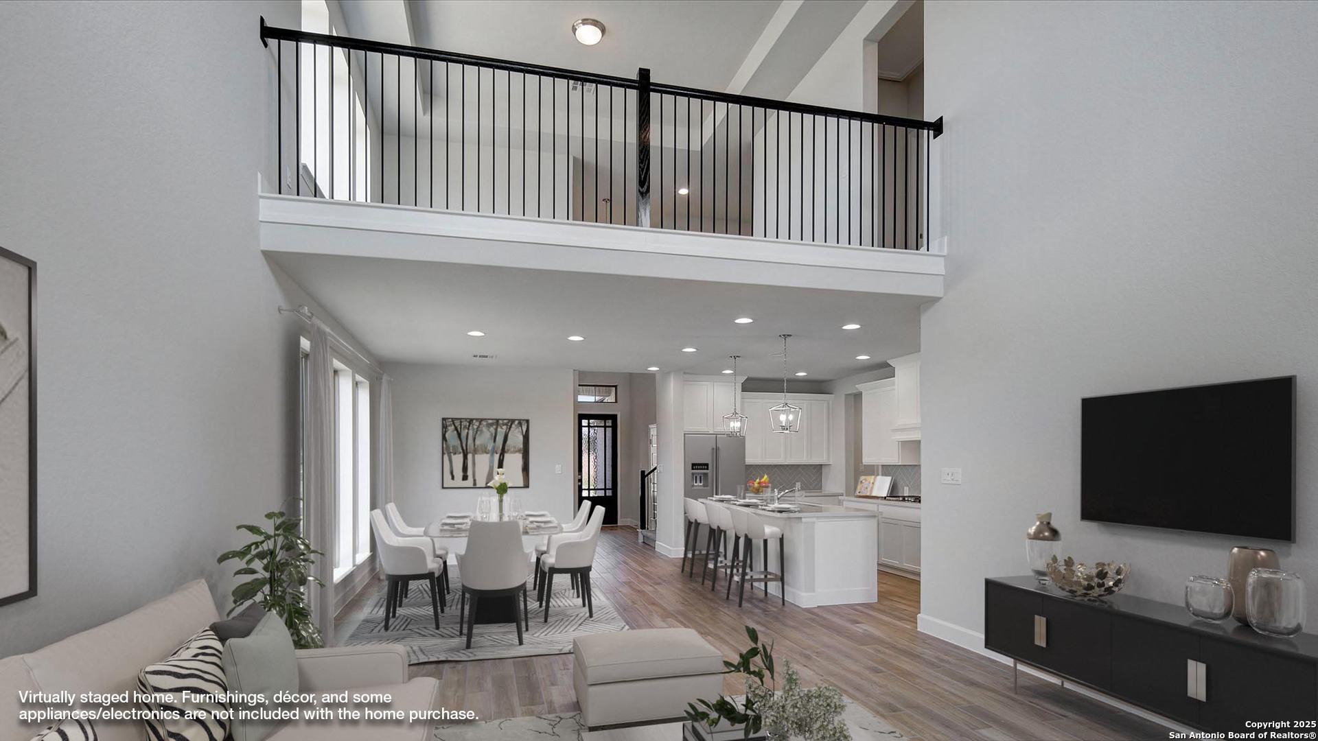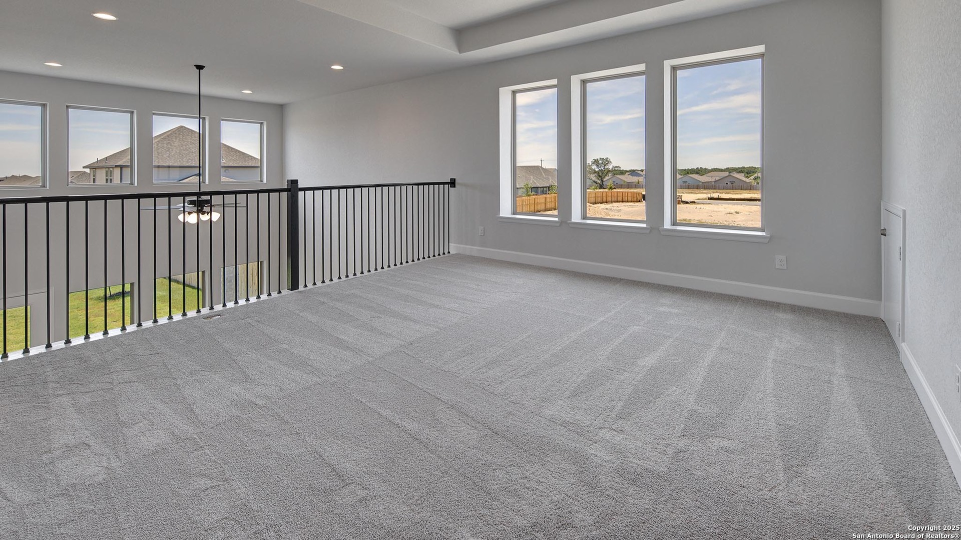 Home office with French doors set at two-story entry. Dining area opens to kitchen and adjacent two-story family room. Kitchen features walk-in pantry and generous island with built-in seating space and 5-burner gas cooktop. Family room features wall of windows. First-floor primary suite includes primary bath with dual vanity, garden tub, separate glass-enclosed shower and two walk-in closets. An additional bedroom is downstairs. A game room and two secondary bedrooms are upstairs. Covered backyard patio and 5-zone sprinkler system. Mud room off two-car garage.