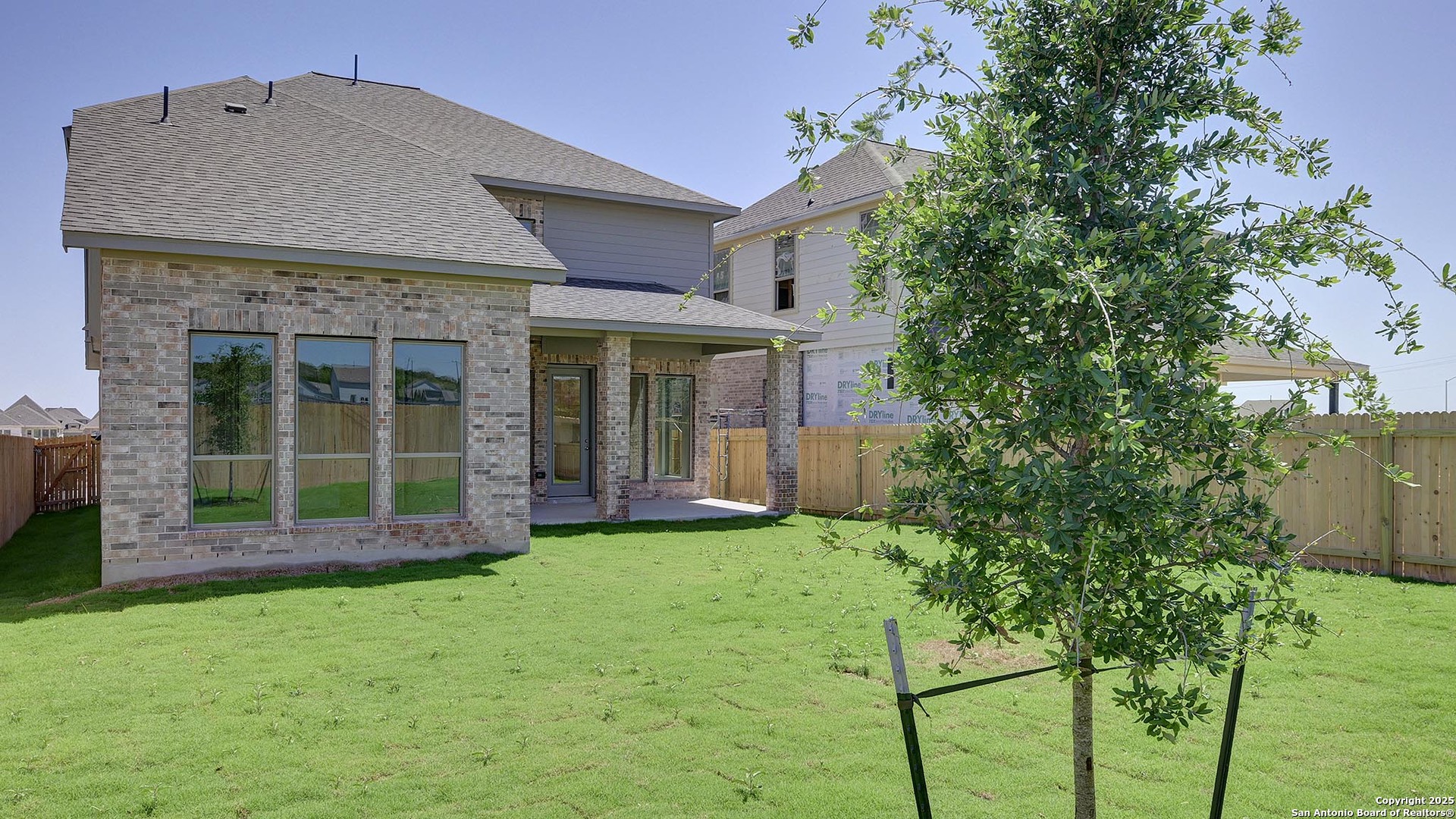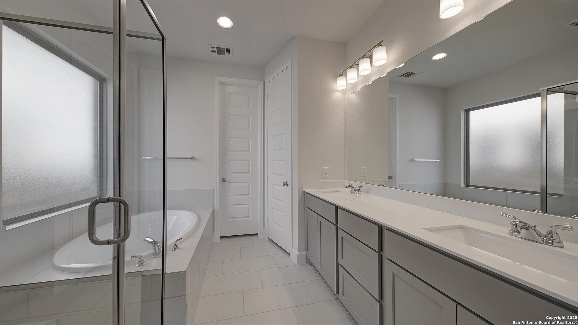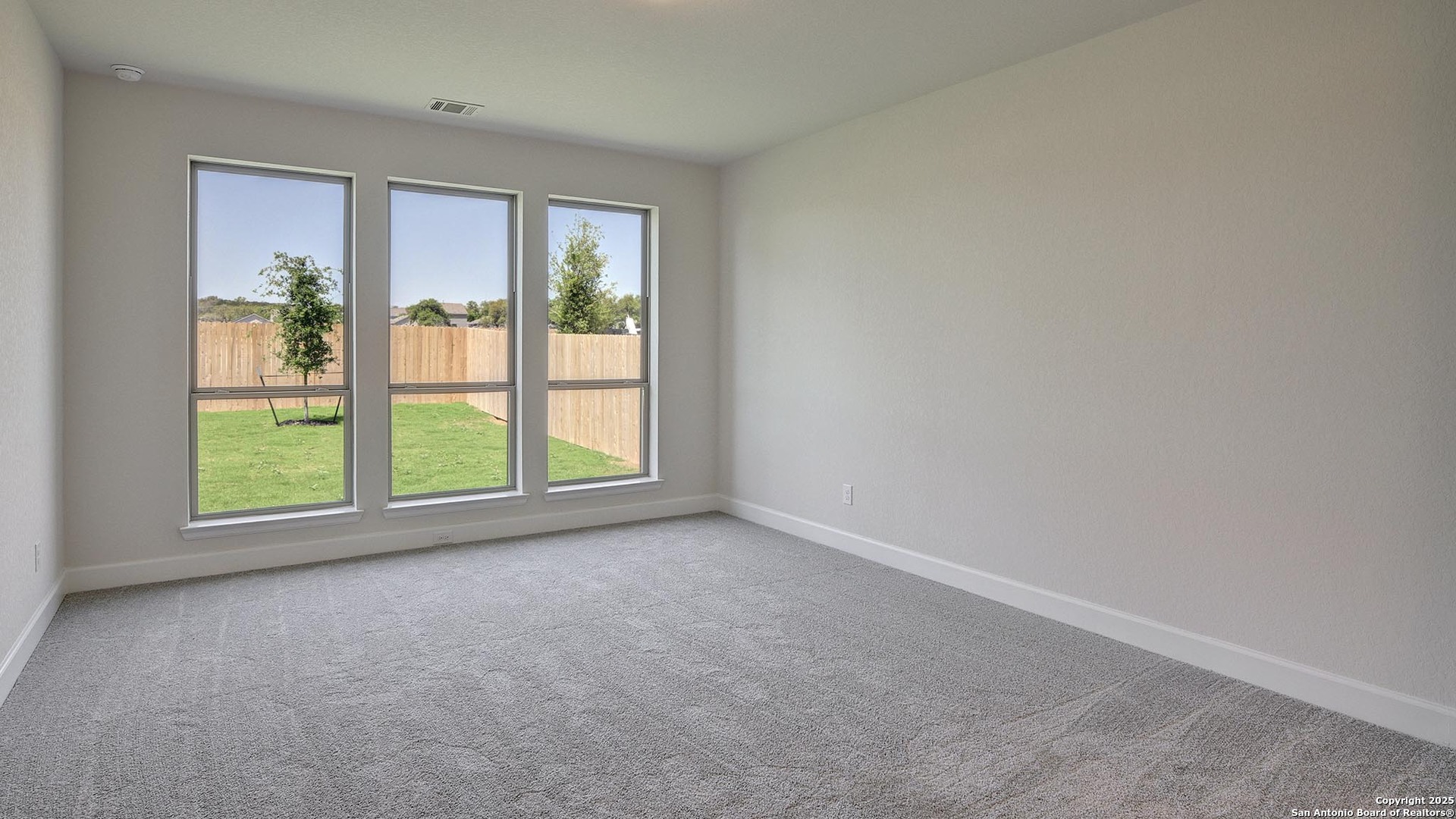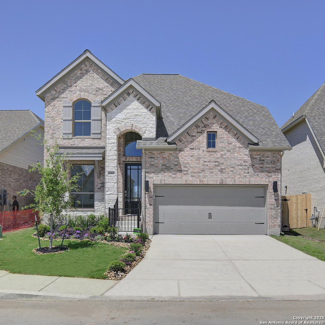 Home office with French doors set at two-story entry. Two-story family room opens to kitchen and morning area. Kitchen features large walk-in pantry and generous island with built-in seating space. Family room features wall of windows. First-floor primary suite includes bedroom with wall of windows. Dual sinks, garden tub, separate glass-enclosed shower and large walk-in closet in primary bath. Game room and all secondary bedrooms are upstairs. Extended covered backyard patio and 5-zone sprinkler system. Two-car garage.