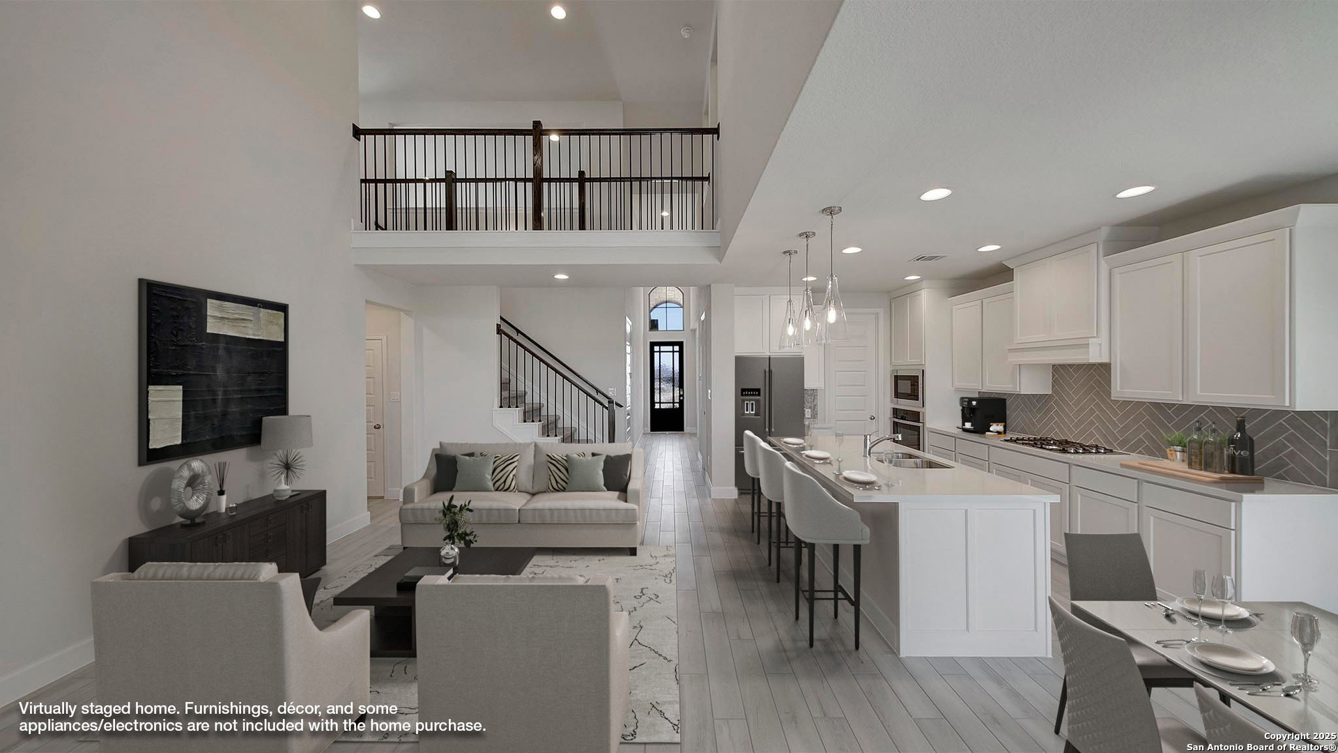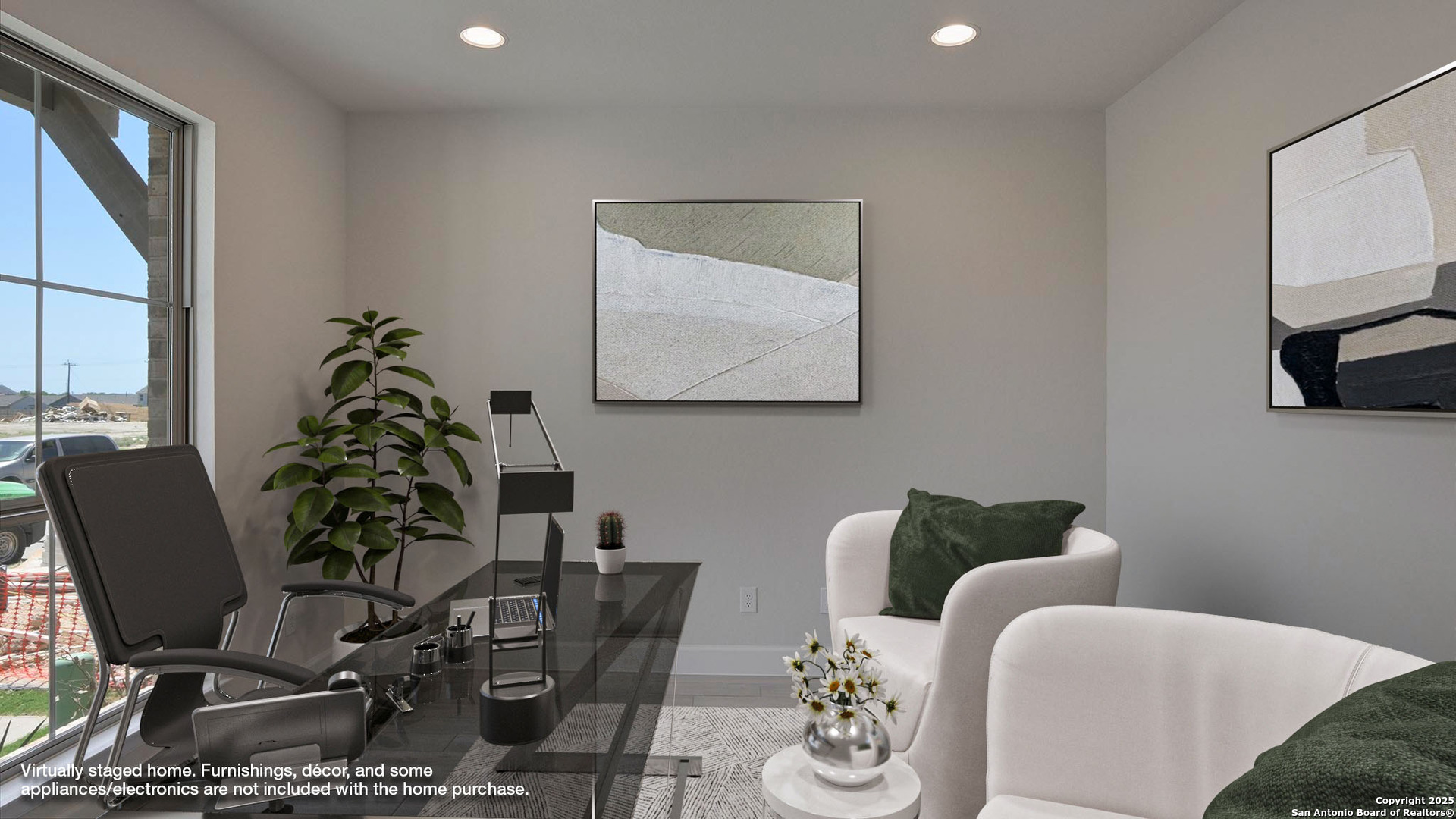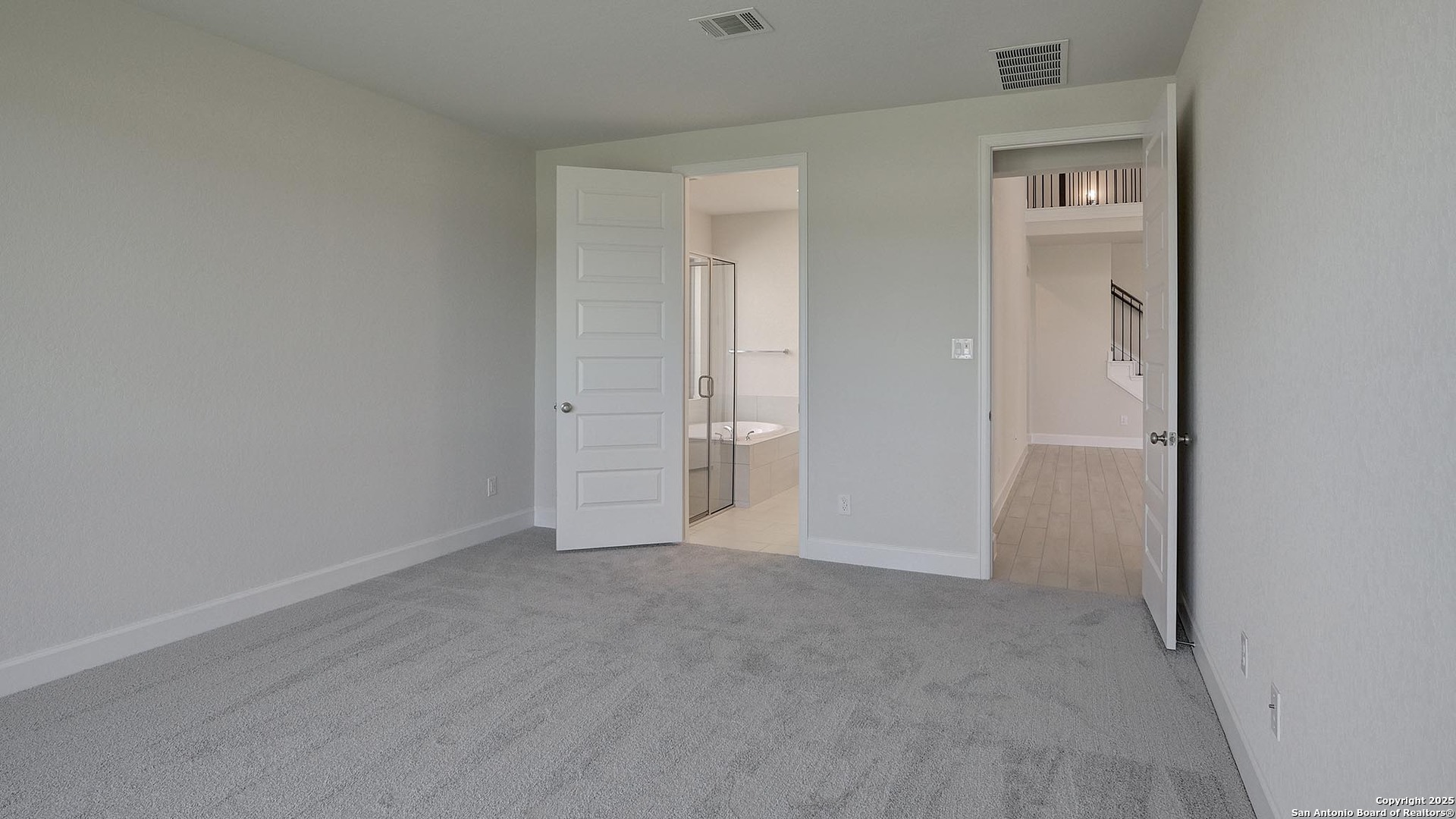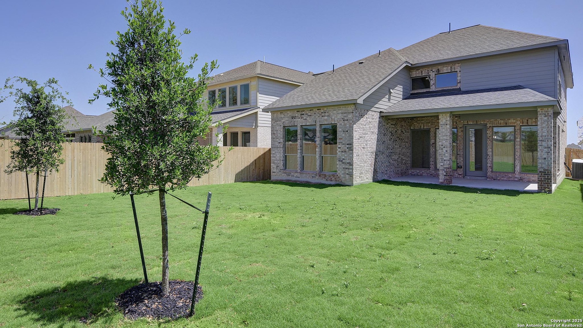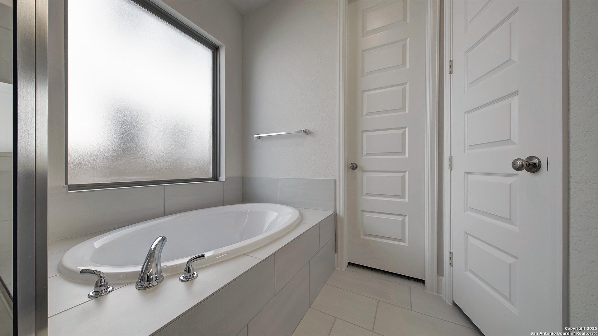 Home office with French doors set at two-story entry. Two-story family room opens to kitchen and morning area. Kitchen features large walk-in pantry and generous island with built-in seating space. Family room features wall of windows. First-floor primary suite includes bedroom with wall of windows. Dual sinks, garden tub, separate glass-enclosed shower and large walk-in closet in primary bath. Game room and all secondary bedrooms are upstairs. Extended covered backyard patio and 5-zone sprinkler system. Two-car garage.