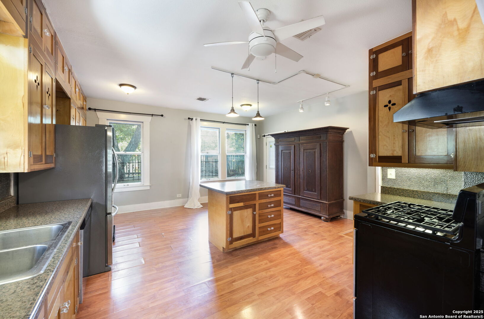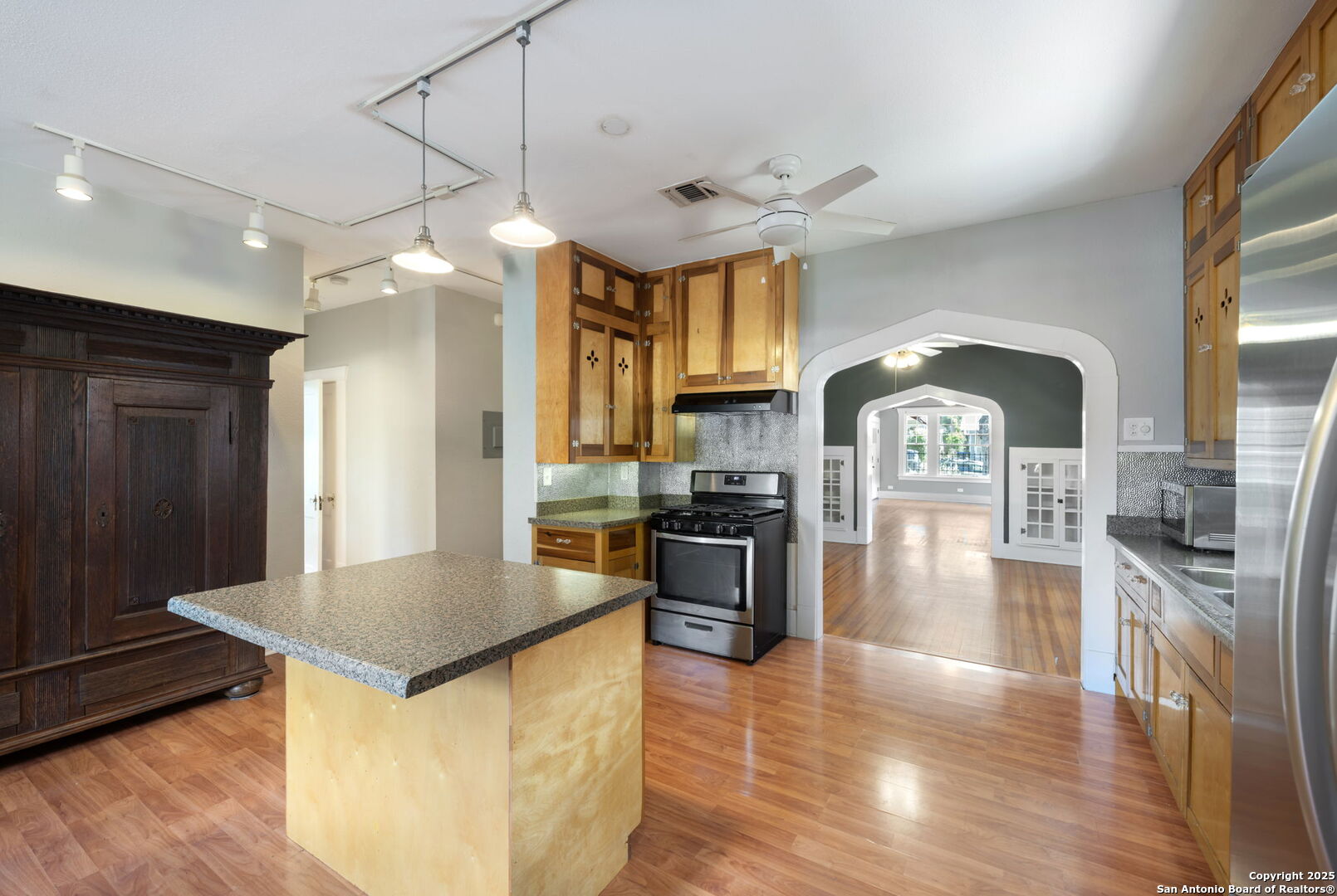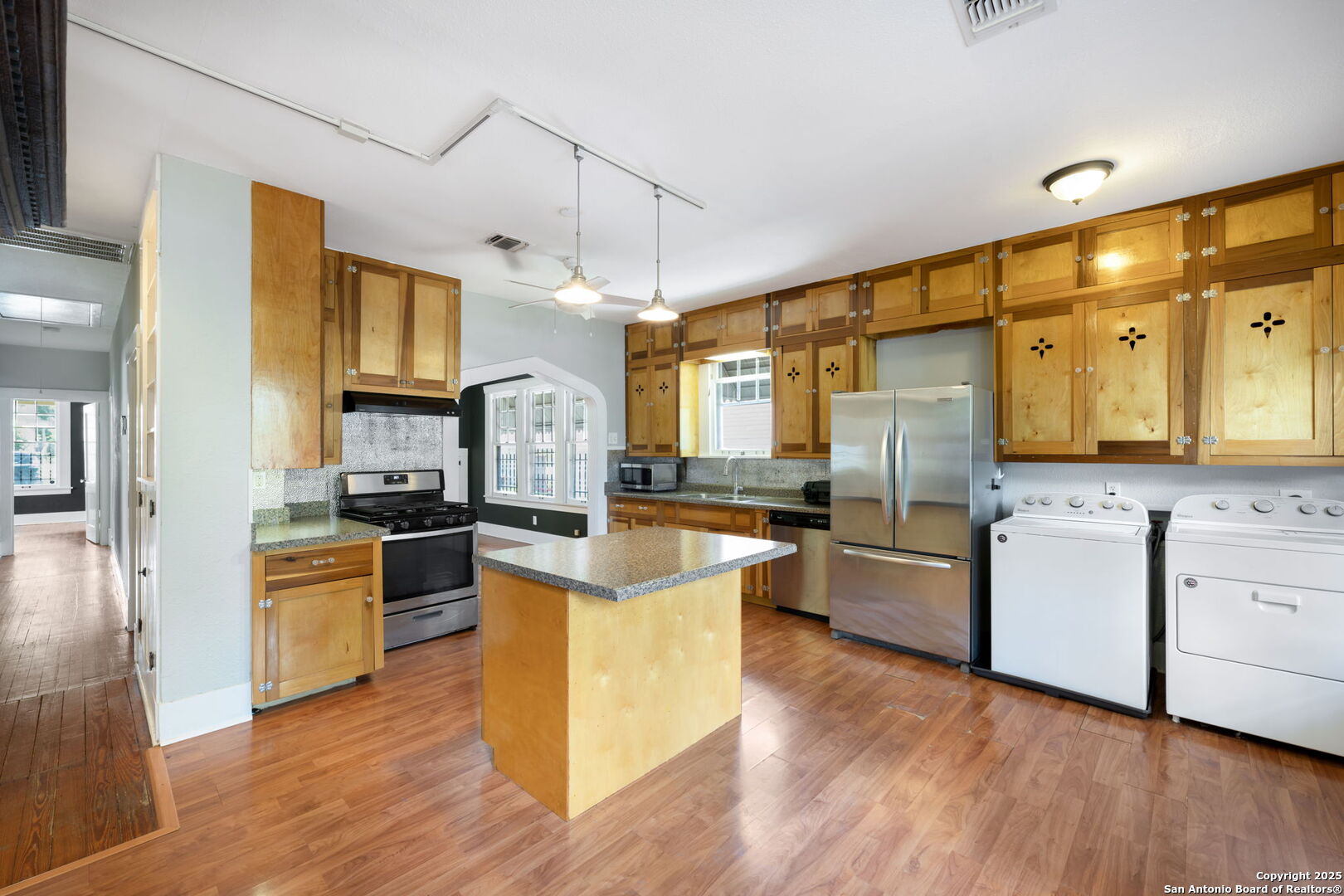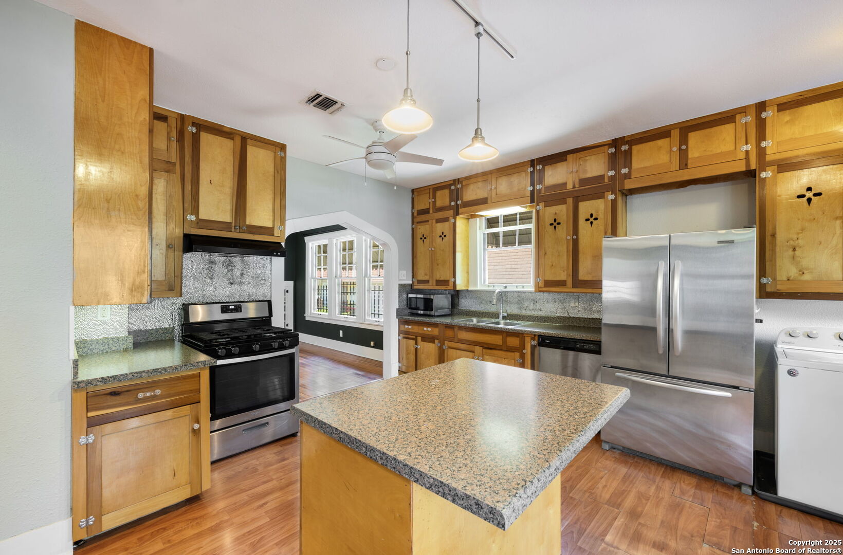 Historic Craftsman in the Heart of Beacon Hill! Step into timeless elegance and original charm with this beautifully preserved home in one of San Antonio's most beloved historic neighborhoods. Featuring 3 bedrooms, 2 bathrooms, and a detached two-car garage with workshop, this residence blends period craftsmanship with thoughtful modern updates. The inviting wrap-around front porch and expansive back deck create picture-perfect spaces for entertaining or unwinding, while mature trees provide a canopy of shade year-round. Inside, you'll discover original woodwork, gleaming hardwood floors, mosaic tile, and built-in china cabinets in the dining room, each detail carefully maintained to honor the home's heritage. A remarkable full-footprint cellar offers endless possibilities for storage, expansion, or creative use. Additional highlights include a durable metal roof, stone-paved backyard, and a full-yard sprinkler system for easy maintenance. Ideally located just two blocks west of Blanco Road, this home offers classic style, walkable convenience, and the enduring beauty of Beacon Hill living.