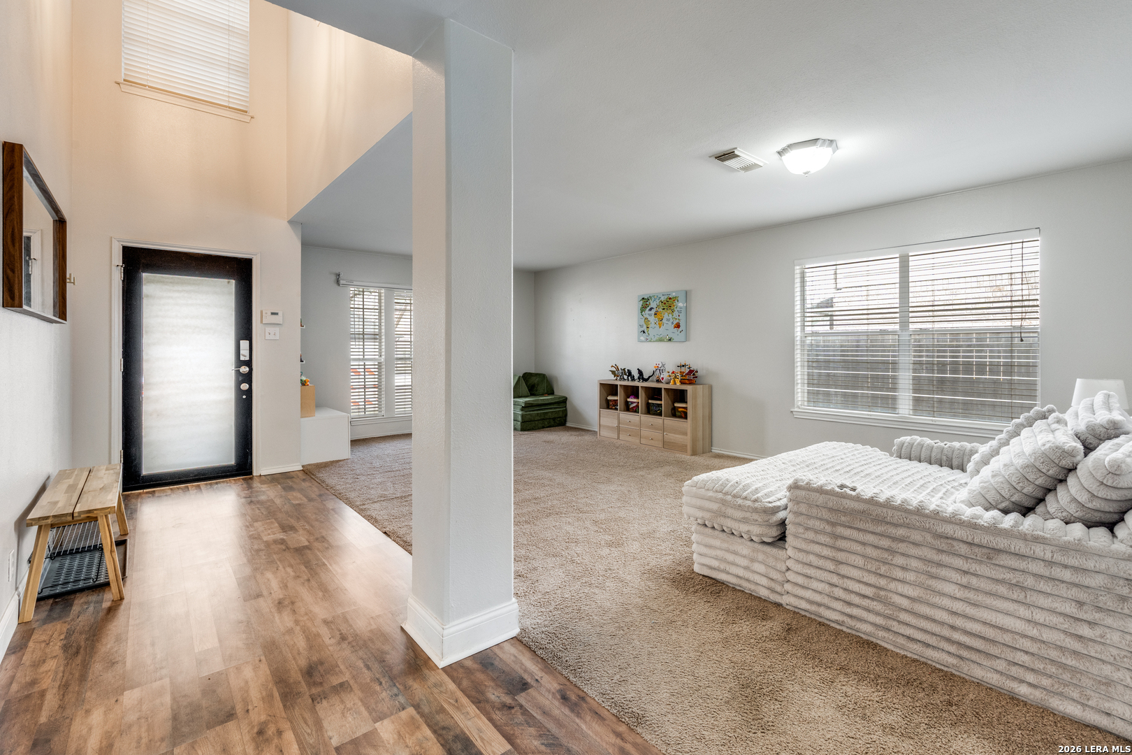 VA assumable loan available. Welcome to this beautiful home located in the desirable community of Schertz, conveniently close to Randolph AFB, shopping, dining, schools, and major highways. This wonderful 4-bedroom, 3-bath, two-story home offers plenty of space to live, entertain, and play. As you step inside, you're welcomed by tall ceilings and a bright, open-concept layout that seamlessly connects the living room, dining area, and kitchen. The kitchen features rich cabinetry, beautiful granite countertops, and ample space for cooking and gathering. The home boasts durable vinyl plank flooring throughout the main level, with cozy carpet upstairs. The spacious primary suite provides a relaxing retreat with a dual-sink bathroom, garden tub, and a walk-in closet. Additional bedrooms are generously sized, offering flexibility for guests, a home office, or playroom. The backyard provides space to relax, entertain, or enjoy outdoor activities. With its functional layout, modern finishes, and convenient location, this home is ready to welcome its next owner. Schedule your showing today.