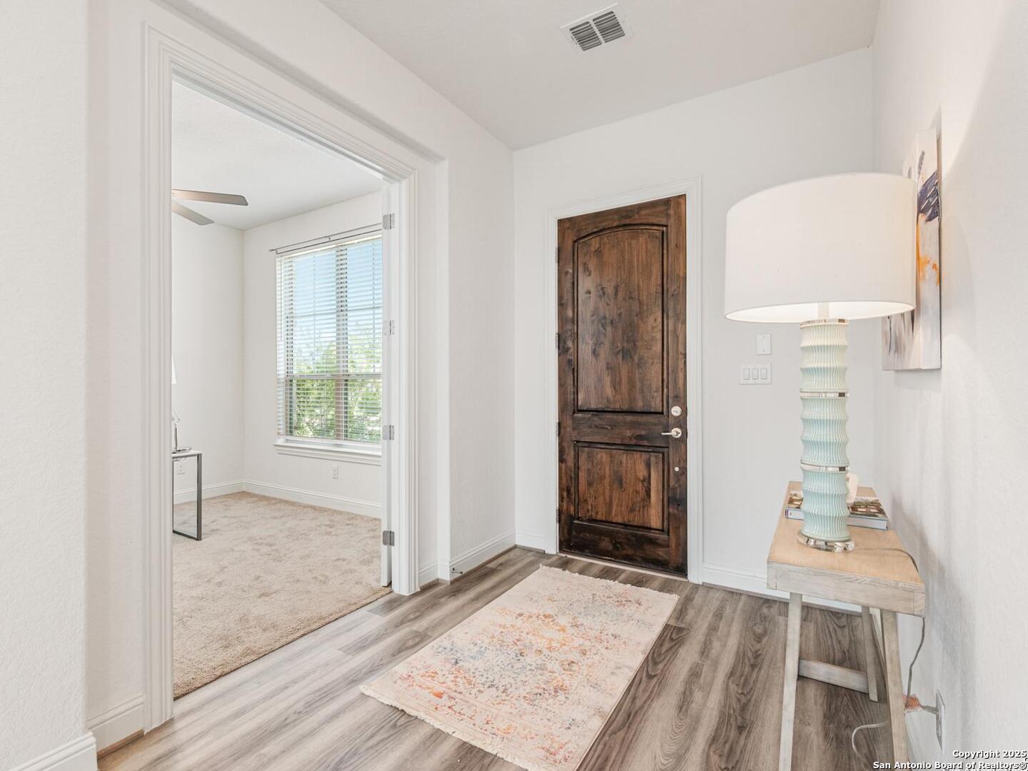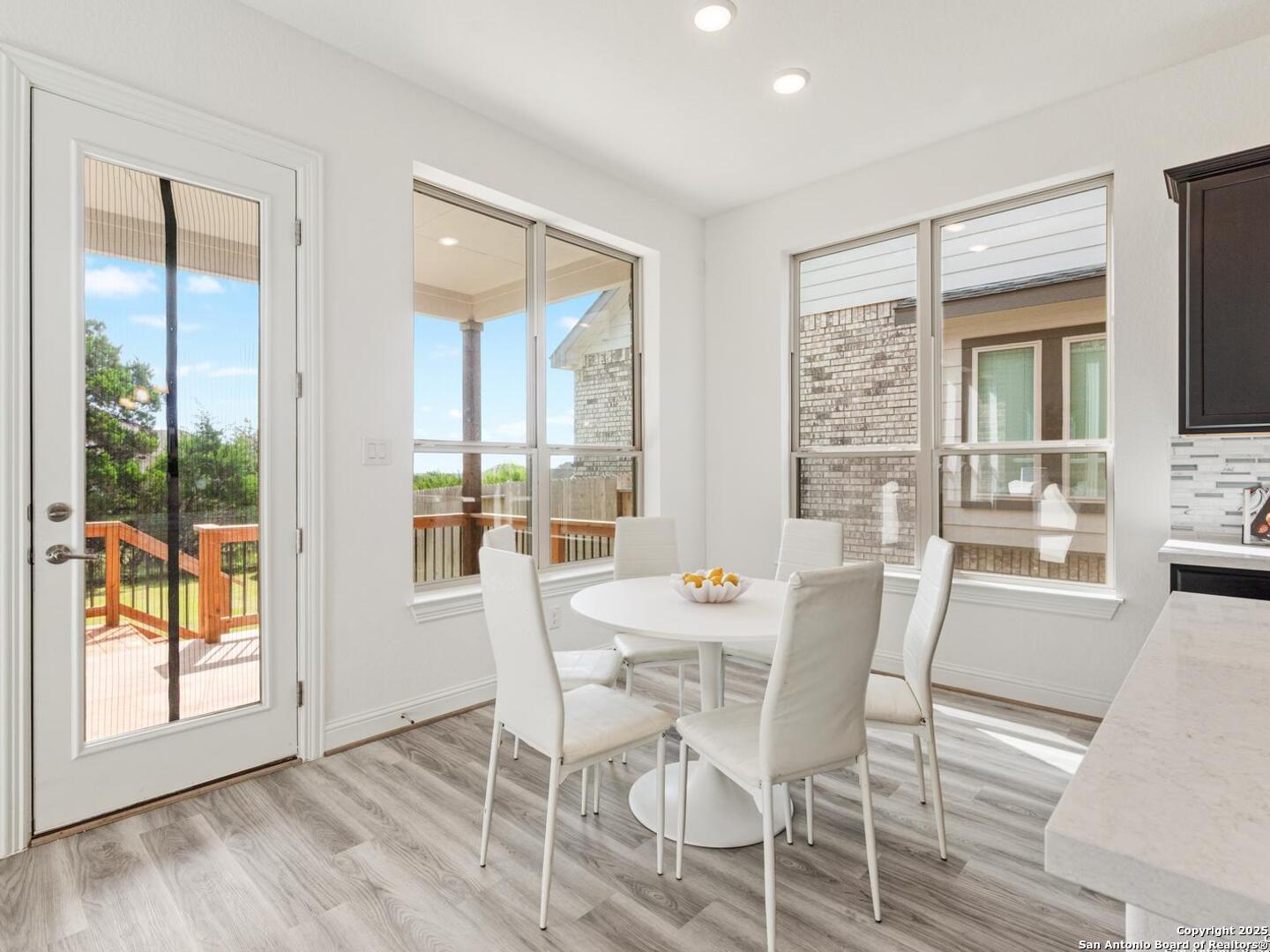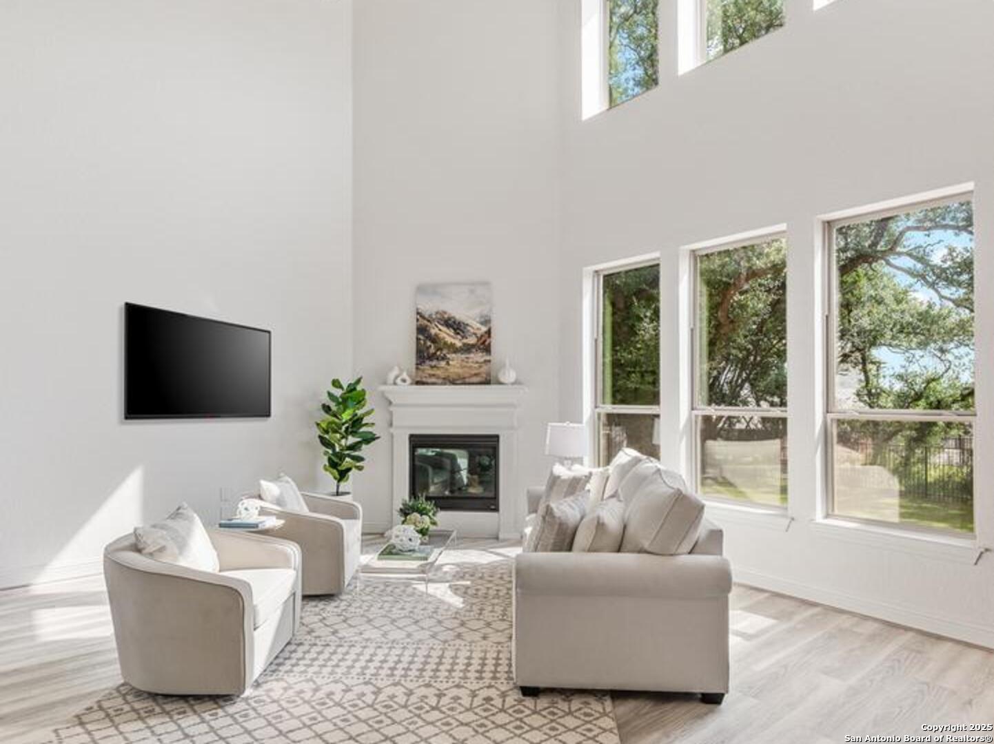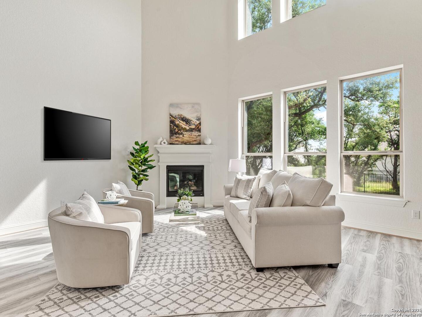 Enjoy an easy commute to San Antonio or the Medical Center while living just minutes from La Cantera, The Rim, downtown Boerne, and top-rated schools. This elegant 5-bedroom, 3.5-bath home sits on a quiet greenbelt in coveted Regent Park-and because it was occupied only briefly during a corporate relocation, it feels truly like new. A charming front porch and 8' solid wood door open to a bright foyer with wide plank floors. The main level offers a private study, formal dining, and a spacious living room with dramatic ceiling and stone fireplace. The gourmet kitchen features a large quartz island, upgraded marble backsplash, gas cooktop, stainless appliances, walk-in pantry, and casual dining overlooking the backyard. The first-floor primary suite provides a spa-like retreat with dual vanities, soaking tub, walk-in shower, and a generous closet. Upstairs, a large game room anchors four bedrooms-all with walk-in closets-and two full baths. A mudroom with built-ins and a spacious laundry room add everyday convenience. Outside, enjoy a covered patio, professional landscaping, a 6' privacy fence, and a full sprinkler system. Regent Park offers resort-style amenities including a sparkling pool, clubhouse with gym and event space, playground, and wide sidewalks. Move-in ready, lightly lived-in, and impeccably maintained, this nearly new home is a rare opportunity-and just in time for the holidays. Move in before the end of the year and make this exceptional property your best holiday gift yet.