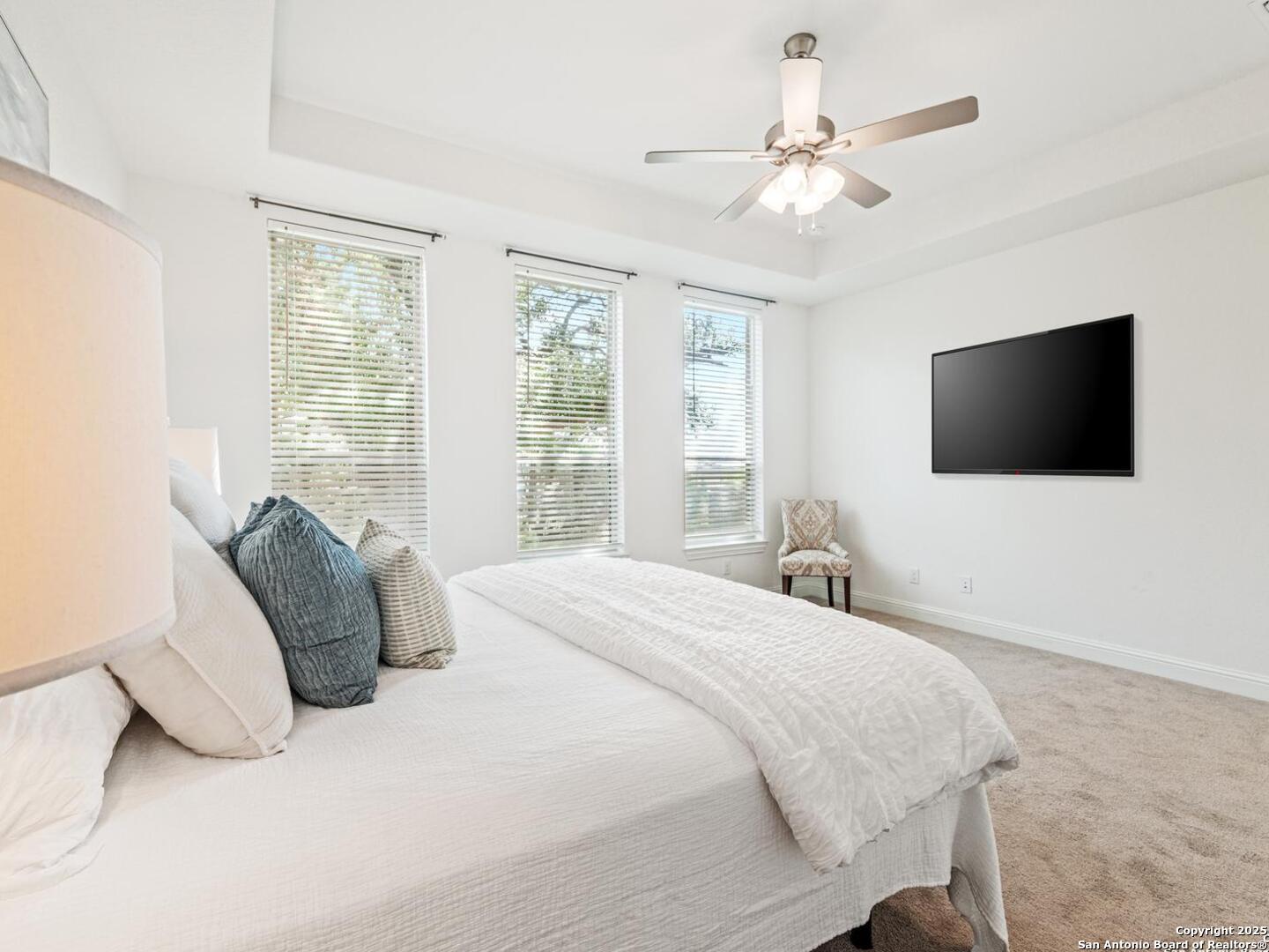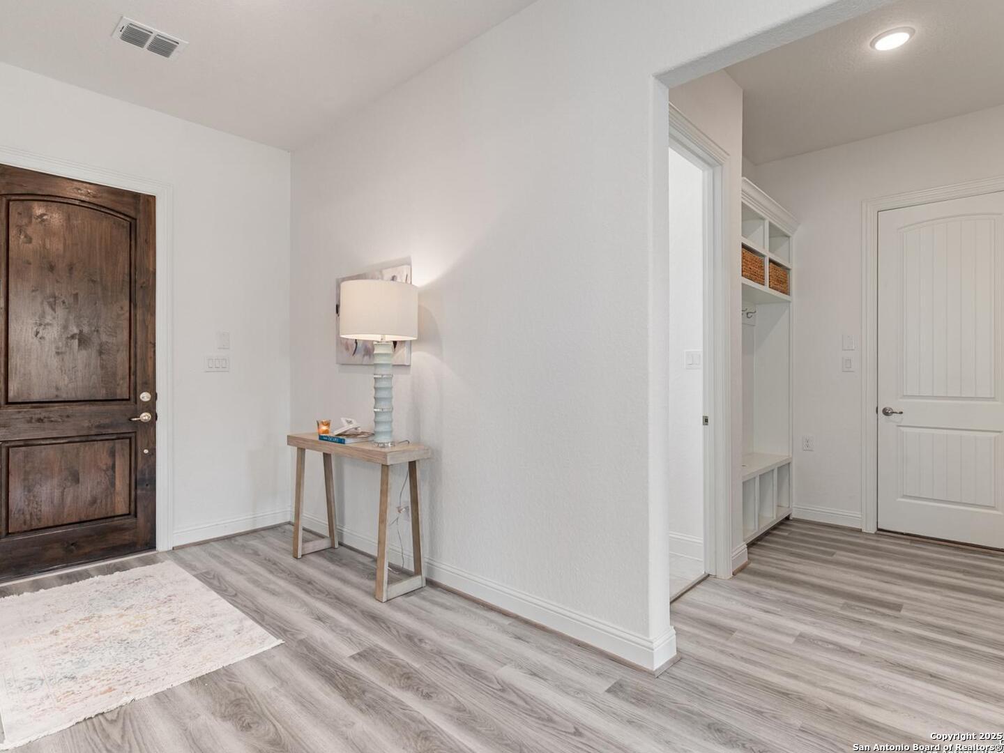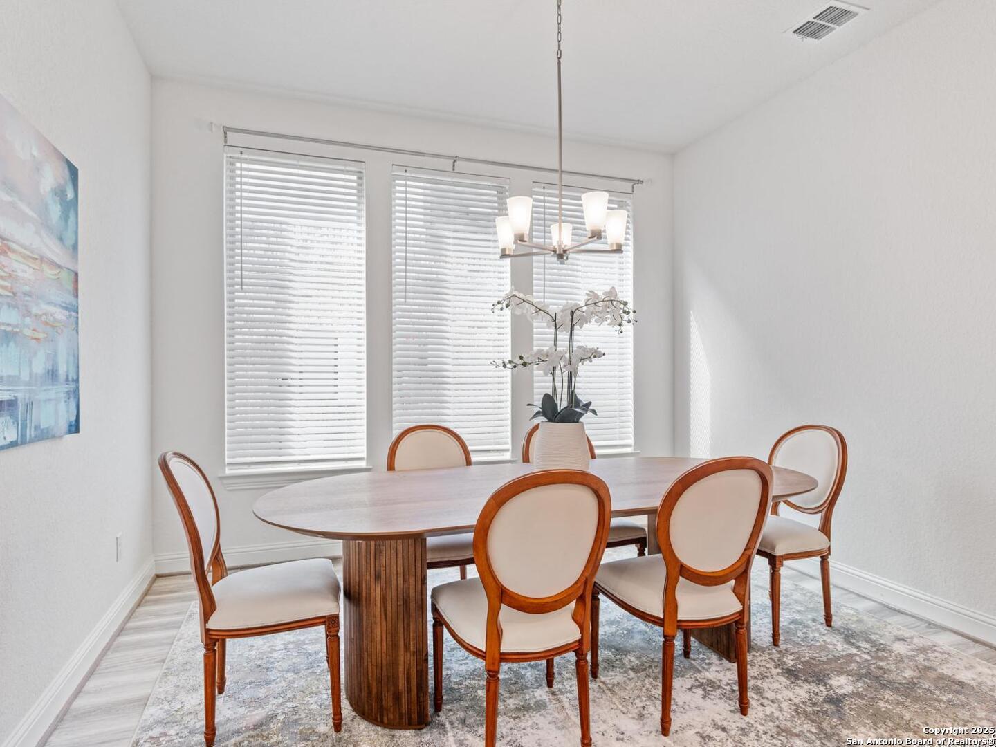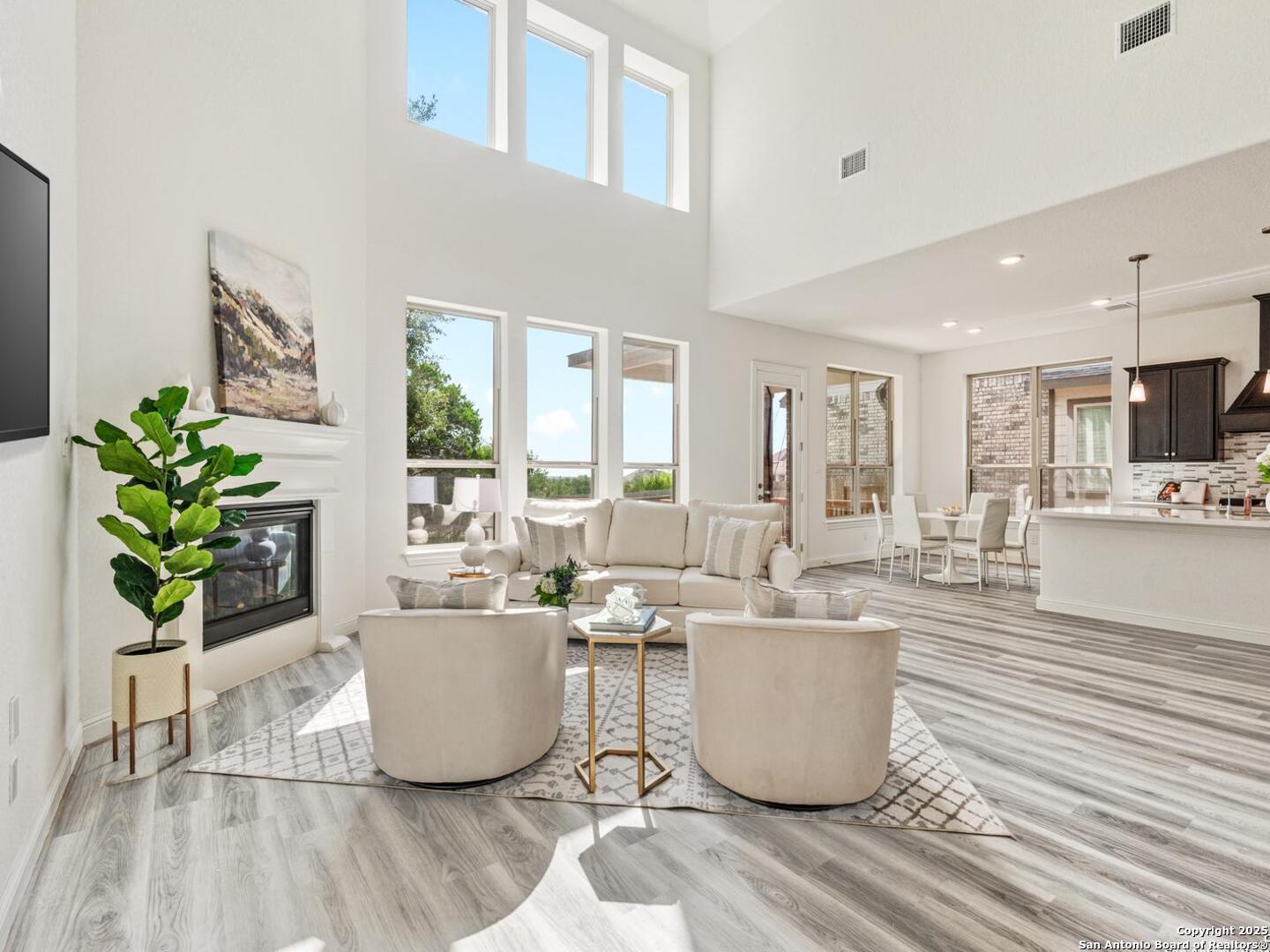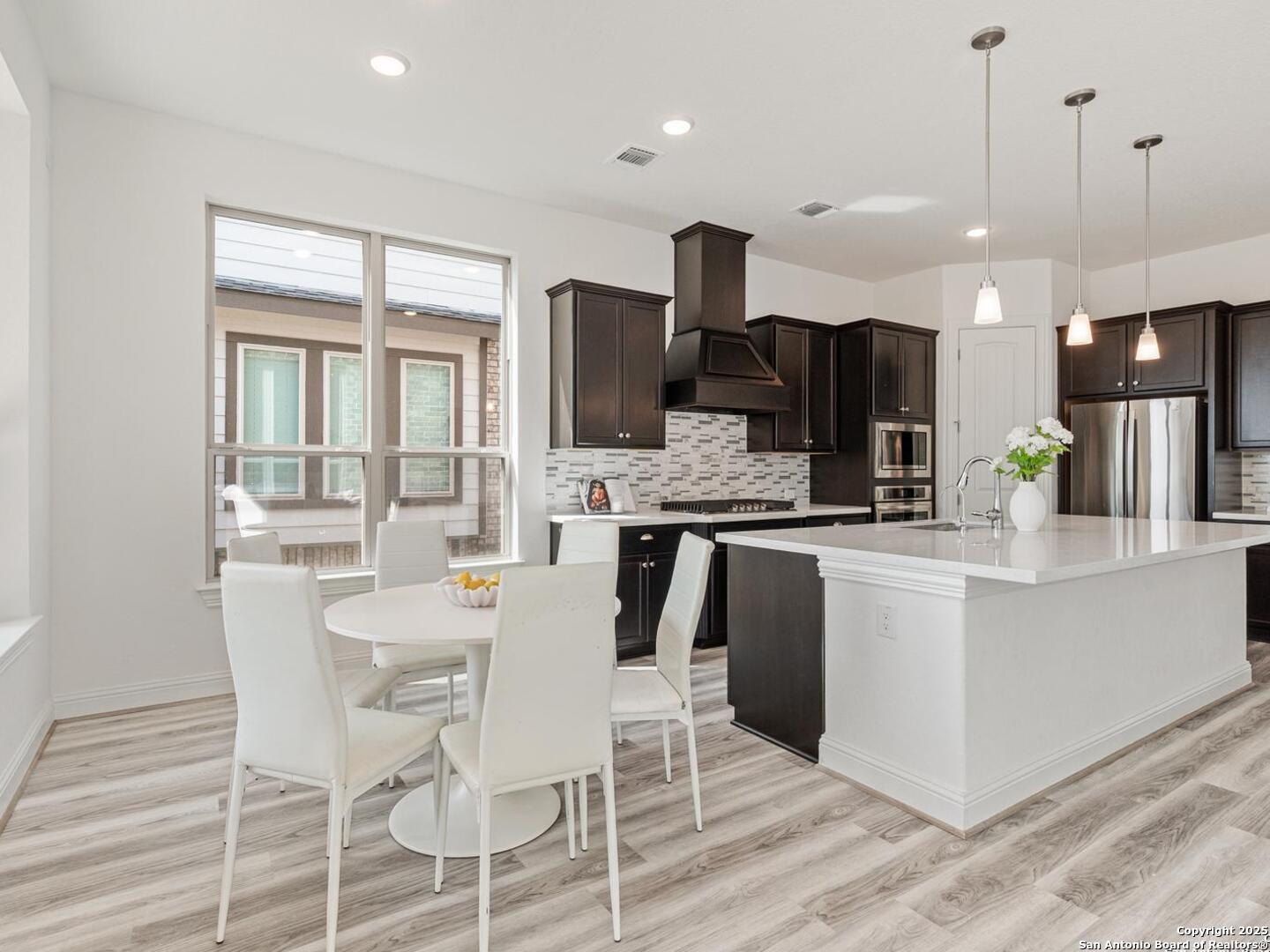 Enjoy an easy commute to San Antonio or the Medical Center while living just minutes from La Cantera, The Rim, downtown Boerne, and top-rated schools. This elegant 5-bedroom, 3.5-bath home sits on a quiet greenbelt in coveted Regent Park-and because it was occupied only briefly during a corporate relocation, it feels truly like new. A charming front porch and 8' solid wood door open to a bright foyer with wide plank floors. The main level offers a private study, formal dining, and a spacious living room with dramatic ceiling and stone fireplace. The gourmet kitchen features a large quartz island, upgraded marble backsplash, gas cooktop, stainless appliances, walk-in pantry, and casual dining overlooking the backyard. The first-floor primary suite provides a spa-like retreat with dual vanities, soaking tub, walk-in shower, and a generous closet. Upstairs, a large game room anchors four bedrooms-all with walk-in closets-and two full baths. A mudroom with built-ins and a spacious laundry room add everyday convenience. Outside, enjoy a covered patio, professional landscaping, a 6' privacy fence, and a full sprinkler system. Regent Park offers resort-style amenities including a sparkling pool, clubhouse with gym and event space, playground, and wide sidewalks. Move-in ready, lightly lived-in, and impeccably maintained, this nearly new home is a rare opportunity-and just in time for the holidays. Move in before the end of the year and make this exceptional property your best holiday gift yet.