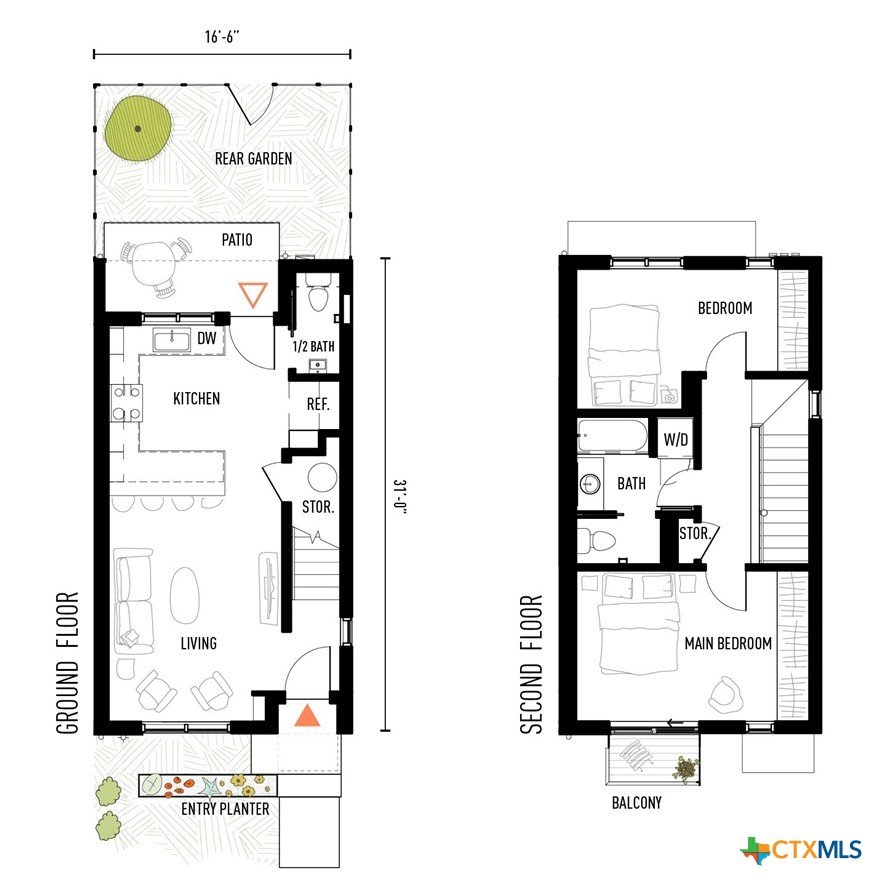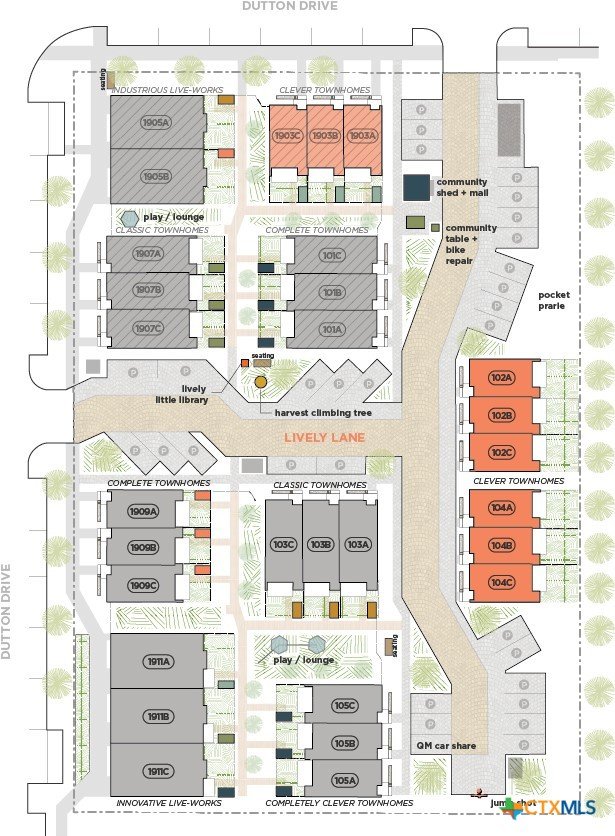 Reach out to walk through a furnished unit with us today! Finished interior photos coming soon. Lively Lane is a pocket neighborhood of contemporary townhomes located in the heart of San Marcos. Its convenient location makes it possible to own a new home in town and not miles away from the city center. High quality standard specifications and professionally managed condominium association support lock-and-leave convenience for a modern lifestyle. New homes completed in 2025 at Lively Lane are Energy Star®, EPA Indoor AirPlus, and Department of Energy Zero Energy Home Ready (ZERH) rated. The neighborhood is near a multitude of walkable services and even more essential destinations by bike. That means that sustainability comes standard, and - for those that want to do more - add-ons are available including solar packages, solar carport, and electric vehicle chargers. Other standard features include interior finishes like hardwood flooring, quartz kitchen and bath countertops, vaulted top floor ceilings, Daikin Smart Thermostats, GE and GE Profile appliances with induction range included, heat-pump air conditioning and water heaters, Pella casement windows, advanced framing techniques, native landscaping, a permeable paver system, and so much more. Lively Lane has also partnered with a neighborhood exclusive carshare service, available to residents and guests. The Clever Townhome is a sensible home designed to provide for daily necessities in a cozy two-floor layout. Living and kitchen activities situate downstairs away from the quiet of the bedrooms above. Vaulted ceilings and a main bedroom balcony open up the second floor; and a full bath maximizes functionality with a separate toilet closet and integrated washer/dryer. A welcoming entry planter and rear patio create opportunities to test your green thumb and relax outdoors. 102 and 104 Lively Lane models include a larger private, fenced rear garden. Dreaming of this townhome? Aren’t you Clever.