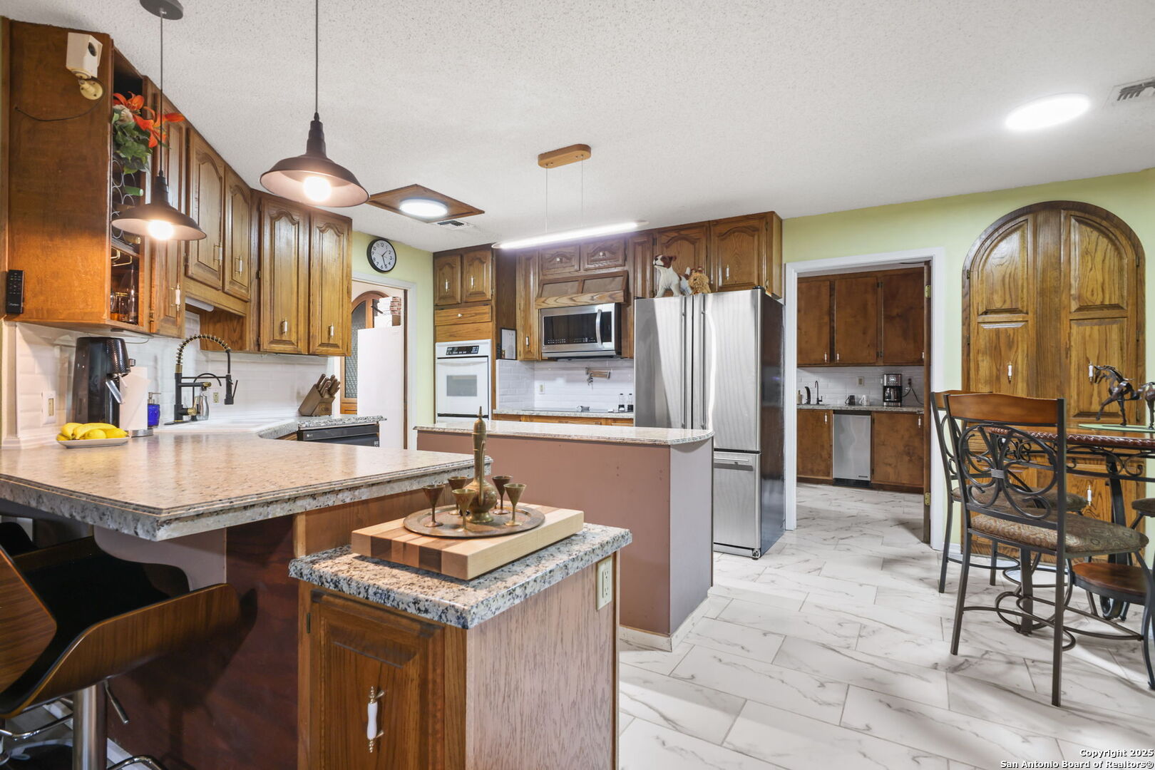 Nestled in the heart of Pleasanton, Texas, 102 Southgate Drive is a remarkable multi-generational estate offering unparalleled versatility and income-generating potential. Enjoy the freedom of homeownership with no HOA fees or restrictions-bring your vision to life without the extra costs or rules! Situated on a sprawling 1-acre corner lot, this property combines a spacious 3,336 sq ft main residence with a fully equipped 3-bedroom, 1.5-bath guesthouse, a newly constructed indoor garage, and a commercial-grade air-conditioned workshop. Every inch of this estate has been thoughtfully designed to accommodate a variety of lifestyles and needs. The main home boasts 3,336 sq ft of living space, featuring 3 generously sized bedrooms and 2.5 bathrooms. The open-concept design seamlessly integrates the living, dining, and kitchen areas, creating an inviting atmosphere for both relaxation and entertaining. A dedicated office space offers the flexibility to serve as a fourth bedroom, accommodating growing families or those in need of a home office. Entertainment options abound with a dedicated media room, ideal for movie nights or gaming sessions. One of the home's standout features is the indoor dog washroom, equipped with its own washer and dryer-perfect for pet owners who appreciate convenience and cleanliness. Adjacent to the main residence is a charming, fully self-contained 3-bedroom, 1.5-bath guesthouse complete with a full kitchen and covered parking. Currently rented for $800 per month, the guesthouse provides a steady, state-guaranteed income source. The reliable tenant has lived there for several years, with rent paid directly through state funds. The lease is currently month-to-month, and the tenant is willing to sign a 12-month lease upon closing, ensuring immediate cash flow for the new owner. For those who value space for work or creative pursuits, the property features a commercial-grade, air-conditioned workshop designed for versatility. Previously used for car restoration, this impressive facility is plumbed and equipped to handle large-scale projects of various kinds. Whether you're a craftsman, mechanic, fabricator, or small business owner, this space is ideal for professional-grade work, storage, or even conversion into additional income-generating use. A newly constructed indoor garage, fully equipped with electricity and plumbing, offers even more flexibility-ideal for vehicle storage, expansion, or potential conversion into an apartment or studio. The expansive 1-acre lot provides ample space for outdoor activities, gardening, or future development, with a private and peaceful corner location that maintains easy access to local amenities and schools. A one-year home warranty is included, offering peace of mind to the new owners. Located in the desirable Pleasanton Independent School District, this property sits close to schools, parks, and shopping centers. Pleasanton offers small-town charm with convenient access to San Antonio, making it an ideal location for those seeking a balance between rural tranquility and urban convenience. 102 Southgate Drive is more than just a home-it's a lifestyle. With its expansive living spaces, income-producing guesthouse, commercial-grade workshop, and unmatched versatility, this estate offers endless opportunities. Whether you're seeking a multi-generational living arrangement, a property with rental income potential, or a home with space for business and hobbies, 102 Southgate Drive meets every need. Don't miss the chance to own this exceptional property in the heart of Pleasanton.