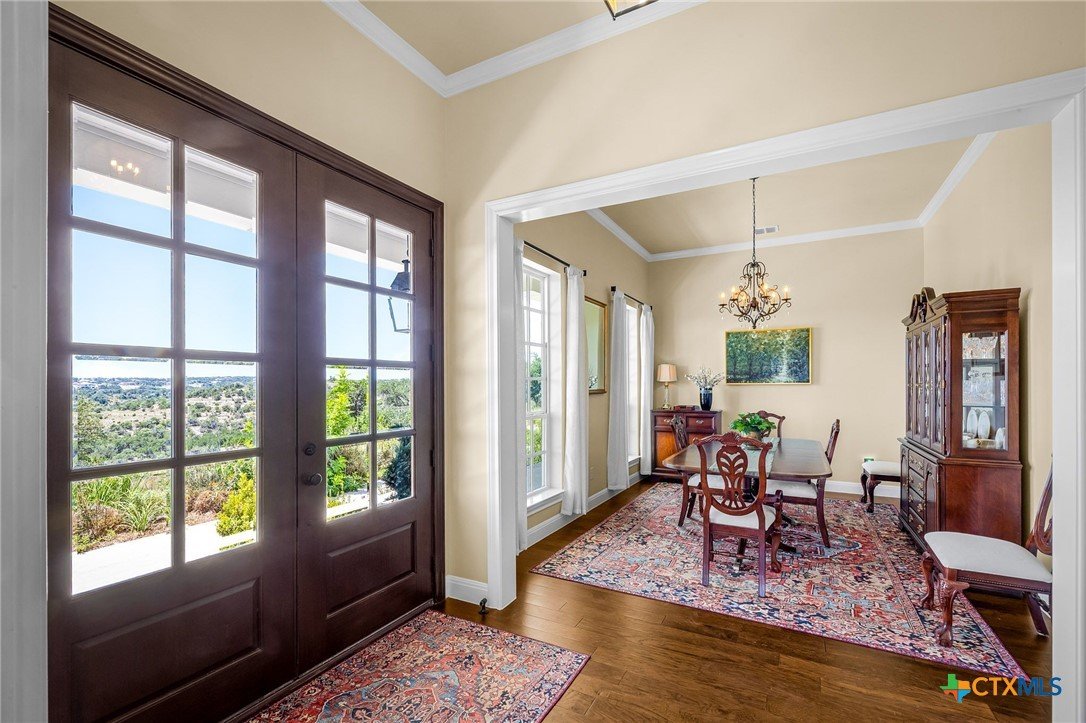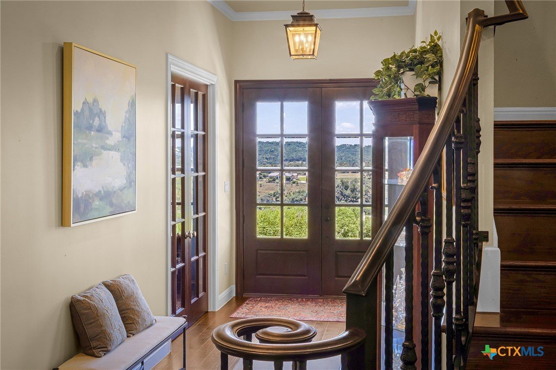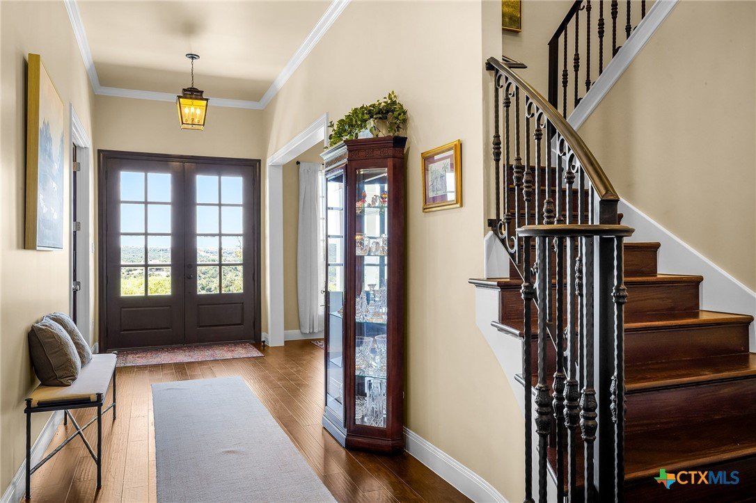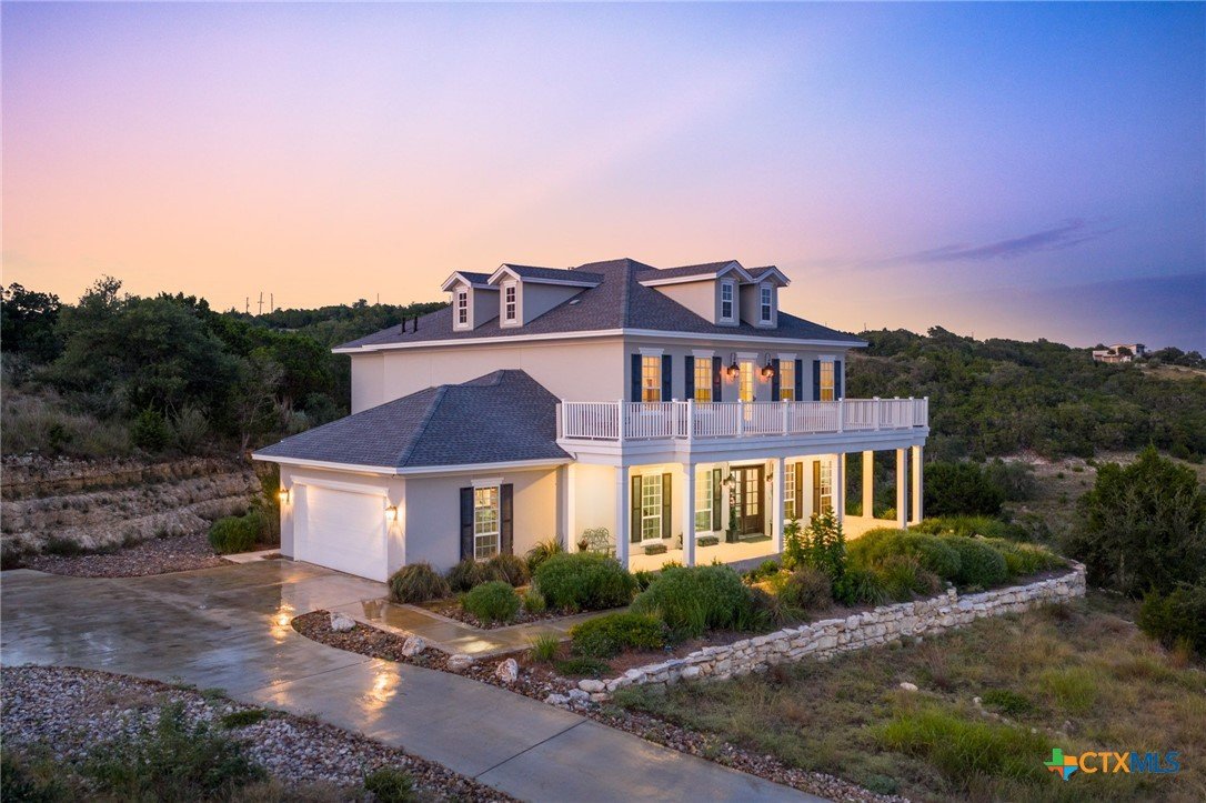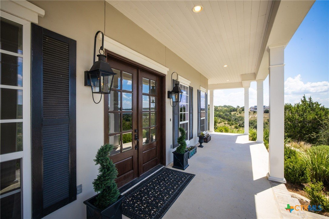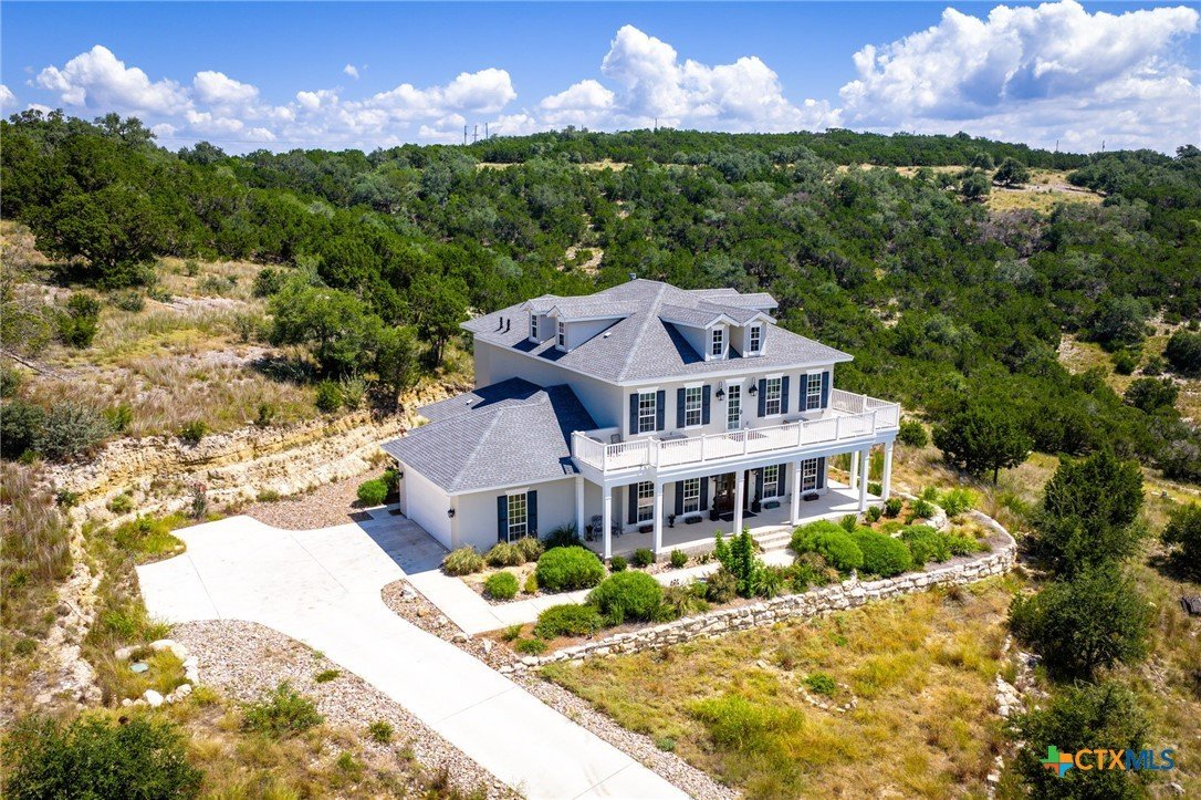 Southern Charm Meets Hill Country Luxury Privately nestled at the end of a cul-de-sac on approximately 11 acres in the exclusive gated community of Waggener Ranch—home to roaming exotic wildlife—this Southern Traditional estate captures the elegance of New Orleans architecture with a backdrop of breathtaking Hill Country views. Mahogany French doors, gas lanterns, and wraparound porches on both levels create an inviting first impression. Inside, soaring ceilings, rich hardwood floors, and custom craftsmanship set the stage for refined everyday living and effortless entertaining. The thoughtfully designed floor plan includes a gourmet kitchen with granite countertops and high-end appliances, a cozy den with a hand-carved mantel, a stunning sunroom, and a brick-accented wine room. The hall closet is pre-wired for a future elevator installation, offering the option to easily add an elevator if desired. The spacious primary suite boasts dual bathrooms, expansive closets, a coffee bar, and private balcony access. Two additional guest suites each feature en-suite baths and walk-in closets. The surrounding grounds are beautifully landscaped for both style and simplicity, with an automated irrigation system and native plantings that offer beauty without the burden—making outdoor upkeep refreshingly low-maintenance. Energy-efficient construction, custom audio system throughout the home, and smart storage solutions round out this one-of-a-kind property—where charm, comfort, and natural beauty come together seamlessly.