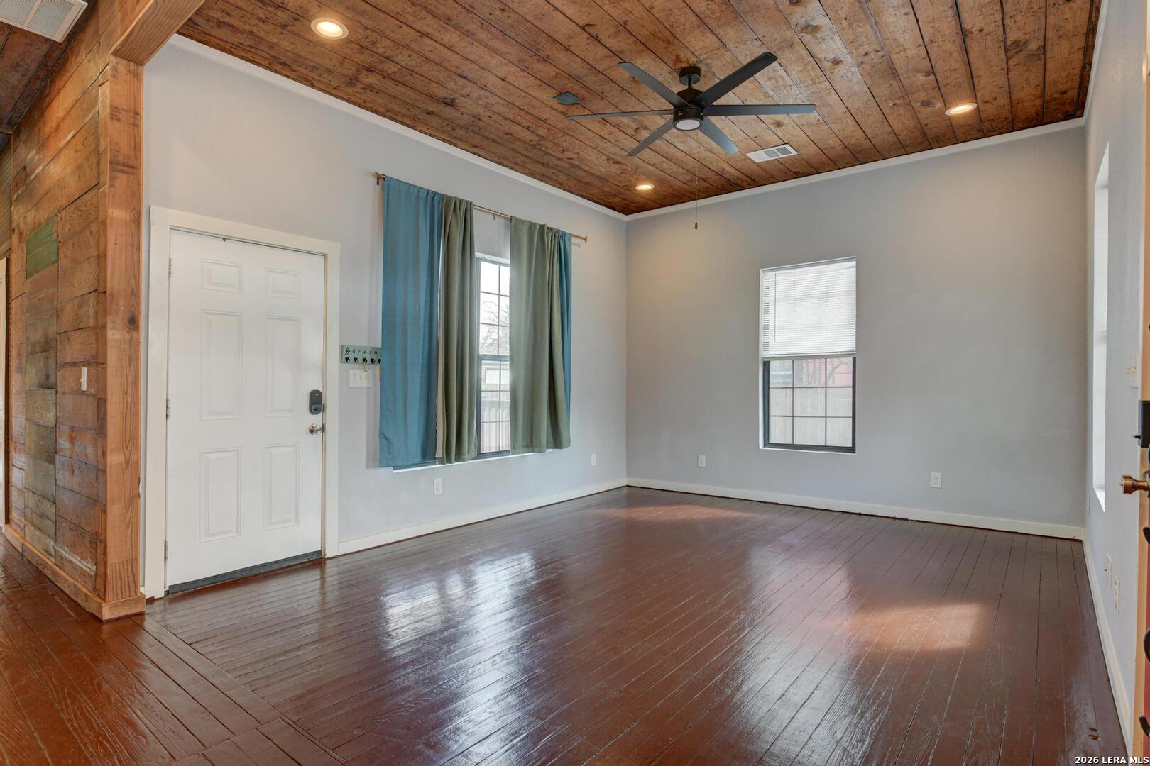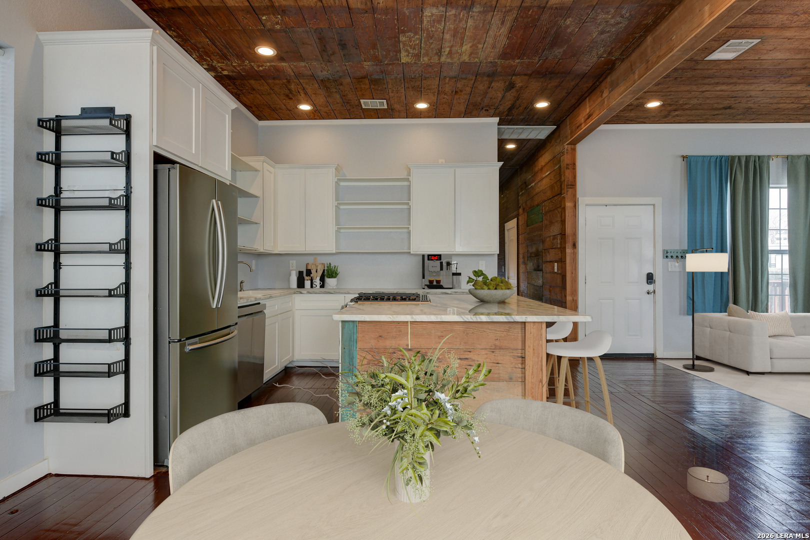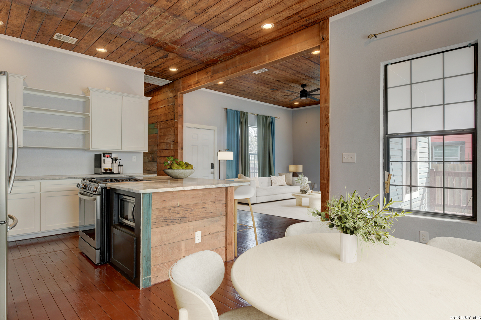 From the moment you arrive, this home stands out with its bold color, welcoming front porch, and undeniable character. Inside, rich hardwood floors and high wood plank ceilings with recessed lighting create a warm, inviting atmosphere, while natural light fills the open living and dining spaces. Location, location. Right in the middle of the downtown area, within walking distance to many attractions. Area is gentrifying! Would make not only a great home, but also a rental or possible Airbnb. The kitchen blends style and function with white cabinetry, open shelving, stainless steel appliances, marble countertops, and a statement island with cooktop that anchors the space beautifully. Thoughtful updates include a disposal, dishwasher, water softener, water heater, and oven, all replaced in 2025, along with HVAC maintenance completed the same year. Two EV chargers added in 2024. The distinctive style continues throughout with sliding barn doors, a walk-in tiled shower, and charming details that give the home its personality. Step outside to enjoy the spacious back deck and fenced yard, plus the added convenience of a driveway. Located downtown with quick access to major highways, this property offers everyday ease wrapped in character and comfort. Some photos have been virtually staged.