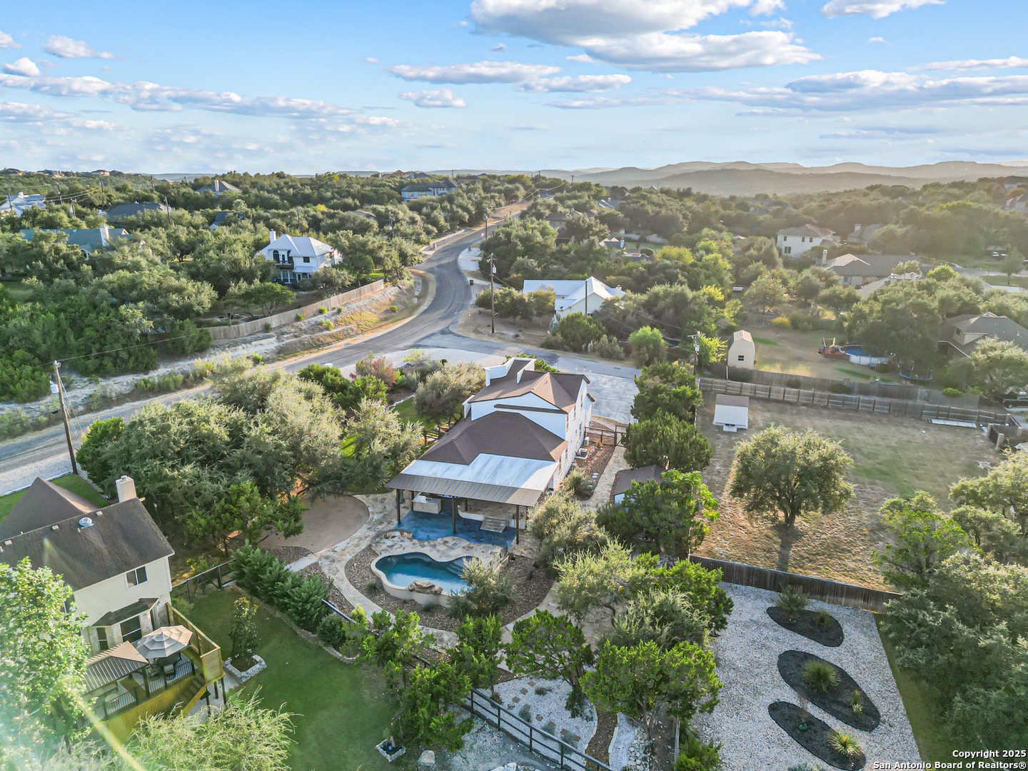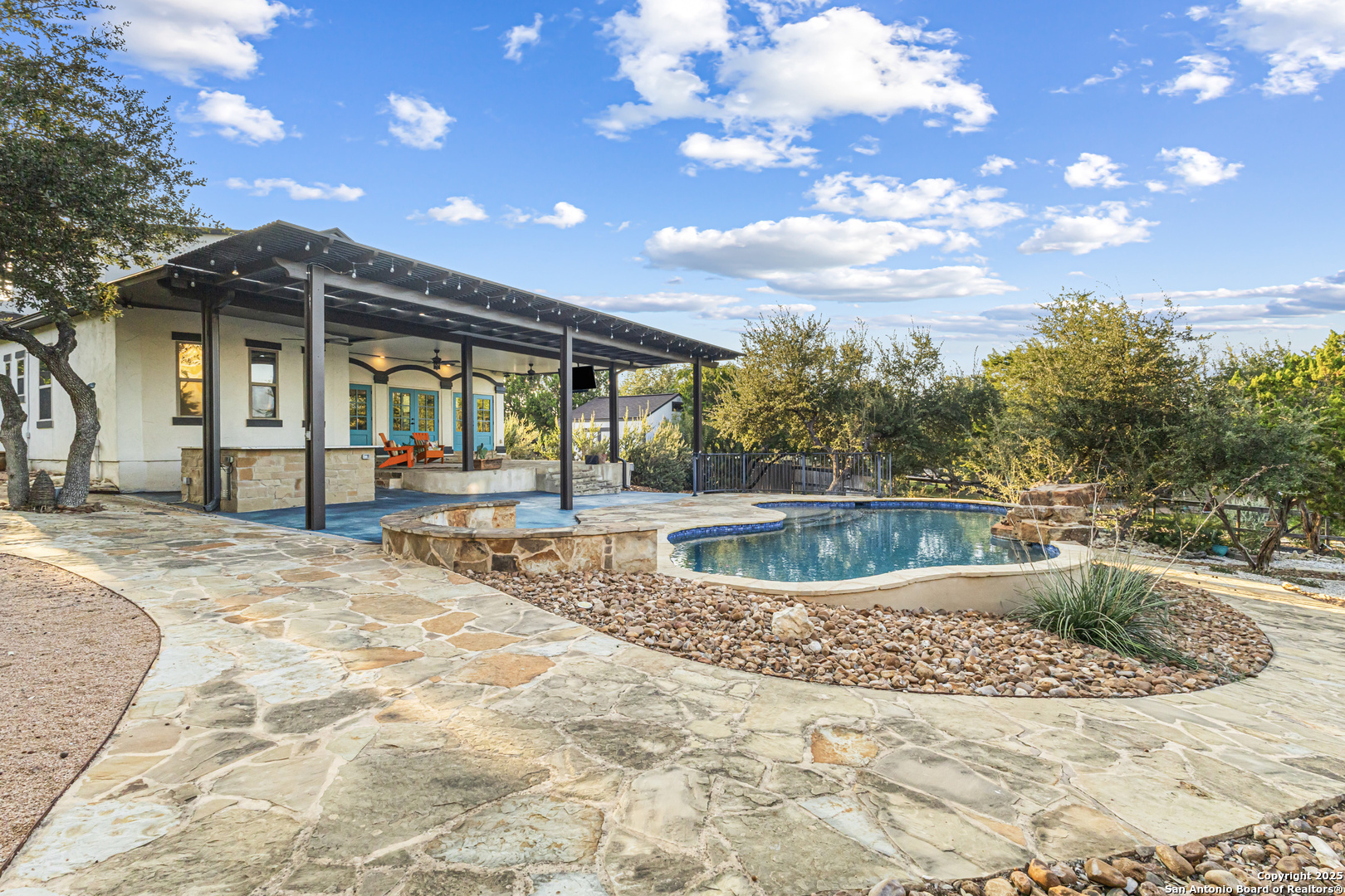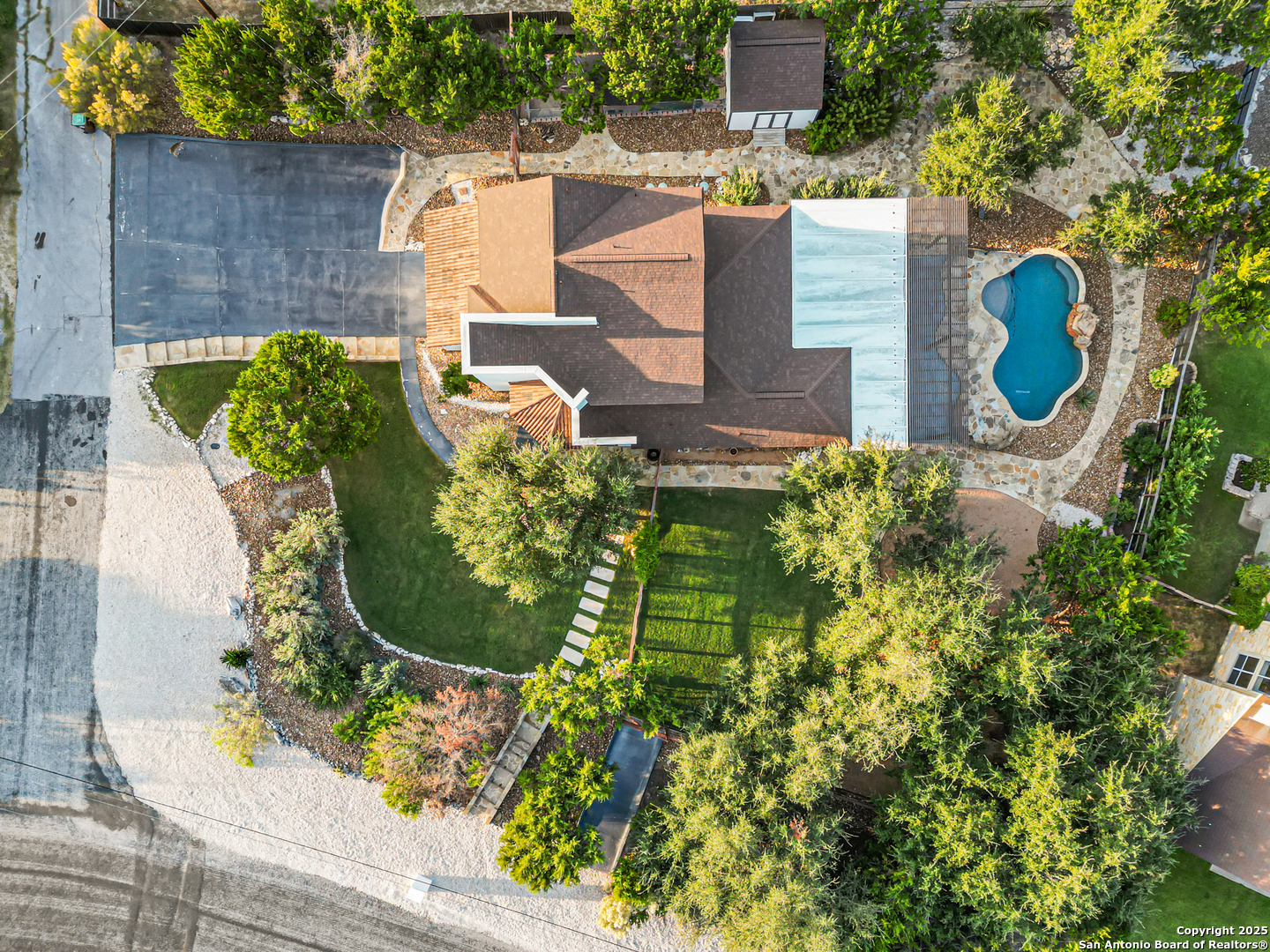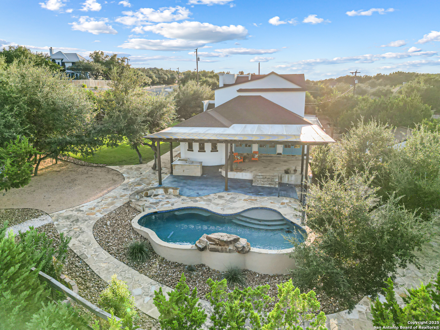 **OPEN TODAY 1-3 pm! 3 Homes open in Timberwood Park and 3 drawings for prizes! See host for details!** Step inside this beautifully designed home where style meets functionality at every turn. Stained concrete floors flow seamlessly throughout the downstairs, offering a modern aesthetic and effortless, low-maintenance living that extends into the thoughtfully xeriscaped outdoor spaces. The main level features a serene primary suite complete with a private bathroom boasting double vanities, a walk-in shower, and a spacious closet. Upstairs, you'll find three additional bedrooms, a full bathroom, a game room, and a convenient built-in desk perfect for work or study. Designed for both comfort and entertainment, the home's inviting atmosphere continues outdoors, where a 40x30 covered patio overlooks a sparkling Keith Zars swimming pool with a mesmerizing waterfall feature. The ability to hear the pool allows for year round enjoyment! The outdoor kitchen makes hosting gatherings a dream, while the versatile storage shed complete with a chandelier can serve as a chic she shed, an upscale workshop, or a shaded retreat for pets thanks to the adjacent dog run. Even the garage is an extension of the home's thoughtful design, equipped with air conditioning via a mini-split unit, and a mounted TV for year round enjoyment. Bring your boat, RV, or car collection as there is parking for as many as seven vehicles! You need to see this home in person to appreciate all of the amenities and privacy! Schedule your private showing today to experience this stunning property in person!