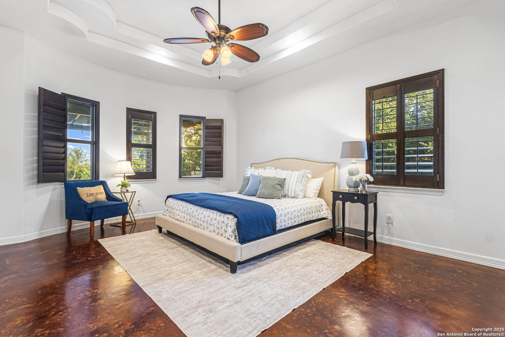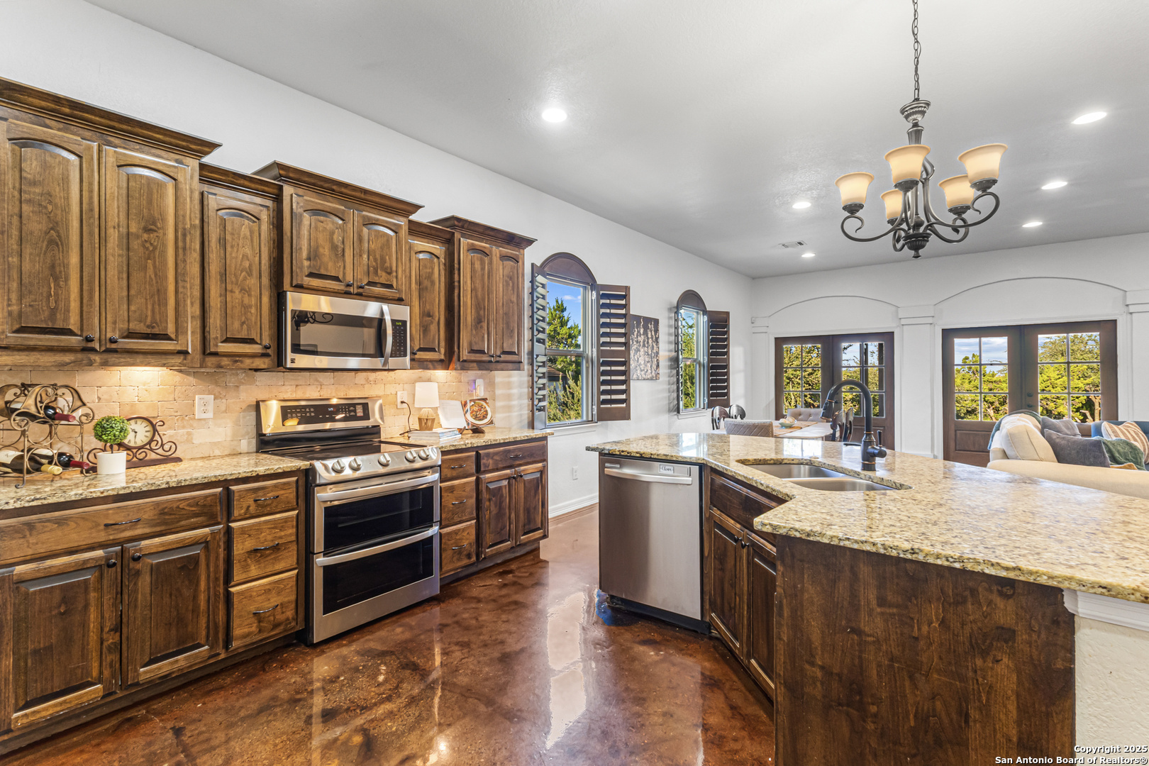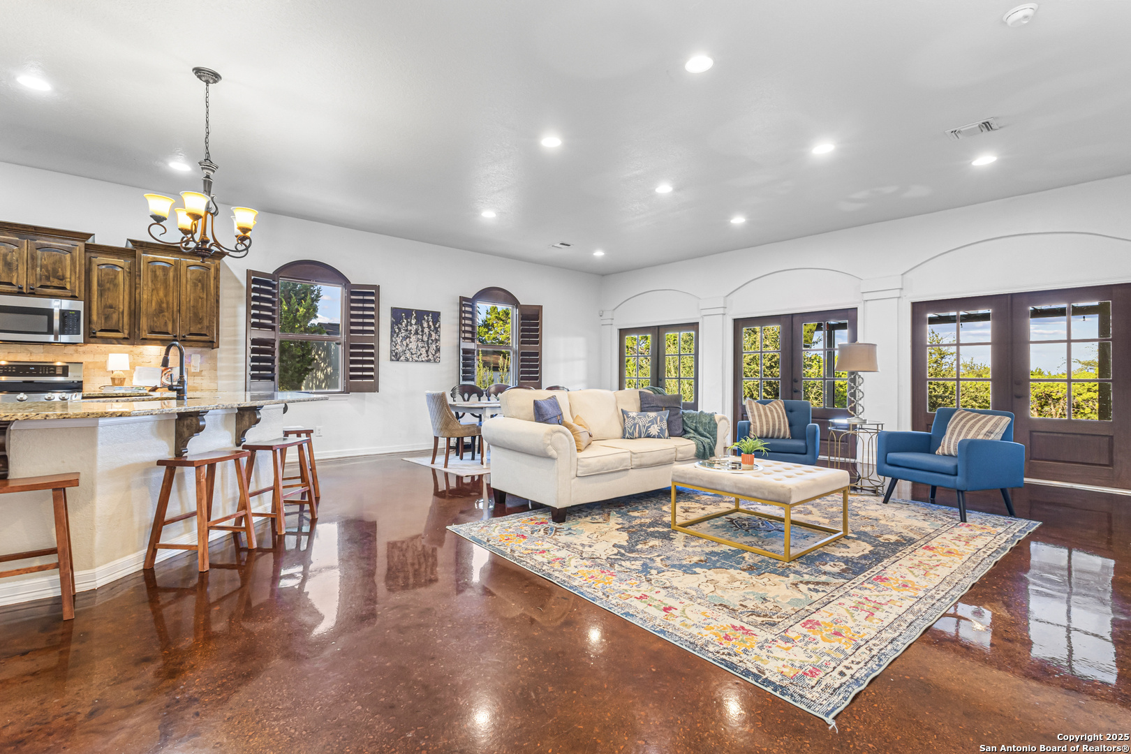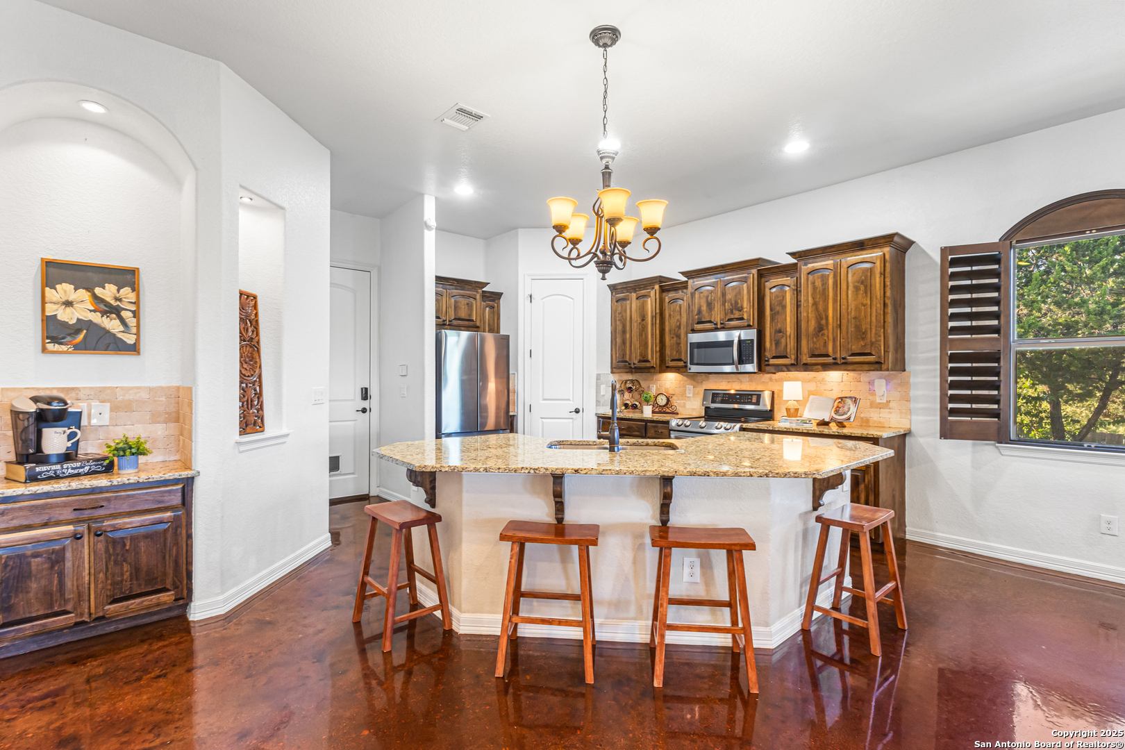 **OPEN TODAY 1-3 pm! 3 Homes open in Timberwood Park and 3 drawings for prizes! See host for details!** Step inside this beautifully designed home where style meets functionality at every turn. Stained concrete floors flow seamlessly throughout the downstairs, offering a modern aesthetic and effortless, low-maintenance living that extends into the thoughtfully xeriscaped outdoor spaces. The main level features a serene primary suite complete with a private bathroom boasting double vanities, a walk-in shower, and a spacious closet. Upstairs, you'll find three additional bedrooms, a full bathroom, a game room, and a convenient built-in desk perfect for work or study. Designed for both comfort and entertainment, the home's inviting atmosphere continues outdoors, where a 40x30 covered patio overlooks a sparkling Keith Zars swimming pool with a mesmerizing waterfall feature. The ability to hear the pool allows for year round enjoyment! The outdoor kitchen makes hosting gatherings a dream, while the versatile storage shed complete with a chandelier can serve as a chic she shed, an upscale workshop, or a shaded retreat for pets thanks to the adjacent dog run. Even the garage is an extension of the home's thoughtful design, equipped with air conditioning via a mini-split unit, and a mounted TV for year round enjoyment. Bring your boat, RV, or car collection as there is parking for as many as seven vehicles! You need to see this home in person to appreciate all of the amenities and privacy! Schedule your private showing today to experience this stunning property in person!
