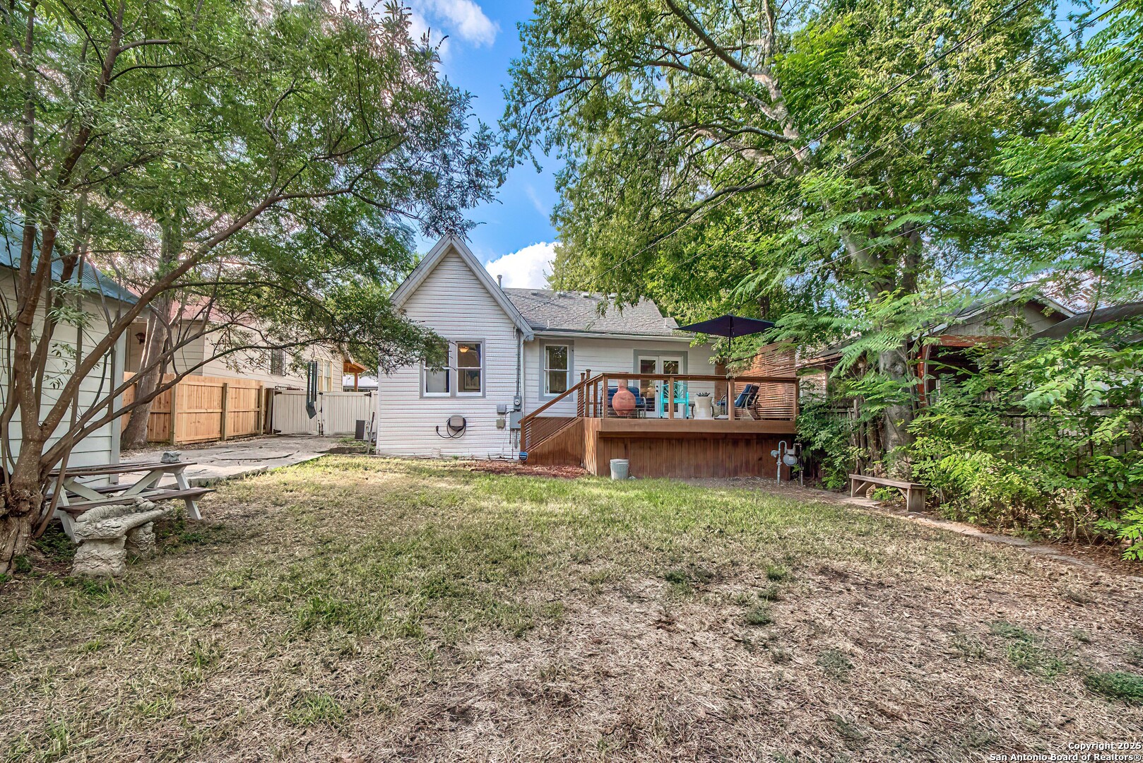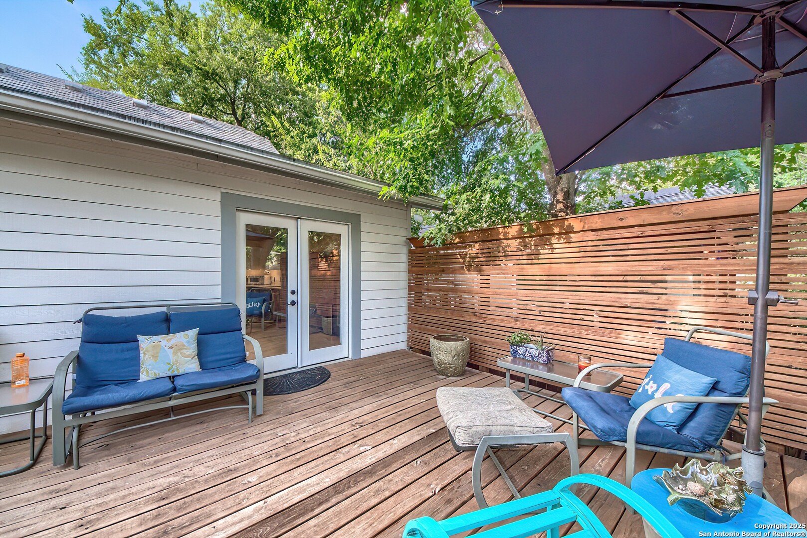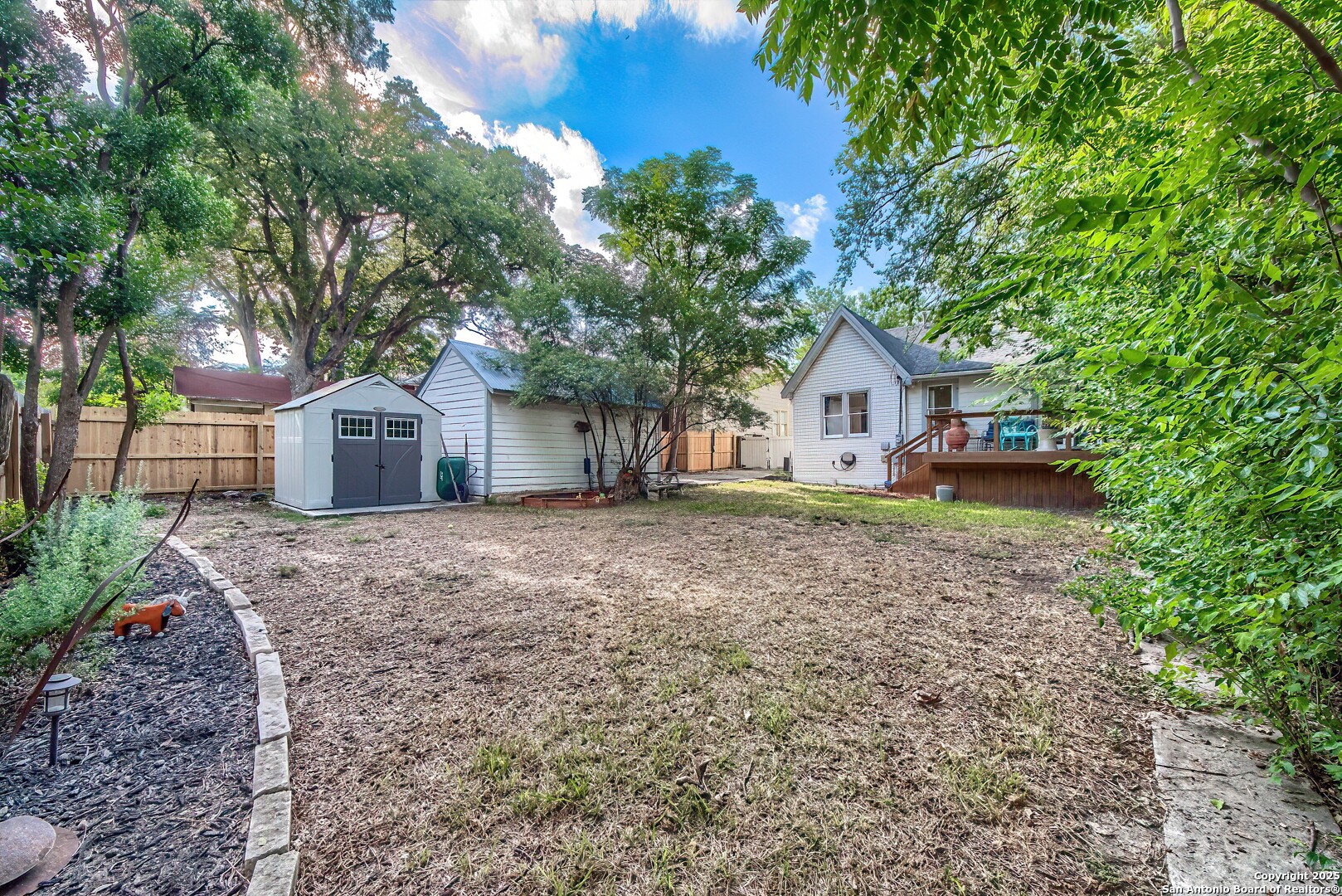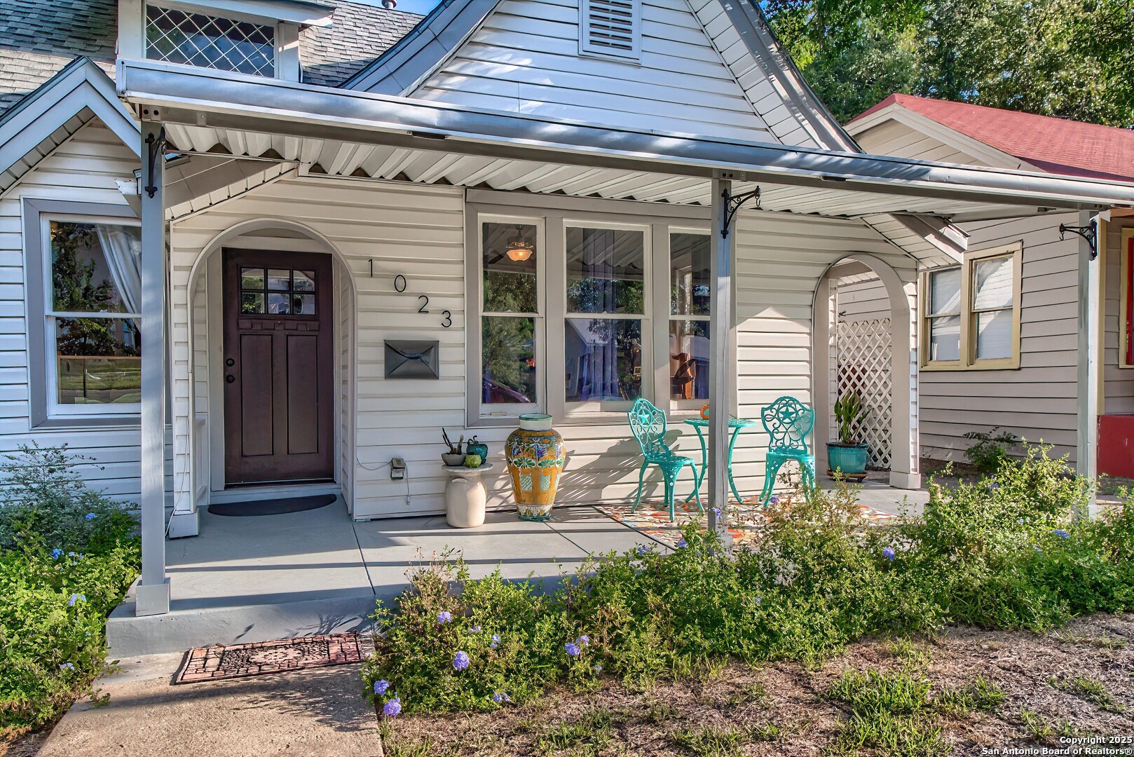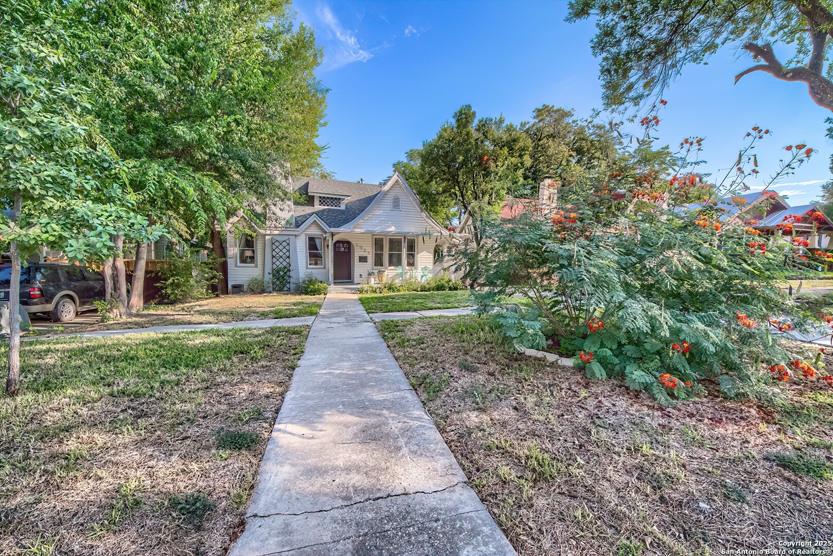 THIS IRRESISTIBLE TUDOR COTTAGE IN HISTORIC BEACON HILL WILL CHARM YOUR SOCKS OFF! Merely pulling up with give you a gasp as this doll literally calls to you from the street, so reminiscent of the peace of the English countryside and Jane Austen novels. Admire the sharply pitched roof and prominent chimney as you walk up to the adorable front porch where you can sit and watch the world go by. Step through the front door and find the past meets the present in a seamless mixture of historic elements and modern conveniences that adds up to a world full of character under high ceilings. Thick shiplap walls, painted in a soothing sage green, and natural shiplap ceilings with crown moulding resonate so that decorating them almost seems unnecessary. The fireplace sets a cozy atmosphere and large windows warm the living room with abundant natural light. Imagine long conversations with friends over dinner in the dusky blue dining room that sits strategically in the middle of the home, open to both living and the kitchen. Renovated so thoughtfully, the country kitchen invites you in with a beguiling warmth, making it the quintessential place for creativity and comfort. Light reflects off the new soft close white and blue shaker cabinetry and sleek marble countertops. Watch your favorite birds dance outside the window over the sink and cook with precision with your gas range as friends gather at the kitchen island to share a cocktail and chat. Lingering over coffee in the breakfast nook seems a given with its peaceful view of your very private backyard through french doors. The laundry closet is tucked off in a closet for convenience. On the other side of the home is the bedroom wing with the primary bedroom ready to surprise with walls of windows, two closets and an adjoining flex room with black and white mosaic tile, perfect for a classic sitting room, nursery, gym or office -- or should you want another bathroom plumbing under the home is already started to accommodate for that option. An adorable bathroom sits in the hallway another charming mix of historic and modern with bead board, chair rail accent and mosaic tile. Finally, be enchanted by the large front bedroom with its whimsical fabric wall cloth. Original hardwood floors throughout gleam with elegance and transition to ceramic tile in the kitchen. Now outside find more to love about this home -- a large deck, shaded by mature trees is elevated for a lovely view of the backyard, made even more private by a back alley. The level, fully fenced yard can be left alone as a lawn with decorative borders or get fancy add a pool, garden or playscape. A storage shed is ideal for lawn tools. The single car garage can be used for more storage, workshop or park a car, accessible through a driveway gate. Especially enjoy that the eastern fence was just replaced! Make note of the tankless water heater, water softener and stainless appliances. Now that you have found the perfect refuge, let's talk about how great this location is! Beacon Hill is one of the city's first neighborhoods and a designated Neighborhood Conservation District, which is evident as you drive the streets to admire the breadth of historical architecture and cozy neighborhood parks. Two blocks from famed restaurants and shops on Blanco and just a short walk to the mansions of Monte Vista, feel comfortably tucked into the heart of San Antonio while still being only a short bike ride or five minute drive to downtown, the Pearl, the Riverwalk, King William and Southtown. Commutes elsewhere are easy being so close to I-10 and a straight shot to 281 through neighborhoods. If you have dreamed urban living in a historic home that is still affordable, you have found it here. Bring a copy of Pride and Prejudice, sit on the porch and imagine staying forever!