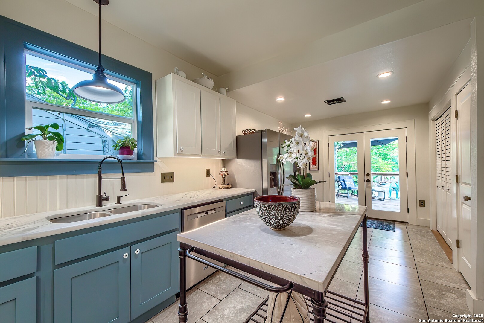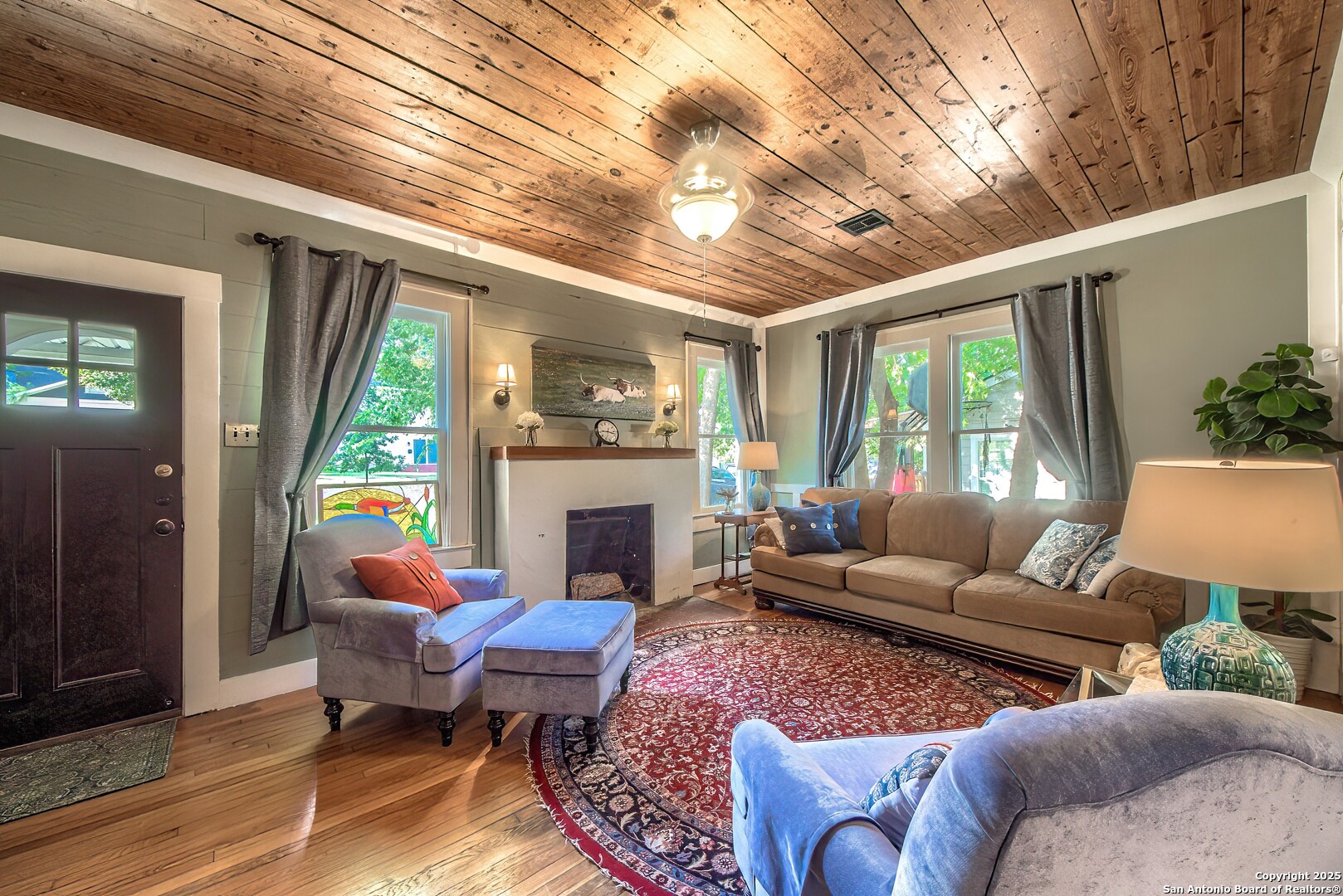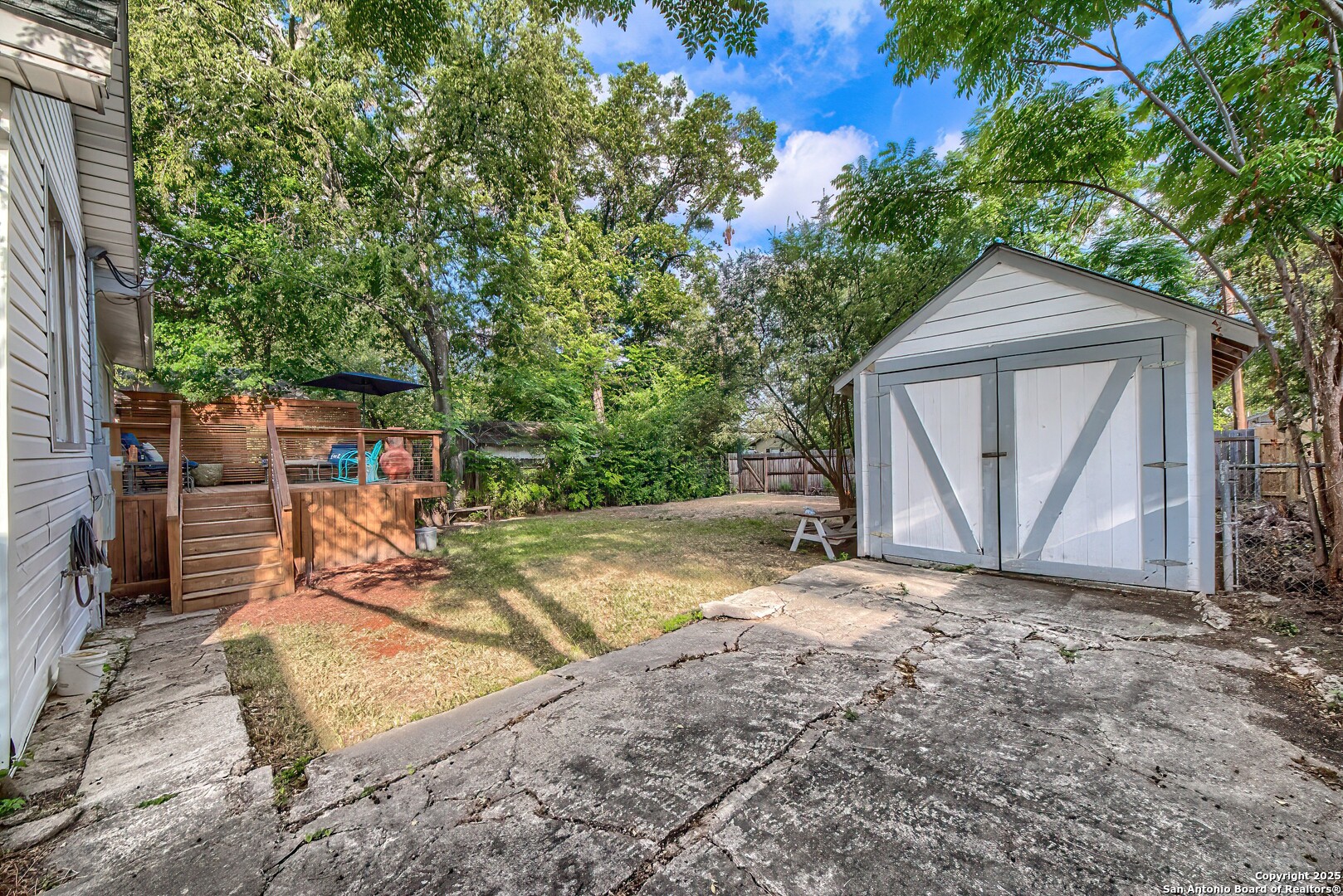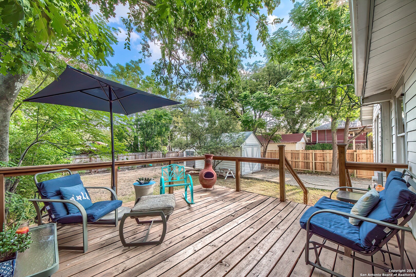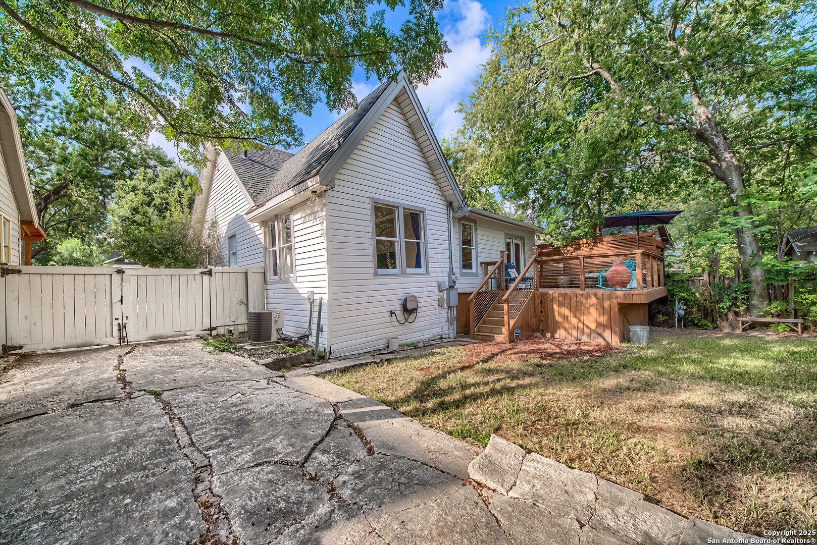 THIS IRRESISTIBLE TUDOR COTTAGE IN HISTORIC BEACON HILL WILL CHARM YOUR SOCKS OFF! Merely pulling up with give you a gasp as this doll literally calls to you from the street, so reminiscent of the peace of the English countryside and Jane Austen novels. Admire the sharply pitched roof and prominent chimney as you walk up to the adorable front porch where you can sit and watch the world go by. Step through the front door and find the past meets the present in a seamless mixture of historic elements and modern conveniences that adds up to a world full of character under high ceilings. Thick shiplap walls, painted in a soothing sage green, and natural shiplap ceilings with crown moulding resonate so that decorating them almost seems unnecessary. The fireplace sets a cozy atmosphere and large windows warm the living room with abundant natural light. Imagine long conversations with friends over dinner in the dusky blue dining room that sits strategically in the middle of the home, open to both living and the kitchen. Renovated so thoughtfully, the country kitchen invites you in with a beguiling warmth, making it the quintessential place for creativity and comfort. Light reflects off the new soft close white and blue shaker cabinetry and sleek marble countertops. Watch your favorite birds dance outside the window over the sink and cook with precision with your gas range as friends gather at the kitchen island to share a cocktail and chat. Lingering over coffee in the breakfast nook seems a given with its peaceful view of your very private backyard through french doors. The laundry closet is tucked off in a closet for convenience. On the other side of the home is the bedroom wing with the primary bedroom ready to surprise with walls of windows, two closets and an adjoining flex room with black and white mosaic tile, perfect for a classic sitting room, nursery, gym or office -- or should you want another bathroom plumbing under the home is already started to accommodate for that option. An adorable bathroom sits in the hallway another charming mix of historic and modern with bead board, chair rail accent and mosaic tile. Finally, be enchanted by the large front bedroom with its whimsical fabric wall cloth. Original hardwood floors throughout gleam with elegance and transition to ceramic tile in the kitchen. Now outside find more to love about this home -- a large deck, shaded by mature trees is elevated for a lovely view of the backyard, made even more private by a back alley. The level, fully fenced yard can be left alone as a lawn with decorative borders or get fancy add a pool, garden or playscape. A storage shed is ideal for lawn tools. The single car garage can be used for more storage, workshop or park a car, accessible through a driveway gate. Especially enjoy that the eastern fence was just replaced! Make note of the tankless water heater, water softener and stainless appliances. Now that you have found the perfect refuge, let's talk about how great this location is! Beacon Hill is one of the city's first neighborhoods and a designated Neighborhood Conservation District, which is evident as you drive the streets to admire the breadth of historical architecture and cozy neighborhood parks. Two blocks from famed restaurants and shops on Blanco and just a short walk to the mansions of Monte Vista, feel comfortably tucked into the heart of San Antonio while still being only a short bike ride or five minute drive to downtown, the Pearl, the Riverwalk, King William and Southtown. Commutes elsewhere are easy being so close to I-10 and a straight shot to 281 through neighborhoods. If you have dreamed urban living in a historic home that is still affordable, you have found it here. Bring a copy of Pride and Prejudice, sit on the porch and imagine staying forever!