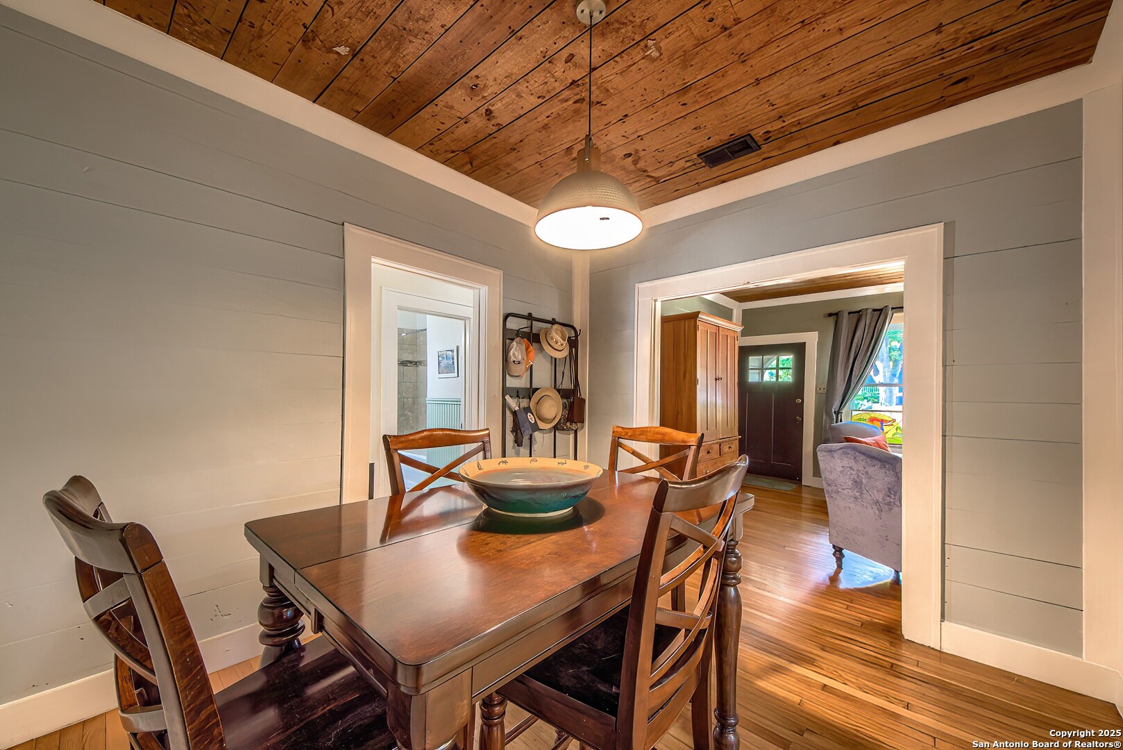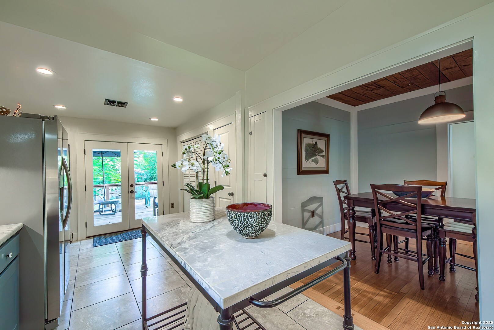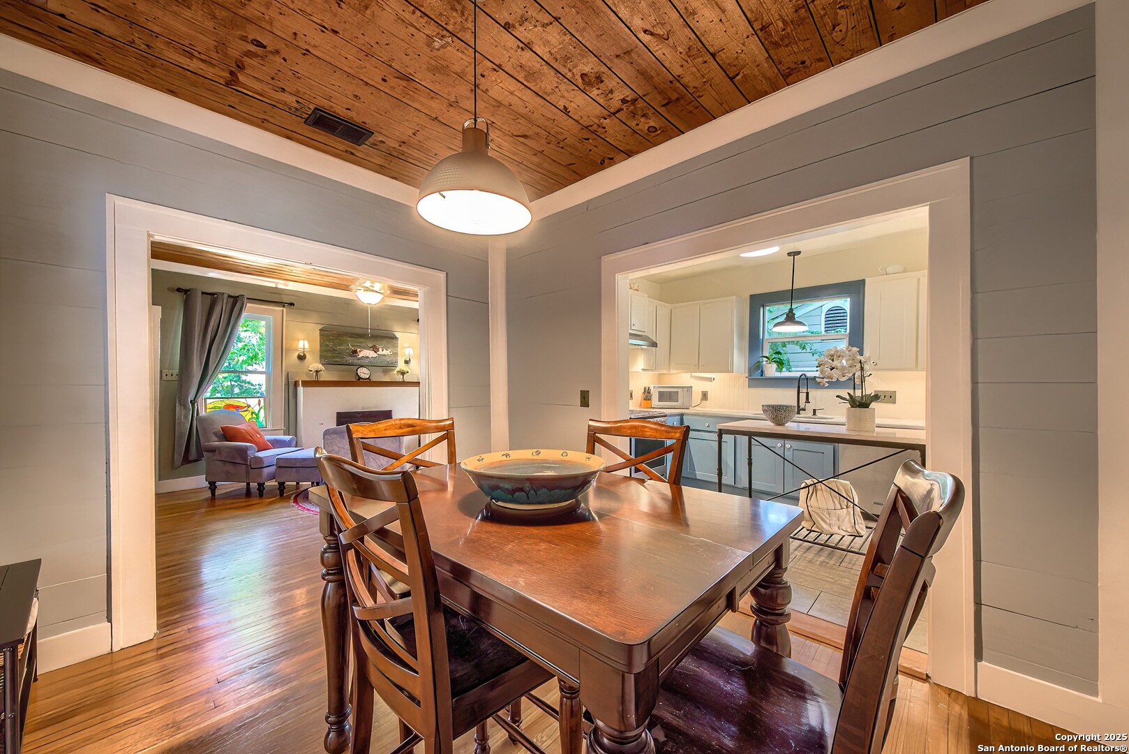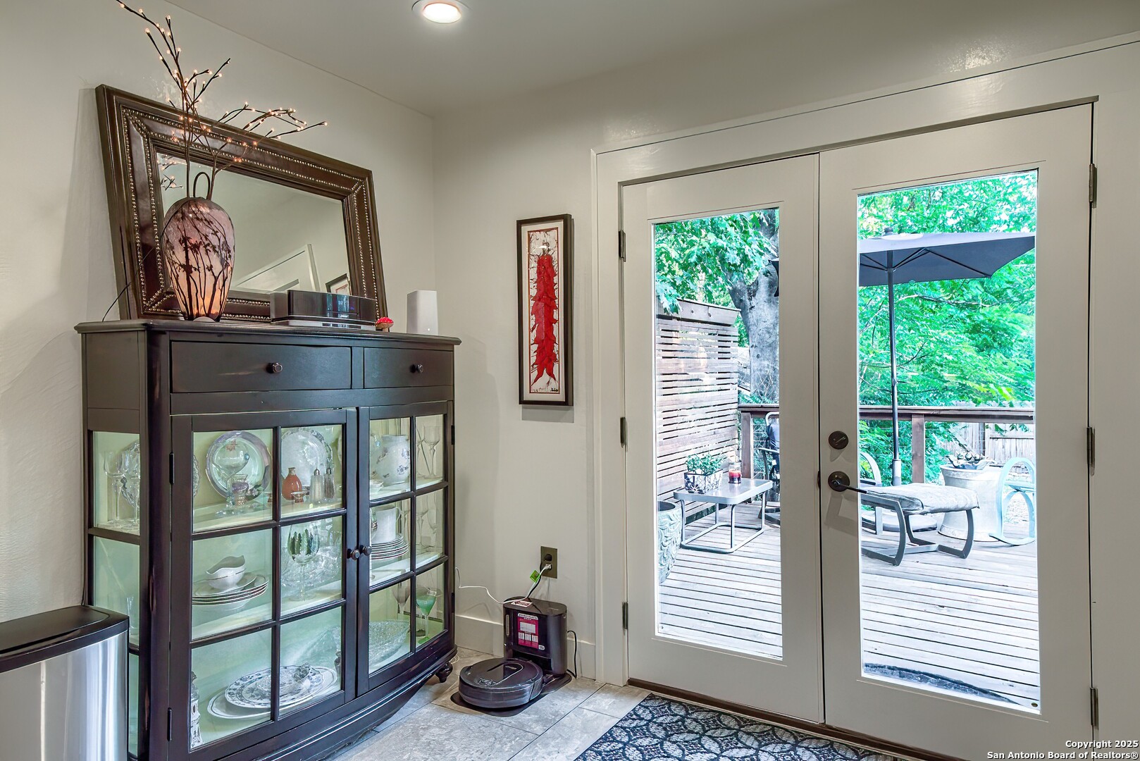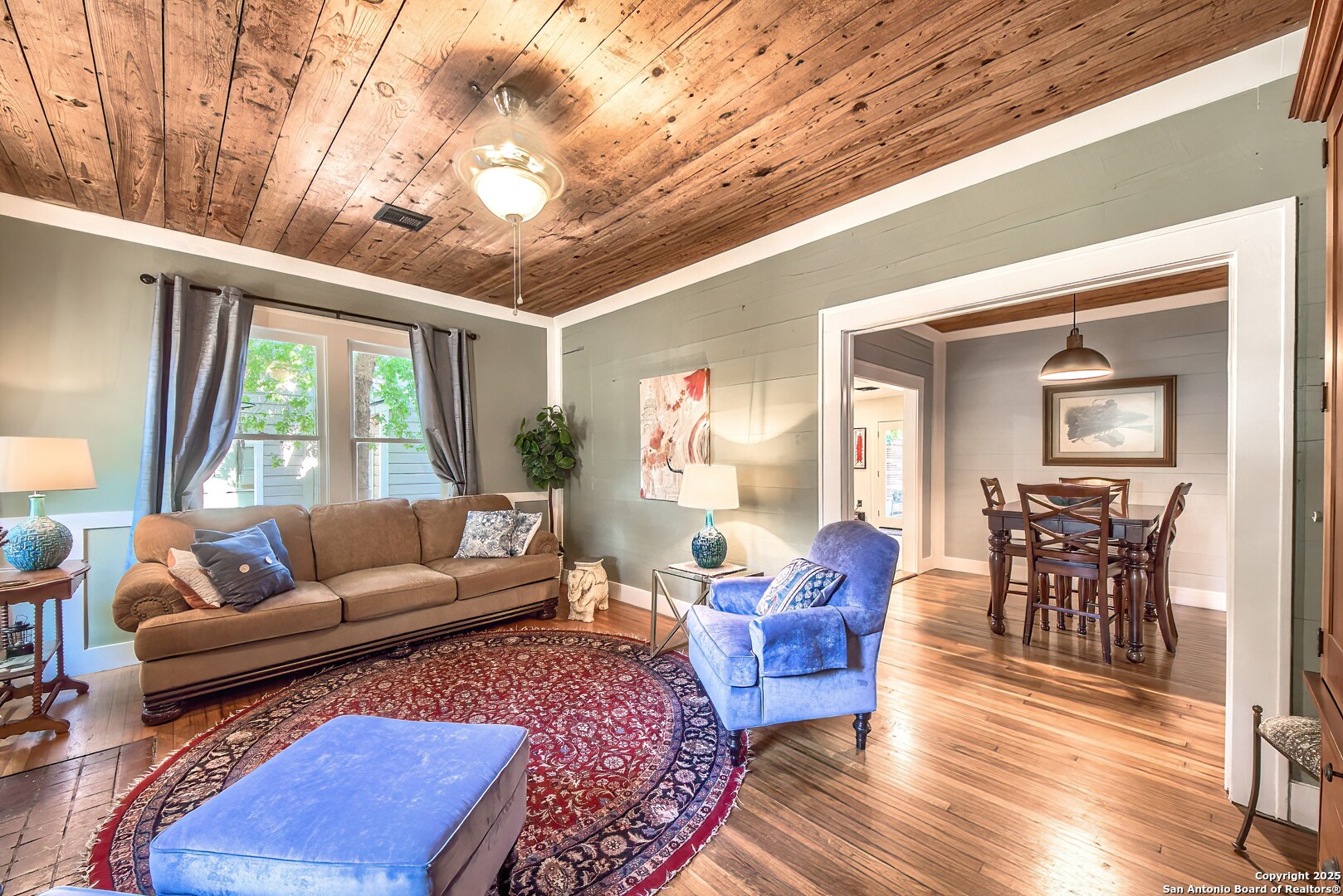 THIS IRRESISTIBLE TUDOR COTTAGE IN HISTORIC BEACON HILL WILL CHARM YOUR SOCKS OFF! Merely pulling up with give you a gasp as this doll literally calls to you from the street, so reminiscent of the peace of the English countryside and Jane Austen novels. Admire the sharply pitched roof and prominent chimney as you walk up to the adorable front porch where you can sit and watch the world go by. Step through the front door and find the past meets the present in a seamless mixture of historic elements and modern conveniences that adds up to a world full of character under high ceilings. Thick shiplap walls, painted in a soothing sage green, and natural shiplap ceilings with crown moulding resonate so that decorating them almost seems unnecessary. The fireplace sets a cozy atmosphere and large windows warm the living room with abundant natural light. Imagine long conversations with friends over dinner in the dusky blue dining room that sits strategically in the middle of the home, open to both living and the kitchen. Renovated so thoughtfully, the country kitchen invites you in with a beguiling warmth, making it the quintessential place for creativity and comfort. Light reflects off the new soft close white and blue shaker cabinetry and sleek marble countertops. Watch your favorite birds dance outside the window over the sink and cook with precision with your gas range as friends gather at the kitchen island to share a cocktail and chat. Lingering over coffee in the breakfast nook seems a given with its peaceful view of your very private backyard through french doors. The laundry closet is tucked off in a closet for convenience. On the other side of the home is the bedroom wing with the primary bedroom ready to surprise with walls of windows, two closets and an adjoining flex room with black and white mosaic tile, perfect for a classic sitting room, nursery, gym or office -- or should you want another bathroom plumbing under the home is already started to accommodate for that option. An adorable bathroom sits in the hallway another charming mix of historic and modern with bead board, chair rail accent and mosaic tile. Finally, be enchanted by the large front bedroom with its whimsical fabric wall cloth. Original hardwood floors throughout gleam with elegance and transition to ceramic tile in the kitchen. Now outside find more to love about this home -- a large deck, shaded by mature trees is elevated for a lovely view of the backyard, made even more private by a back alley. The level, fully fenced yard can be left alone as a lawn with decorative borders or get fancy add a pool, garden or playscape. A storage shed is ideal for lawn tools. The single car garage can be used for more storage, workshop or park a car, accessible through a driveway gate. Especially enjoy that the eastern fence was just replaced! Make note of the tankless water heater, water softener and stainless appliances. Now that you have found the perfect refuge, let's talk about how great this location is! Beacon Hill is one of the city's first neighborhoods and a designated Neighborhood Conservation District, which is evident as you drive the streets to admire the breadth of historical architecture and cozy neighborhood parks. Two blocks from famed restaurants and shops on Blanco and just a short walk to the mansions of Monte Vista, feel comfortably tucked into the heart of San Antonio while still being only a short bike ride or five minute drive to downtown, the Pearl, the Riverwalk, King William and Southtown. Commutes elsewhere are easy being so close to I-10 and a straight shot to 281 through neighborhoods. If you have dreamed urban living in a historic home that is still affordable, you have found it here. Bring a copy of Pride and Prejudice, sit on the porch and imagine staying forever!
