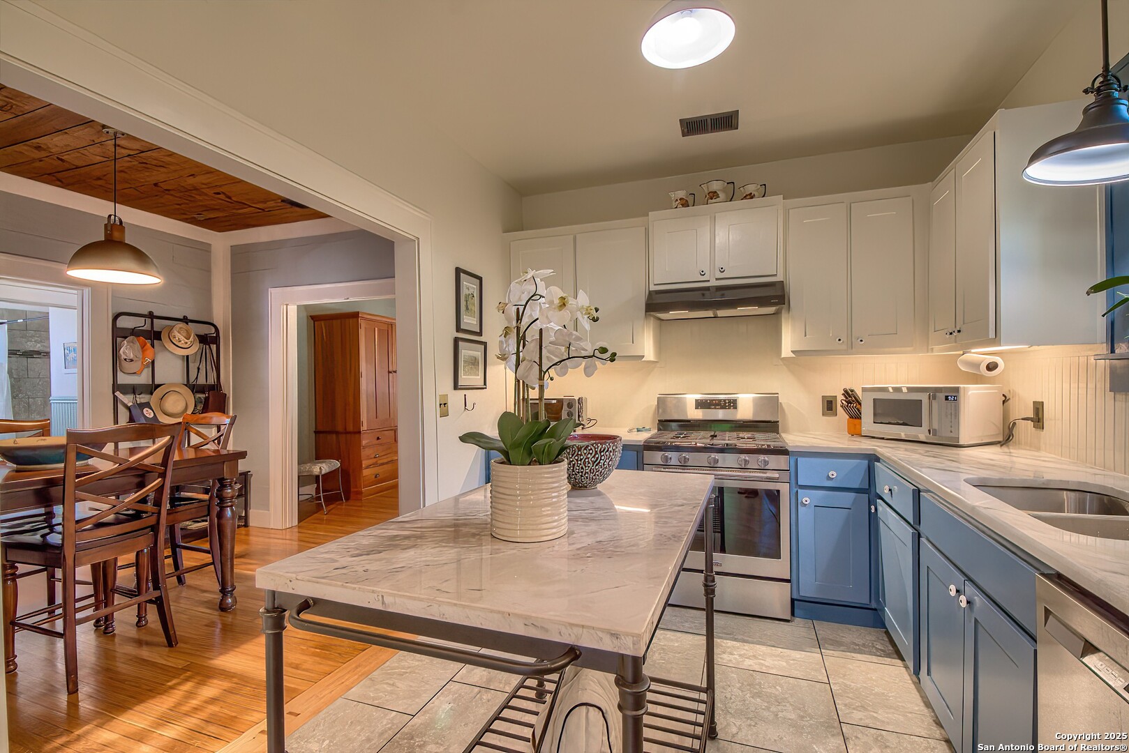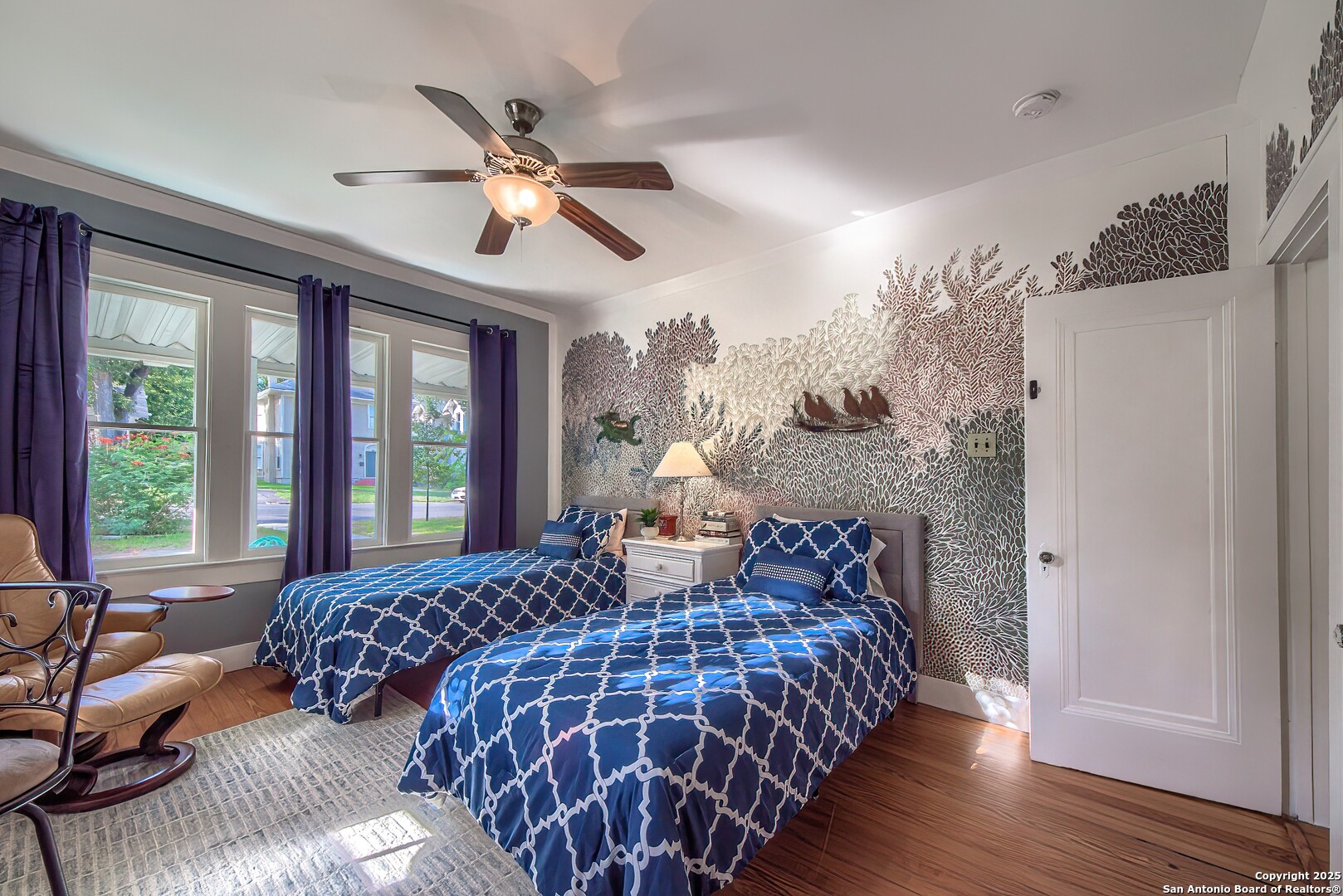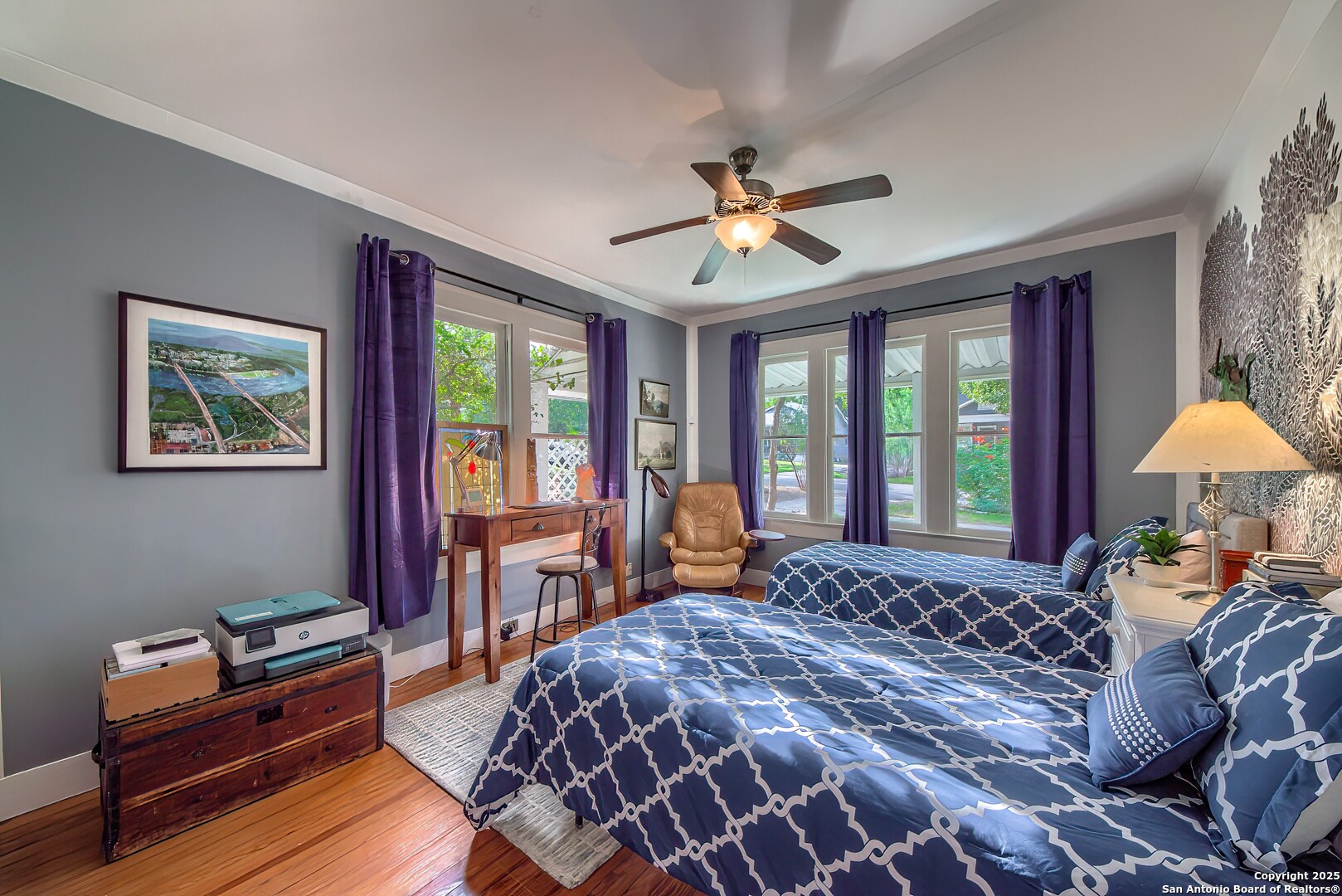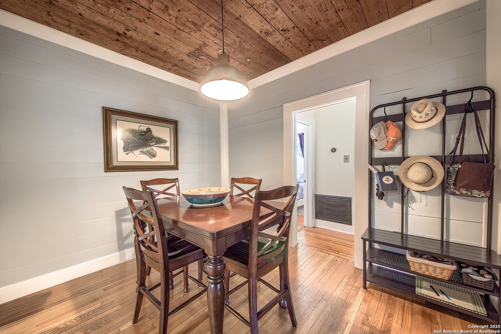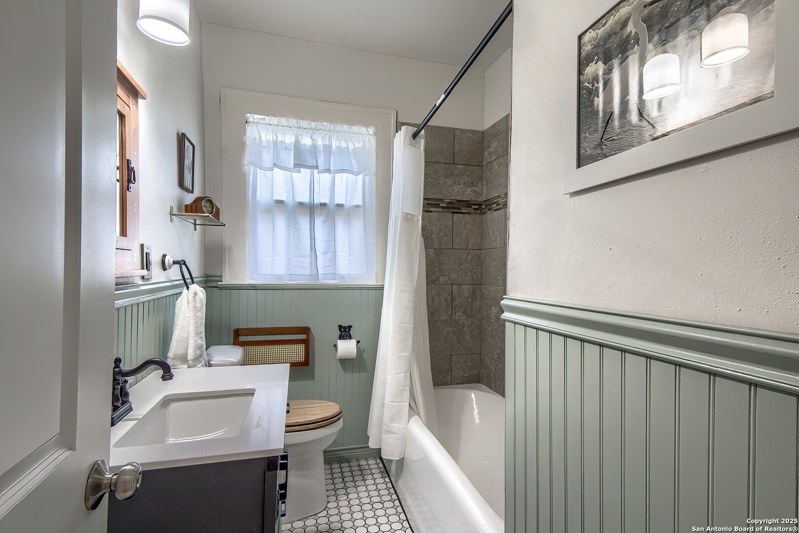 THIS IRRESISTIBLE TUDOR COTTAGE IN HISTORIC BEACON HILL WILL CHARM YOUR SOCKS OFF! Merely pulling up with give you a gasp as this doll literally calls to you from the street, so reminiscent of the peace of the English countryside and Jane Austen novels. Admire the sharply pitched roof and prominent chimney as you walk up to the adorable front porch where you can sit and watch the world go by. Step through the front door and find the past meets the present in a seamless mixture of historic elements and modern conveniences that adds up to a world full of character under high ceilings. Thick shiplap walls, painted in a soothing sage green, and natural shiplap ceilings with crown moulding resonate so that decorating them almost seems unnecessary. The fireplace sets a cozy atmosphere and large windows warm the living room with abundant natural light. Imagine long conversations with friends over dinner in the dusky blue dining room that sits strategically in the middle of the home, open to both living and the kitchen. Renovated so thoughtfully, the country kitchen invites you in with a beguiling warmth, making it the quintessential place for creativity and comfort. Light reflects off the new soft close white and blue shaker cabinetry and sleek marble countertops. Watch your favorite birds dance outside the window over the sink and cook with precision with your gas range as friends gather at the kitchen island to share a cocktail and chat. Lingering over coffee in the breakfast nook seems a given with its peaceful view of your very private backyard through french doors. The laundry closet is tucked off in a closet for convenience. On the other side of the home is the bedroom wing with the primary bedroom ready to surprise with walls of windows, two closets and an adjoining flex room with black and white mosaic tile, perfect for a classic sitting room, nursery, gym or office -- or should you want another bathroom plumbing under the home is already started to accommodate for that option. An adorable bathroom sits in the hallway another charming mix of historic and modern with bead board, chair rail accent and mosaic tile. Finally, be enchanted by the large front bedroom with its whimsical fabric wall cloth. Original hardwood floors throughout gleam with elegance and transition to ceramic tile in the kitchen. Now outside find more to love about this home -- a large deck, shaded by mature trees is elevated for a lovely view of the backyard, made even more private by a back alley. The level, fully fenced yard can be left alone as a lawn with decorative borders or get fancy add a pool, garden or playscape. A storage shed is ideal for lawn tools. The single car garage can be used for more storage, workshop or park a car, accessible through a driveway gate. Especially enjoy that the eastern fence was just replaced! Make note of the tankless water heater, water softener and stainless appliances. Now that you have found the perfect refuge, let's talk about how great this location is! Beacon Hill is one of the city's first neighborhoods and a designated Neighborhood Conservation District, which is evident as you drive the streets to admire the breadth of historical architecture and cozy neighborhood parks. Two blocks from famed restaurants and shops on Blanco and just a short walk to the mansions of Monte Vista, feel comfortably tucked into the heart of San Antonio while still being only a short bike ride or five minute drive to downtown, the Pearl, the Riverwalk, King William and Southtown. Commutes elsewhere are easy being so close to I-10 and a straight shot to 281 through neighborhoods. If you have dreamed urban living in a historic home that is still affordable, you have found it here. Bring a copy of Pride and Prejudice, sit on the porch and imagine staying forever!