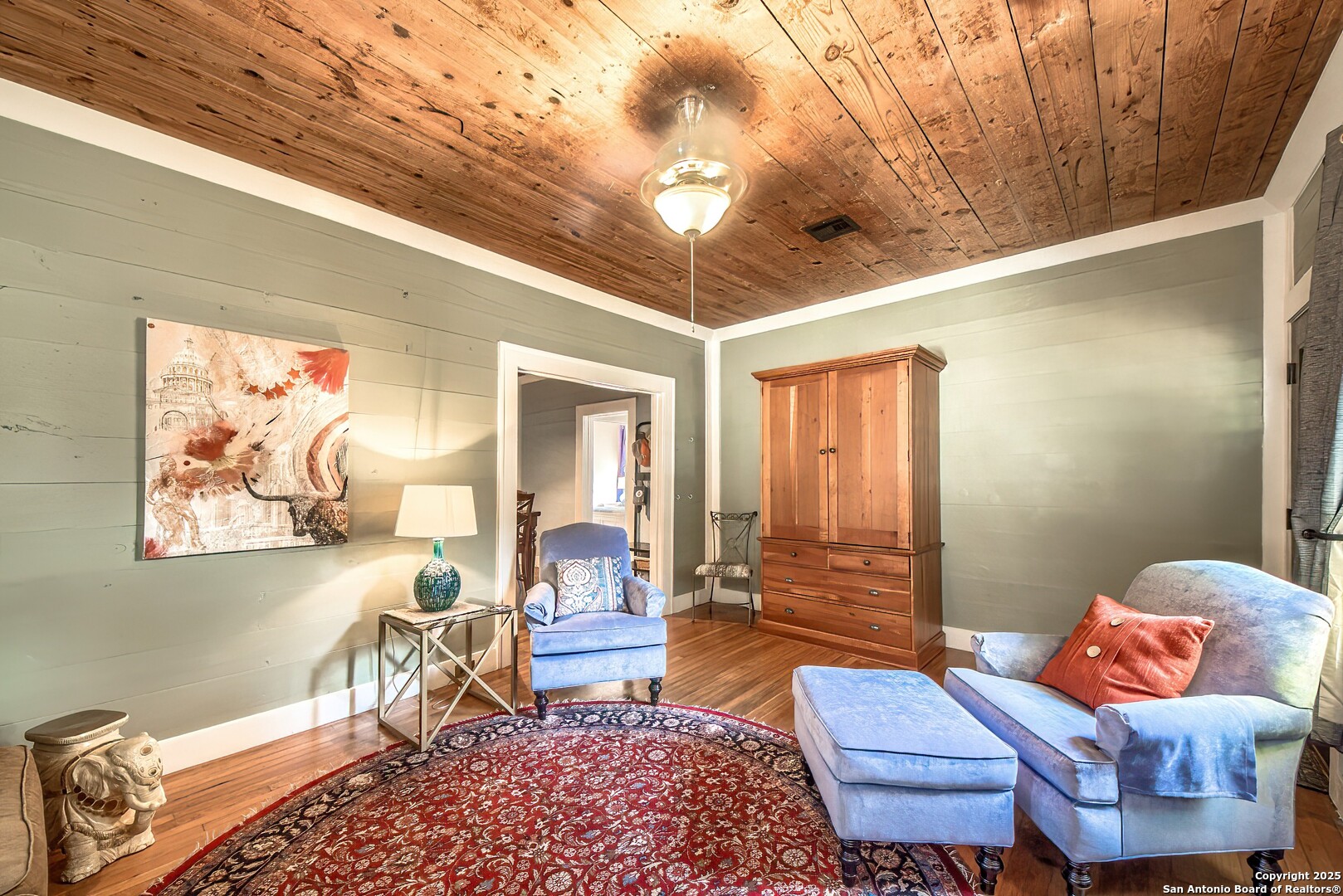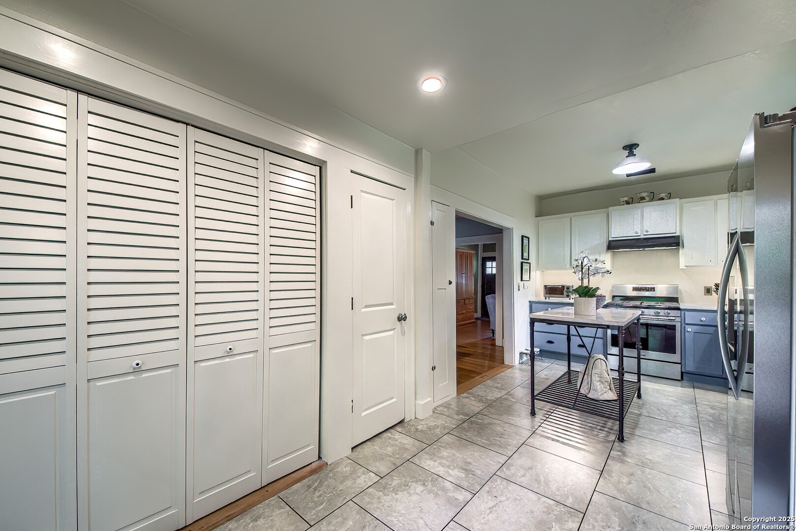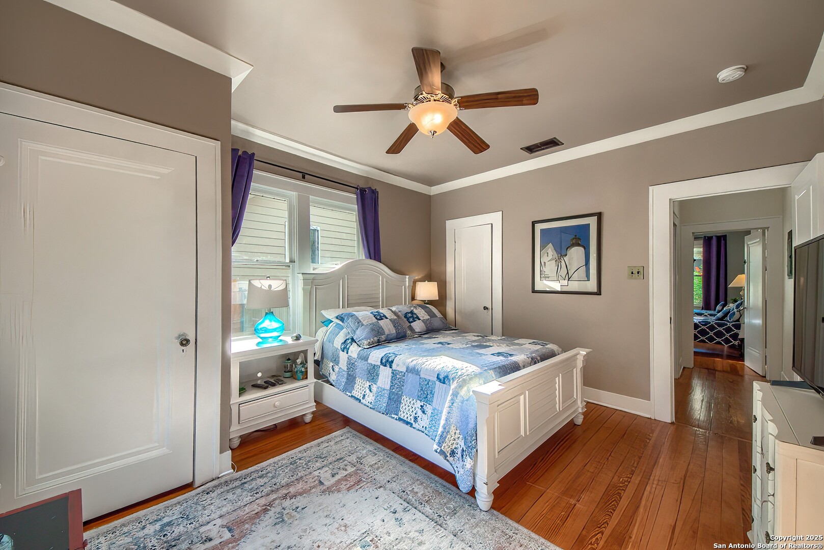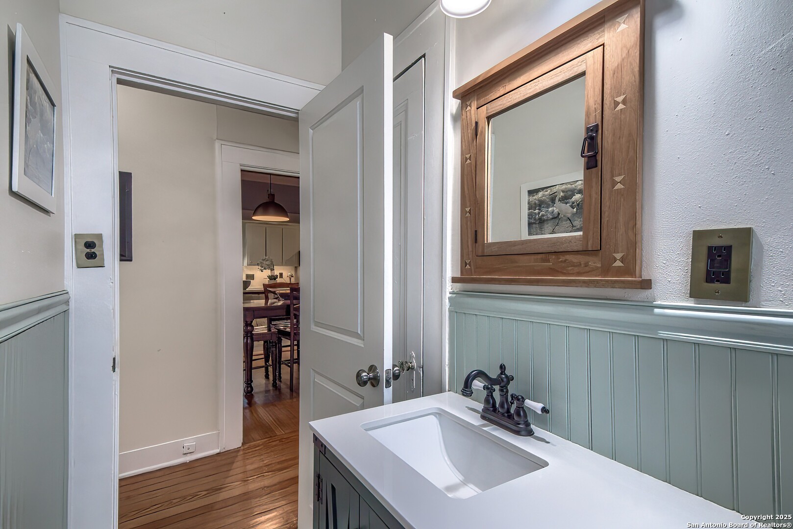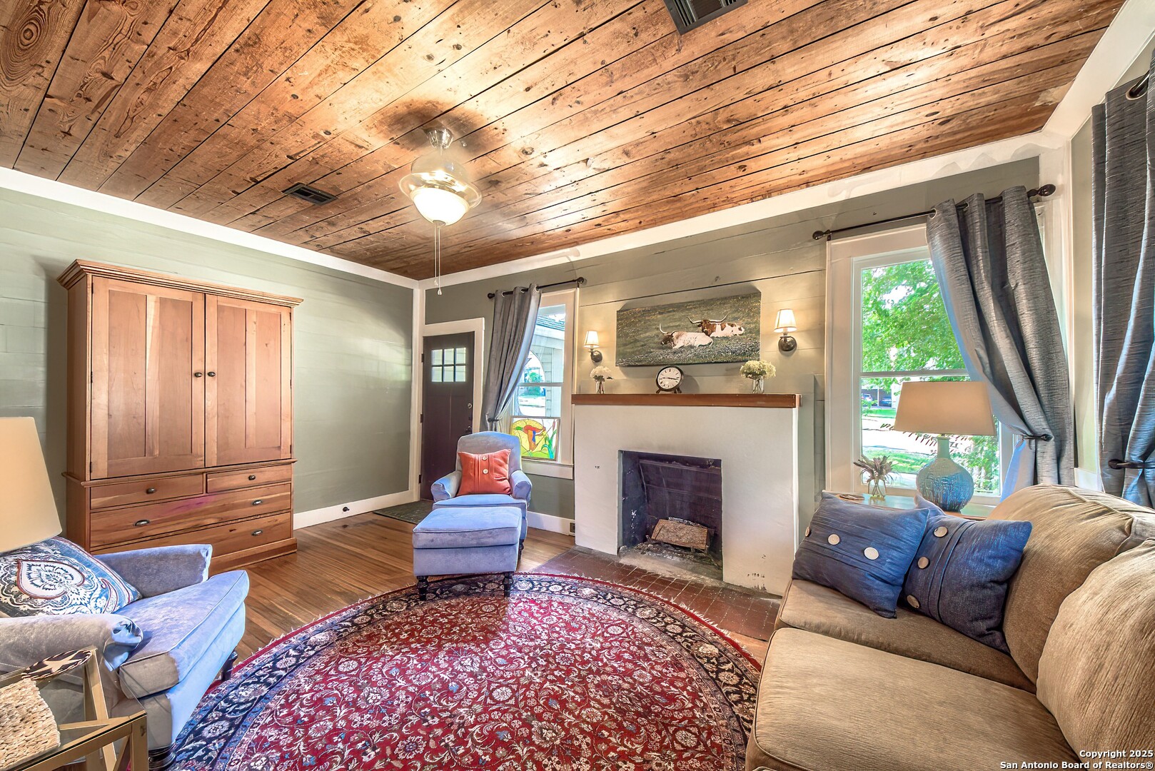 THIS IRRESISTIBLE TUDOR COTTAGE IN HISTORIC BEACON HILL WILL CHARM YOUR SOCKS OFF! Merely pulling up with give you a gasp as this doll literally calls to you from the street, so reminiscent of the peace of the English countryside and Jane Austen novels. Admire the sharply pitched roof and prominent chimney as you walk up to the adorable front porch where you can sit and watch the world go by. Step through the front door and find the past meets the present in a seamless mixture of historic elements and modern conveniences that adds up to a world full of character under high ceilings. Thick shiplap walls, painted in a soothing sage green, and natural shiplap ceilings with crown moulding resonate so that decorating them almost seems unnecessary. The fireplace sets a cozy atmosphere and large windows warm the living room with abundant natural light. Imagine long conversations with friends over dinner in the dusky blue dining room that sits strategically in the middle of the home, open to both living and the kitchen. Renovated so thoughtfully, the country kitchen invites you in with a beguiling warmth, making it the quintessential place for creativity and comfort. Light reflects off the new soft close white and blue shaker cabinetry and sleek marble countertops. Watch your favorite birds dance outside the window over the sink and cook with precision with your gas range as friends gather at the kitchen island to share a cocktail and chat. Lingering over coffee in the breakfast nook seems a given with its peaceful view of your very private backyard through french doors. The laundry closet is tucked off in a closet for convenience. On the other side of the home is the bedroom wing with the primary bedroom ready to surprise with walls of windows, two closets and an adjoining flex room with black and white mosaic tile, perfect for a classic sitting room, nursery, gym or office -- or should you want another bathroom plumbing under the home is already started to accommodate for that option. An adorable bathroom sits in the hallway another charming mix of historic and modern with bead board, chair rail accent and mosaic tile. Finally, be enchanted by the large front bedroom with its whimsical fabric wall cloth. Original hardwood floors throughout gleam with elegance and transition to ceramic tile in the kitchen. Now outside find more to love about this home -- a large deck, shaded by mature trees is elevated for a lovely view of the backyard, made even more private by a back alley. The level, fully fenced yard can be left alone as a lawn with decorative borders or get fancy add a pool, garden or playscape. A storage shed is ideal for lawn tools. The single car garage can be used for more storage, workshop or park a car, accessible through a driveway gate. Especially enjoy that the eastern fence was just replaced! Make note of the tankless water heater, water softener and stainless appliances. Now that you have found the perfect refuge, let's talk about how great this location is! Beacon Hill is one of the city's first neighborhoods and a designated Neighborhood Conservation District, which is evident as you drive the streets to admire the breadth of historical architecture and cozy neighborhood parks. Two blocks from famed restaurants and shops on Blanco and just a short walk to the mansions of Monte Vista, feel comfortably tucked into the heart of San Antonio while still being only a short bike ride or five minute drive to downtown, the Pearl, the Riverwalk, King William and Southtown. Commutes elsewhere are easy being so close to I-10 and a straight shot to 281 through neighborhoods. If you have dreamed urban living in a historic home that is still affordable, you have found it here. Bring a copy of Pride and Prejudice, sit on the porch and imagine staying forever!