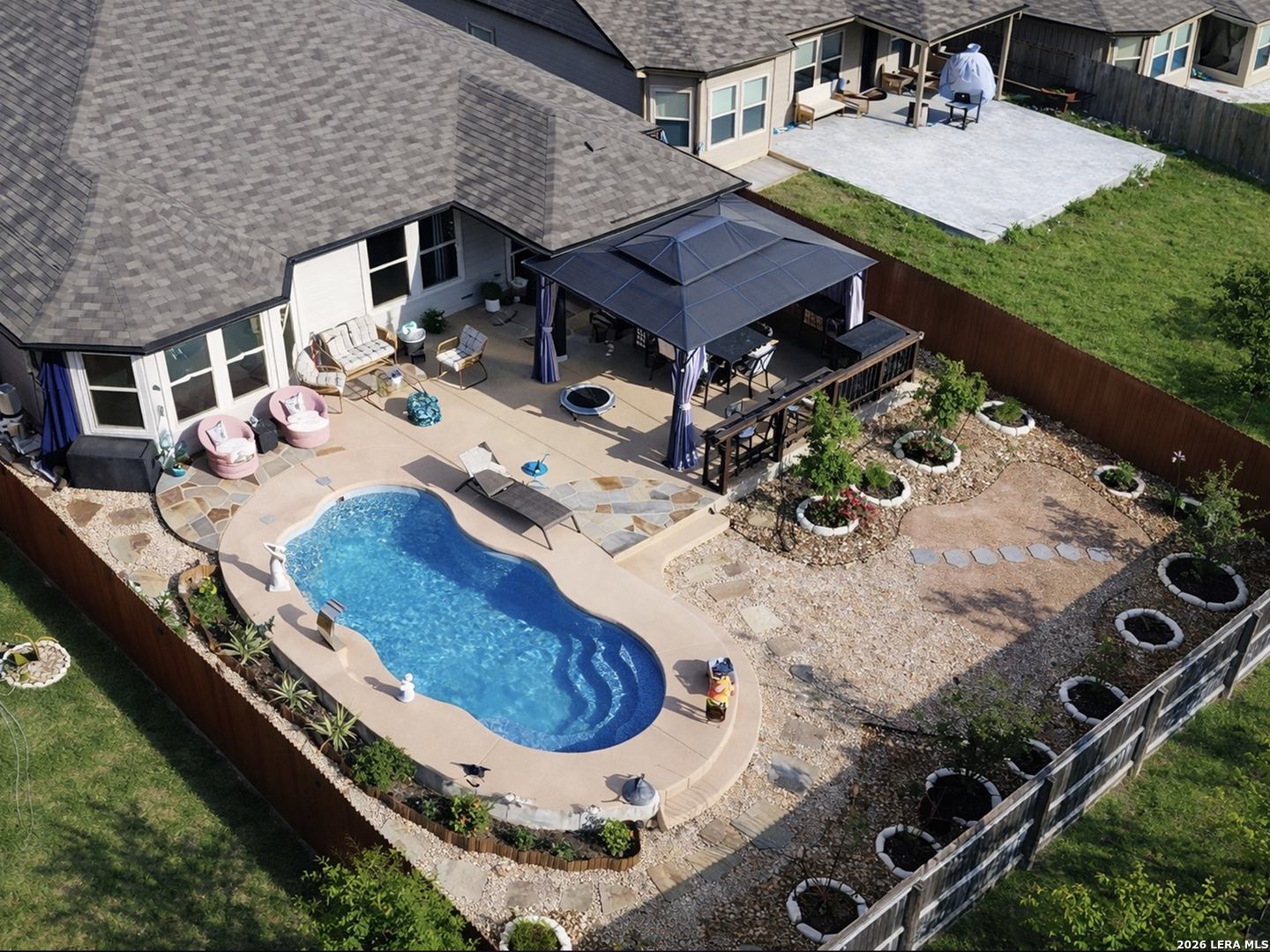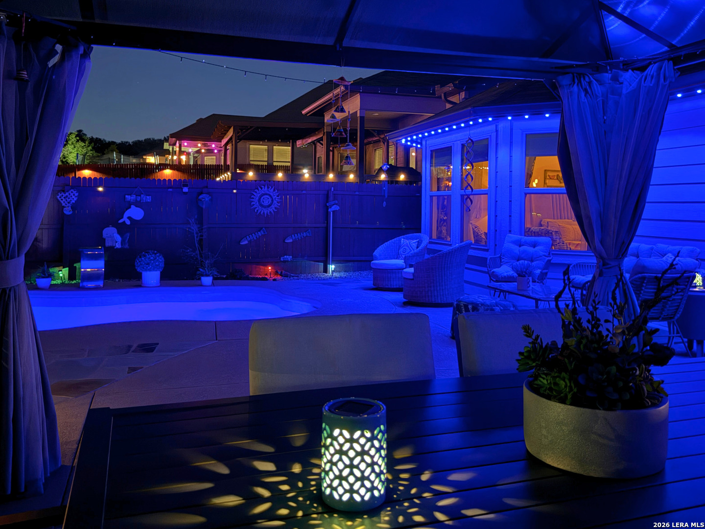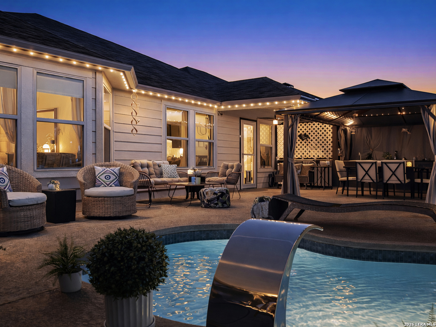This is a great opportunity for the next homeowner, and the backyard is going to be one of the main reasons this home stands out. You can tell the home has been well taken care of, and with many upgrades already done, you won't have to deal with contractors or headaches, just enjoy it from day one. The living room is already set up with built-in speakers, surround sound, and the TV. Refrigerator, washer, dryer, and water softener are also included, making the move-in process simple. The backyard is where this home really separates itself. The backyard also features a custom-built patio, thoughtfully added to transform the outdoor space, with cool-touch flooring designed for comfort even on warmer days. You also have a pool, gazebo, and a full outdoor kitchen with sink and stove, all ready to enjoy from day one with family and friends. Both the front and backyard feature color-changing lighting, creating a completely different atmosphere in the evenings. The home offers a functional layout with a primary suite overlooking the pool, featuring a full bathroom with separate shower and tub, plus a spacious walk-in closet. Two additional bedrooms are positioned with a full bathroom between them, along with a fourth bedroom that works well as an office or flex space, plus a half bathroom and laundry room nearby. The main living areas flow openly into the kitchen, dining, and living space. Located in a peaceful, family-friendly community with top-rated schools, this is one of those homes you really need to see in person to fully appreciate. There are additional upgrades throughout the home that aren't all listed here and are best experienced in person. Schedule your private showing today and come experience it for yourself.