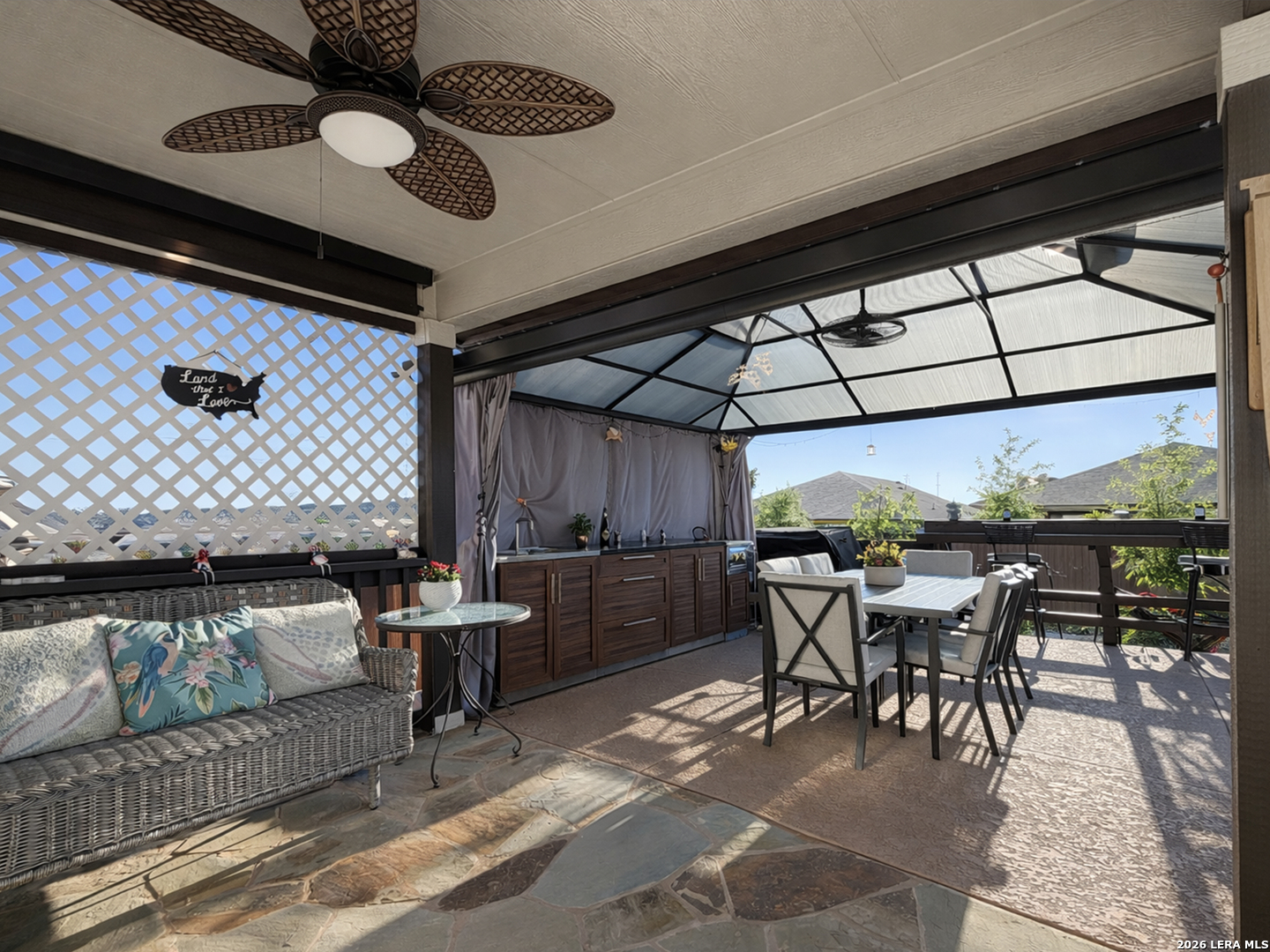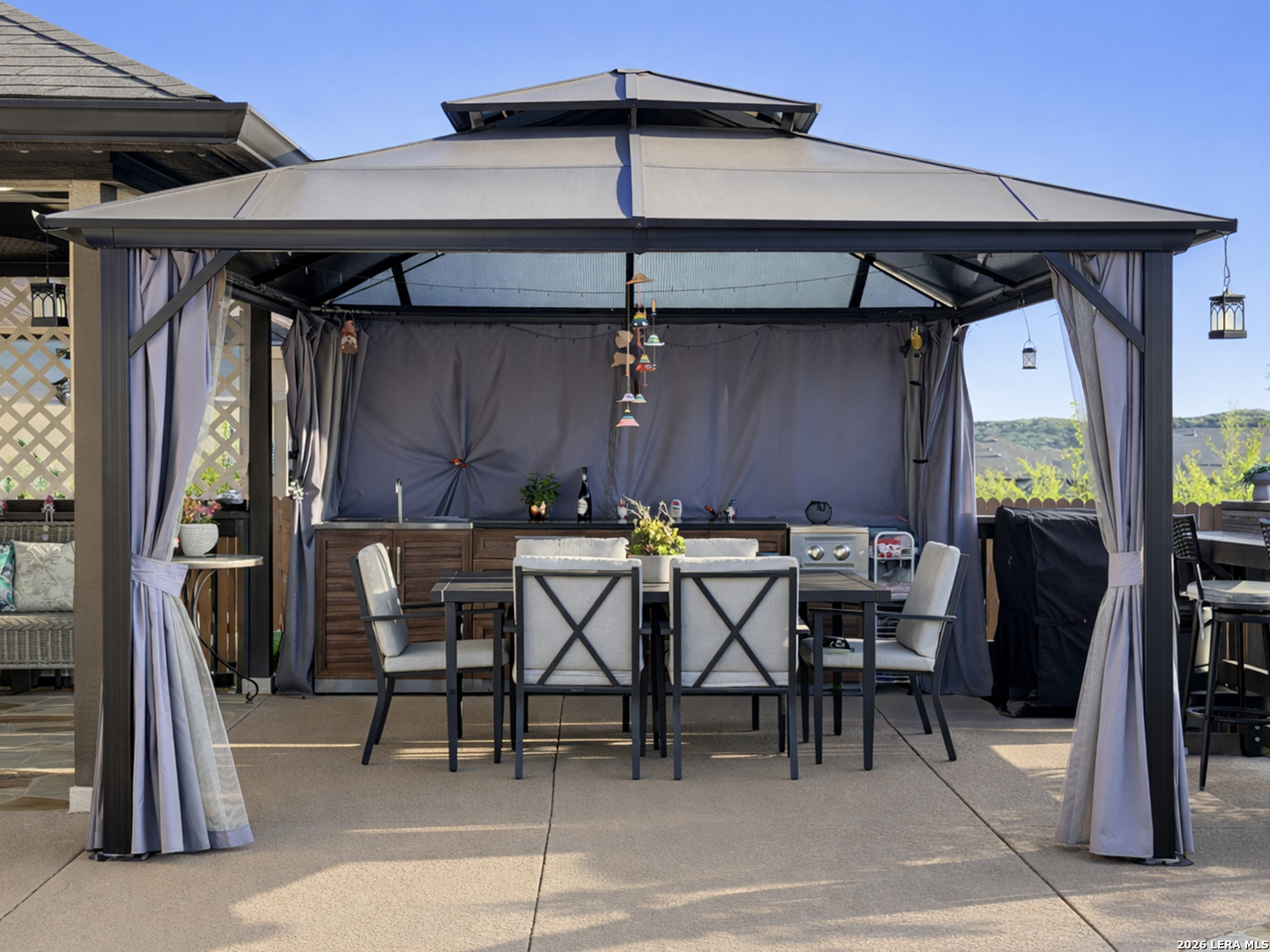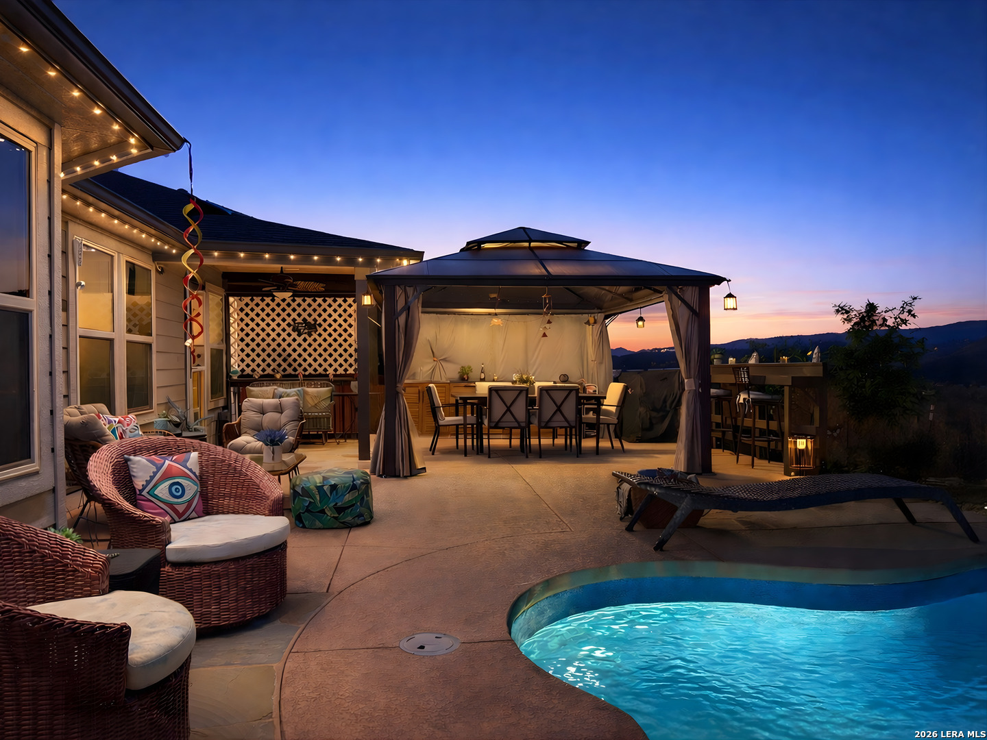This is a great opportunity for the next homeowner, and the backyard is going to be one of the main reasons this home stands out. You can tell the home has been well taken care of, and with many upgrades already done, you won't have to deal with contractors or headaches, just enjoy it from day one. The living room is already set up with built-in speakers, surround sound, and the TV. Refrigerator, washer, dryer, and water softener are also included, making the move-in process simple. The backyard is where this home really separates itself. The backyard also features a custom-built patio, thoughtfully added to transform the outdoor space, with cool-touch flooring designed for comfort even on warmer days. You also have a pool, gazebo, and a full outdoor kitchen with sink and stove, all ready to enjoy from day one with family and friends. Both the front and backyard feature color-changing lighting, creating a completely different atmosphere in the evenings. The home offers a functional layout with a primary suite overlooking the pool, featuring a full bathroom with separate shower and tub, plus a spacious walk-in closet. Two additional bedrooms are positioned with a full bathroom between them, along with a fourth bedroom that works well as an office or flex space, plus a half bathroom and laundry room nearby. The main living areas flow openly into the kitchen, dining, and living space. Located in a peaceful, family-friendly community with top-rated schools, this is one of those homes you really need to see in person to fully appreciate. There are additional upgrades throughout the home that aren't all listed here and are best experienced in person. Schedule your private showing today and come experience it for yourself.