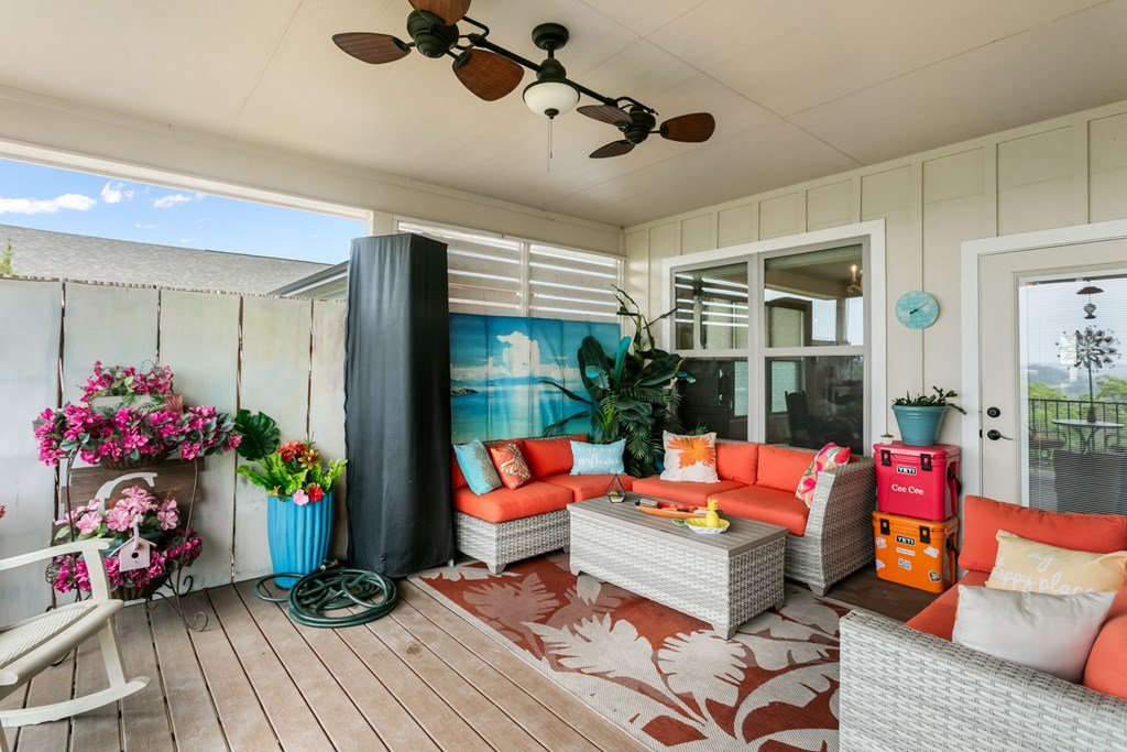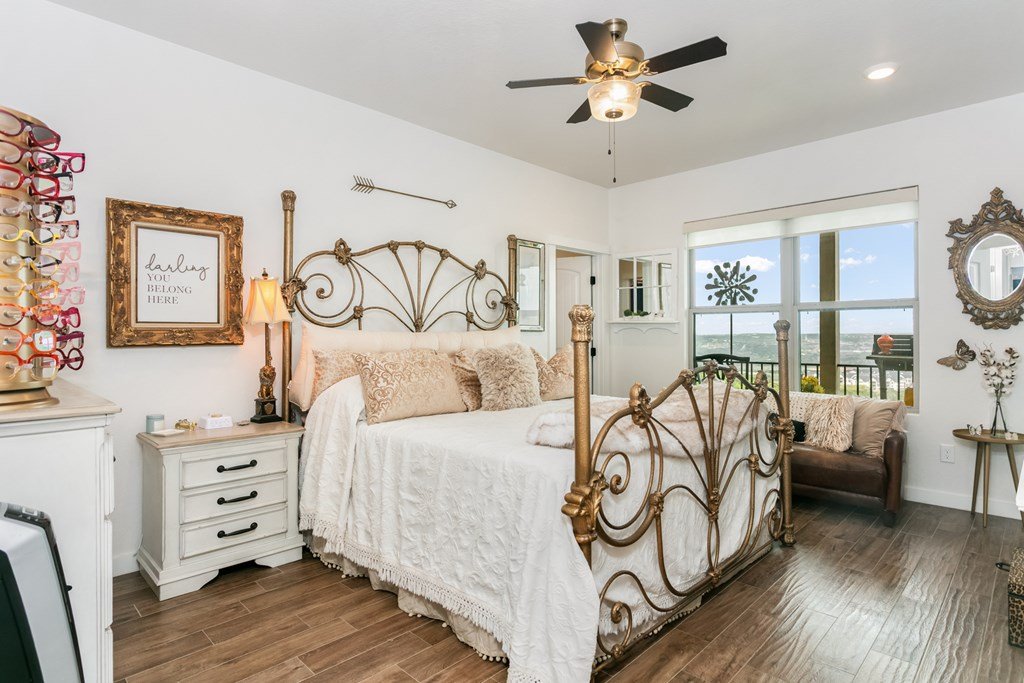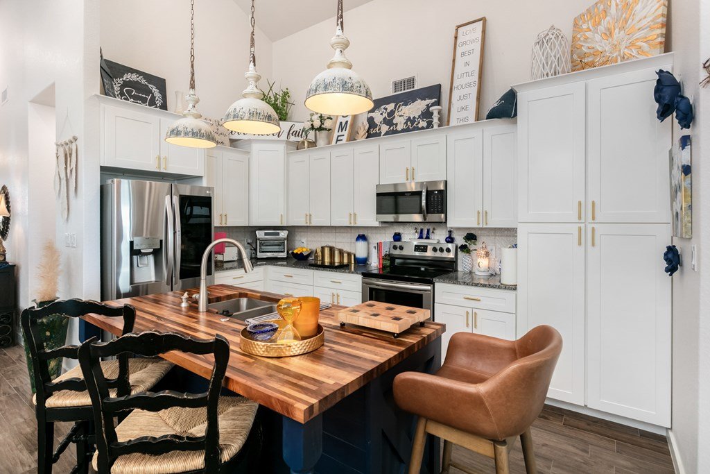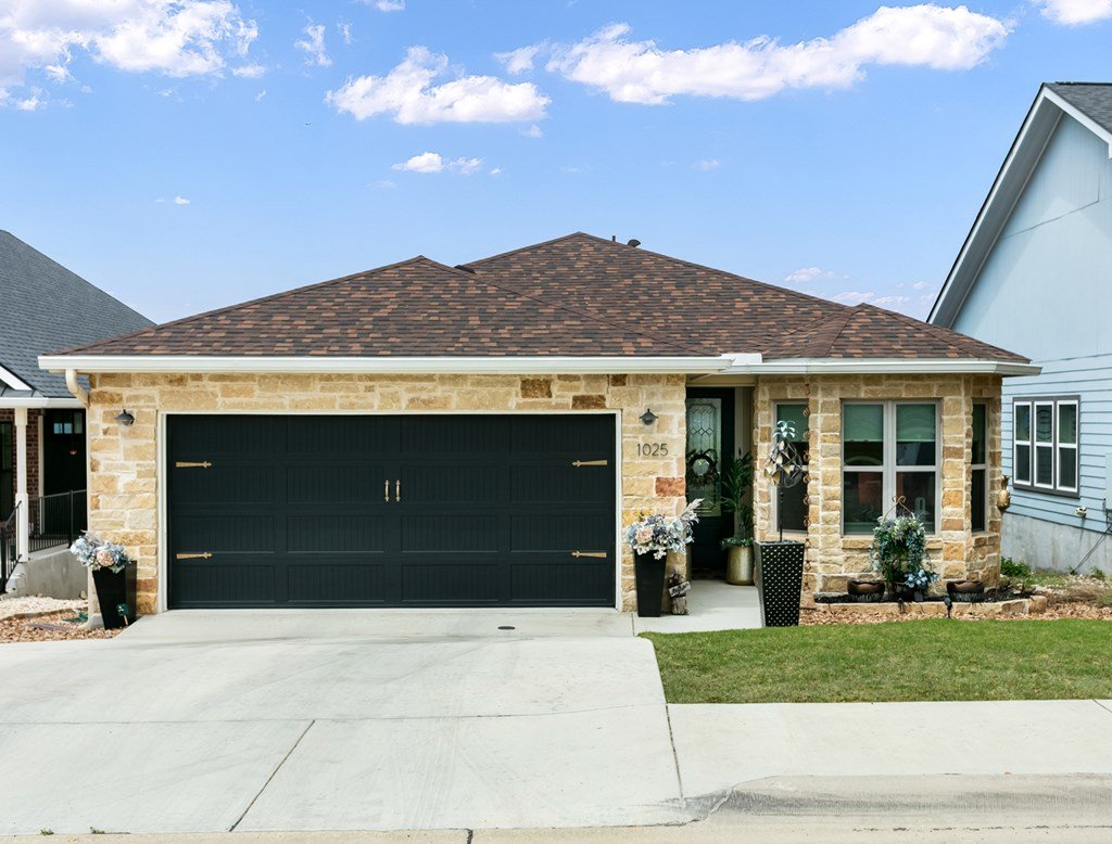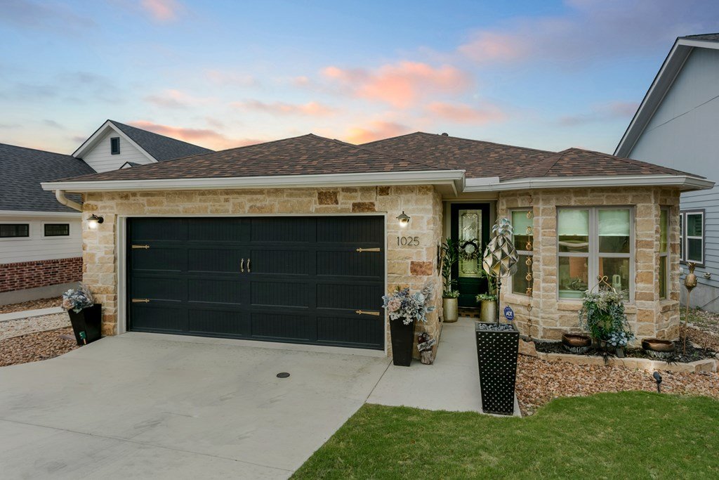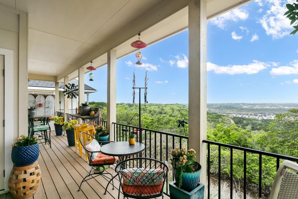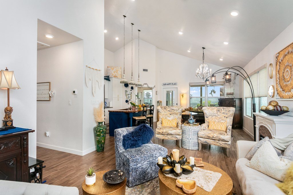Well-designed home featuring an open floor plan, abundant natural light, and thoughtfully selected finishes throughout. Wood-look tile flooring extends seamlessly across the entire home, offering both durability and a warm, cohesive aesthetic. Subtle gold accents are carried throughout, adding a refined, elevated touch. The main living area flows effortlessly into the kitchen and dining spaces, creating a layout that is both functional and inviting. The kitchen serves as a central focal point with ample cabinetry, stainless appliances, and a standout butcher block island that provides additional prep space, seating, and visual contrast. Vaulted ceilings enhance the sense of openness and volume throughout the main living areas. The primary suite is positioned to take advantage of the surrounding Hill Country scenery, with large windows that bring in natural light and long-range views. Secondary bedrooms and a dedicated office offer flexibility for guests, work-from-home needs, or hobbies. Outdoor living is equally impressive with a covered back patio perfectly oriented to capture sweeping Hill Country views. This space provides a private setting to enjoy the landscape, with “views for days” stretching across the horizon.