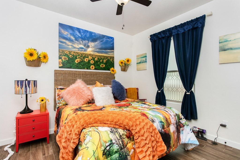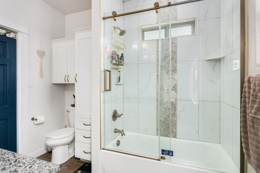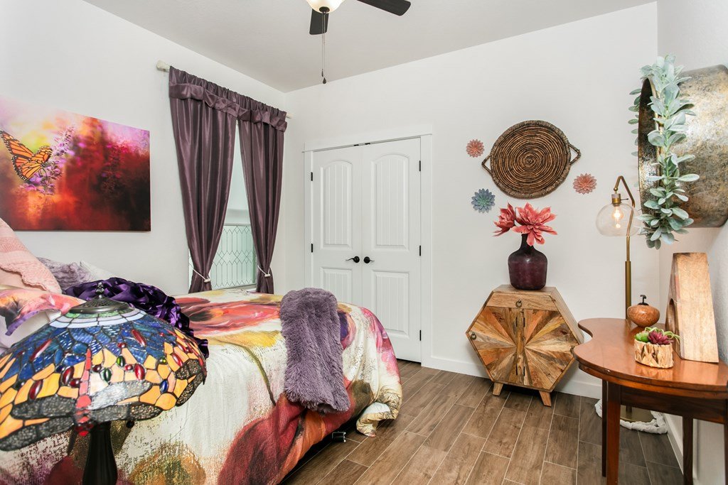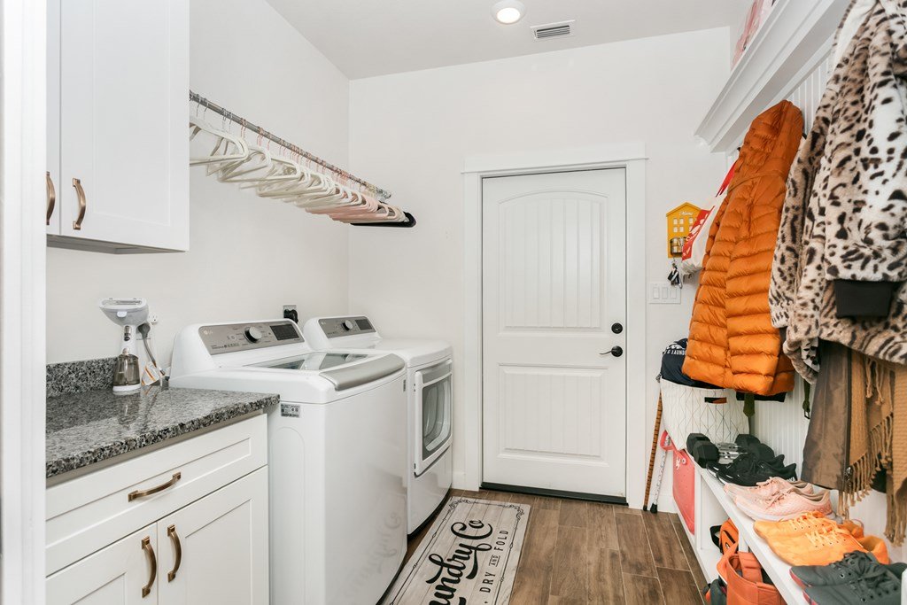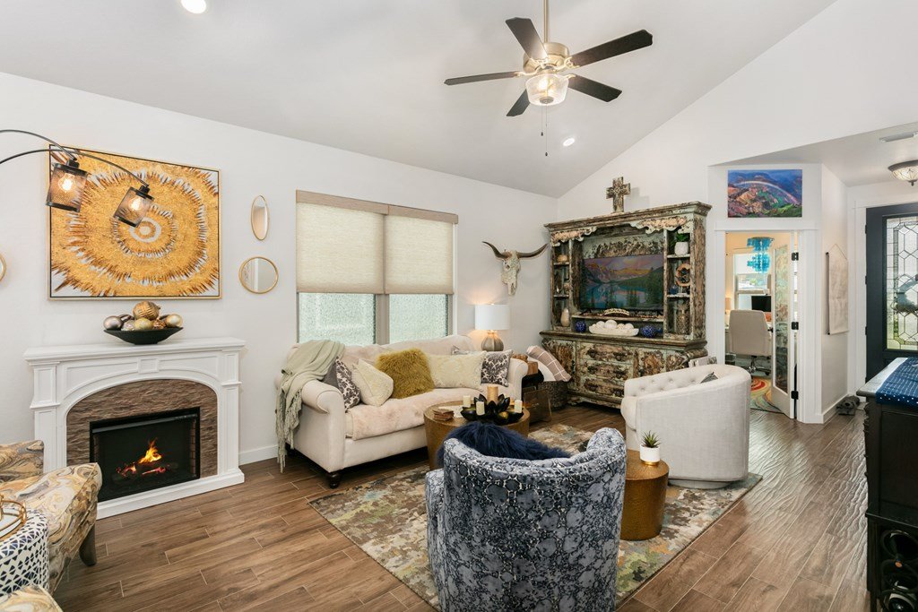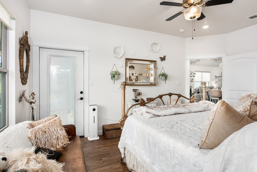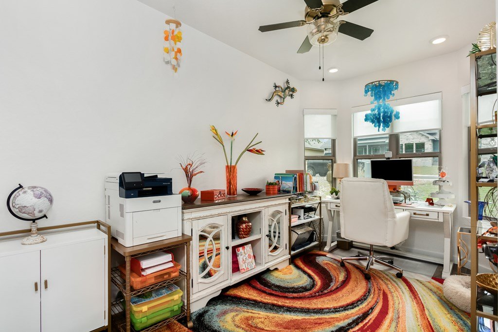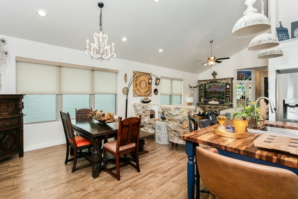Well-designed home featuring an open floor plan, abundant natural light, and thoughtfully selected finishes throughout. Wood-look tile flooring extends seamlessly across the entire home, offering both durability and a warm, cohesive aesthetic. Subtle gold accents are carried throughout, adding a refined, elevated touch. The main living area flows effortlessly into the kitchen and dining spaces, creating a layout that is both functional and inviting. The kitchen serves as a central focal point with ample cabinetry, stainless appliances, and a standout butcher block island that provides additional prep space, seating, and visual contrast. Vaulted ceilings enhance the sense of openness and volume throughout the main living areas. The primary suite is positioned to take advantage of the surrounding Hill Country scenery, with large windows that bring in natural light and long-range views. Secondary bedrooms and a dedicated office offer flexibility for guests, work-from-home needs, or hobbies. Outdoor living is equally impressive with a covered back patio perfectly oriented to capture sweeping Hill Country views. This space provides a private setting to enjoy the landscape, with “views for days” stretching across the horizon.
