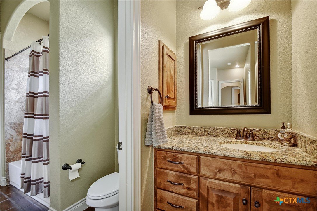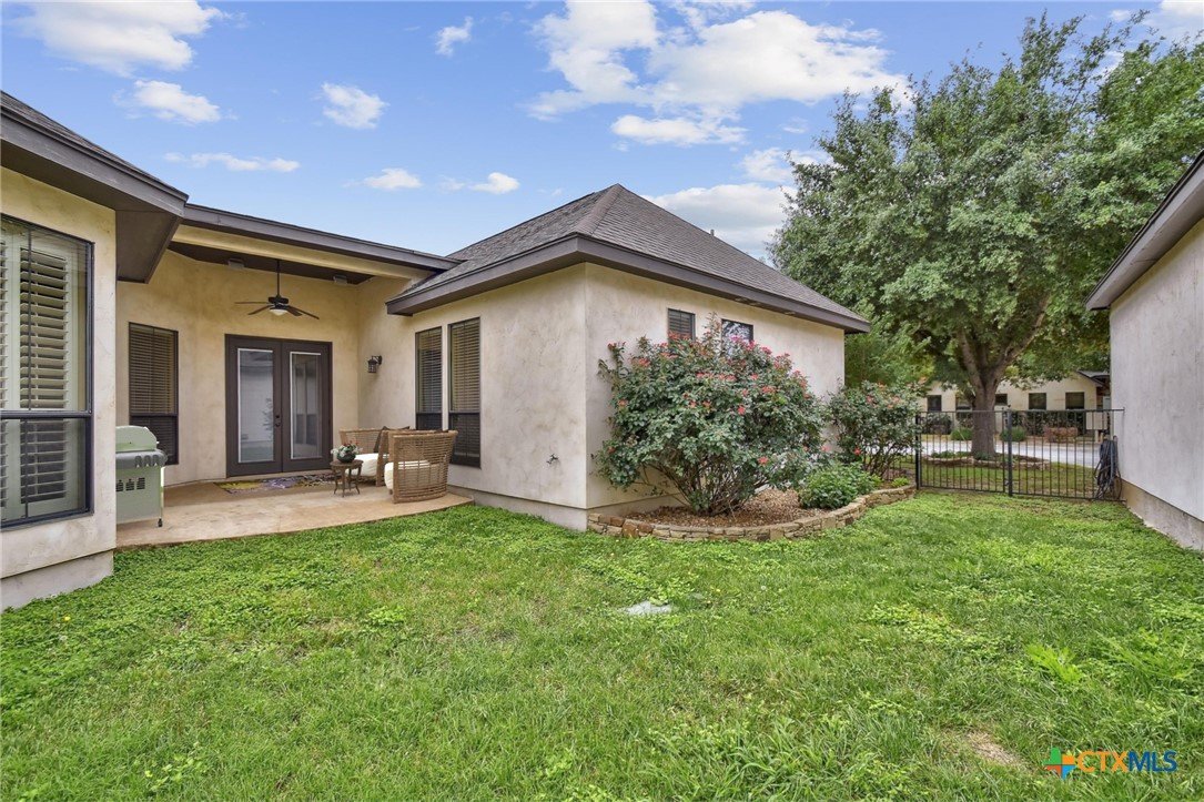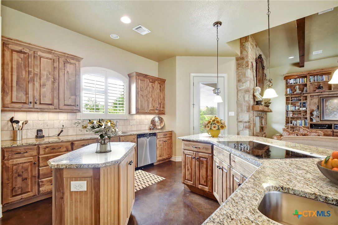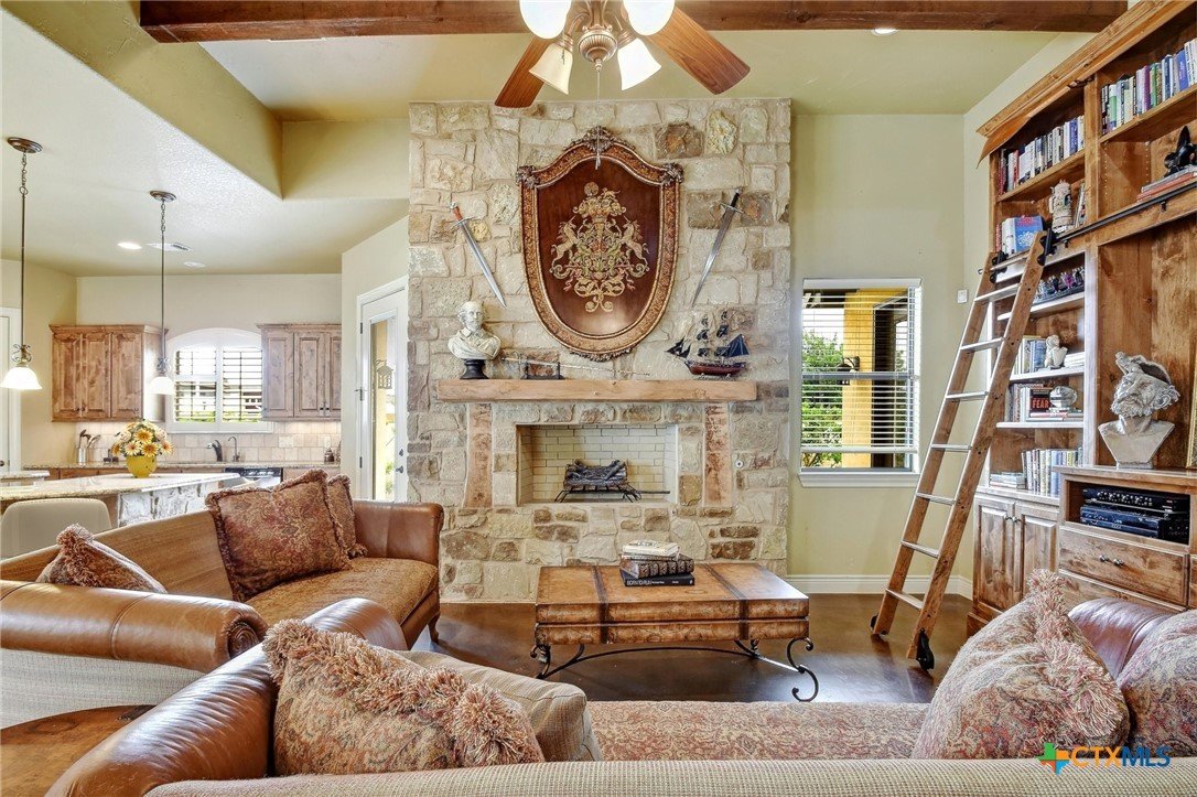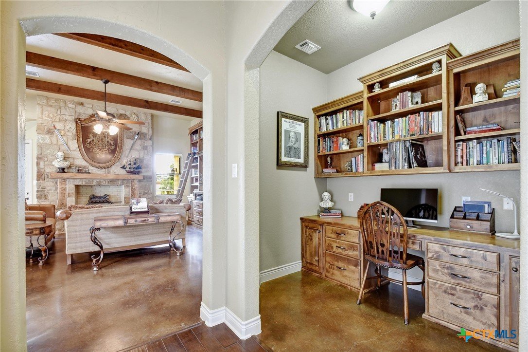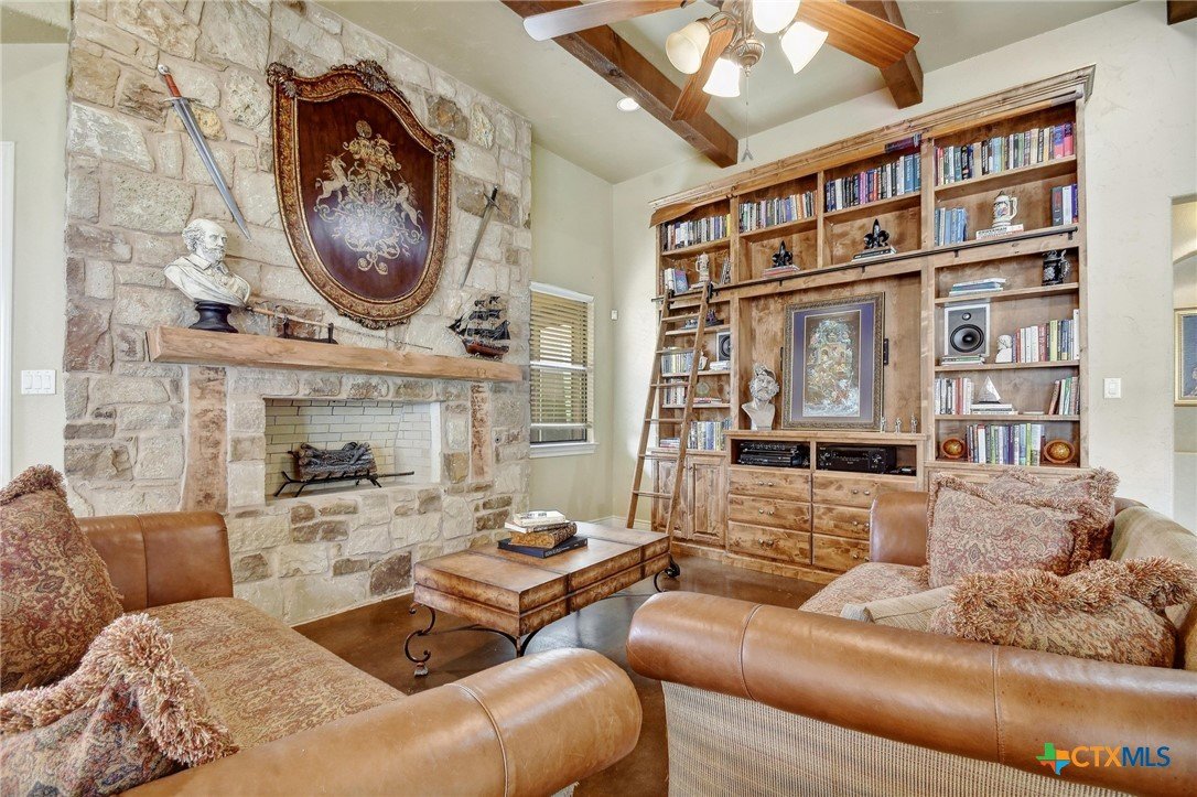 Welcome to this beautifully crafted former model home, tucked away in the charming Green Leaf Subdivision just outside historic Green. Conveniently located near local shops and restaurants, this home offers both comfort and accessibility. Designed with care and attention to detail, this 3-bedroom, 2.5-bathroom home features a thoughtful layout and numerous custom upgrades. The spacious living area boasts high ceilings, a custom library wall, a cozy gas log fireplace, and a dedicated personal office—perfect for working from home. The kitchen is a true centerpiece, open to the dining and living areas and featuring granite countertops, a center island with cooktop, breakfast bar, and a built-in coffee bar for your morning routine. The master suite is filled with natural light and includes a garden tub, double vanity, and a generous walk-in closet. A Jack-and-Jill bathroom connects the secondary bedrooms, making the space both functional and family-friendly. As part of the Green Leaf HOA, you’ll enjoy access to a private cabana area and direct access to the Guadalupe River—a rare perk in this serene neighborhood. Homes with this level of detail and history don’t come around often. Schedule your private showing today! **Parts of house have been virtually staged**