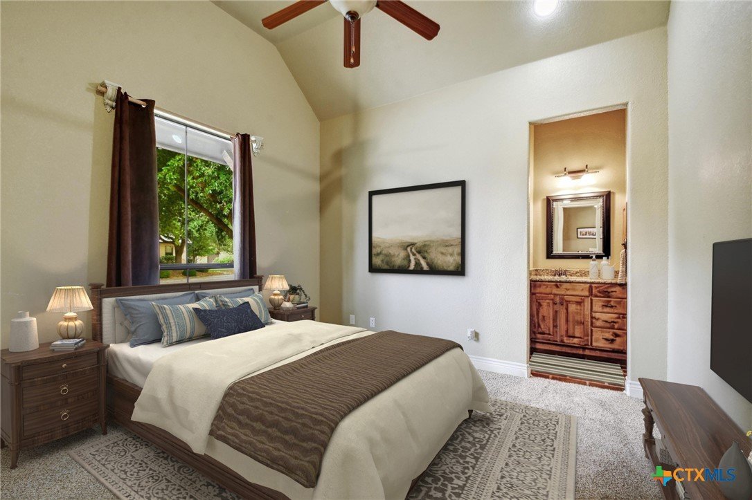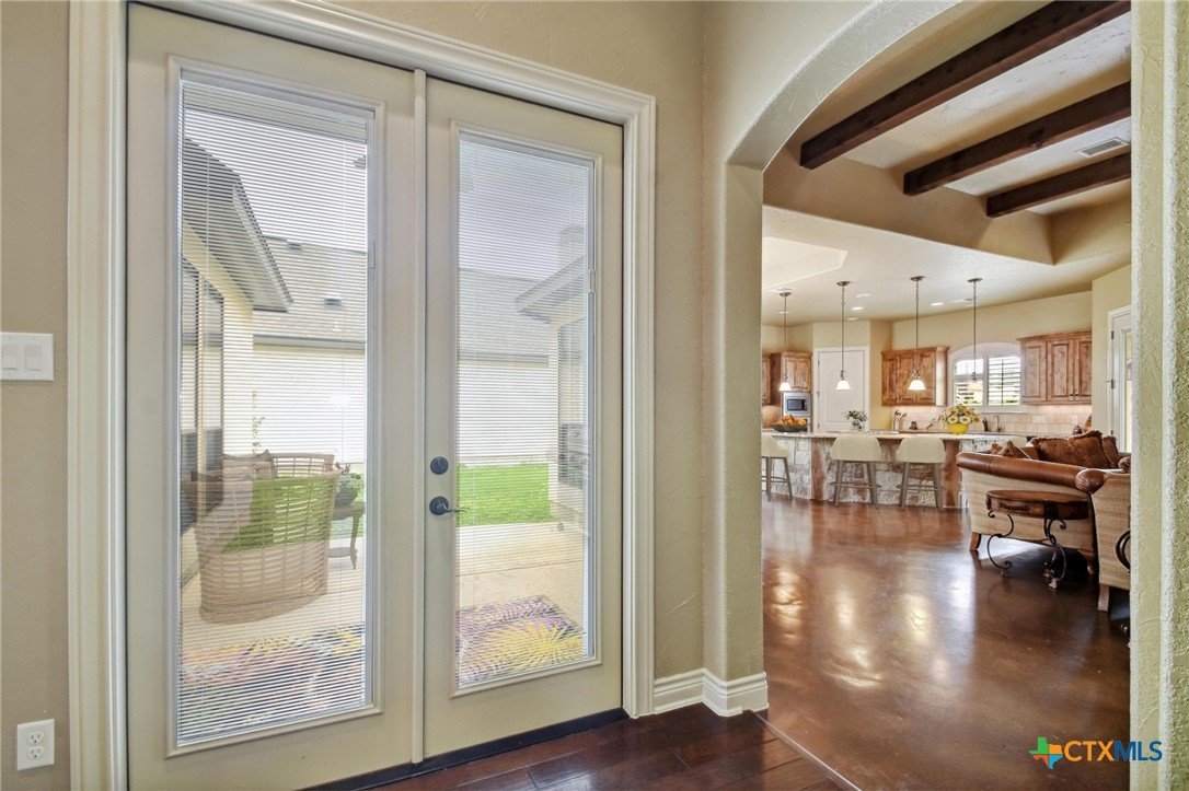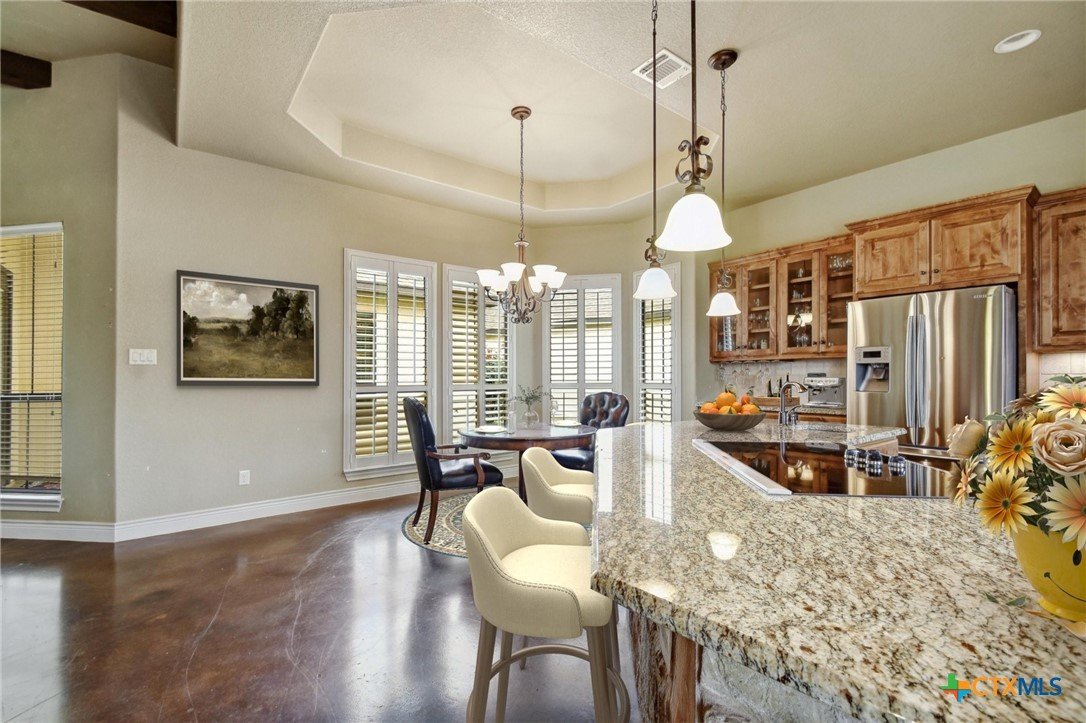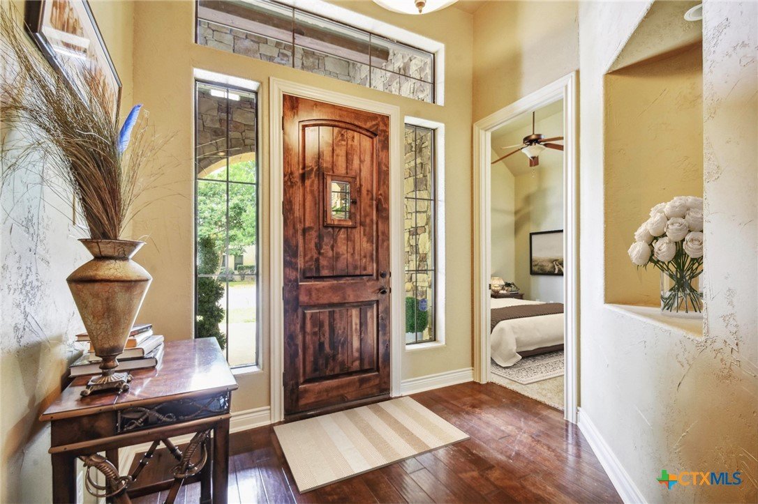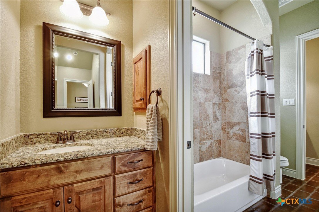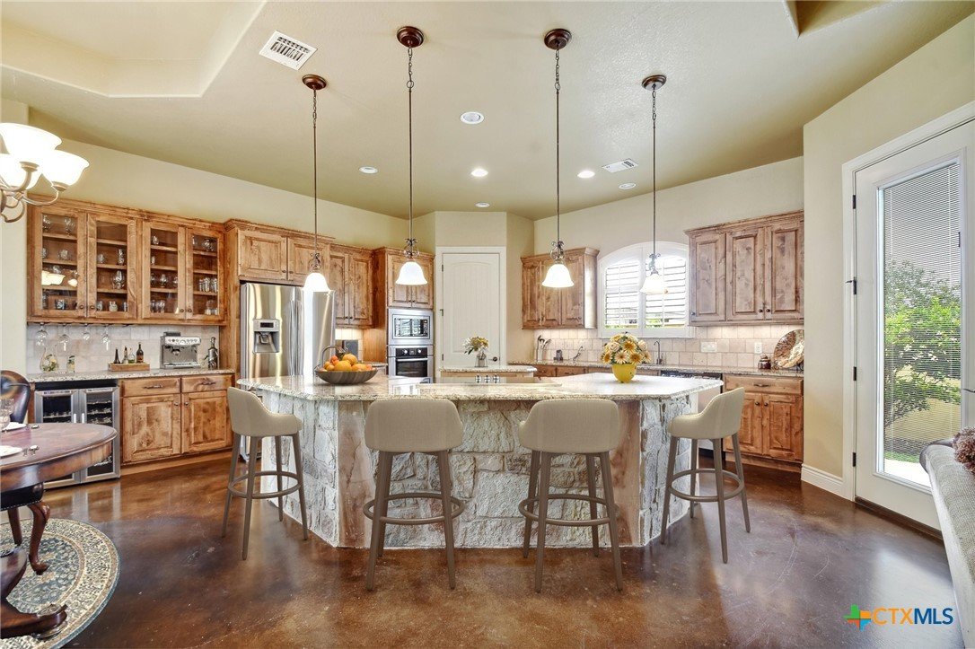 Welcome to this beautifully crafted former model home, tucked away in the charming Green Leaf Subdivision just outside historic Green. Conveniently located near local shops and restaurants, this home offers both comfort and accessibility. Designed with care and attention to detail, this 3-bedroom, 2.5-bathroom home features a thoughtful layout and numerous custom upgrades. The spacious living area boasts high ceilings, a custom library wall, a cozy gas log fireplace, and a dedicated personal office—perfect for working from home. The kitchen is a true centerpiece, open to the dining and living areas and featuring granite countertops, a center island with cooktop, breakfast bar, and a built-in coffee bar for your morning routine. The master suite is filled with natural light and includes a garden tub, double vanity, and a generous walk-in closet. A Jack-and-Jill bathroom connects the secondary bedrooms, making the space both functional and family-friendly. As part of the Green Leaf HOA, you’ll enjoy access to a private cabana area and direct access to the Guadalupe River—a rare perk in this serene neighborhood. Homes with this level of detail and history don’t come around often. Schedule your private showing today! **Parts of house have been virtually staged**