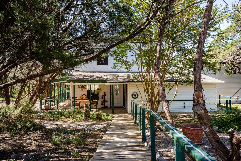A delightful hill country property (almost 5 acres) in the popular Wood Trail Subdivision. Quiet & secluded w/lots of trees, awesome views of the hills that look South from a covered deck, and a 500 gal water storage tank. There are 2 houses, each w/a loft. The main house is approx 864 sq ft w/large closet & half bath downstairs & full bath upstairs. Delightful open concept & stairs have an electric lift. New tile flooring w/wood look (down) & free-standing wood stove. Stand-alone guest house has loft w/closet & full bath downstairs. It is self-contained w/kitchen, Laundry room atch to main house w/easy access to guest house. A 2-car carport, workshop and storage building complete the out-buildings. Septic has a new drainfield ('19); new windows downstairs in main house; 10" of spray foam is under the main house; guest house has ductless 2 ton HVAC is new as of last yr '19); roofs replaced on both units in 2010; carport roof replaced in '17. Guest house has a downstairs room that makes a great office (no closet). Property is delightfully unique and well cared for. Main house has covered wrap-around deck that connects to guest house.