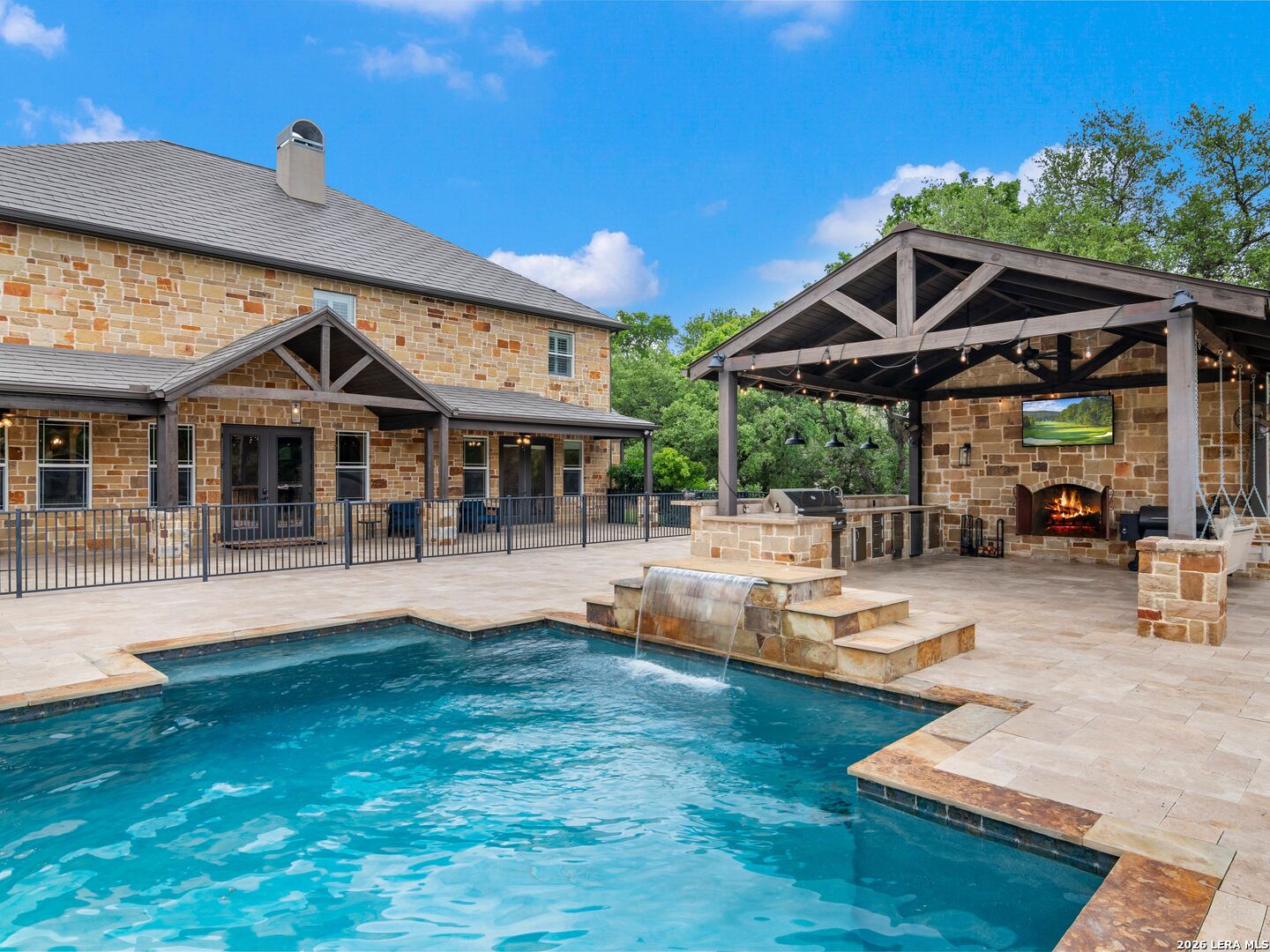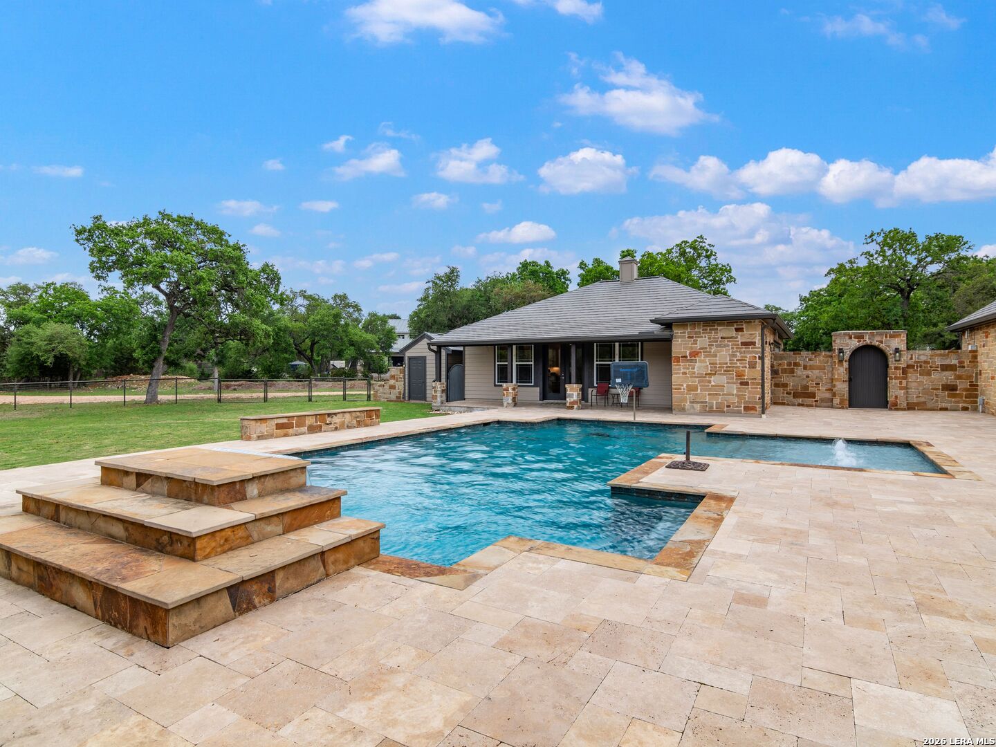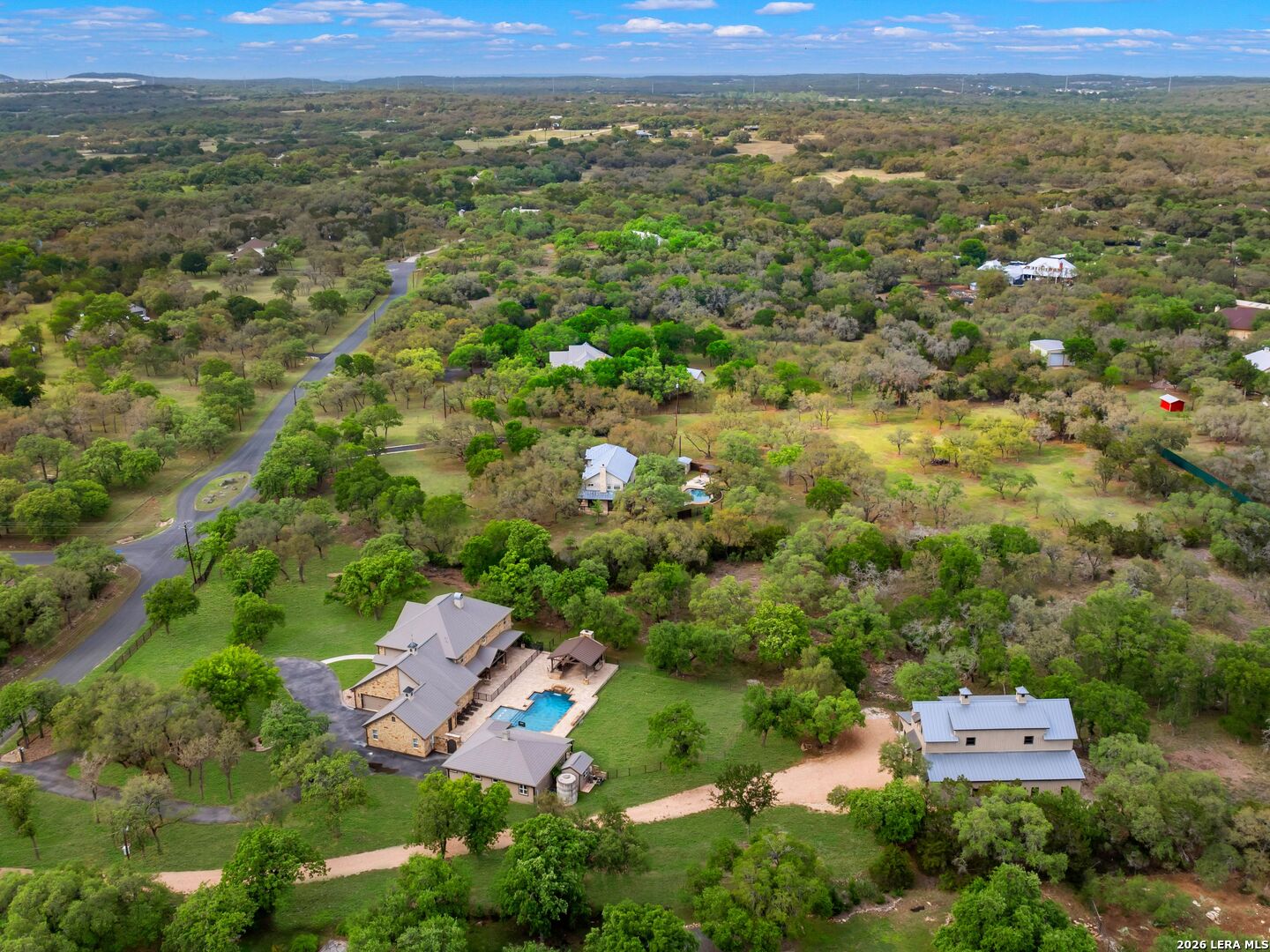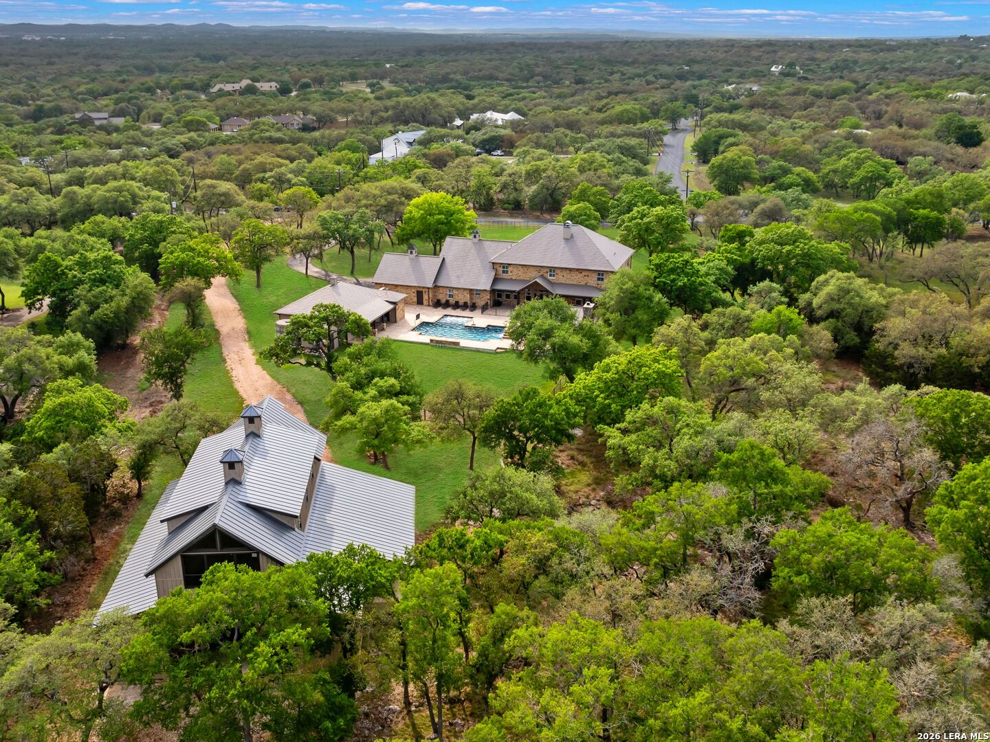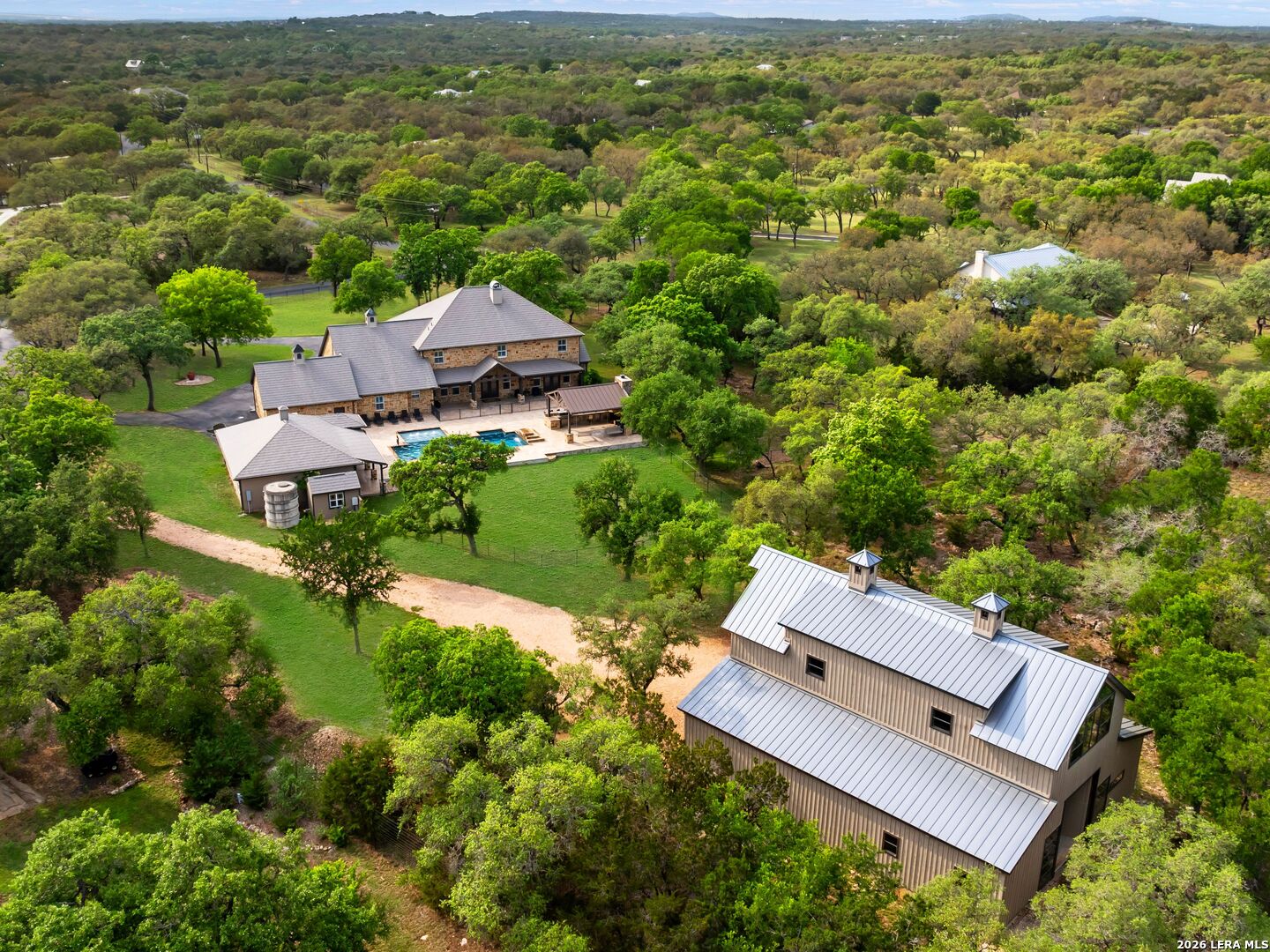 Set behind a gated entry on 5.02 manicured acres, this Hill Country estate offers privacy, scale, and a highly functional layout designed for both everyday living and larger scale entertaining. Mature trees frame the property, giving the home a quiet setting with strong curb appeal, generous outdoor space, and a true sense of arrival. Inside, the home opens with a welcoming foyer accented by distressed hardwood flooring, wraparound windows, and a stately arched stone wall that brings warmth and character to the main living areas. The floor plan is spacious without feeling disconnected, with a great room centered around a stone fireplace and large windows that draw natural light across the interior. The kitchen is designed for both daily use and entertaining, featuring a large island, stainless steel appliances, gas cooking, extensive workspace, and easy connection to dual dining areas. The main level includes a dedicated study, downstairs guest suite, and a privately positioned primary suite with direct access to the pool area. The primary bath offers separate vanities, a Jacuzzi soaking tub, walk in shower, and dual wardrobe closets. The entry from the attached garages has been thoughtfully updated with a custom coffee bar, additional storage, and a separate bank of custom cabinetry finished with granite that ties into the updated kitchen counters. The space includes closet hanging storage for coats or off season clothing, along with extra deep drawers designed for kitchen necessities and daily function. Upstairs, a spacious game room anchors the secondary living area, joined by guest bedrooms and an additional primary style suite with its own sitting area and spa inspired bath. The layout provides flexibility for guests, extended stays, or separate living needs without sacrificing comfort. The outdoor living is a major part of the property. A covered patio overlooks the grounds, while the cabana is built for entertaining with a full outdoor kitchen, Twin Eagles grill, ice maker, refrigerator, fireplace, and bar seating for eight. The resort style pool includes a spillway waterfall and sun lounging deck, creating a private setting for relaxing or hosting. Adjacent to the pool, the former detached garage space was converted in 2021 into a 2 bedroom, 2 bath guesthouse with a full kitchen, custom cabinetry, appliances, and washer and dryer. Another major improvement is the custom timber frame barn by Texas Timber Frames, offering a cement floor, lofted space, 220 amp electricity, and roughed in plumbing for a full bathroom. The barn's main level measures 60 x 48, with a 60 x 24 loft, bringing the total barn square footage to approximately 4,320 square feet. Just minutes from downtown Boerne, this estate delivers acreage, privacy, outdoor living, guest accommodations, and meaningful improvements in one complete setting.