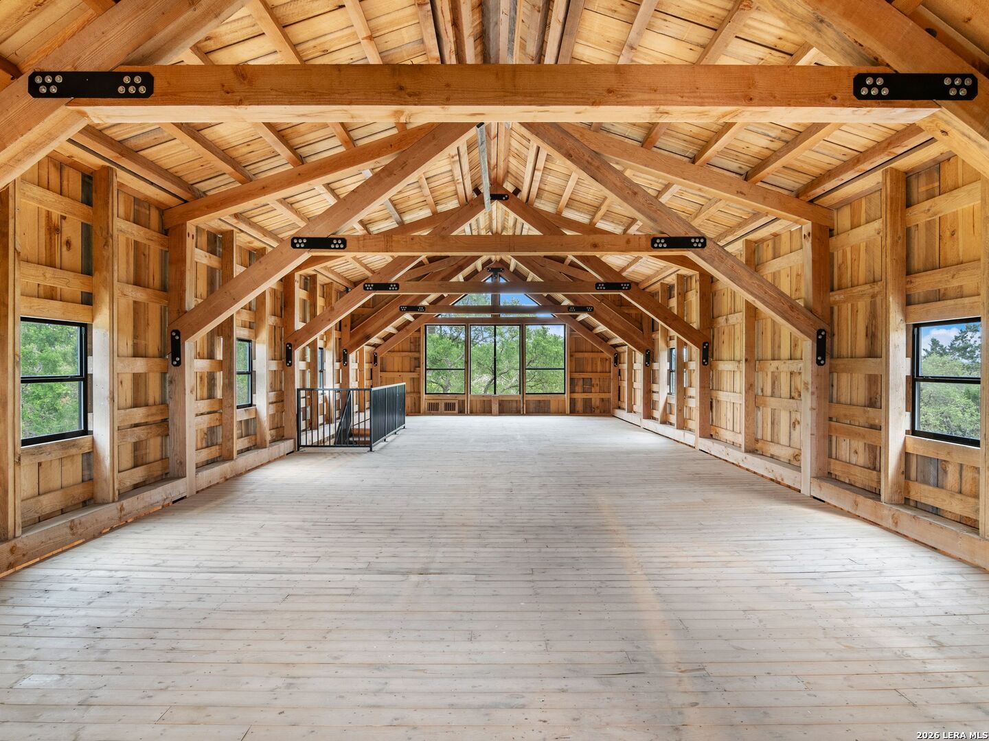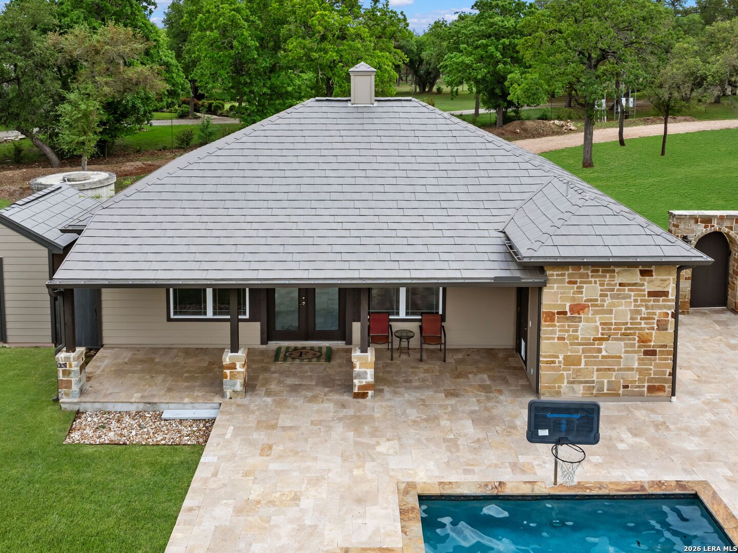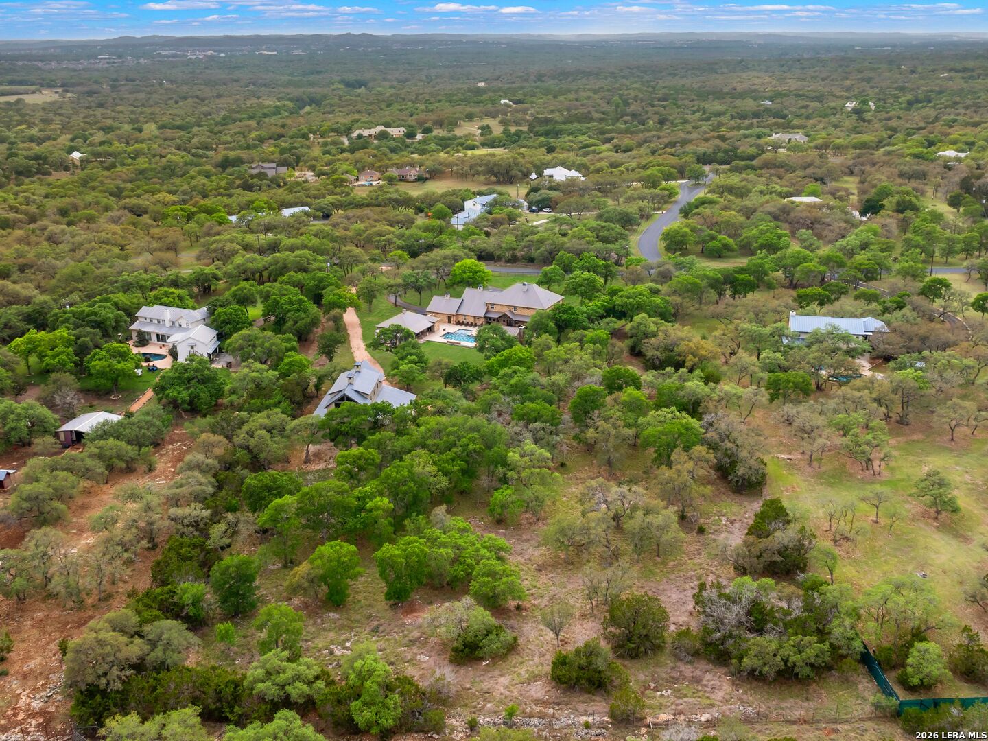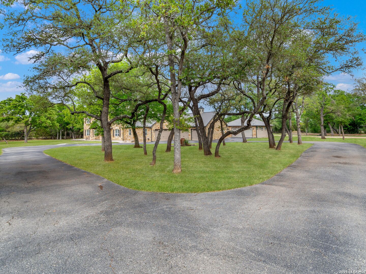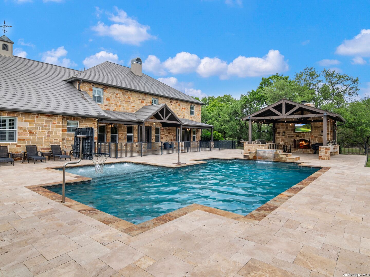 Set behind a gated entry on 5.02 manicured acres, this Hill Country estate offers privacy, scale, and a highly functional layout designed for both everyday living and larger scale entertaining. Mature trees frame the property, giving the home a quiet setting with strong curb appeal, generous outdoor space, and a true sense of arrival. Inside, the home opens with a welcoming foyer accented by distressed hardwood flooring, wraparound windows, and a stately arched stone wall that brings warmth and character to the main living areas. The floor plan is spacious without feeling disconnected, with a great room centered around a stone fireplace and large windows that draw natural light across the interior. The kitchen is designed for both daily use and entertaining, featuring a large island, stainless steel appliances, gas cooking, extensive workspace, and easy connection to dual dining areas. The main level includes a dedicated study, downstairs guest suite, and a privately positioned primary suite with direct access to the pool area. The primary bath offers separate vanities, a Jacuzzi soaking tub, walk in shower, and dual wardrobe closets. The entry from the attached garages has been thoughtfully updated with a custom coffee bar, additional storage, and a separate bank of custom cabinetry finished with granite that ties into the updated kitchen counters. The space includes closet hanging storage for coats or off season clothing, along with extra deep drawers designed for kitchen necessities and daily function. Upstairs, a spacious game room anchors the secondary living area, joined by guest bedrooms and an additional primary style suite with its own sitting area and spa inspired bath. The layout provides flexibility for guests, extended stays, or separate living needs without sacrificing comfort. The outdoor living is a major part of the property. A covered patio overlooks the grounds, while the cabana is built for entertaining with a full outdoor kitchen, Twin Eagles grill, ice maker, refrigerator, fireplace, and bar seating for eight. The resort style pool includes a spillway waterfall and sun lounging deck, creating a private setting for relaxing or hosting. Adjacent to the pool, the former detached garage space was converted in 2021 into a 2 bedroom, 2 bath guesthouse with a full kitchen, custom cabinetry, appliances, and washer and dryer. Another major improvement is the custom timber frame barn by Texas Timber Frames, offering a cement floor, lofted space, 220 amp electricity, and roughed in plumbing for a full bathroom. The barn's main level measures 60 x 48, with a 60 x 24 loft, bringing the total barn square footage to approximately 4,320 square feet. Just minutes from downtown Boerne, this estate delivers acreage, privacy, outdoor living, guest accommodations, and meaningful improvements in one complete setting.