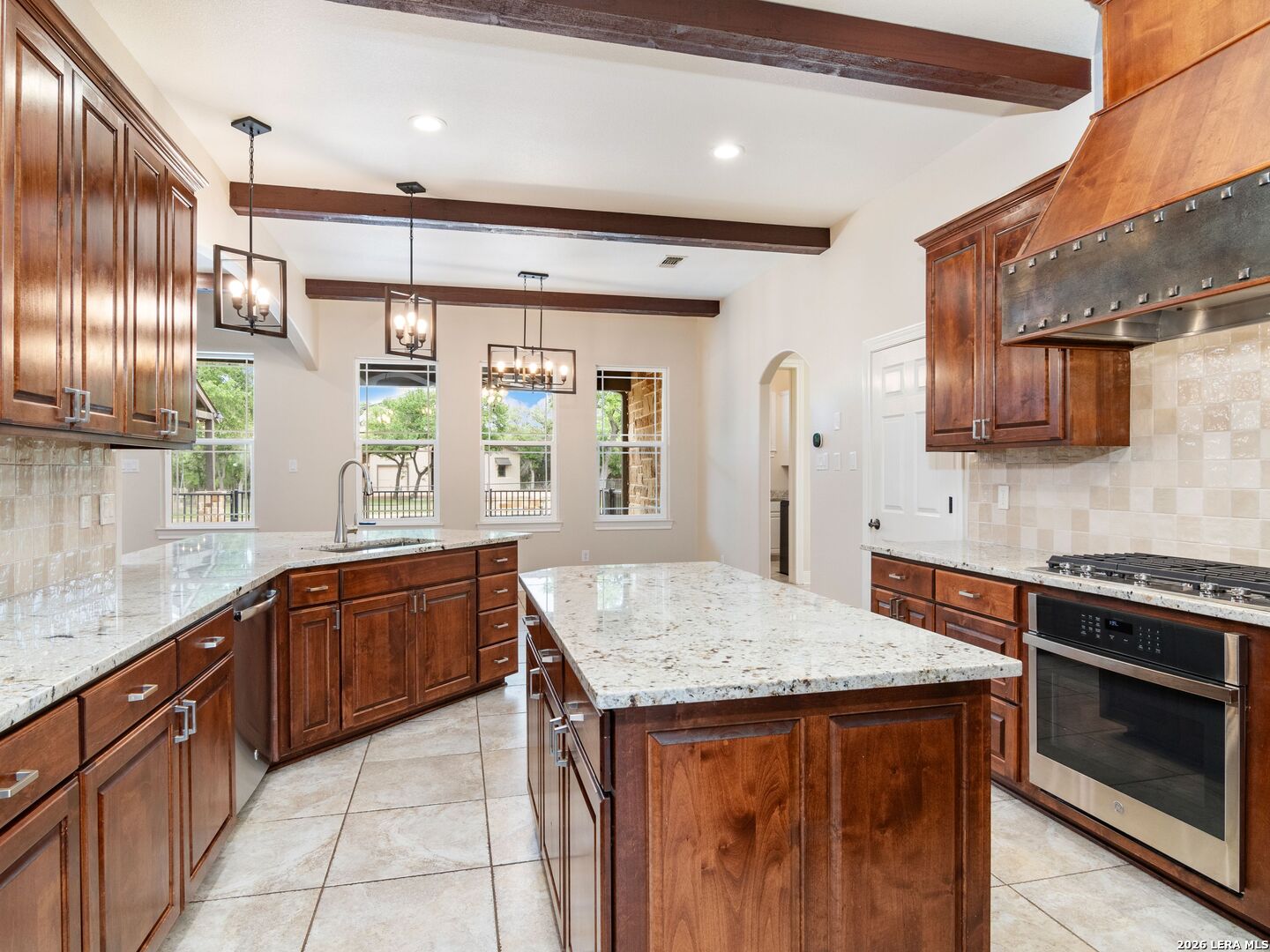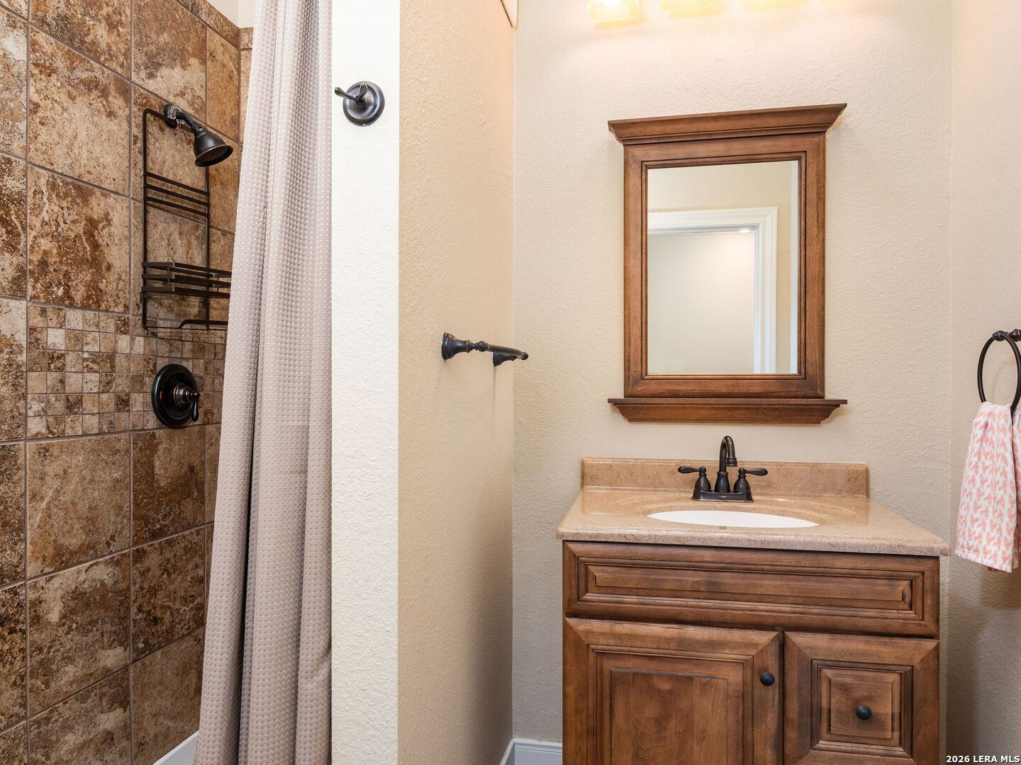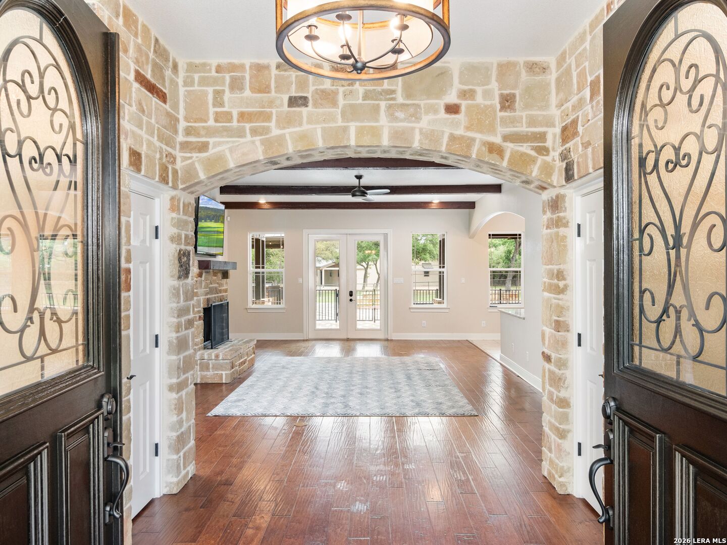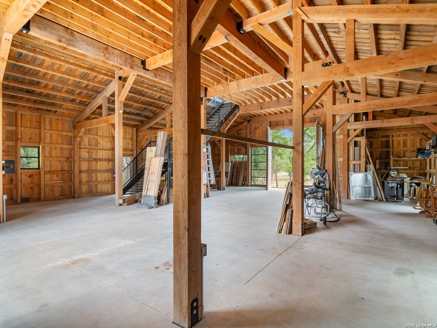 Set behind a gated entry on 5.02 manicured acres, this Hill Country estate offers privacy, scale, and a highly functional layout designed for both everyday living and larger scale entertaining. Mature trees frame the property, giving the home a quiet setting with strong curb appeal, generous outdoor space, and a true sense of arrival. Inside, the home opens with a welcoming foyer accented by distressed hardwood flooring, wraparound windows, and a stately arched stone wall that brings warmth and character to the main living areas. The floor plan is spacious without feeling disconnected, with a great room centered around a stone fireplace and large windows that draw natural light across the interior. The kitchen is designed for both daily use and entertaining, featuring a large island, stainless steel appliances, gas cooking, extensive workspace, and easy connection to dual dining areas. The main level includes a dedicated study, downstairs guest suite, and a privately positioned primary suite with direct access to the pool area. The primary bath offers separate vanities, a Jacuzzi soaking tub, walk in shower, and dual wardrobe closets. The entry from the attached garages has been thoughtfully updated with a custom coffee bar, additional storage, and a separate bank of custom cabinetry finished with granite that ties into the updated kitchen counters. The space includes closet hanging storage for coats or off season clothing, along with extra deep drawers designed for kitchen necessities and daily function. Upstairs, a spacious game room anchors the secondary living area, joined by guest bedrooms and an additional primary style suite with its own sitting area and spa inspired bath. The layout provides flexibility for guests, extended stays, or separate living needs without sacrificing comfort. The outdoor living is a major part of the property. A covered patio overlooks the grounds, while the cabana is built for entertaining with a full outdoor kitchen, Twin Eagles grill, ice maker, refrigerator, fireplace, and bar seating for eight. The resort style pool includes a spillway waterfall and sun lounging deck, creating a private setting for relaxing or hosting. Adjacent to the pool, the former detached garage space was converted in 2021 into a 2 bedroom, 2 bath guesthouse with a full kitchen, custom cabinetry, appliances, and washer and dryer. Another major improvement is the custom timber frame barn by Texas Timber Frames, offering a cement floor, lofted space, 220 amp electricity, and roughed in plumbing for a full bathroom. The barn's main level measures 60 x 48, with a 60 x 24 loft, bringing the total barn square footage to approximately 4,320 square feet. Just minutes from downtown Boerne, this estate delivers acreage, privacy, outdoor living, guest accommodations, and meaningful improvements in one complete setting.