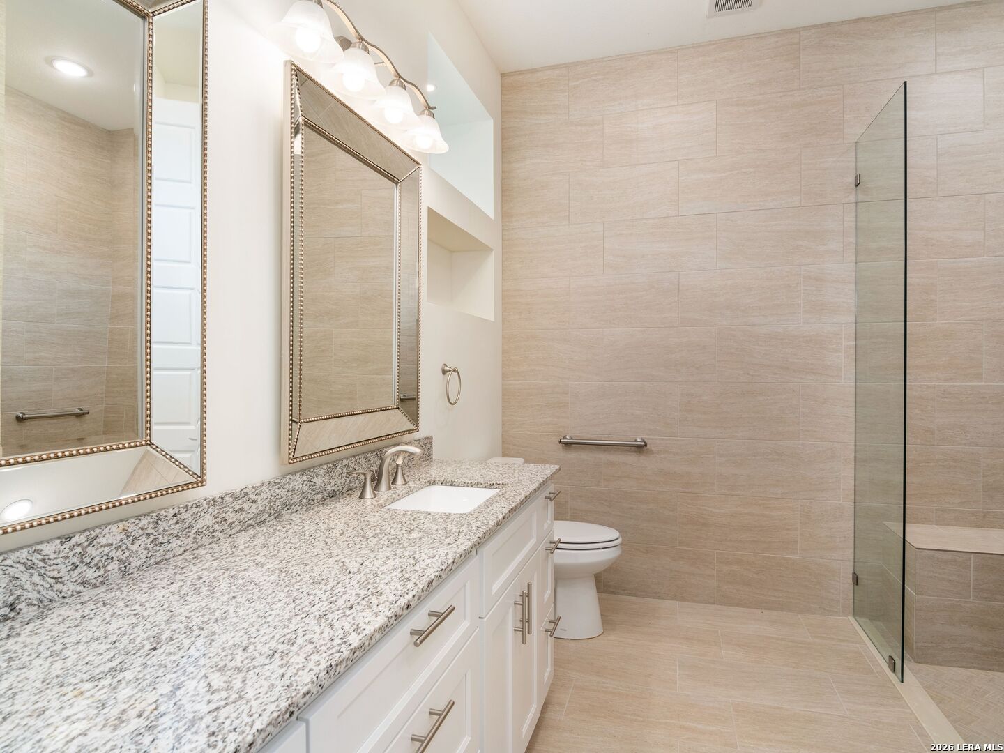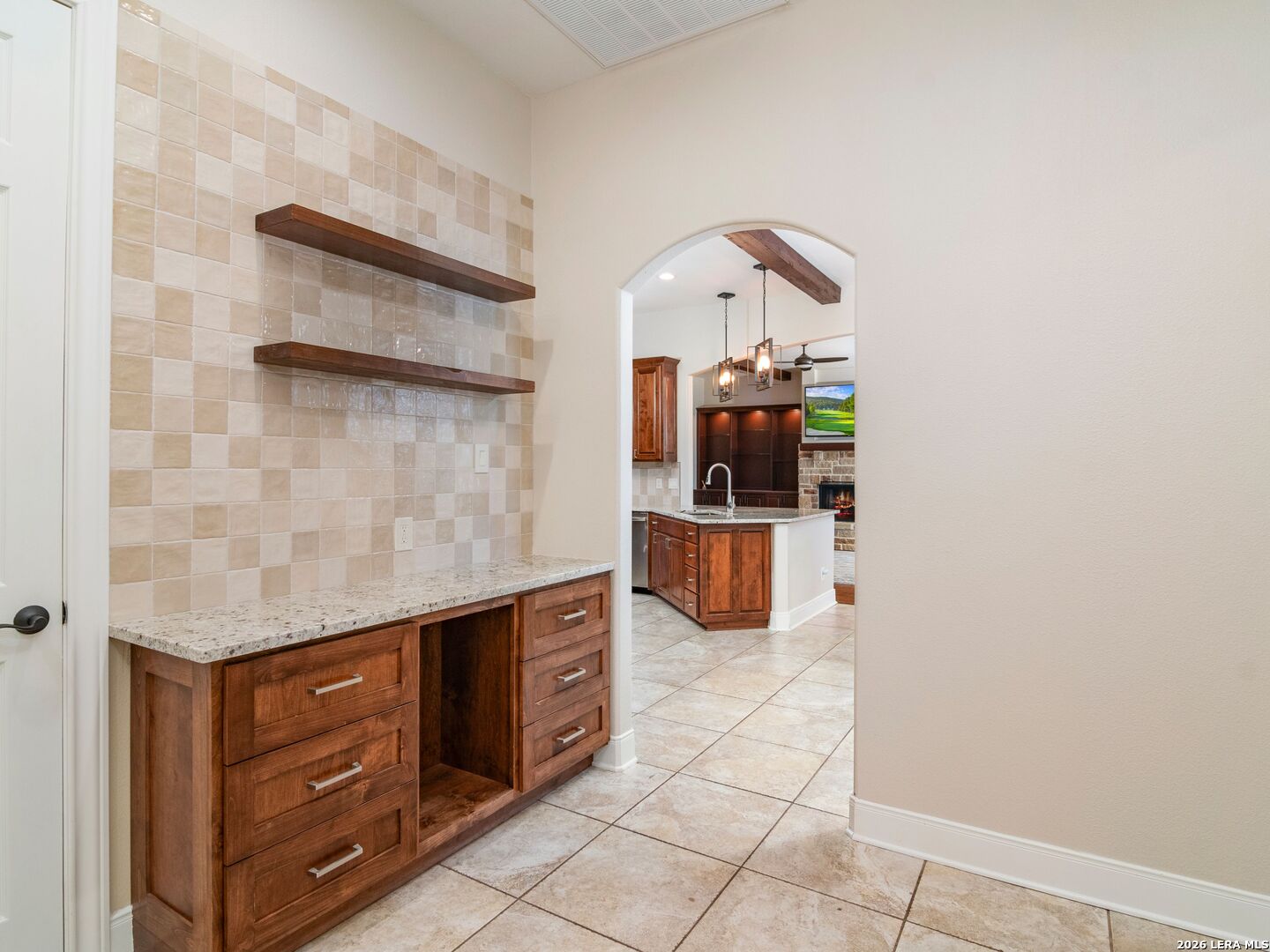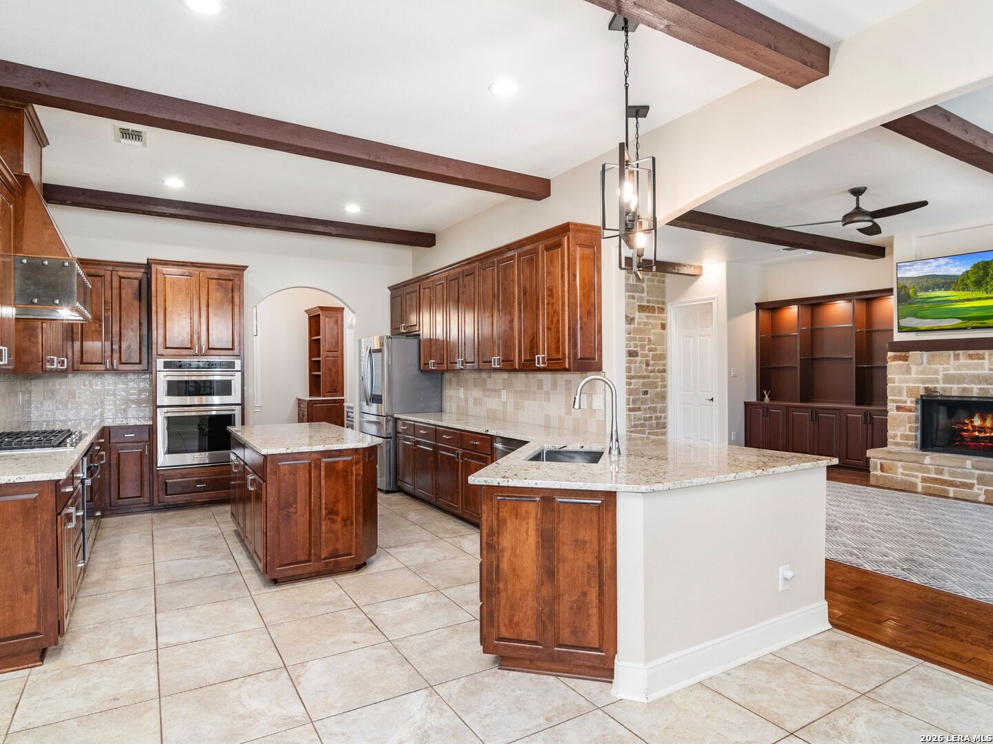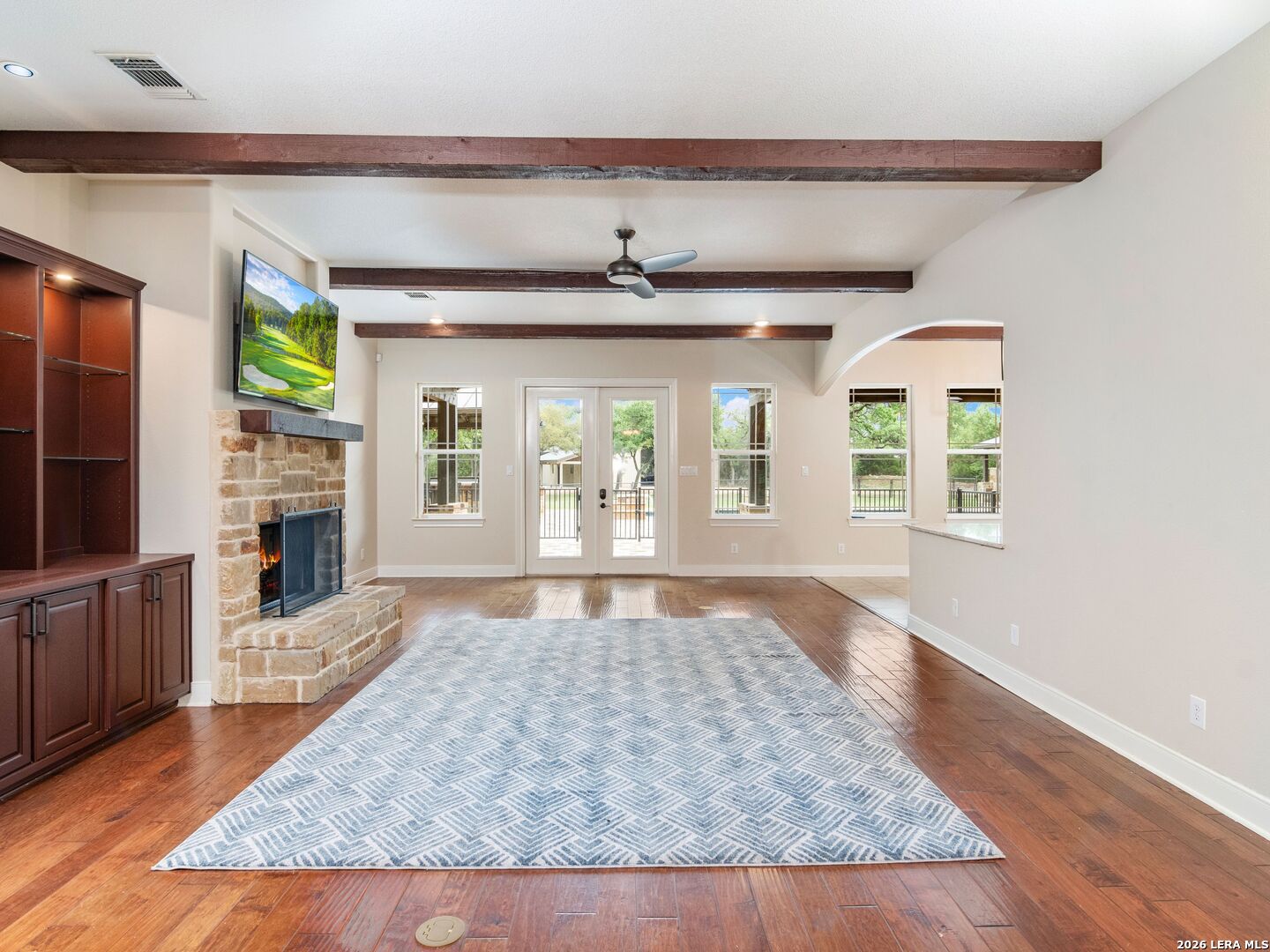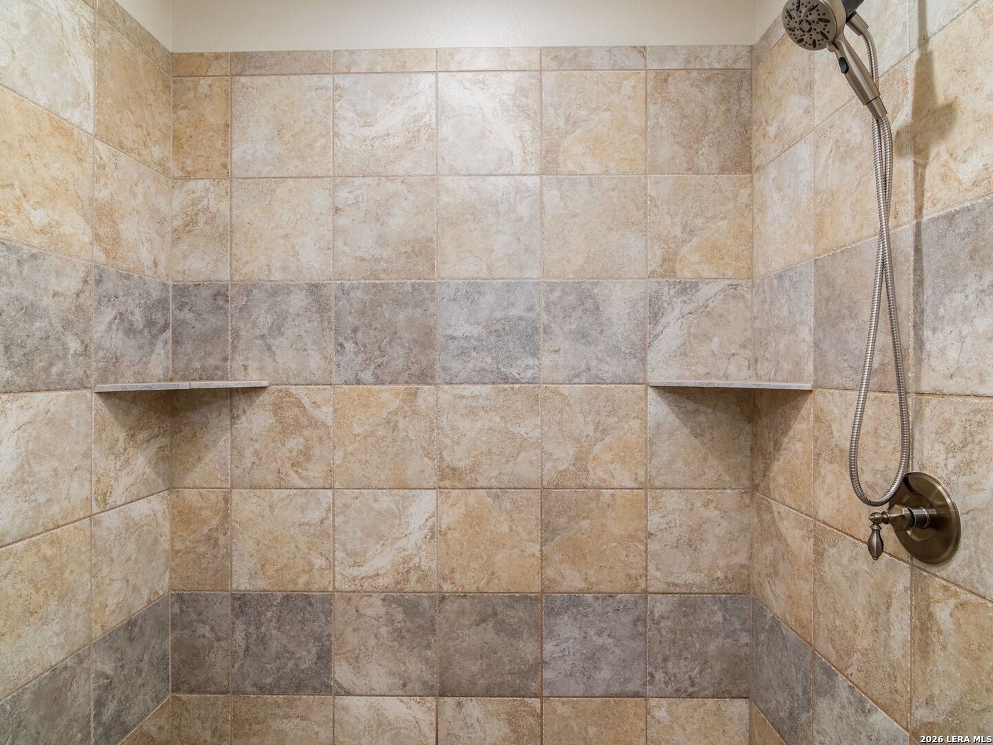 Set behind a gated entry on 5.02 manicured acres, this Hill Country estate offers privacy, scale, and a highly functional layout designed for both everyday living and larger scale entertaining. Mature trees frame the property, giving the home a quiet setting with strong curb appeal, generous outdoor space, and a true sense of arrival. Inside, the home opens with a welcoming foyer accented by distressed hardwood flooring, wraparound windows, and a stately arched stone wall that brings warmth and character to the main living areas. The floor plan is spacious without feeling disconnected, with a great room centered around a stone fireplace and large windows that draw natural light across the interior. The kitchen is designed for both daily use and entertaining, featuring a large island, stainless steel appliances, gas cooking, extensive workspace, and easy connection to dual dining areas. The main level includes a dedicated study, downstairs guest suite, and a privately positioned primary suite with direct access to the pool area. The primary bath offers separate vanities, a Jacuzzi soaking tub, walk in shower, and dual wardrobe closets. The entry from the attached garages has been thoughtfully updated with a custom coffee bar, additional storage, and a separate bank of custom cabinetry finished with granite that ties into the updated kitchen counters. The space includes closet hanging storage for coats or off season clothing, along with extra deep drawers designed for kitchen necessities and daily function. Upstairs, a spacious game room anchors the secondary living area, joined by guest bedrooms and an additional primary style suite with its own sitting area and spa inspired bath. The layout provides flexibility for guests, extended stays, or separate living needs without sacrificing comfort. The outdoor living is a major part of the property. A covered patio overlooks the grounds, while the cabana is built for entertaining with a full outdoor kitchen, Twin Eagles grill, ice maker, refrigerator, fireplace, and bar seating for eight. The resort style pool includes a spillway waterfall and sun lounging deck, creating a private setting for relaxing or hosting. Adjacent to the pool, the former detached garage space was converted in 2021 into a 2 bedroom, 2 bath guesthouse with a full kitchen, custom cabinetry, appliances, and washer and dryer. Another major improvement is the custom timber frame barn by Texas Timber Frames, offering a cement floor, lofted space, 220 amp electricity, and roughed in plumbing for a full bathroom. The barn's main level measures 60 x 48, with a 60 x 24 loft, bringing the total barn square footage to approximately 4,320 square feet. Just minutes from downtown Boerne, this estate delivers acreage, privacy, outdoor living, guest accommodations, and meaningful improvements in one complete setting.