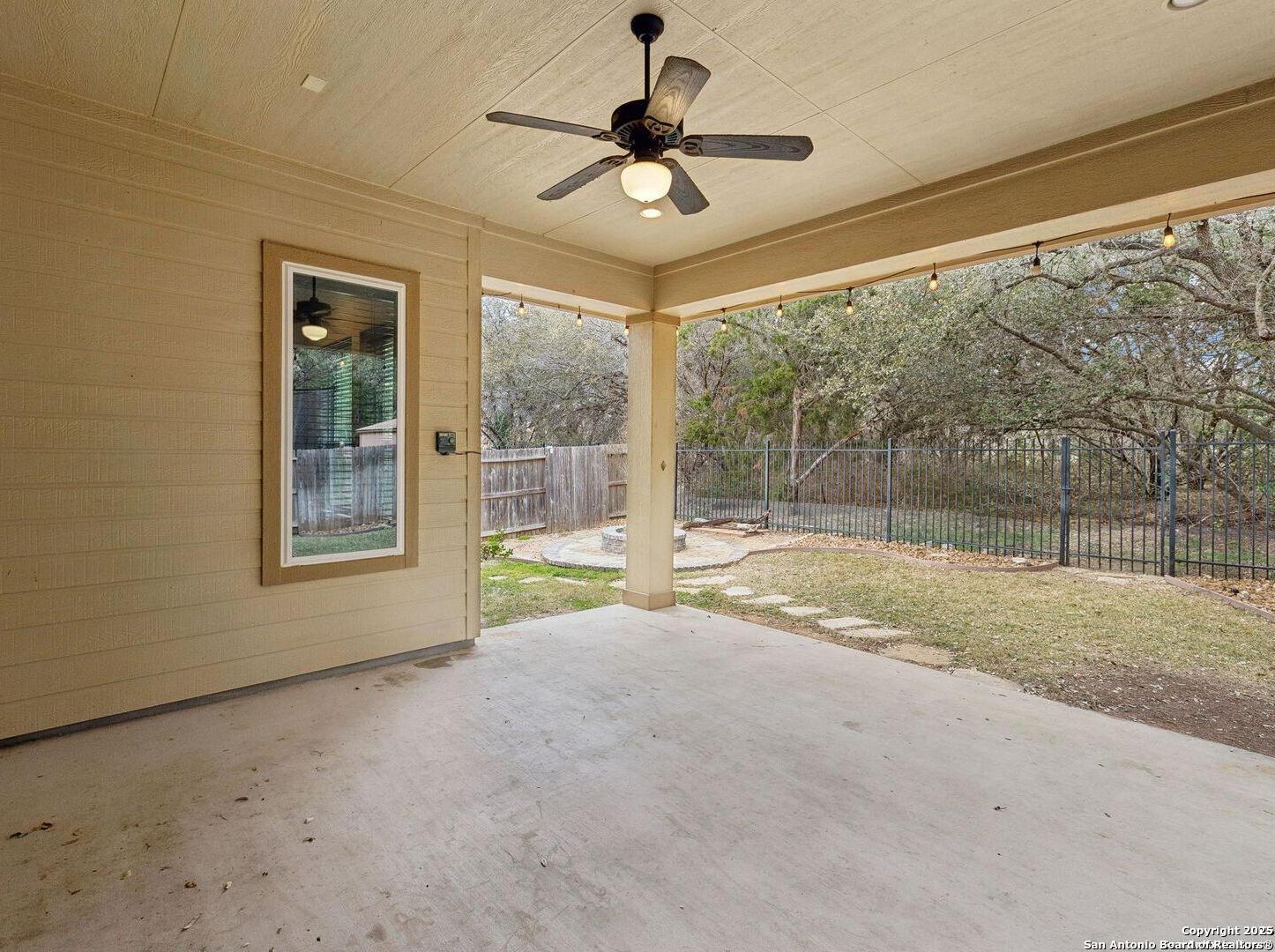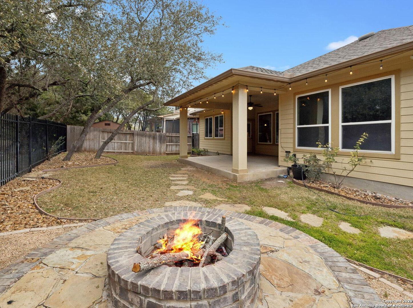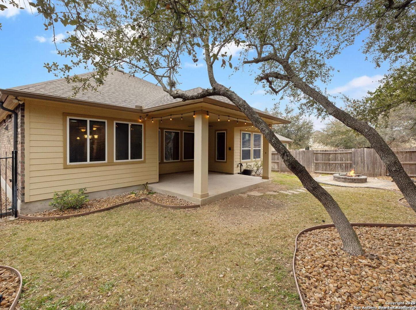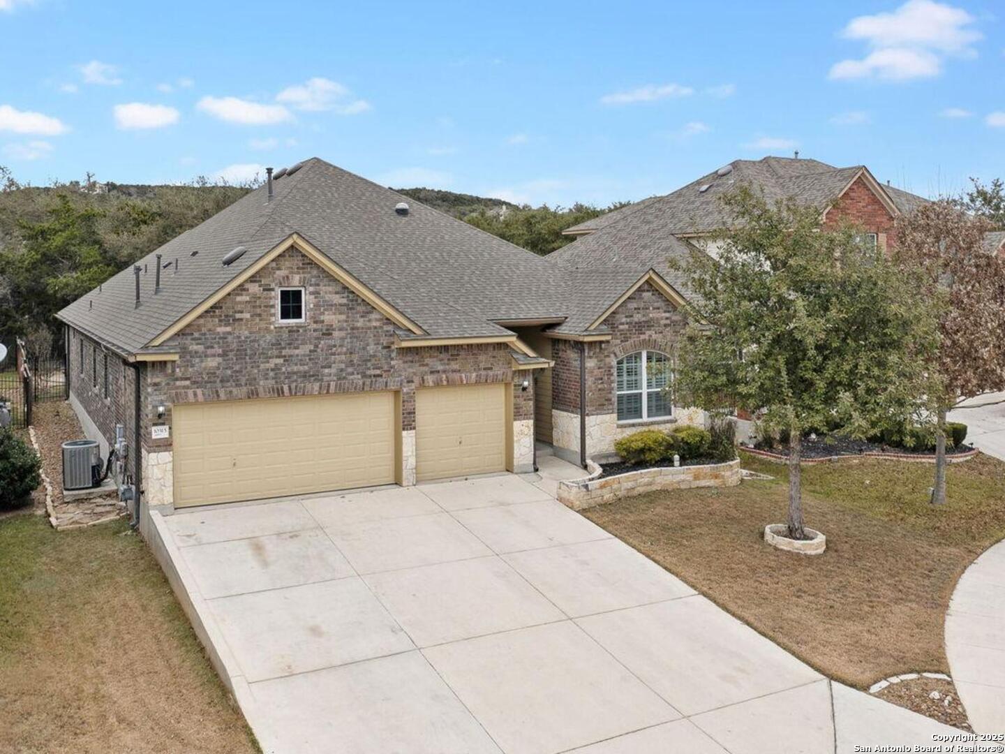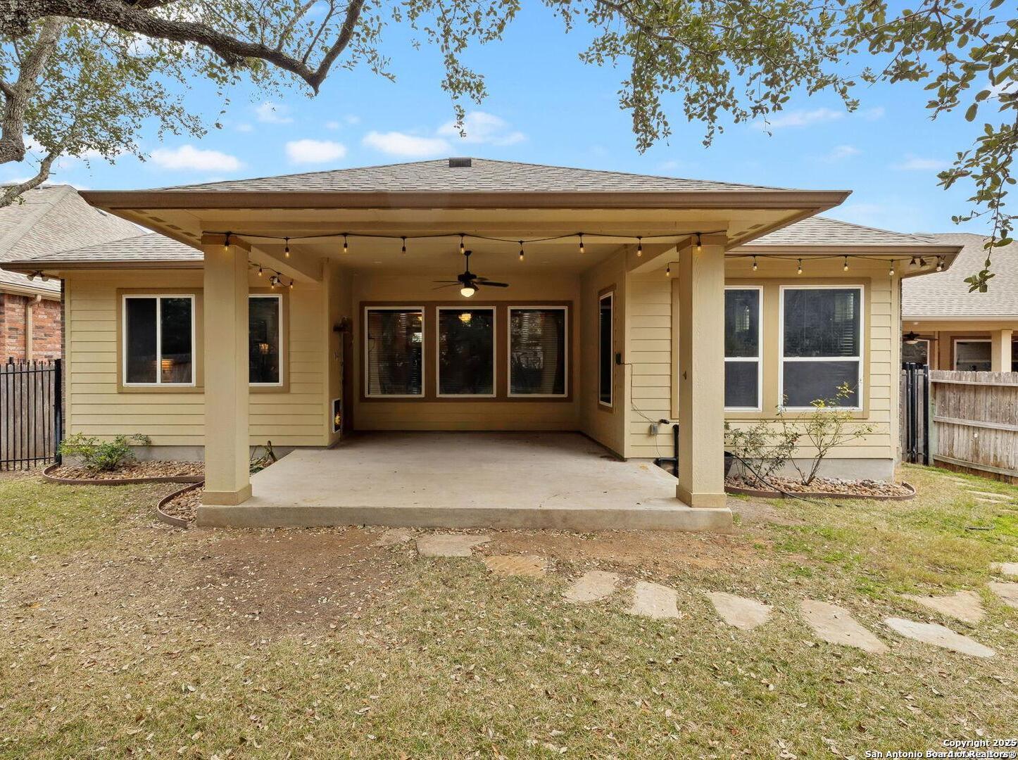 Welcome to 10315 Cima Vista, a stunning single-family home located in the desirable Triana subdivision of Helotes, TX. This exquisite property, built in 2014, offers a perfect blend of modern amenities and timeless elegance. As you step inside, you'll be greeted by a spacious and inviting living area with ceramic tile flooring and large windows that fill the space with natural light. The open-concept layout seamlessly connects the living room, dining area, and kitchen, making it ideal for both entertaining and everyday living. The entire house has been freshly painted, and the bedrooms feature brand new carpet, adding to the home's pristine condition. The kitchen is a chef's dream, featuring magnificent 42' staggered cabinets, exotic granite countertops, a gas cooktop, and a massive workspace. The kitchen also boasts brand new appliances, ensuring you have the latest and best tools for your culinary creations. The owner's retreat is a true sanctuary, accented with a bay window and a spa-like bath. The luxurious bathroom includes a garden tub, a separate shower, and a double vanity, providing a perfect place to unwind after a long day. This home boasts four spacious bedrooms and three full bathrooms, offering plenty of space for family and guests. Step outside to the large, covered patio, which backs to a greenbelt for extra privacy. The backyard is beautifully landscaped and includes a fire pit and a gas line, making it an ideal spot for outdoor gatherings and relaxation. The property also features media connections on the patio and in the family room, perfect for entertainment. Additionally, there are two sprinkler systems to keep the lawn lush and green. Additional features of this home include a recently replaced roof, a unique floor plan for the subdivision, an air exchanger unit attached to the HVAC system, and solar tube lighting. This home is extremely energy efficient, resulting in low energy bills. The property also includes a three-car garage with overhead storage and epoxy flooring, providing ample space for vehicles and storage. The property is situated on a 7,760 sq ft lot in a cul-de-sac and offers a total interior livable area of 2,689 sq ft. Located in the highly rated Northside Independent School District, this home is close to Los Reyes Elementary School, Garcia Middle School, and O'Connor High School. With its prime location, exceptional features, and beautiful design, 10315 Cima Vista is the perfect choice for your next home.