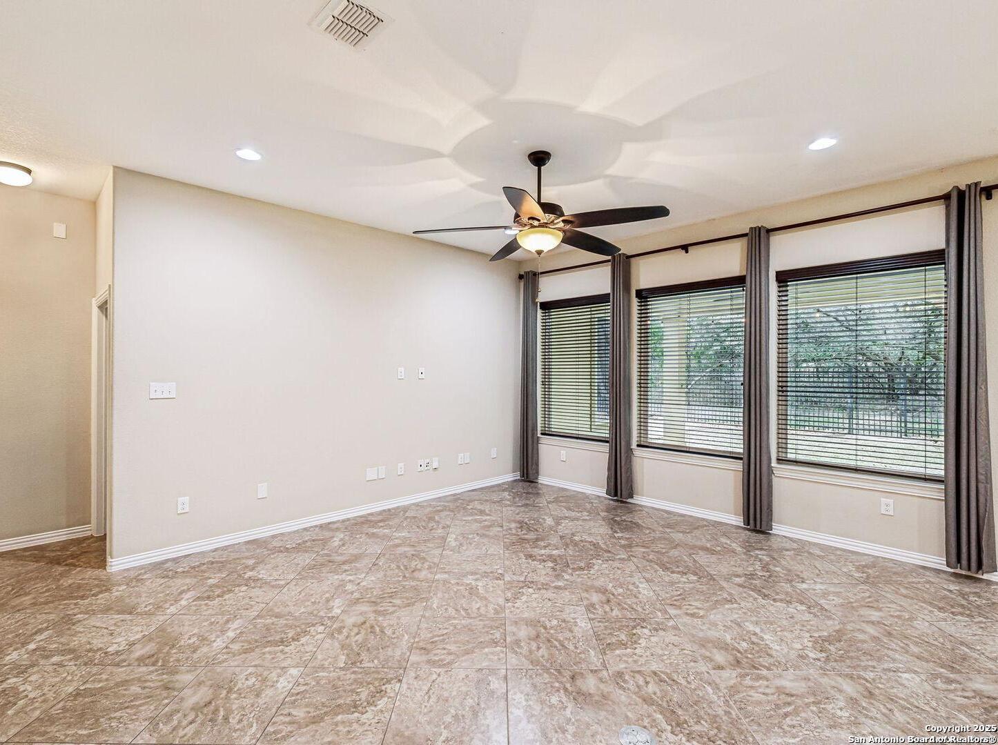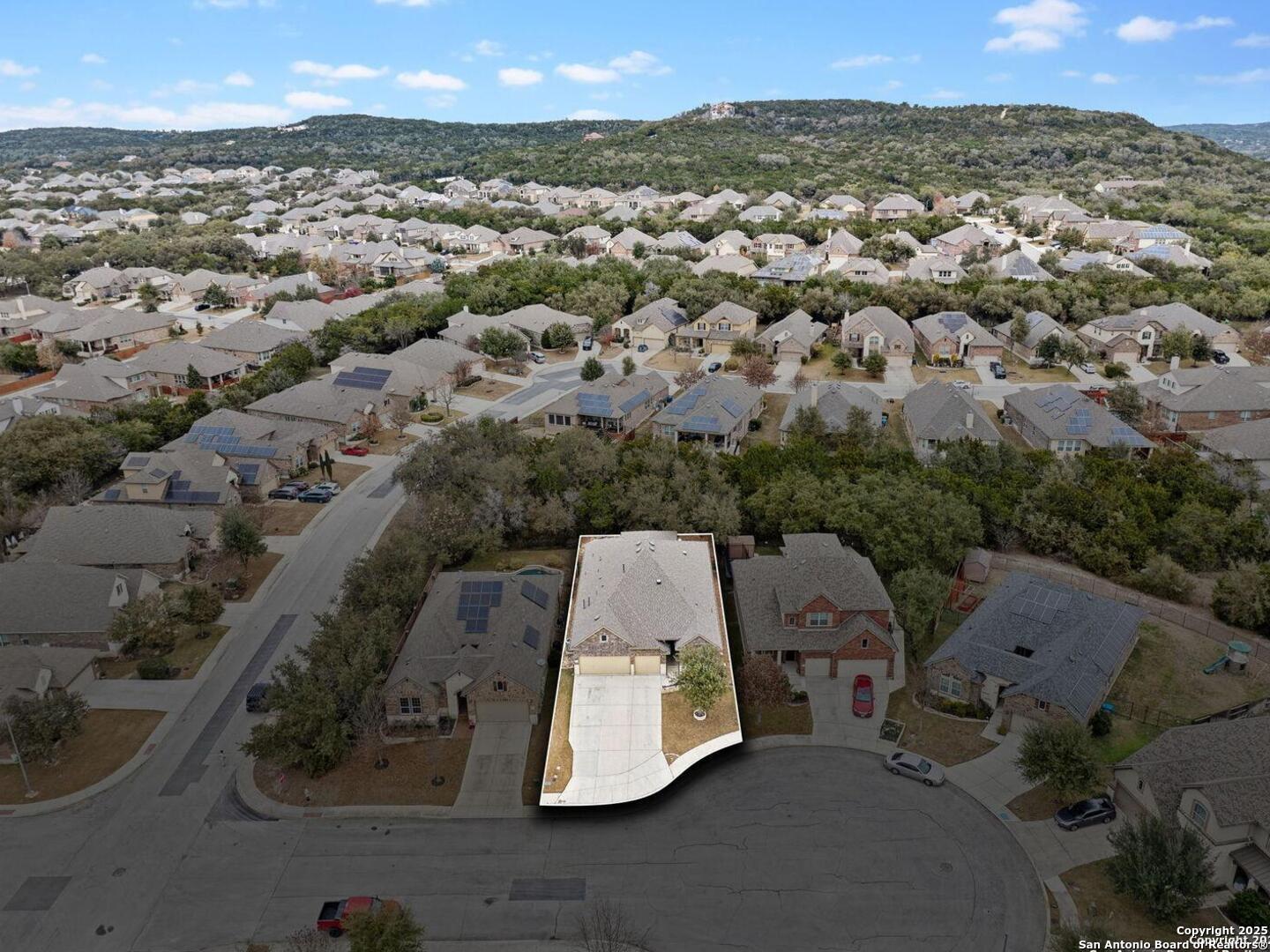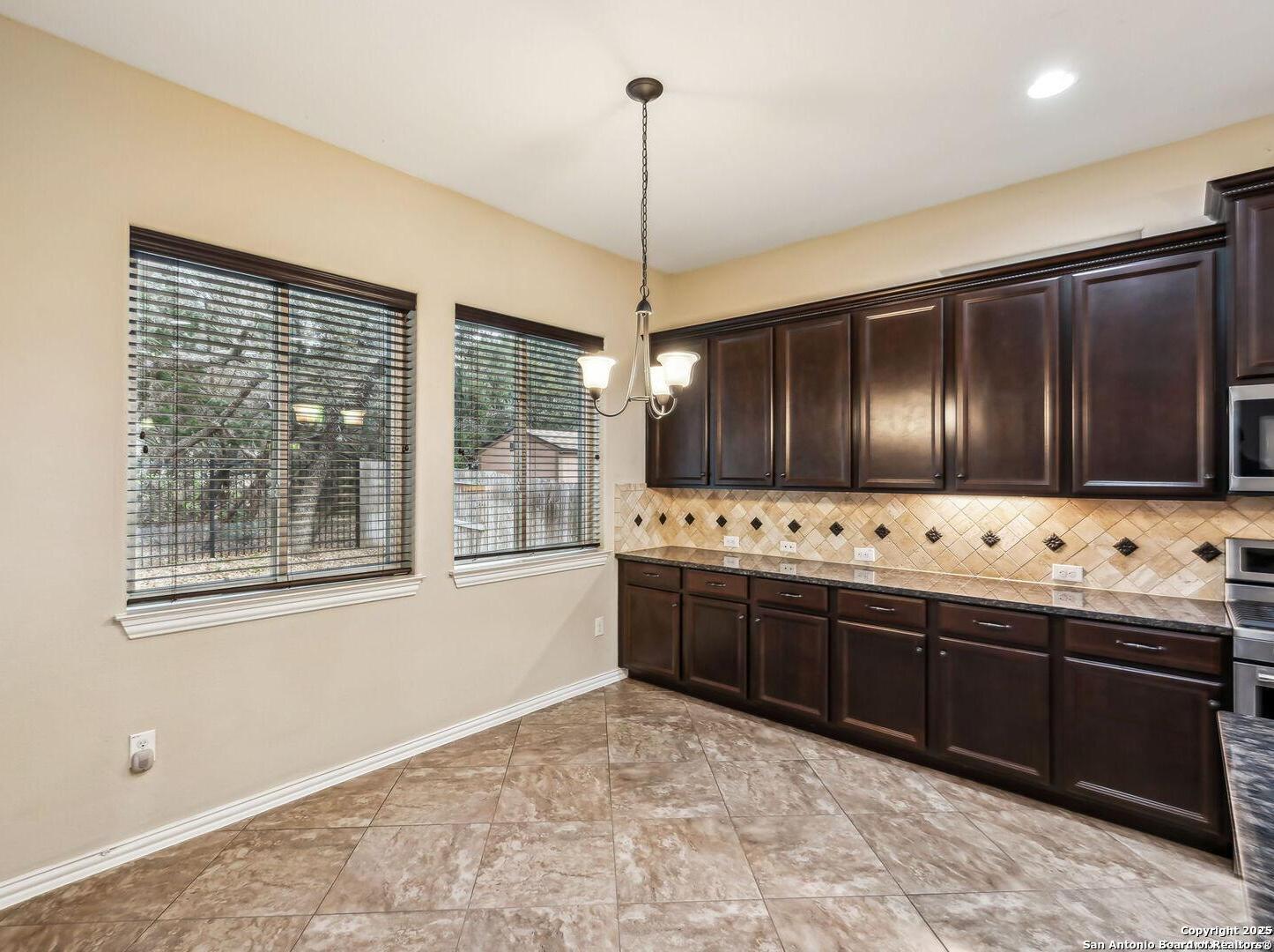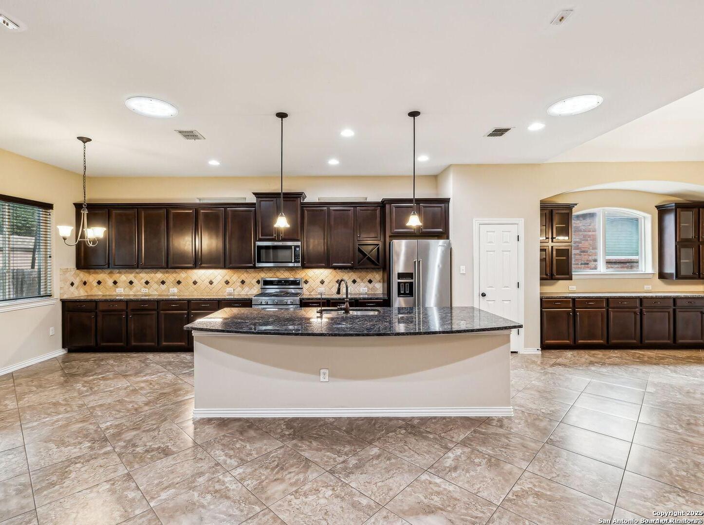 Welcome to 10315 Cima Vista, a stunning single-family home located in the desirable Triana subdivision of Helotes, TX. This exquisite property, built in 2014, offers a perfect blend of modern amenities and timeless elegance. As you step inside, you'll be greeted by a spacious and inviting living area with ceramic tile flooring and large windows that fill the space with natural light. The open-concept layout seamlessly connects the living room, dining area, and kitchen, making it ideal for both entertaining and everyday living. The entire house has been freshly painted, and the bedrooms feature brand new carpet, adding to the home's pristine condition. The kitchen is a chef's dream, featuring magnificent 42' staggered cabinets, exotic granite countertops, a gas cooktop, and a massive workspace. The kitchen also boasts brand new appliances, ensuring you have the latest and best tools for your culinary creations. The owner's retreat is a true sanctuary, accented with a bay window and a spa-like bath. The luxurious bathroom includes a garden tub, a separate shower, and a double vanity, providing a perfect place to unwind after a long day. This home boasts four spacious bedrooms and three full bathrooms, offering plenty of space for family and guests. Step outside to the large, covered patio, which backs to a greenbelt for extra privacy. The backyard is beautifully landscaped and includes a fire pit and a gas line, making it an ideal spot for outdoor gatherings and relaxation. The property also features media connections on the patio and in the family room, perfect for entertainment. Additionally, there are two sprinkler systems to keep the lawn lush and green. Additional features of this home include a recently replaced roof, a unique floor plan for the subdivision, an air exchanger unit attached to the HVAC system, and solar tube lighting. This home is extremely energy efficient, resulting in low energy bills. The property also includes a three-car garage with overhead storage and epoxy flooring, providing ample space for vehicles and storage. The property is situated on a 7,760 sq ft lot in a cul-de-sac and offers a total interior livable area of 2,689 sq ft. Located in the highly rated Northside Independent School District, this home is close to Los Reyes Elementary School, Garcia Middle School, and O'Connor High School. With its prime location, exceptional features, and beautiful design, 10315 Cima Vista is the perfect choice for your next home.