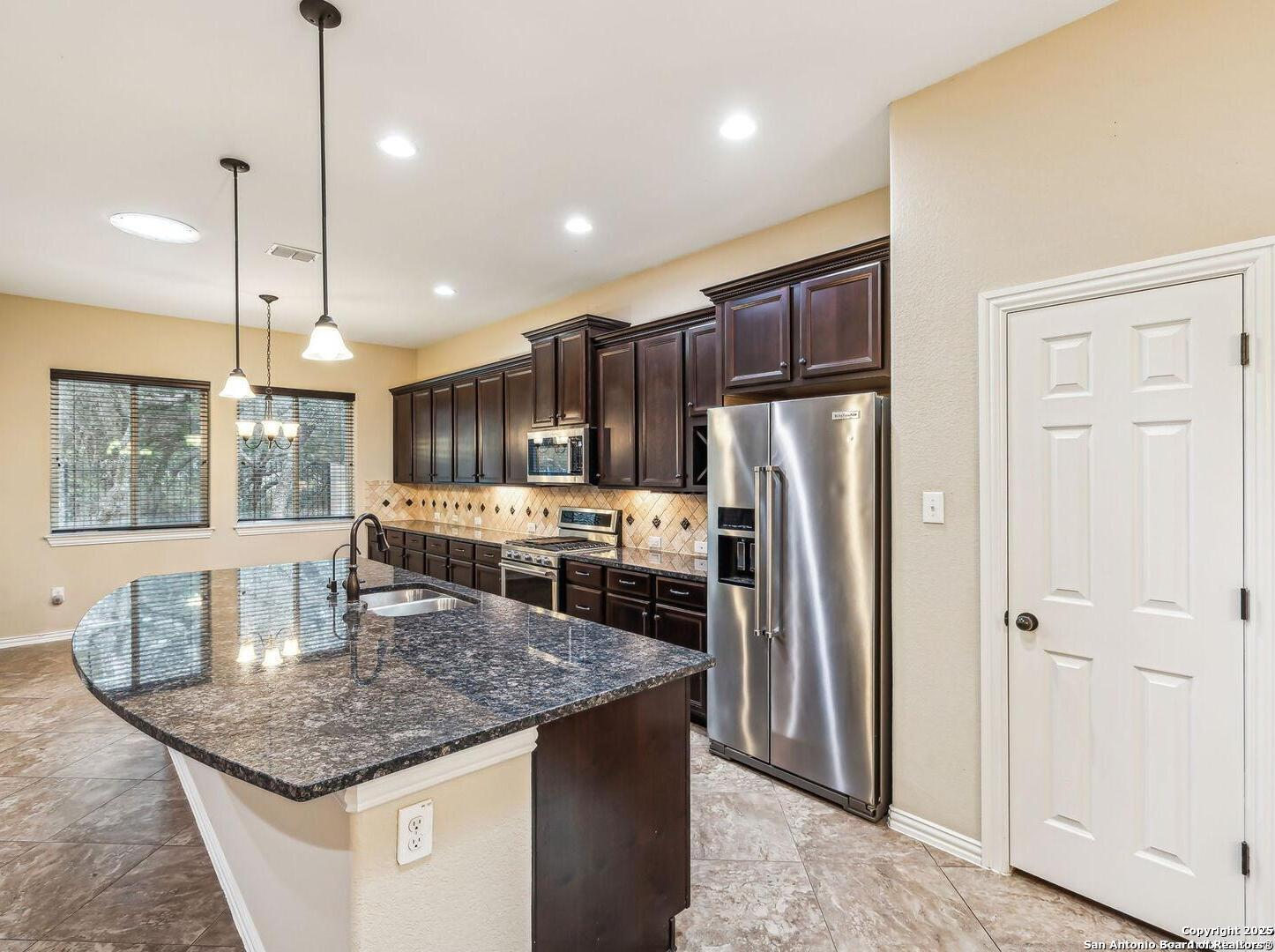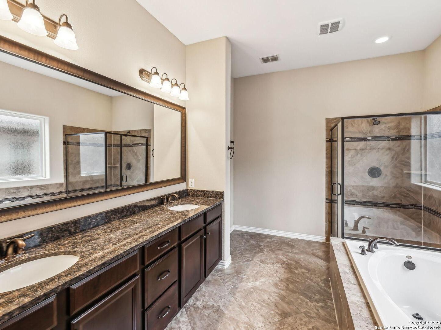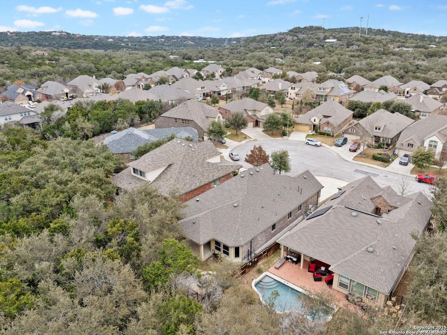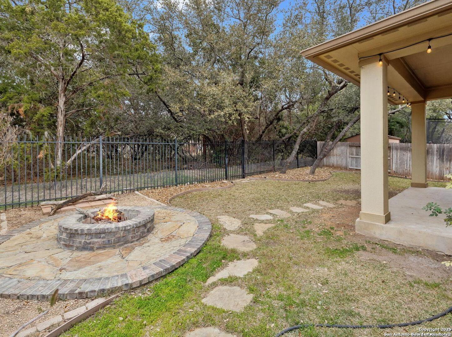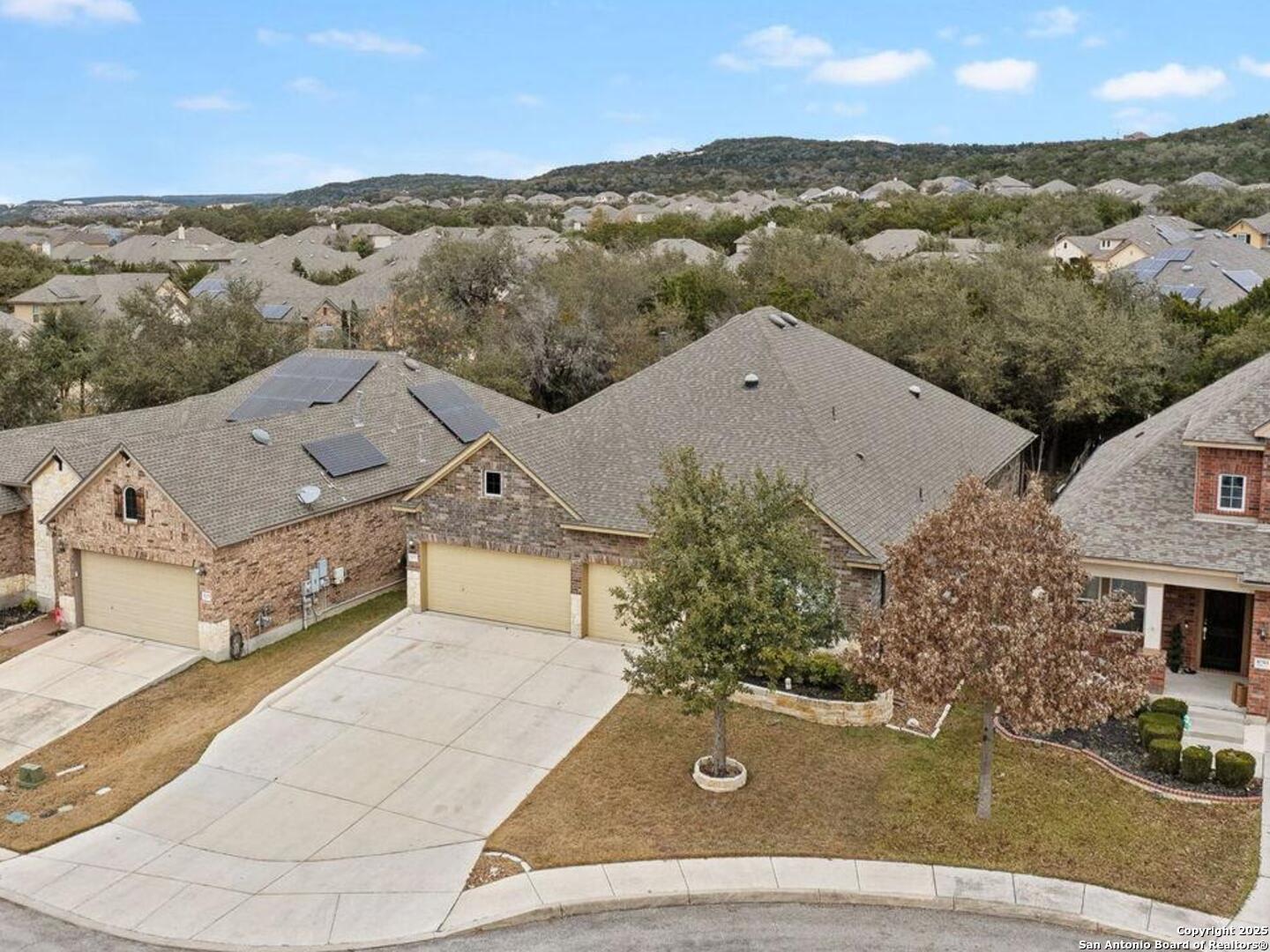 Welcome to 10315 Cima Vista, a stunning single-family home located in the desirable Triana subdivision of Helotes, TX. This exquisite property, built in 2014, offers a perfect blend of modern amenities and timeless elegance. As you step inside, you'll be greeted by a spacious and inviting living area with ceramic tile flooring and large windows that fill the space with natural light. The open-concept layout seamlessly connects the living room, dining area, and kitchen, making it ideal for both entertaining and everyday living. The entire house has been freshly painted, and the bedrooms feature brand new carpet, adding to the home's pristine condition. The kitchen is a chef's dream, featuring magnificent 42' staggered cabinets, exotic granite countertops, a gas cooktop, and a massive workspace. The kitchen also boasts brand new appliances, ensuring you have the latest and best tools for your culinary creations. The owner's retreat is a true sanctuary, accented with a bay window and a spa-like bath. The luxurious bathroom includes a garden tub, a separate shower, and a double vanity, providing a perfect place to unwind after a long day. This home boasts four spacious bedrooms and three full bathrooms, offering plenty of space for family and guests. Step outside to the large, covered patio, which backs to a greenbelt for extra privacy. The backyard is beautifully landscaped and includes a fire pit and a gas line, making it an ideal spot for outdoor gatherings and relaxation. The property also features media connections on the patio and in the family room, perfect for entertainment. Additionally, there are two sprinkler systems to keep the lawn lush and green. Additional features of this home include a recently replaced roof, a unique floor plan for the subdivision, an air exchanger unit attached to the HVAC system, and solar tube lighting. This home is extremely energy efficient, resulting in low energy bills. The property also includes a three-car garage with overhead storage and epoxy flooring, providing ample space for vehicles and storage. The property is situated on a 7,760 sq ft lot in a cul-de-sac and offers a total interior livable area of 2,689 sq ft. Located in the highly rated Northside Independent School District, this home is close to Los Reyes Elementary School, Garcia Middle School, and O'Connor High School. With its prime location, exceptional features, and beautiful design, 10315 Cima Vista is the perfect choice for your next home.