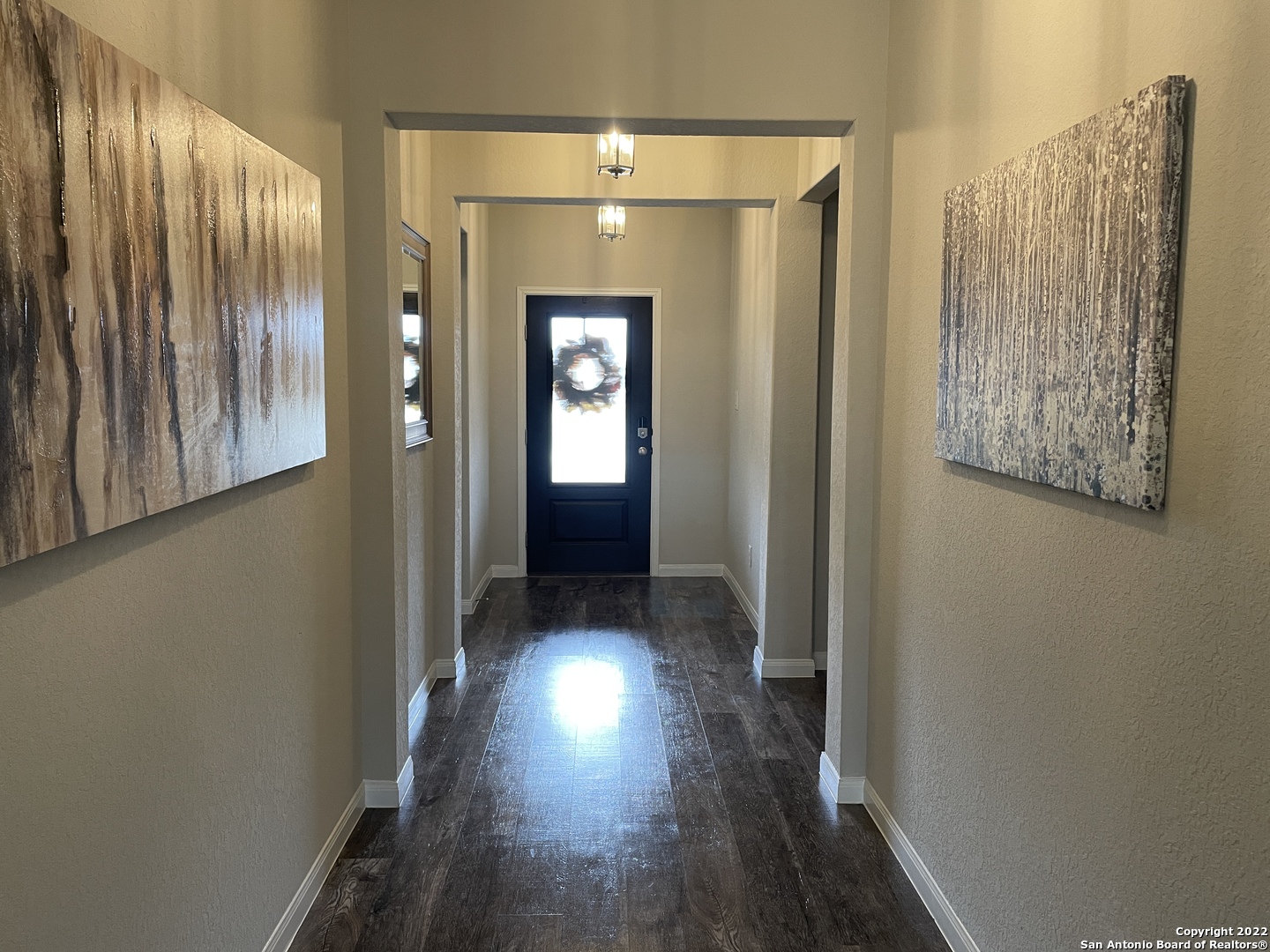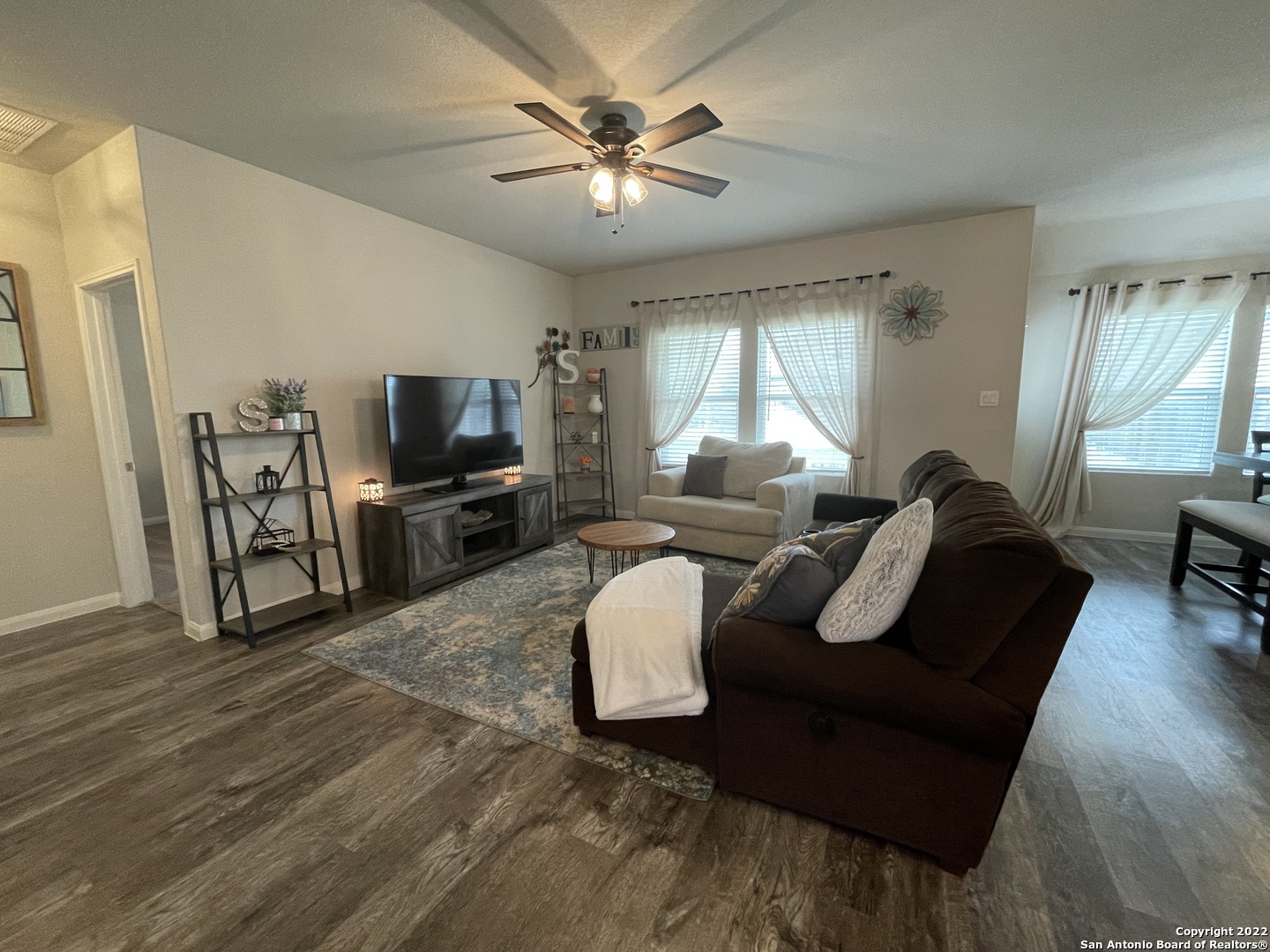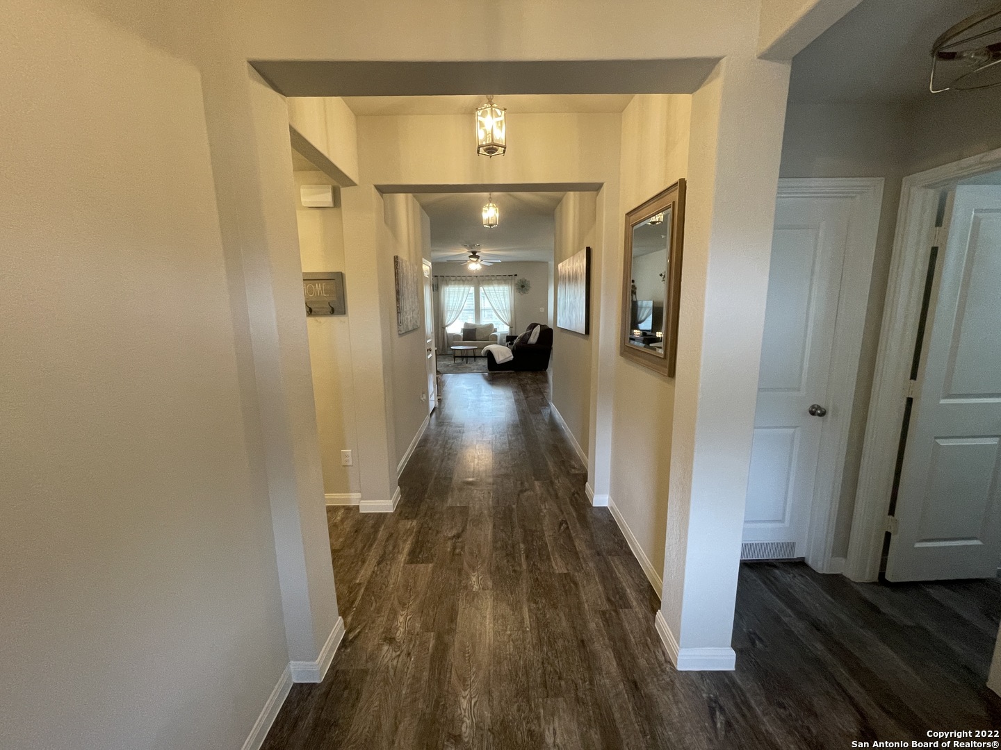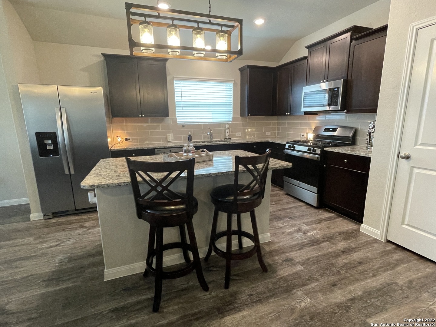 Beautiful like new single-story home located in the highly desirable, gated community of Potranco Run. This 4 bedroom, 2 bath home features an open floor plan, high ceilings, spacious living area and upgraded light fixtures throughout. The kitchen comes complete with 42" cabinets, a kitchen island, stainless steel appliances, gas cooking stove, and granite countertops. The master suite is split from the other bedrooms for privacy and boasts a large walk-in closet, walk-in shower, and double vanities. The secondary bedrooms are of ample size. This home comes equipped with a tankless water heater, sprinkler system, and pre plumbed for a water softener. The sizeable backyard features a covered patio making it ideal for gatherings with friends and loved ones. Conveniently located near schools, brand new HEB, Hwy 211, shopping, and Lackland Air Force Base. Neighborhood amenities include a pool, park/playground, and walking/jogging trails. Schedule your showing today!