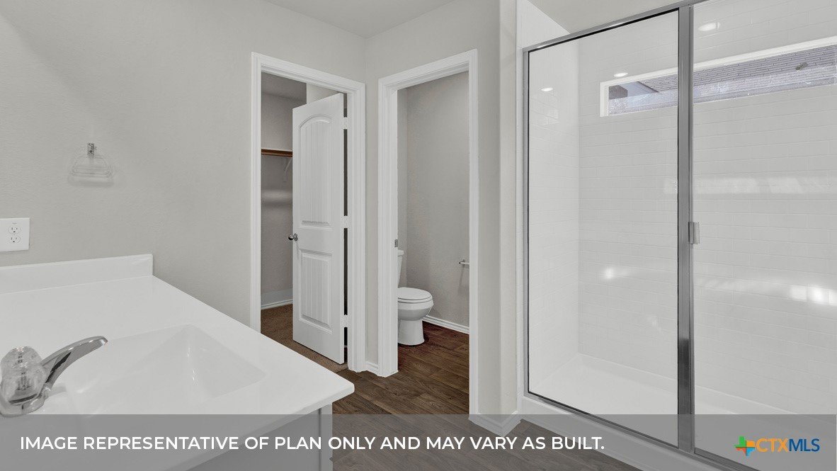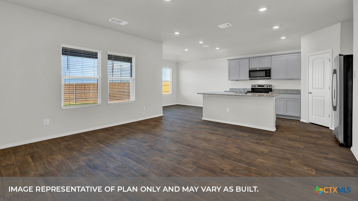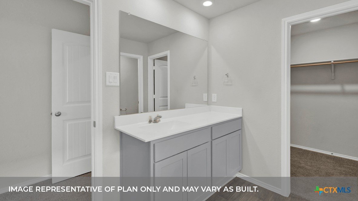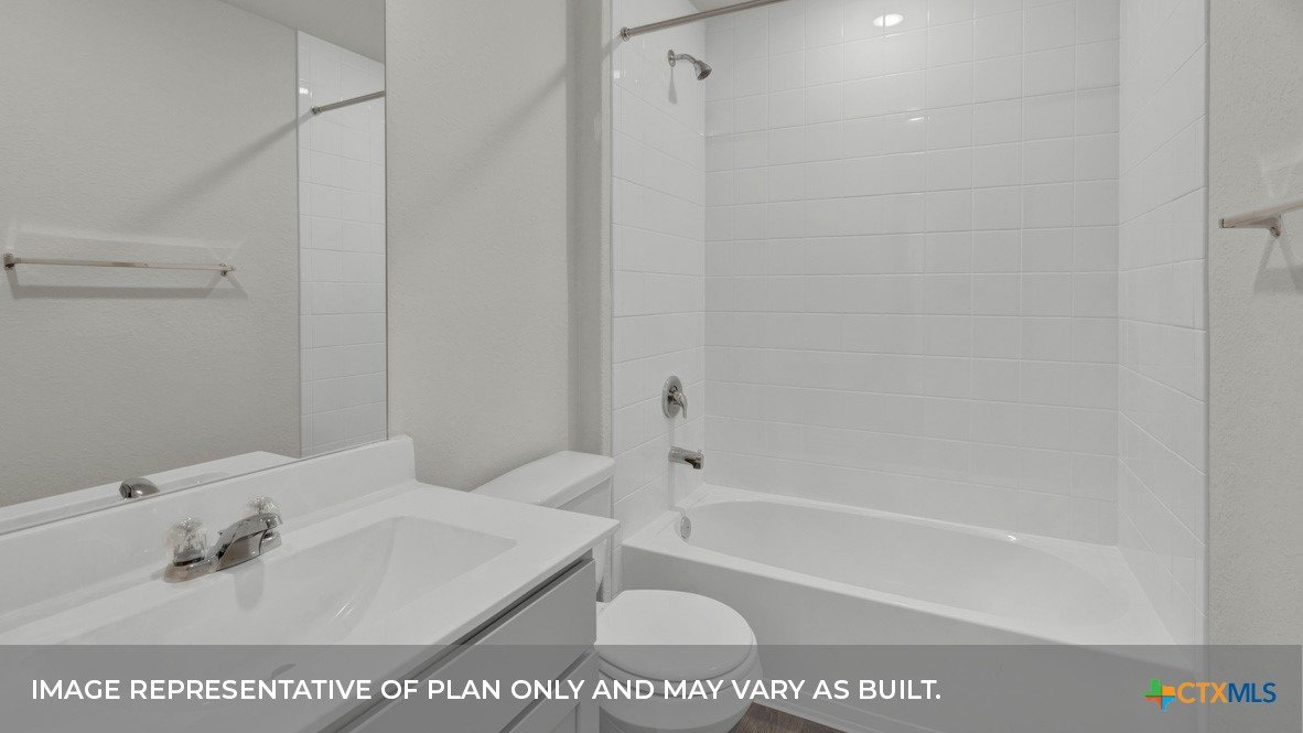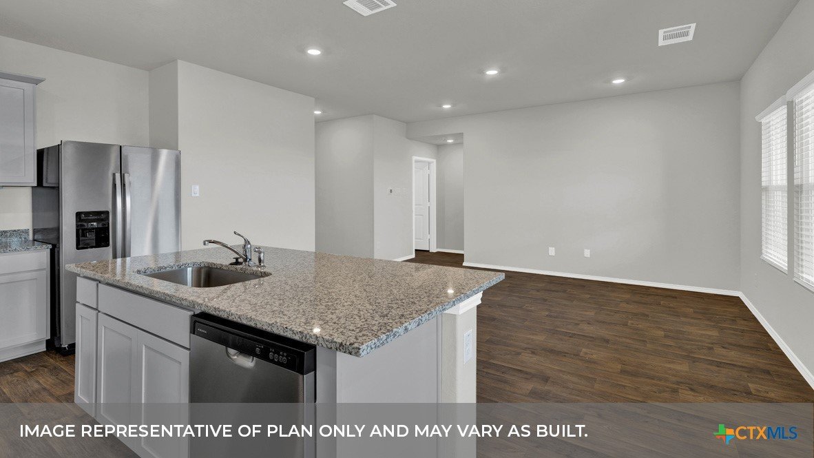 MOVE IN READY! NAVARRO ISD. Bellvue is one of our one-story floorplans featured at our Swenson Heights community in Seguin, Texas. This home is perfect for smaller families or homeowners looking to downsize. Featuring 3 bedrooms and 2 bathrooms, this home also includes a 2-car garage all within 1,407 square feet of living space. Our homes in Swenson Heights feature farmhouse exteriors. Stepping inside the home from the covered front porch, you will find a short hallway that leads to the secondary bedrooms and bathroom. Bathroom 2 includes a tub/shower combination, and both bedrooms include a walk closet with shelving. Whether you use these rooms for an office, child’s room or guest room, there is amble space for the entire family. The living area is an open concept design, so you are always close to the action in the family room, kitchen or dining area. The kitchen features an island with an undermount sink facing the family room, stainless steel appliances, granite countertops, corner pantry closet and 36” upper cabinets. Enjoy the natural light with four rear windows looking out to the backyard. The primary bedroom is off the family room and includes its own attached bathroom, making the start of your day a seamless step from sleep to your morning routine. Enjoy the 5’ walk in shower, vanity and separate door to the toilet for privacy. A walk-in closet with generous shelving is connected to the bathroom. The utility room is outside the primary bedroom, allowing for the laundry chores to be completed with ease. The Bellvue includes vinyl flooring throughout the common areas of the home, and carpet in the bedrooms. All our new homes feature a covered back patio, full sod, an irrigation system in the front and back yard, and a 6’ privacy fence around the back yard. This home includes our America’s Smart Home base package, which includes the Amazon Echo Pop, Front Doorbell, Front Door Deadbolt Lock, Home Hub, Thermostat, and Deako® Smart Switches.