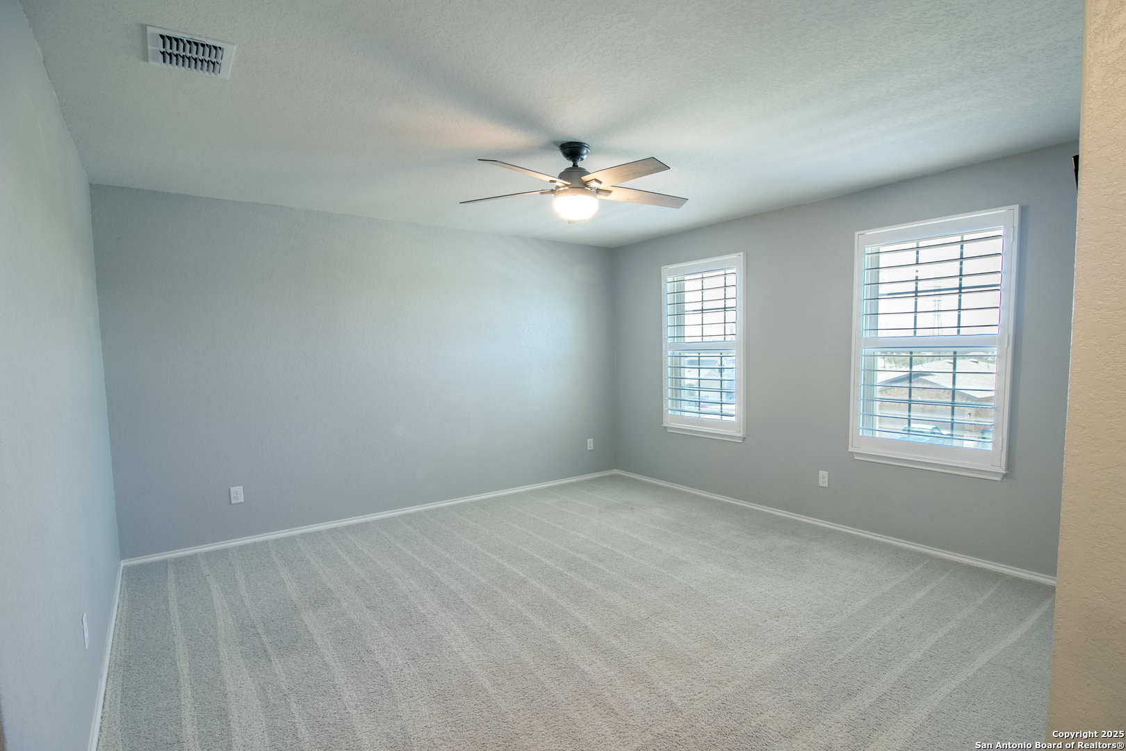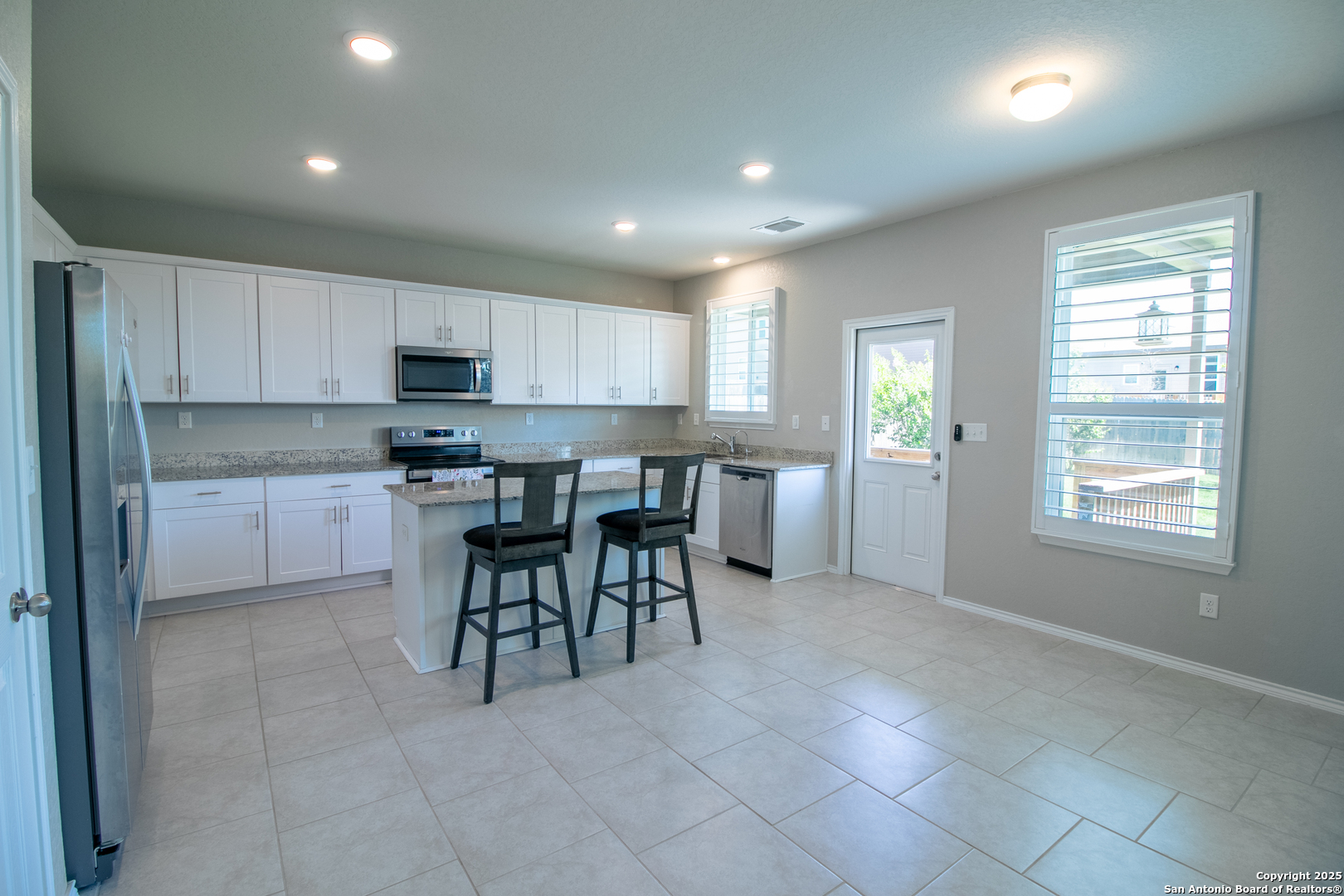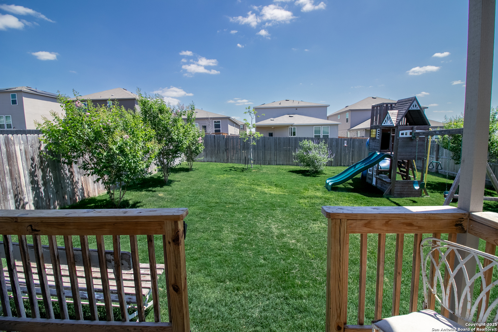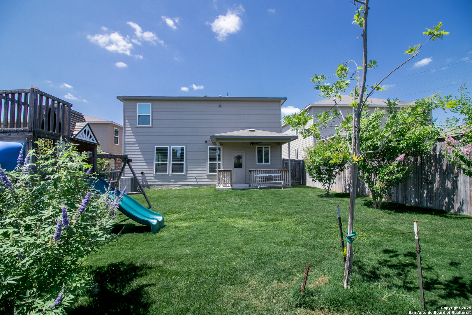 Welcome home to this beautifully maintained 4 bedroom 3 bath home located on a cul-de-sac lot at the front of the Cinco Lakes subdivision! This two story brick home has great curb appeal & fresh landscaping. The first level features an office w/french door access. You are greeted by an open floor plan that leads to the dining, family room & kitchen. Ceramic tiles throughout the main living along with attractive plantation shutters (2022)! The kitchen offers granite countertops, stainless steel appliances, reverse osmosis water filtration system (2022), plenty of cabinetry storage space & access to the back yard! First level guest bedroom w/full bath! The second level primary suite is extremely spacious, oversized walk-in shower, double vanities and walk-in closet. The second level also offers a large secondary living that could be perfect for a game room, two great sized secondary bedrooms & full bath. The backyard has a covered patio, play set and beautiful trees outlining the perimeter! Additional features include water softener (2022), 4 flat screen TVs convey, ceiling fans throughout (excluding primary), Sherman Williams paint throughout (excluding secondary bathrooms & laundry). Two car garage w/ garage door opener (2022), garage attic exhaust fan, 3 garage fans and work bench! Separate laundry room with washer and dryer! Neighborhood amenities include: Pool, Playground, Hiking Trails, Fishing at pond. Easy access to 1604, Hwy 90, & Lackland Base! 1 Dog allowed on case-by-case basis. 40lb maximum and must be older than 1 year.