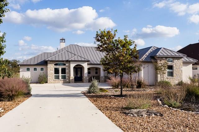 This light bright immaculate home has views of the golf course, a pond, and the hill country. The kitchen includes expansive granite counters, tile back splash, Bosch appliances, farm sink, lots of cabinets and walk-in pantry. Just off kitchen is an alcove for a drop zone/desk. The great room has a gas fire place and overlooks the covered back porch with east facing views. The roomy master suite has a seating area and a door leading out to the patio. The en-suite offers a soaking tub, huge shower, two vanities, and large closet. On the opposite end of the house from the master suite are two guest bedrooms both with roomy closets and a light cozy feel. Other amenities include a study, wet bar and large laundry room. The 3-car garage has an epoxy floor and workshop area. Custom and Lovely!