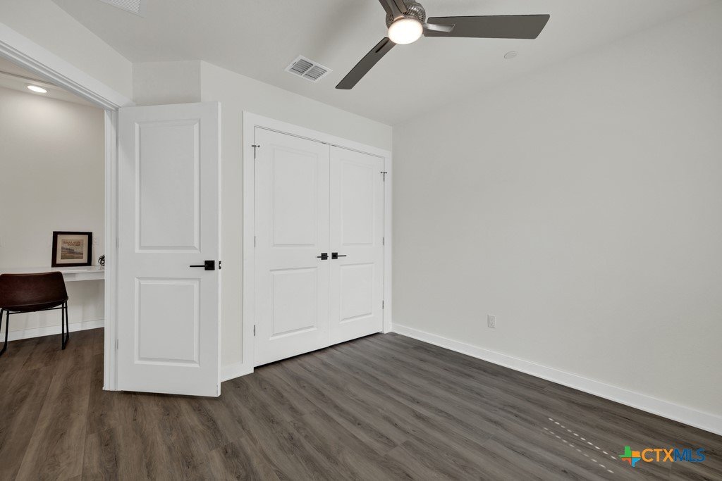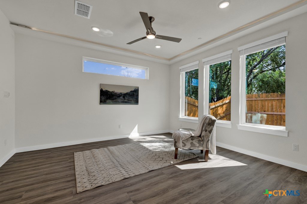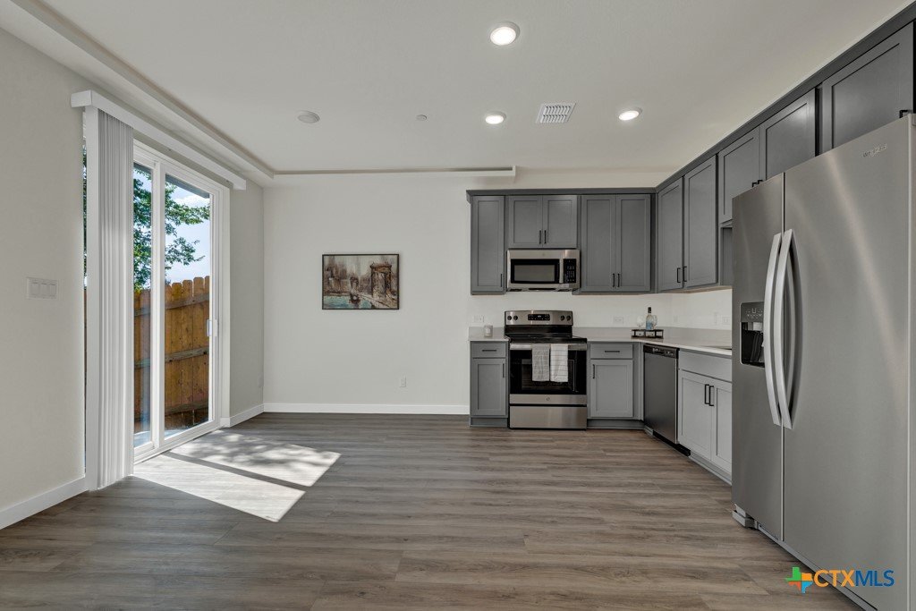 Welcome to this modern and thoughtfully designed 3-bedroom, 2.5-bath townhome! The open-concept living area over looks the fenced in backyard and is perfect for entertaining! This townhome features high ceilings, an abundance of natural light, and sleek hardwood floors throughout. The kitchen is complete with granite countertops, a deep, farmhouse sink, and stainless steel appliances. This townhome also has a one-car garage and driveway parking. The spacious primary suite offers a luxurious ensuite bathroom, complete with double vanity sinks, a shower/tub combo, and granite counters. Each bedroom and living area is equipped with a ceiling fan, and the home features an inviting office nook upstairs, providing the ideal space for work or study. This gated townhome community also offers additional covered parking for guests and is conveniently located near Tobias Elementary School. With easy access to I-35, downtown Kyle, shopping, dining, and entertainment, you’ll enjoy the perfect blend of convenience and comfort. Don’t miss this opportunity to live in a modern, low-maintenance townhome—schedule your showing today!