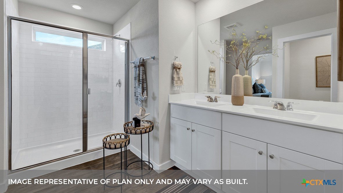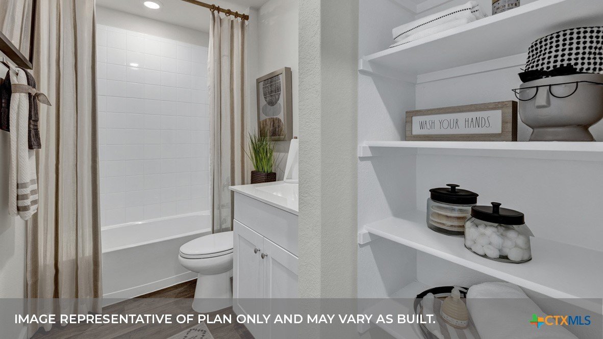 JUNE ESTIMATED COMPLETION. The Irvine is one of our one-story floorplans offered at Trace in San Marcos, Texas. This 4-bedroom, 2-bathroom home includes a 2-car garage within its 1,788 square feet of comfortable living space. Our homes in Trace feature farmhouse exteriors. Step into this home from the covered entryway and make your way down the hall to the main living space. The open kitchen looks out to your dining area and family room, allowing for conversations to easily flow from all spaces. The L-shaped kitchen includes quartz countertops, a large island with an undermount sink, a corner pantry closet, stainless-steel appliances and 36’’ upper cabinets. Off the family room is the primary bedroom, with its own private bathroom. This relaxing bathroom space features a 5’ walk in shower, vanity, private toilet area with a door, and an oversized walk-in closet. At the front of the house, you will find bedroom 2 and 3, with the secondary bathroom conveniently located between the rooms. Bathroom 2 includes a tub/shower combination and open shelving for extra storage or décor. Across the foyer and down a short hall is the utility room and bedroom 4. Whether you use these rooms as an office, child’s room or guest room, there is enough space for work, sleep and play. The Irvine includes vinyl flooring throughout the common areas of the home, and carpet in the bedrooms. All our new homes feature a covered back patio, full sod, an irrigation system in the front and back yard, and a 6’ privacy fence around the back yard. This home includes our America’s Smart Home base package, which includes the Amazon Echo Pop, Front Doorbell, Front Door Deadbolt Lock, Home Hub, Thermostat, and Deako® Smart Switches.