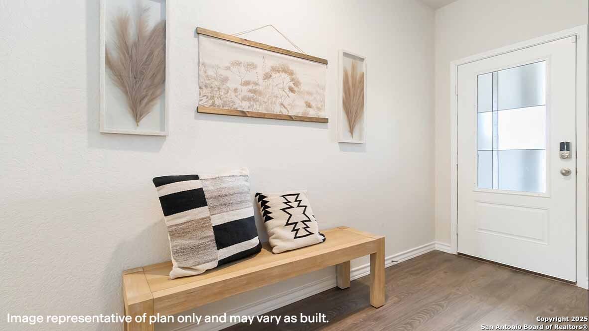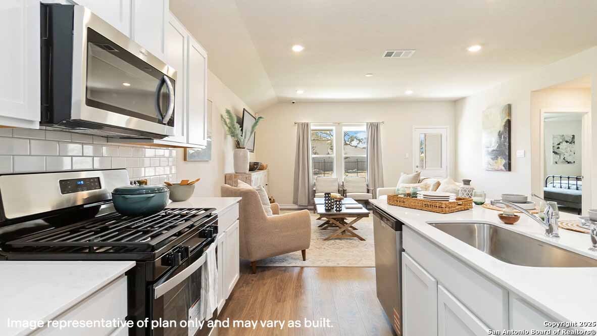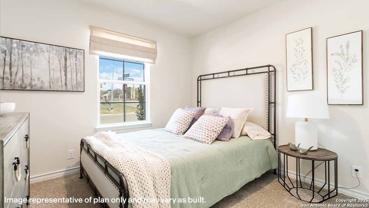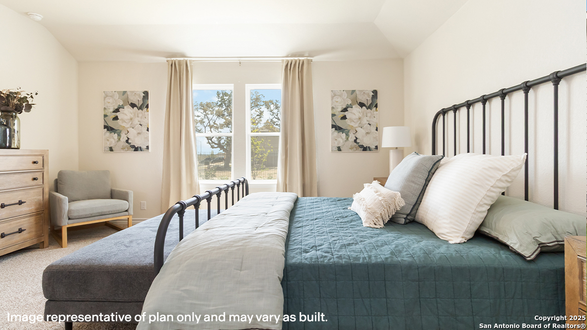 Smart design and spacious living come together in The Harris floor plan located at The Birch at Spencer Ranch in Boerne, TX - an elegant 1823 square foot, single-story home offering four bedrooms, two and a half baths and thoughtfully curated spaces for your lifestyle. An extended entryway leads you into a bright and open layout, where the kitchen, dining area and living room flow seamlessly together - perfect for family gatherings and entertaining. The kitchen is a modern showpiece with stainless steel appliances, quartz countertops, stylish flat panel cabinetry and a farmhouse-style sink. A spacious island anchors the space while a classic white subway tile backsplash ties everything together with timeless appeal. Privately located at the rear of the home, the primary bedroom suite is a true retreat, featuring a walk-in shower, dual vanity sinks and a generously sized walk-in closet. The secondary bedrooms offer comfort and flexibility. Each includes carpet flooring, large windows and ample closet space - ideal for bedrooms or other flex spaces. The convenient half bathroom adds a practical touch for visitors without sacrificing privacy in the full bathrooms. This home includes our HOME IS CONNECTED base package. Using one central hub that talks to all the devices in your home, you can control the lights, thermostat and locks, all from your cellular device. Additional highlights include hard surface flooring throughout the main living areas and wet zones, a covered patio (per plan) for relaxing outdoors, full yard landscaping with irrigation and a pre-plumbed water softener loop to support your future upgrades. The Harris offers the perfect mix of space, function and style - all set within the inviting community of The Birch at Spencer Ranch.